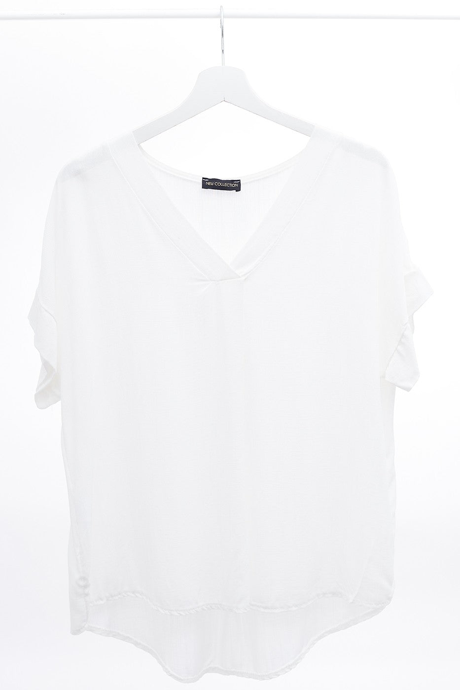 Plain short-sleeved V-neckline blouse with pleat detail. Textured blouse.