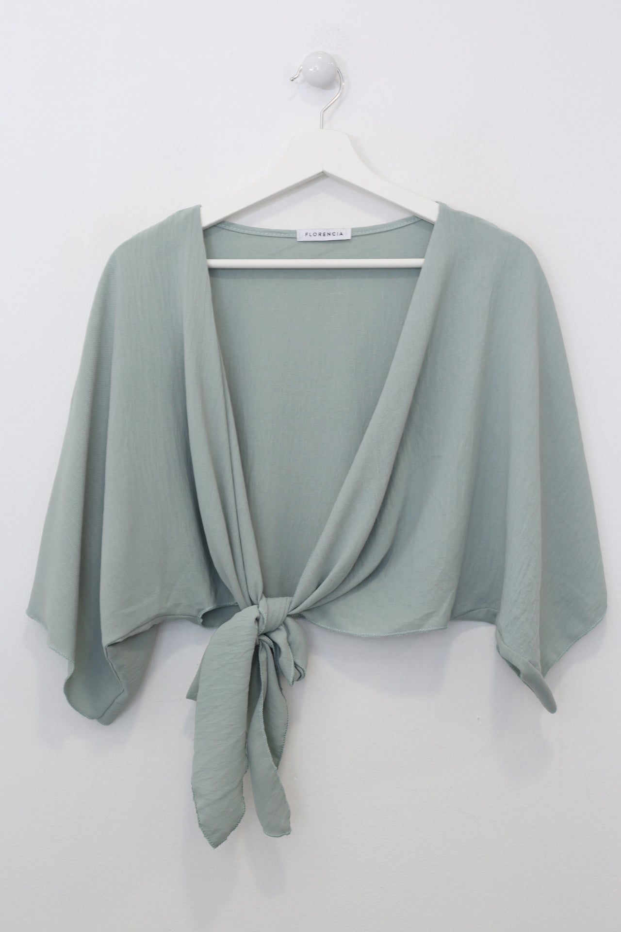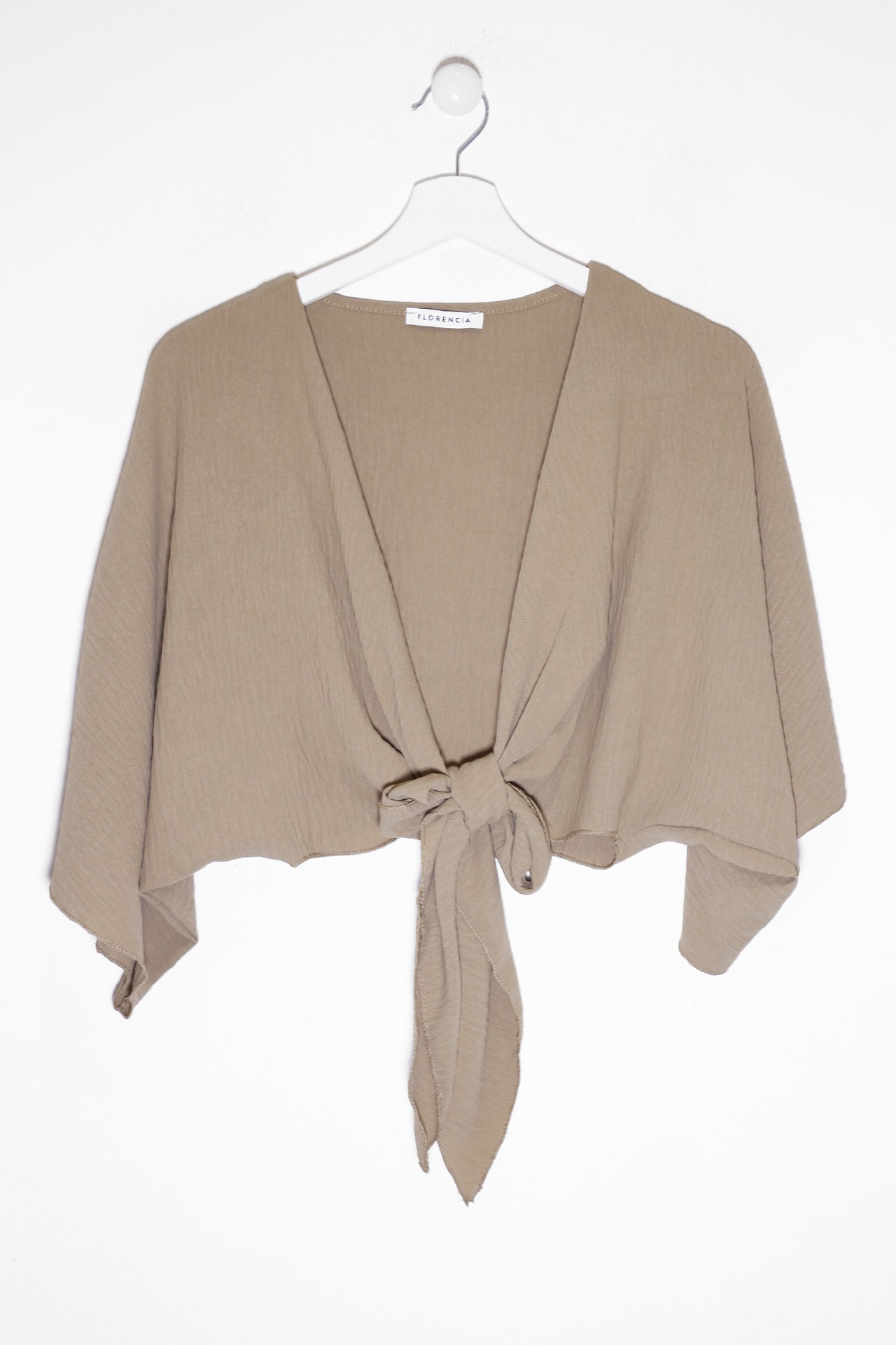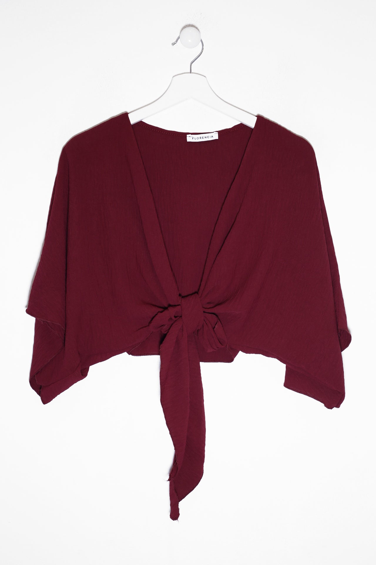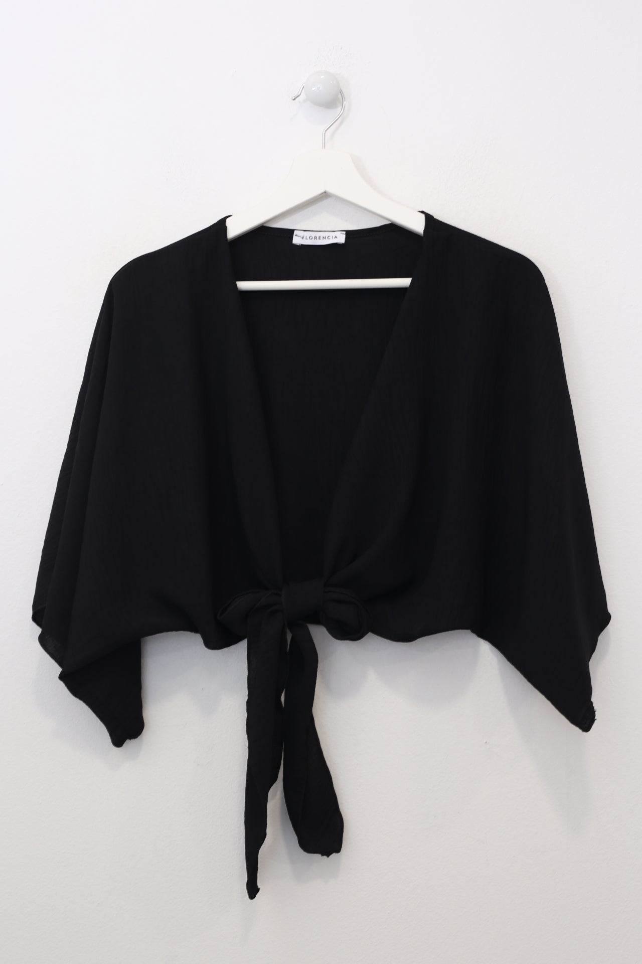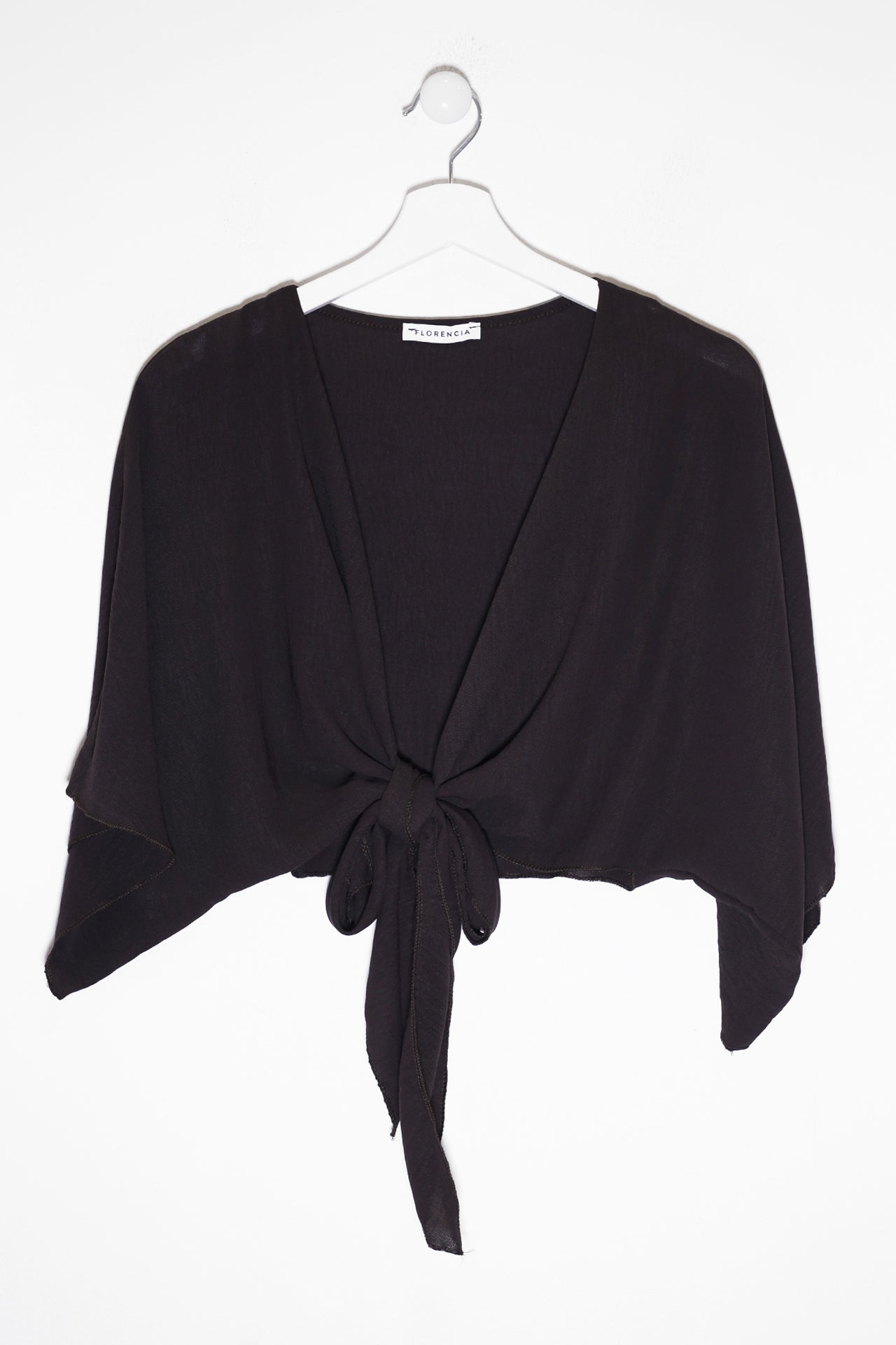 Bolero con escote recto y manga ancha. Cierre frontal anudado. Corte fluido y tejido elástico.