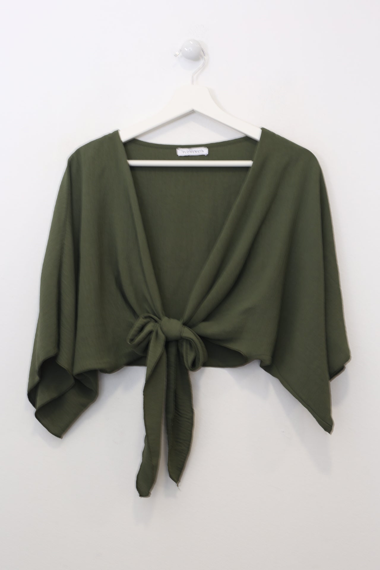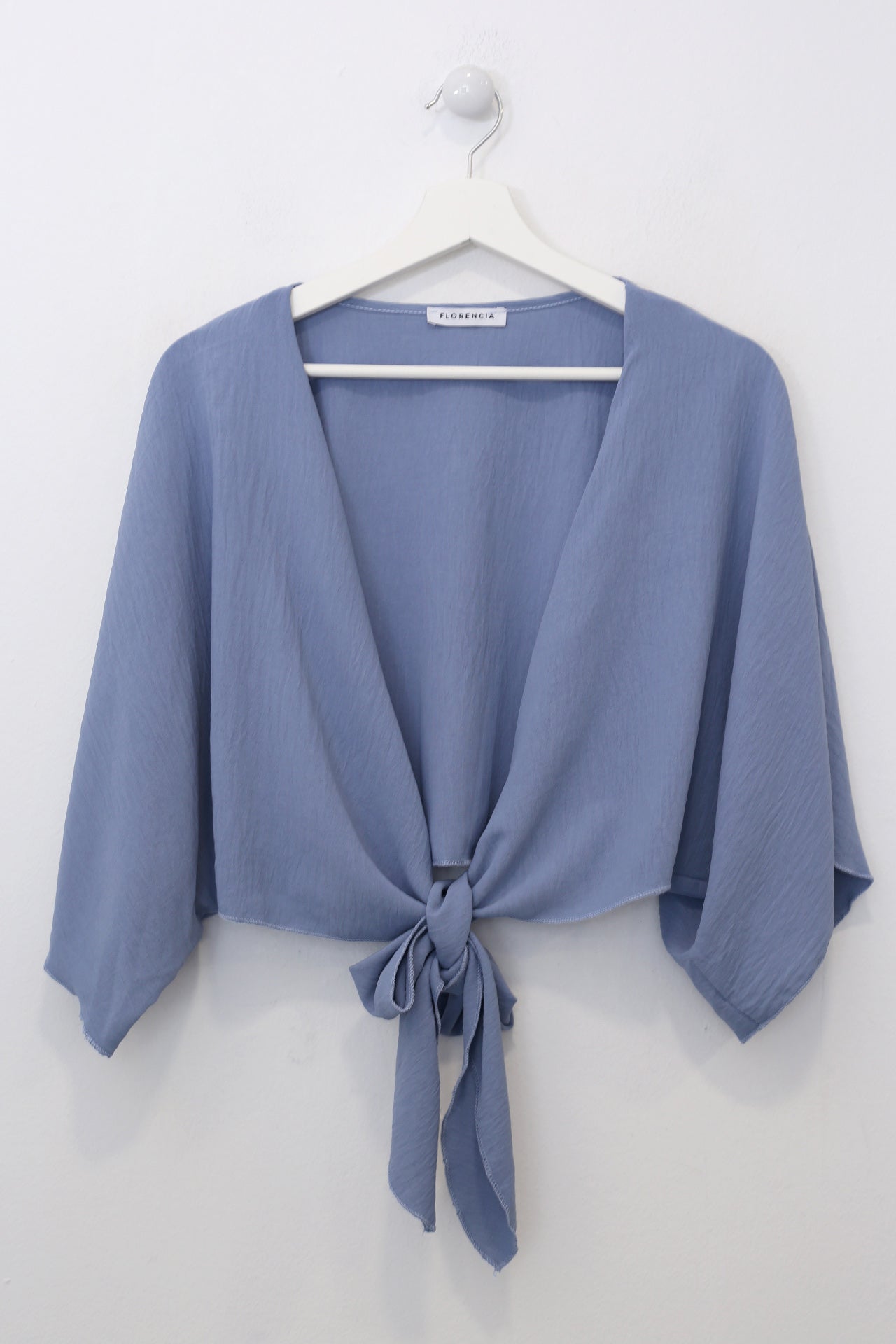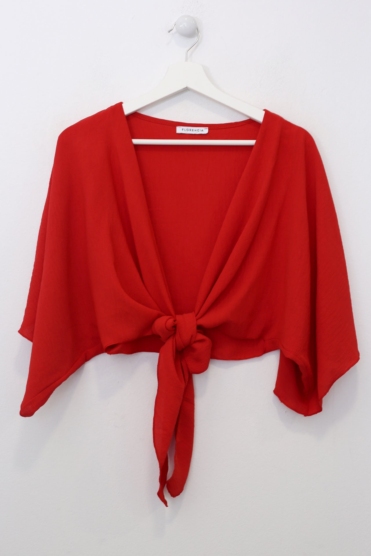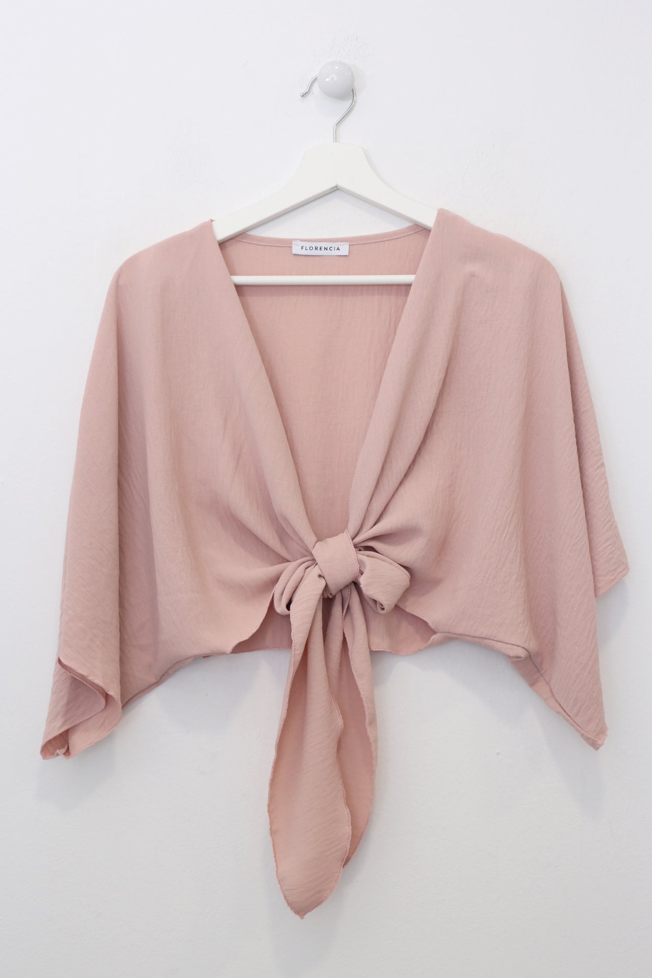Bolero con escote recto y manga ancha. Cierre frontal anudado. Corte fluido y tejido elástico.
