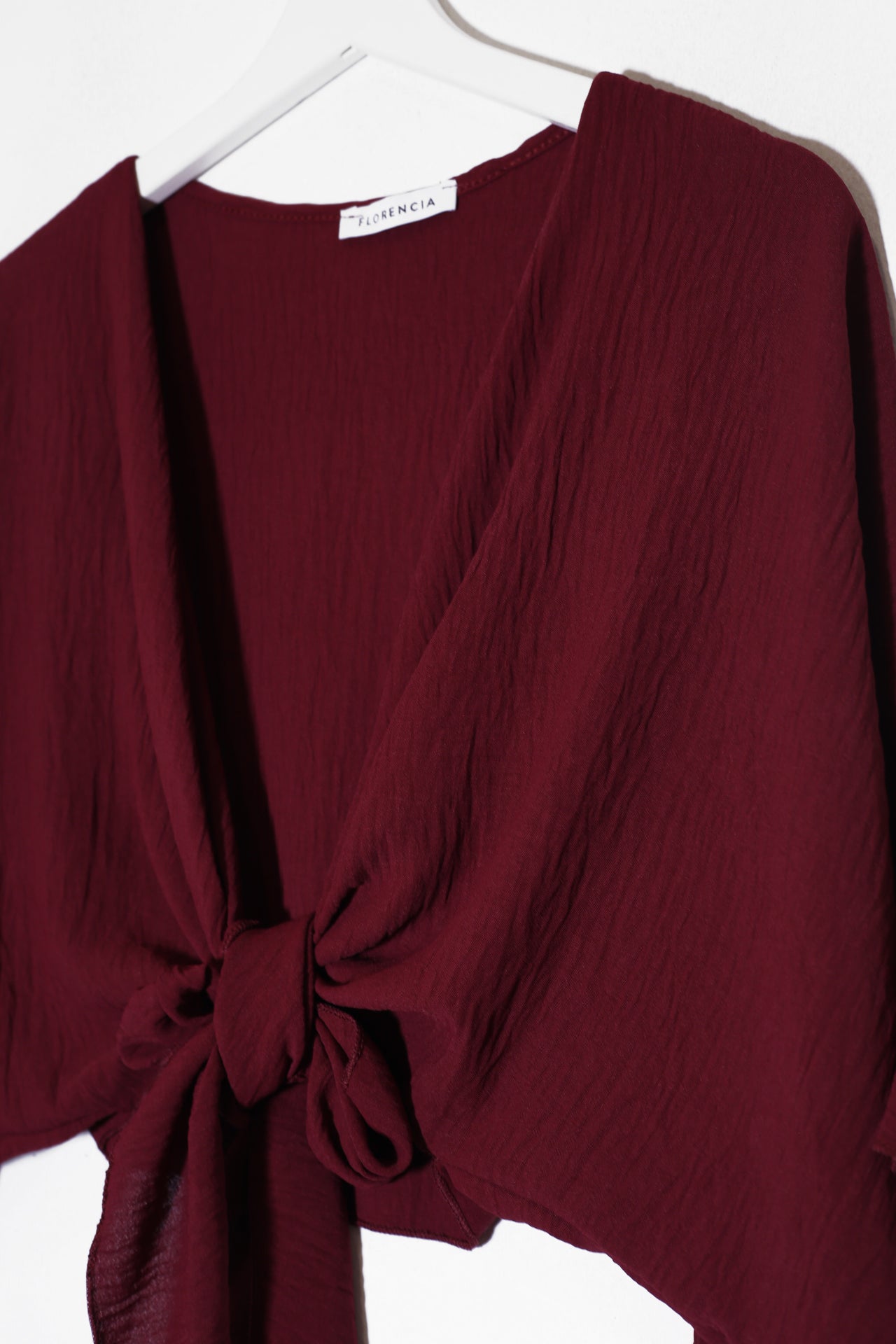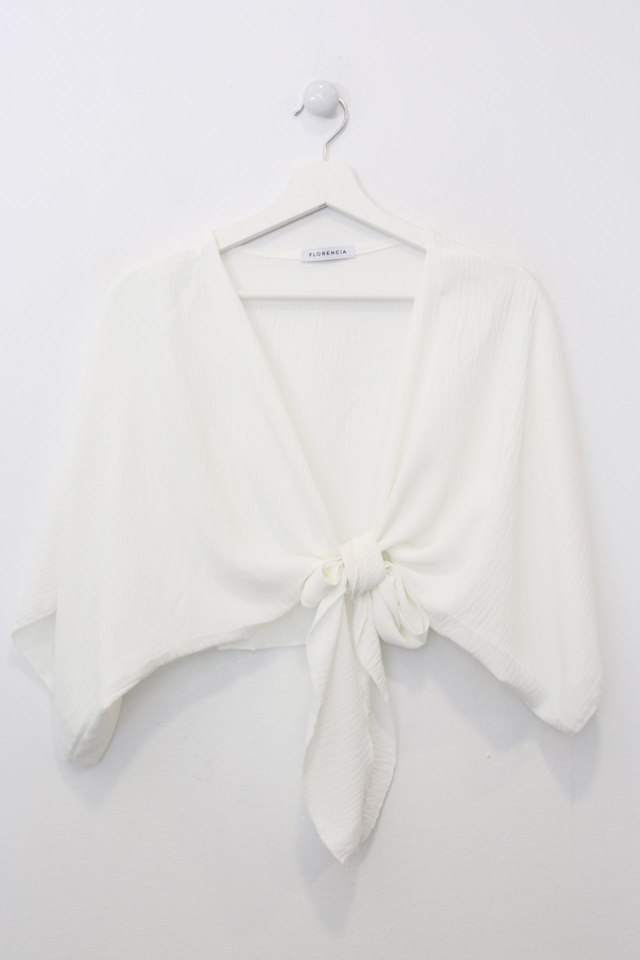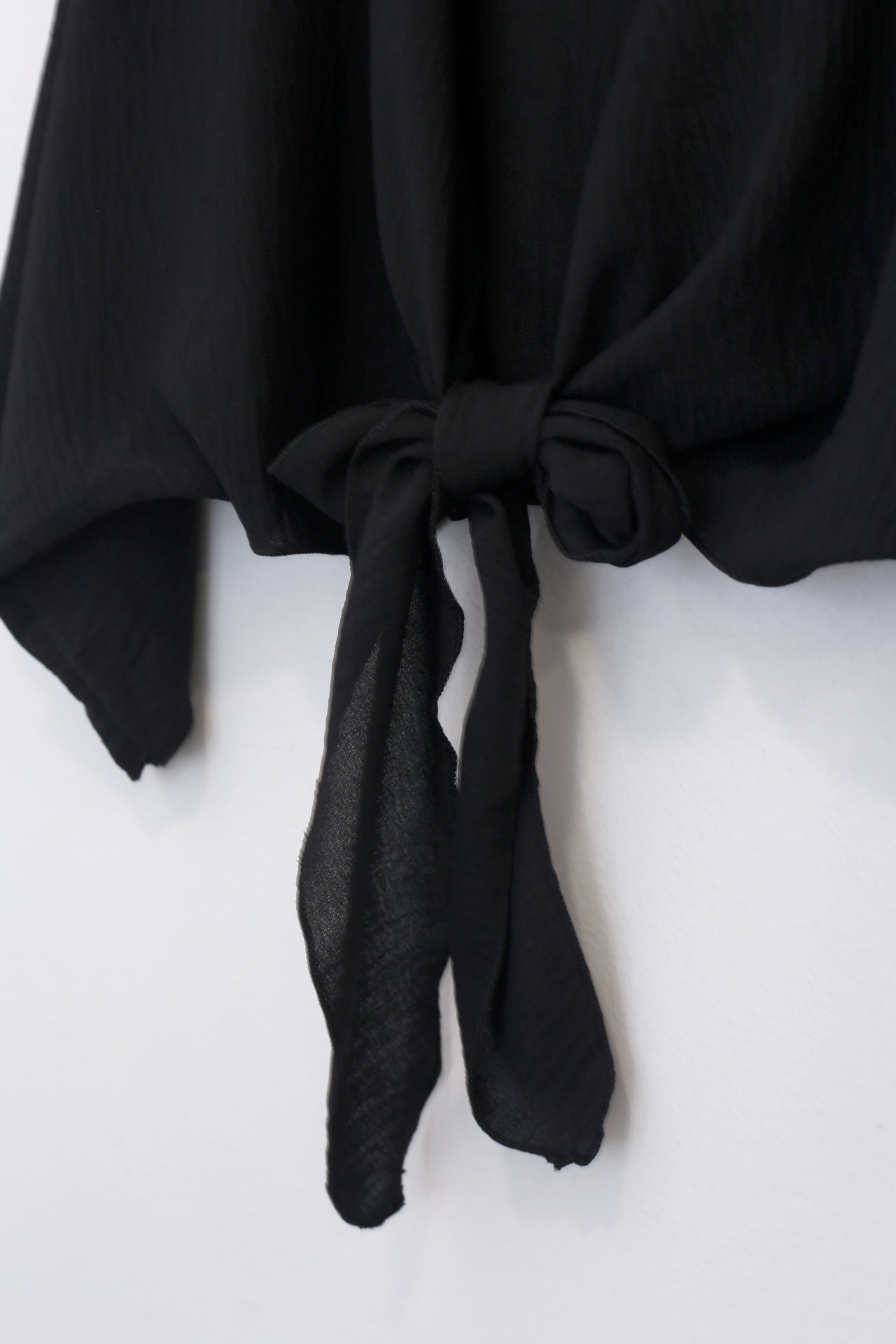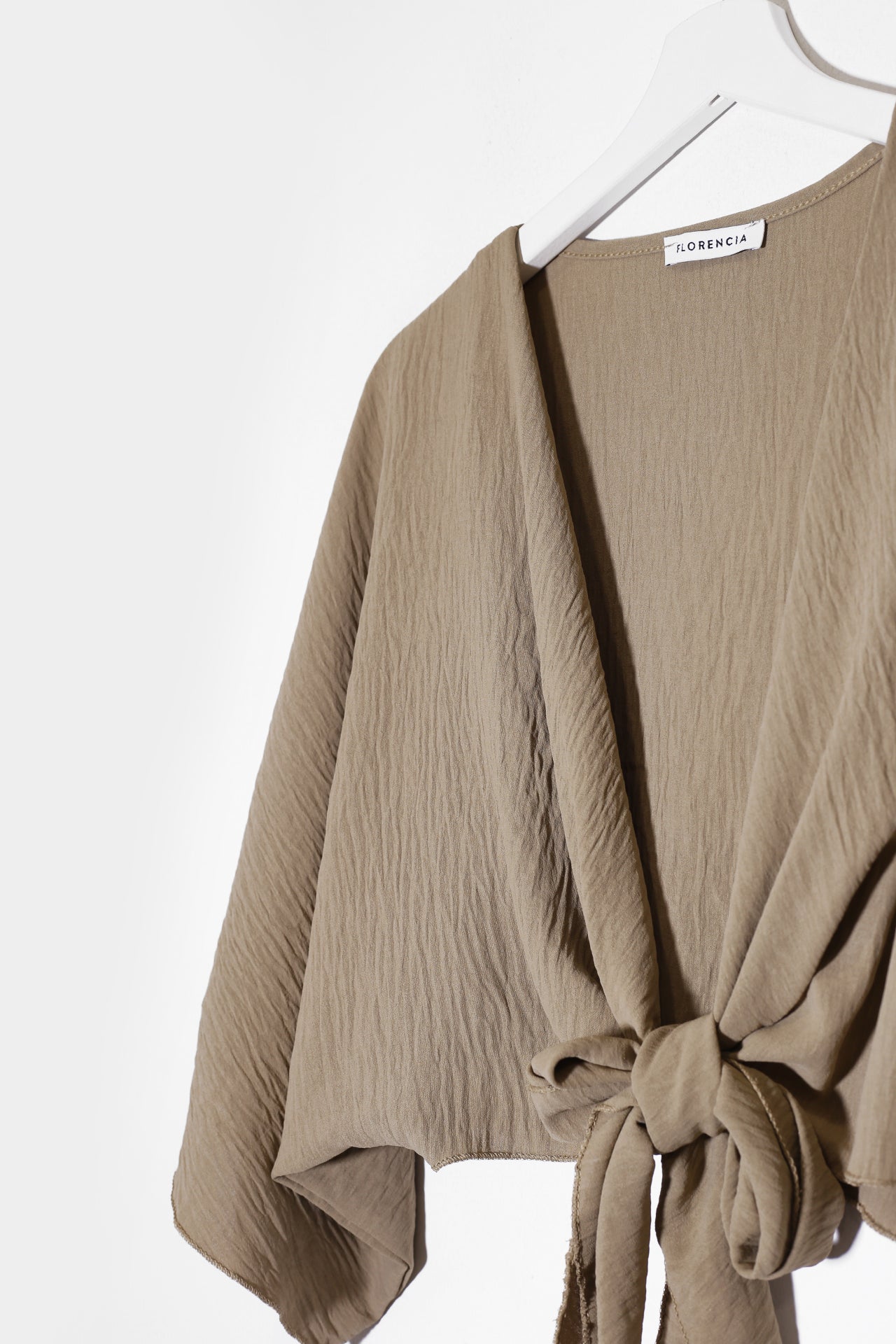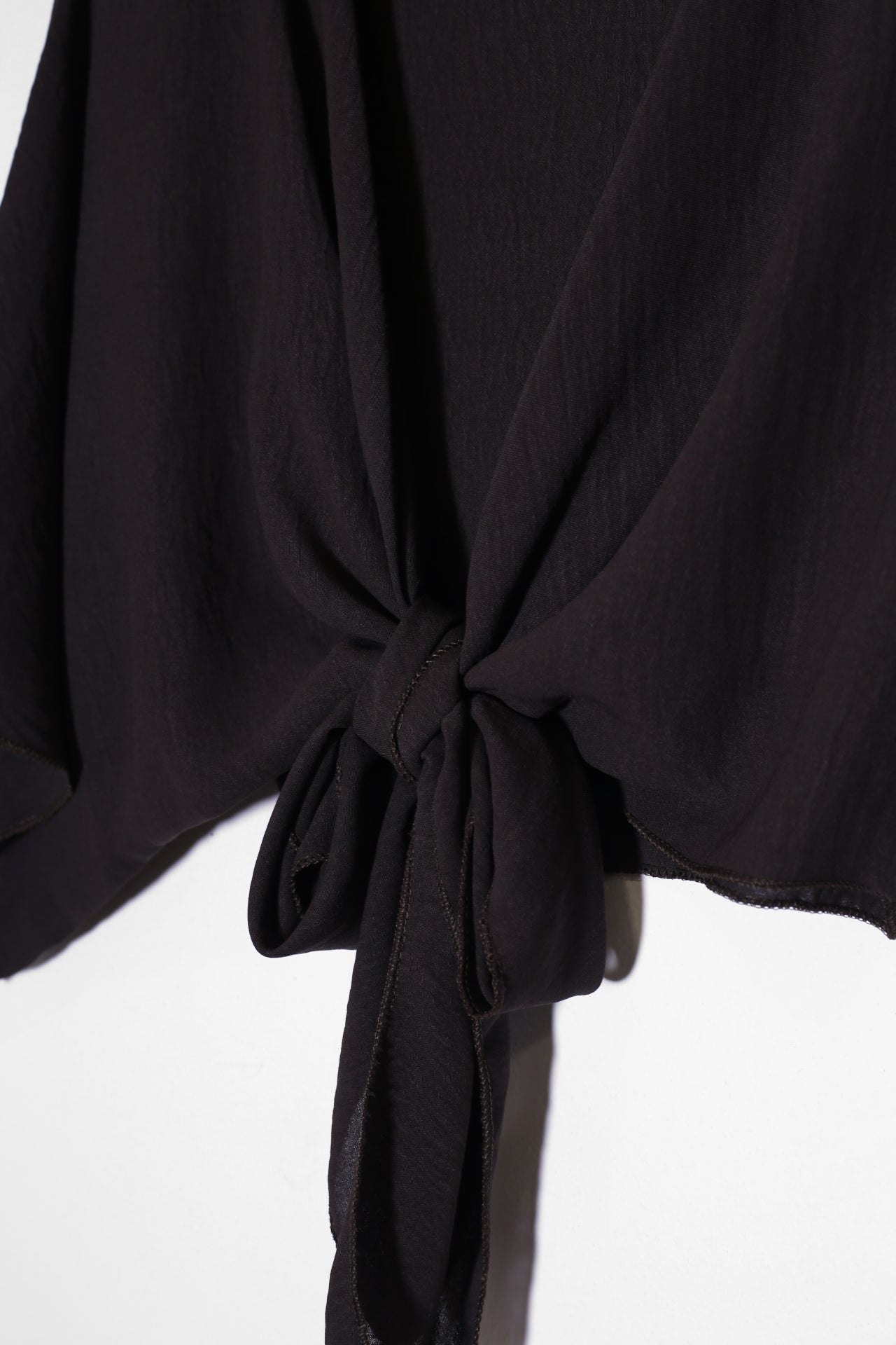 Bolero con escote recto y manga ancha. Cierre frontal anudado. Corte fluido y tejido elástico.