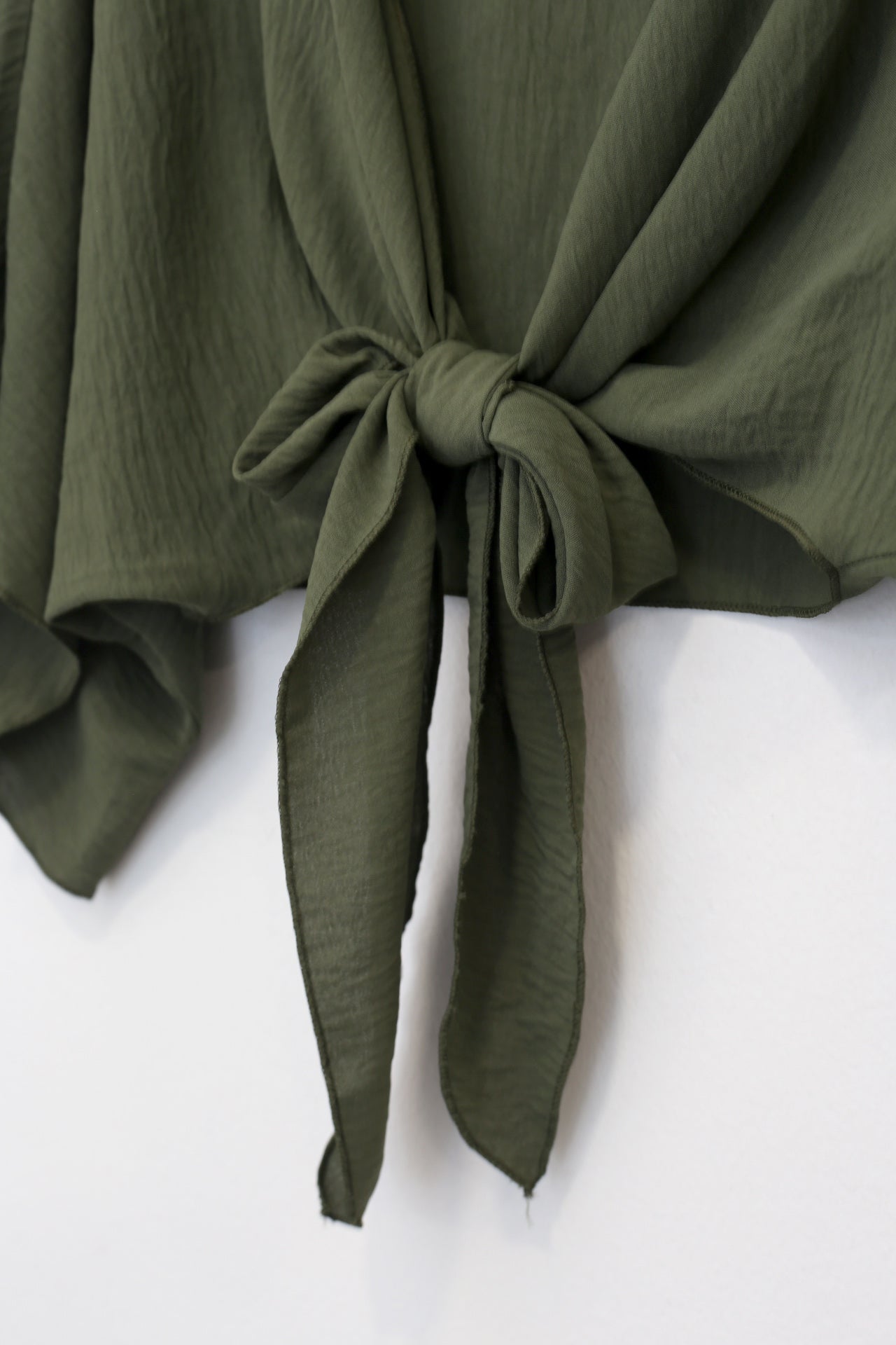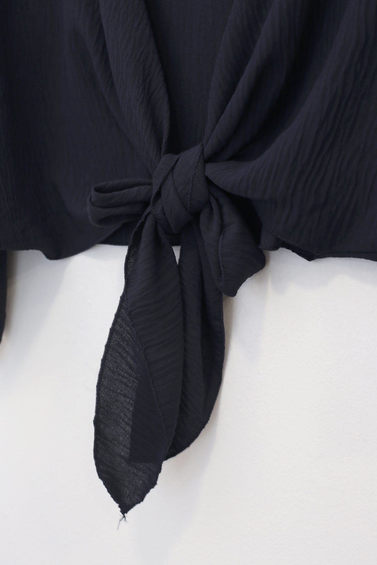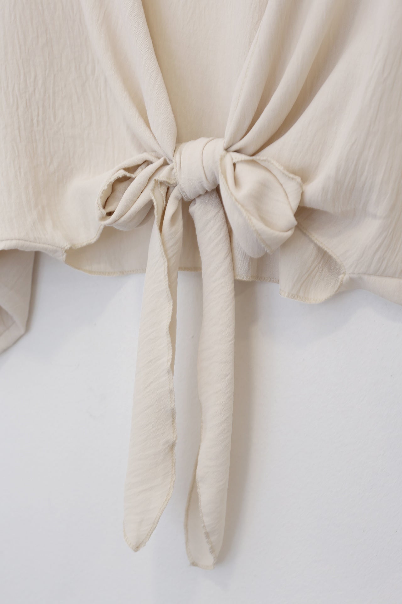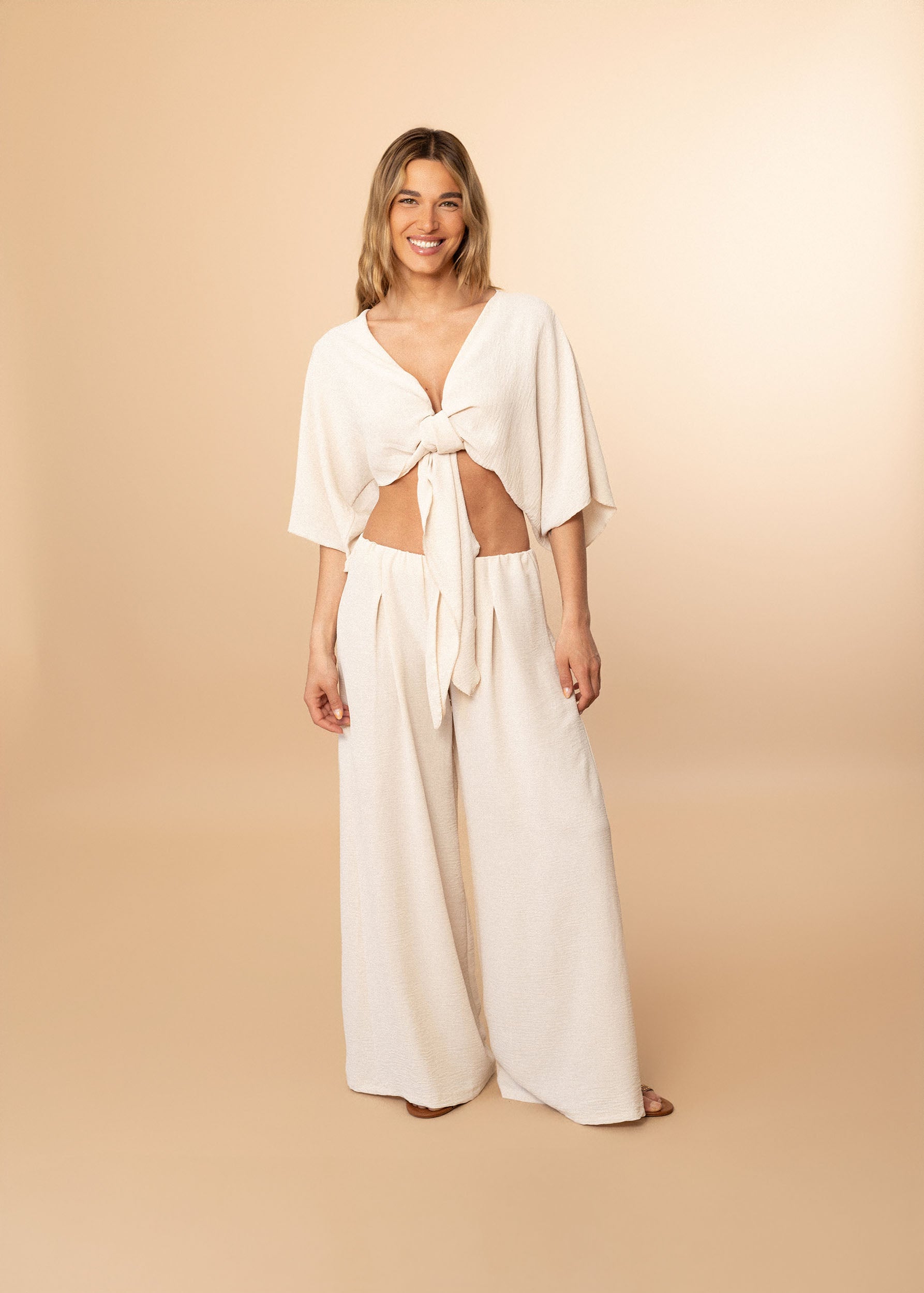 Bolero con escote recto y manga ancha. Cierre frontal anudado. Corte fluido y tejido elástico.