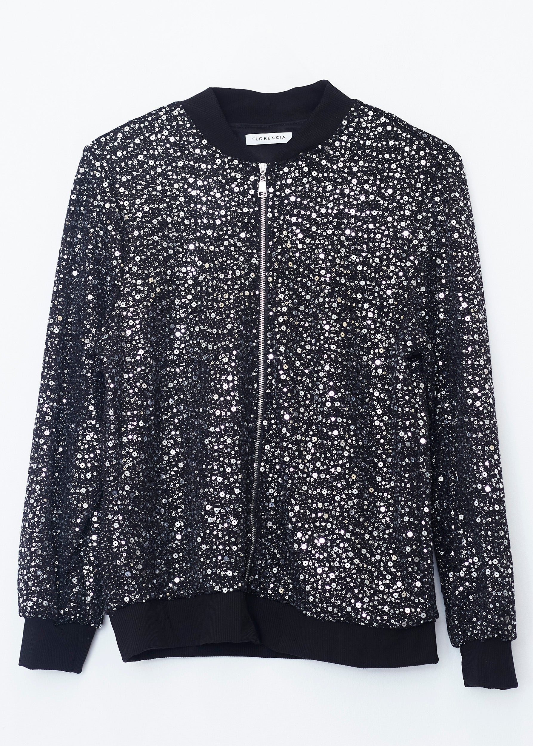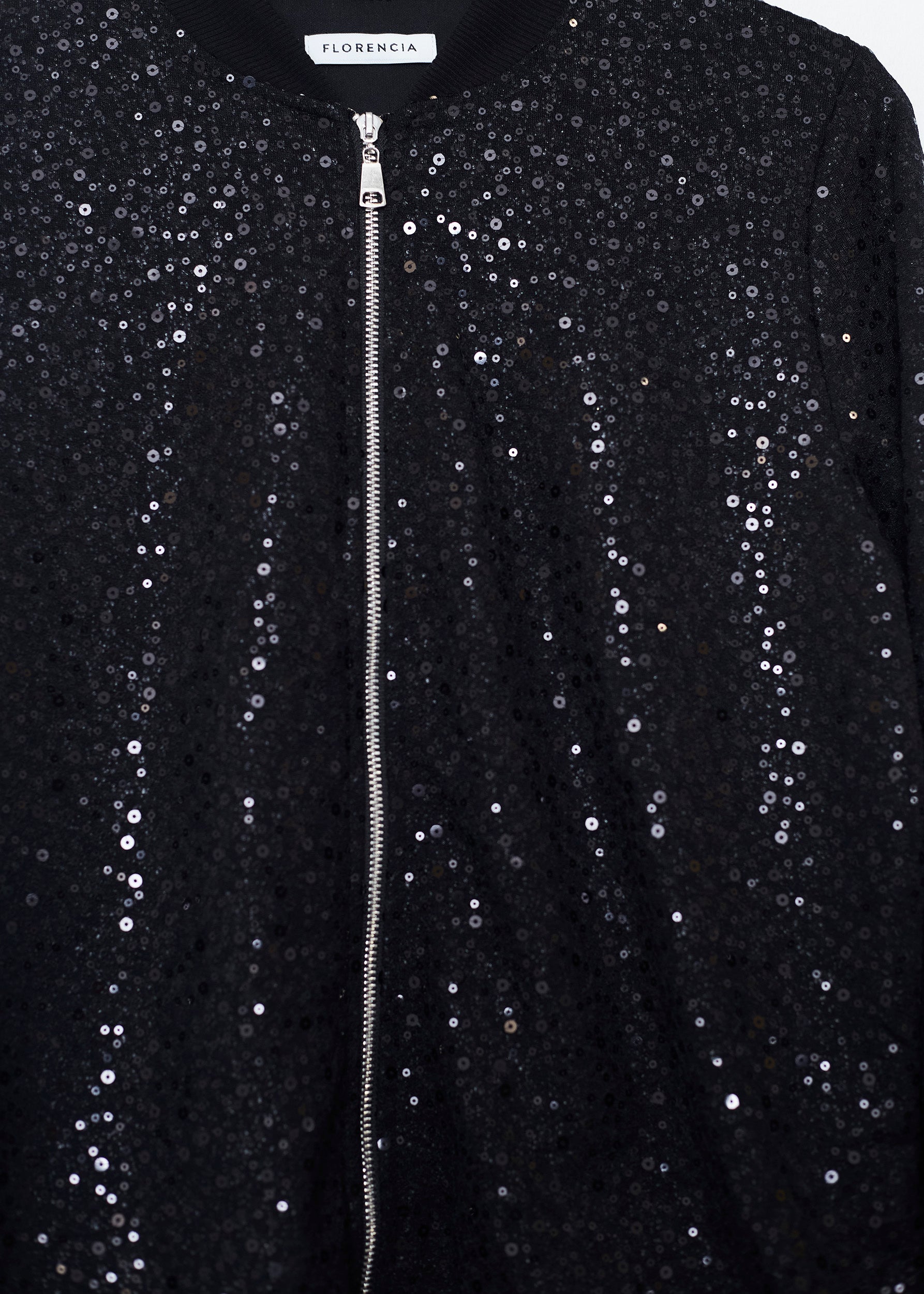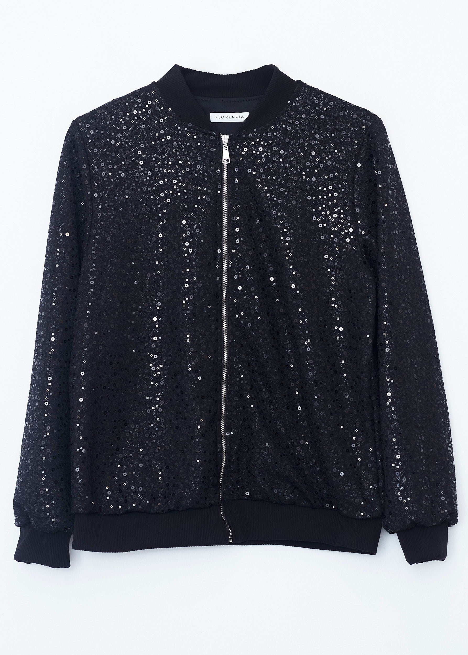 Bomber jacket with crew neck and long sleeves. Ribbed collar, cuffs and hem. Front zip closure. Fabric with sequin detail. Inner lining.