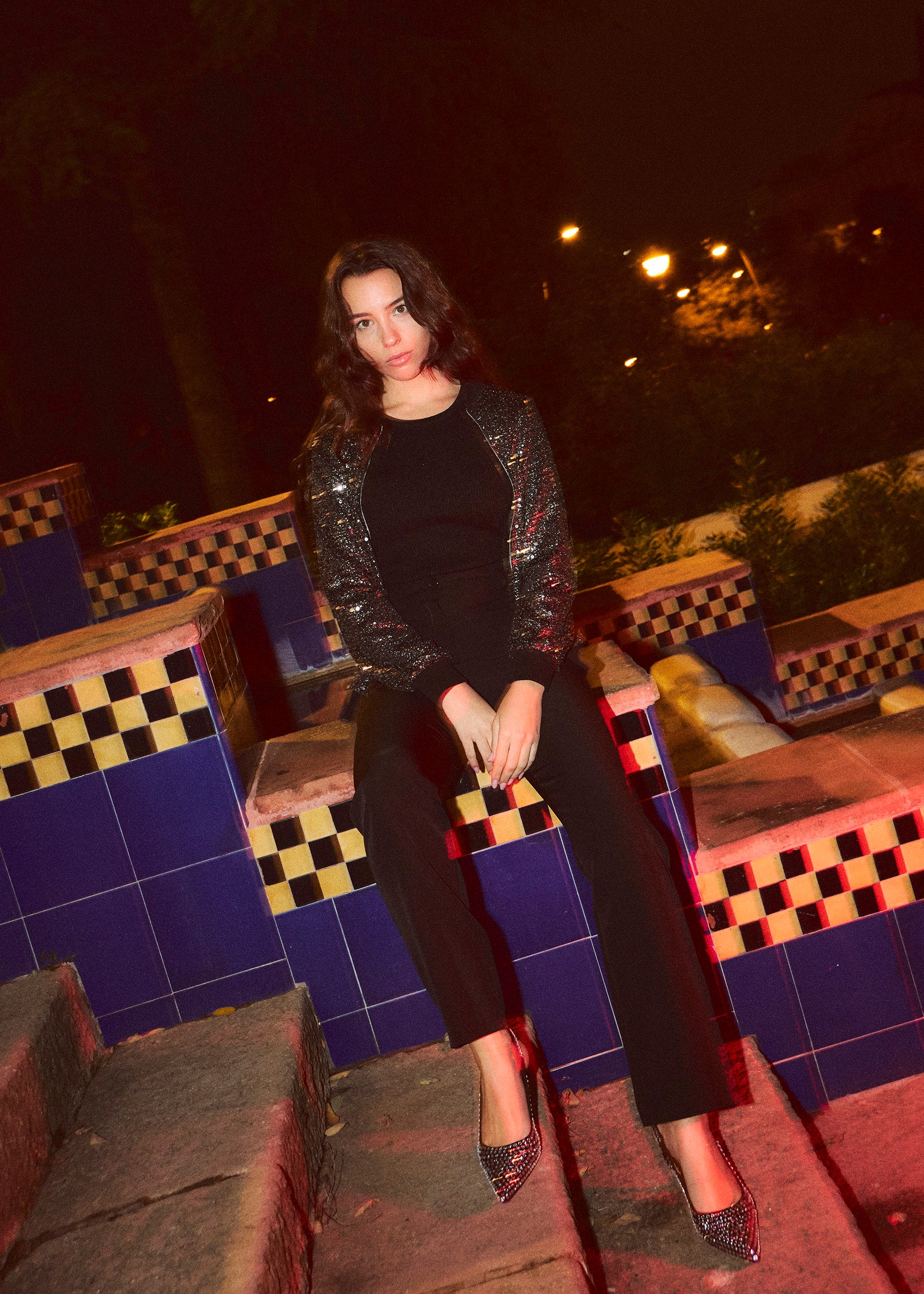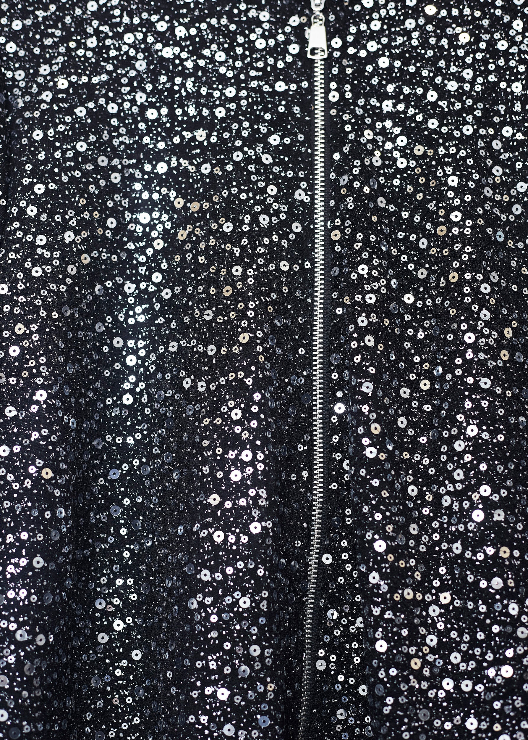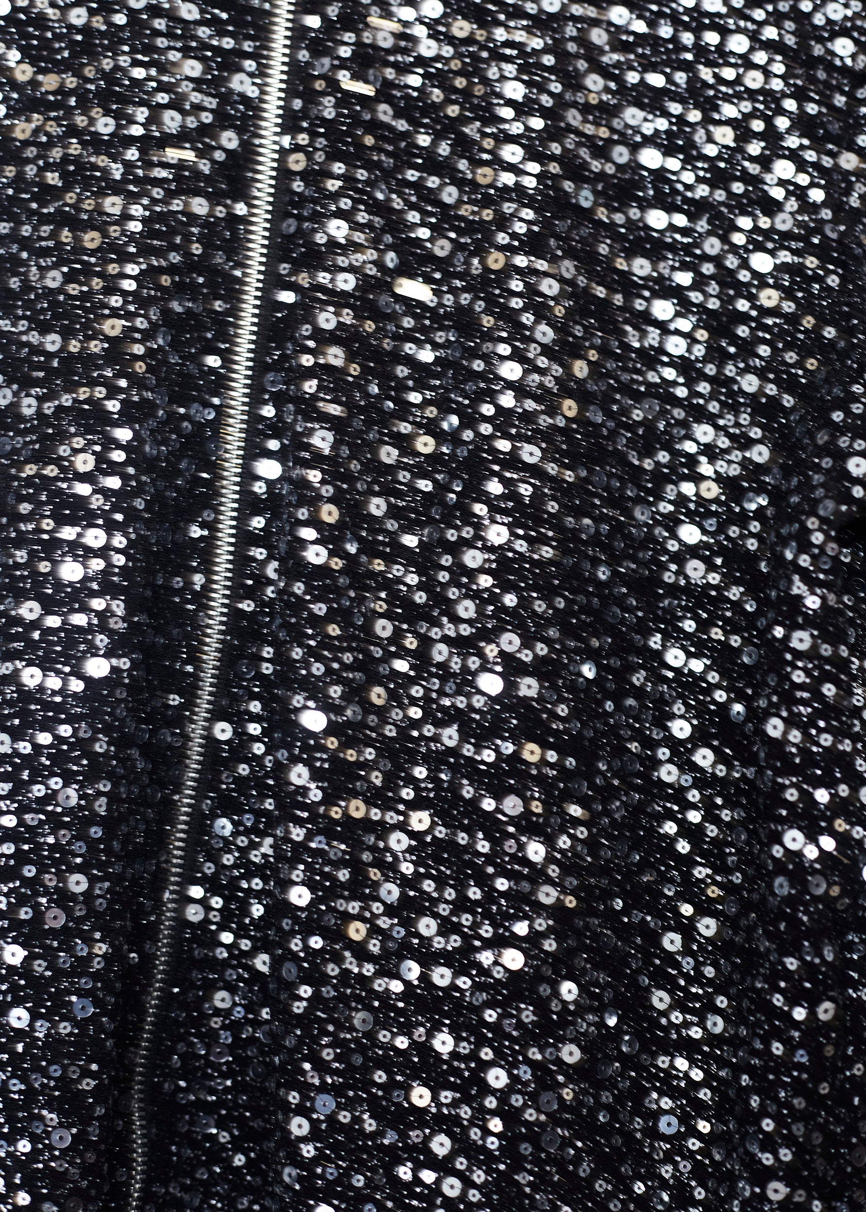 Bomber jacket with crew neck and long sleeves. Ribbed collar, cuffs and hem. Front zip closure. Fabric with sequin detail. Inner lining.