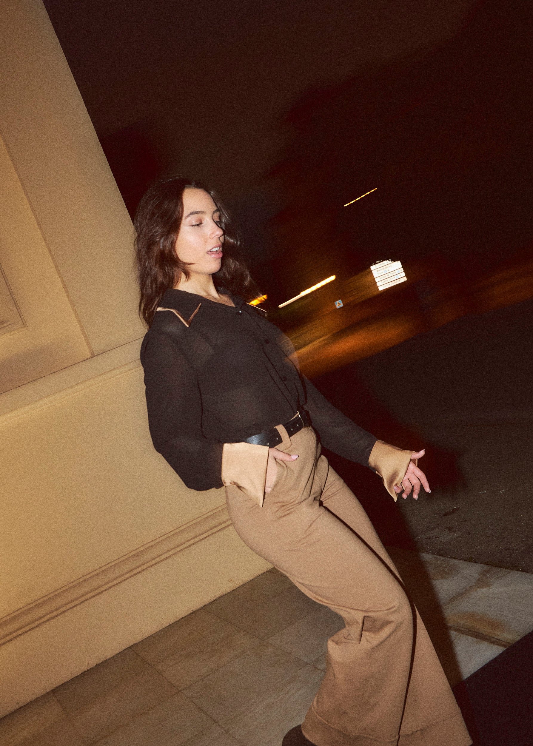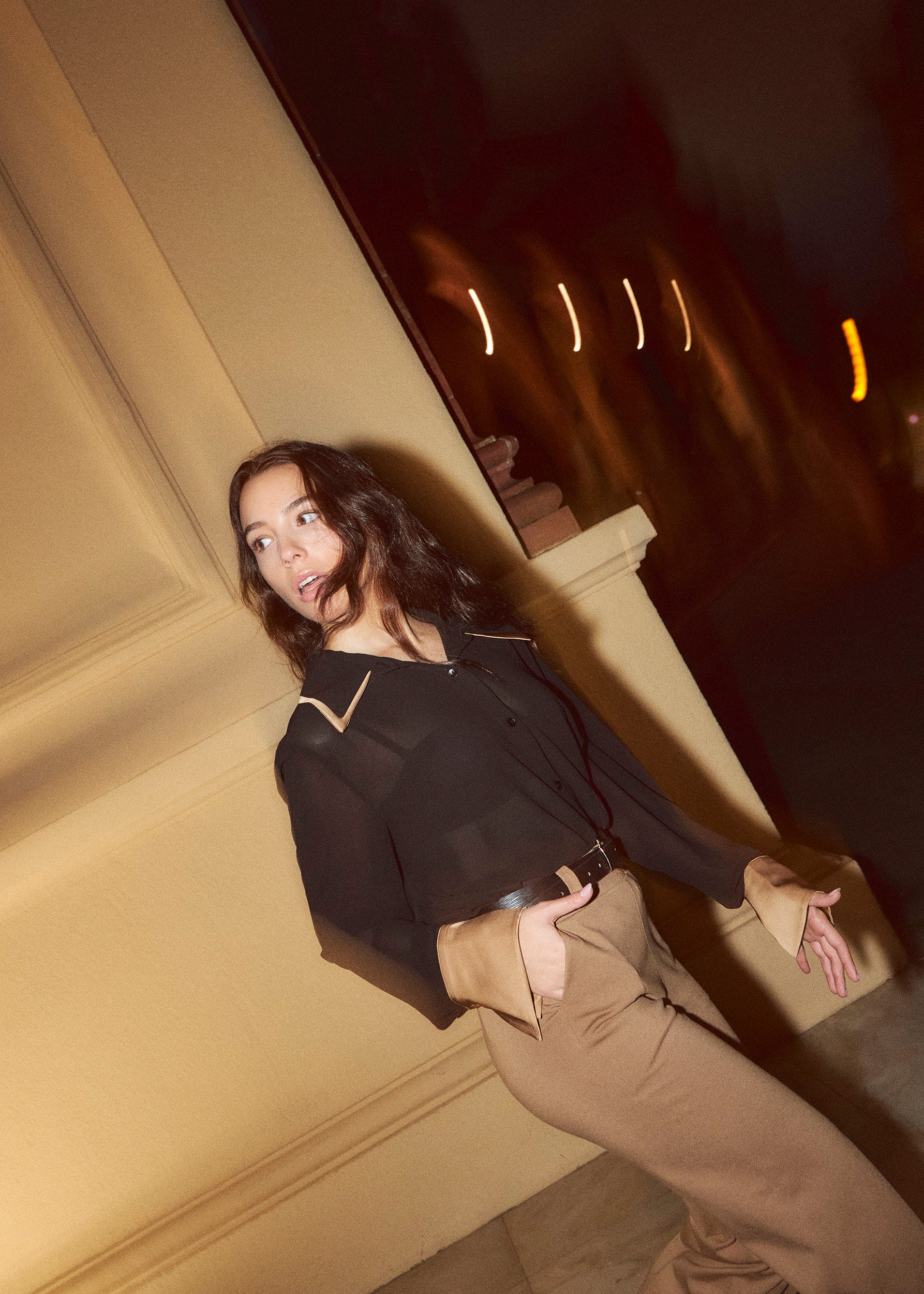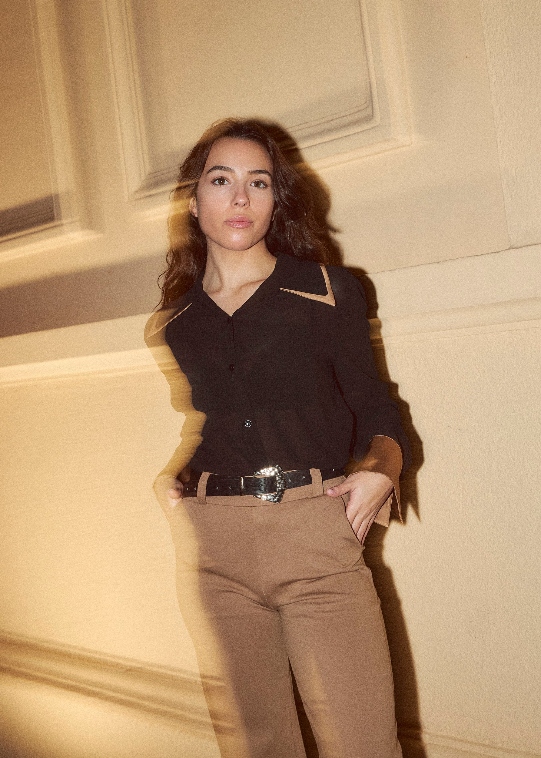 Shirt with double lapel collar and long sleeves with buttoned cuffs. Front button closure. Georgette fabric body and lower collar and cuffs in contrasting satin fabric.