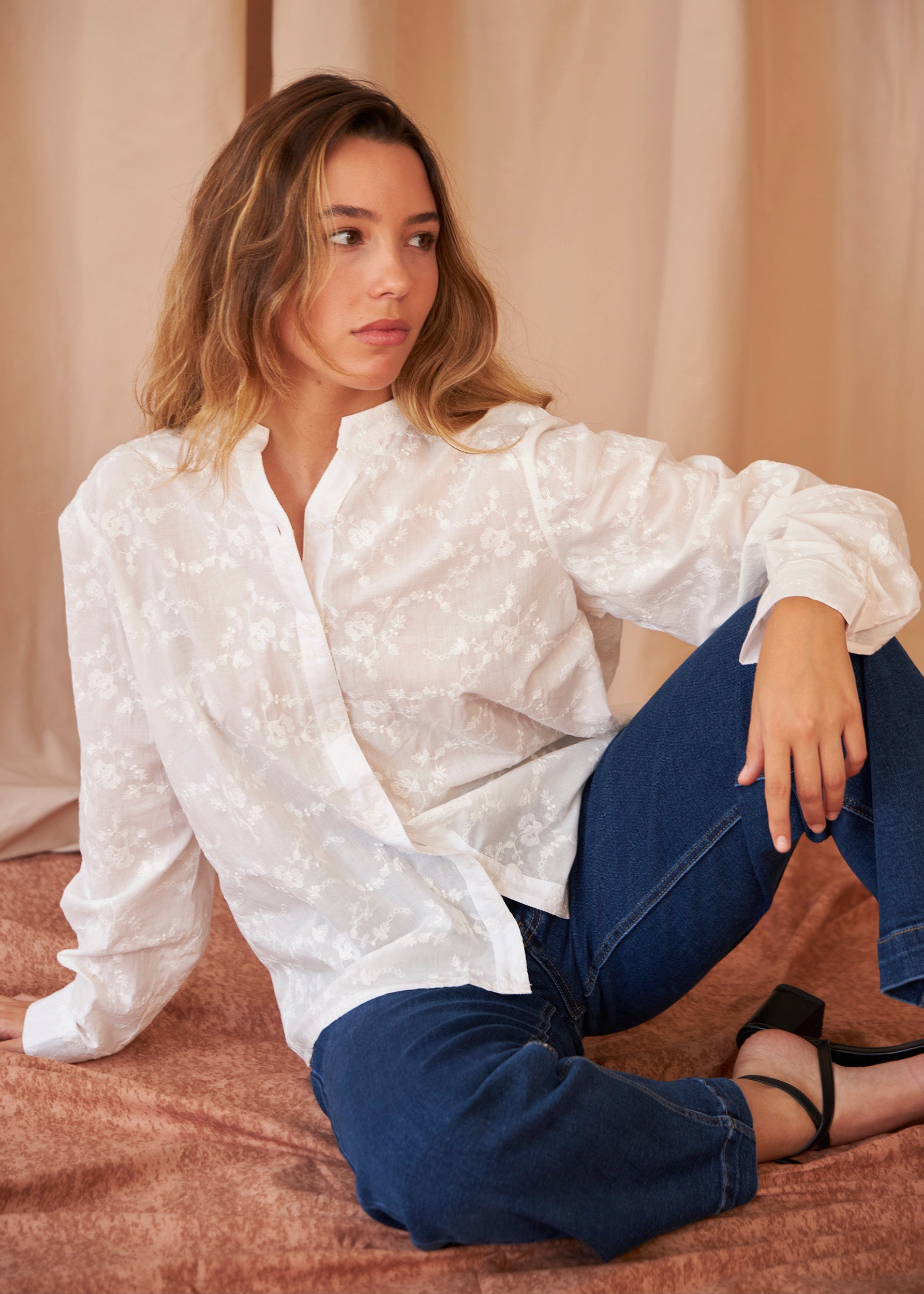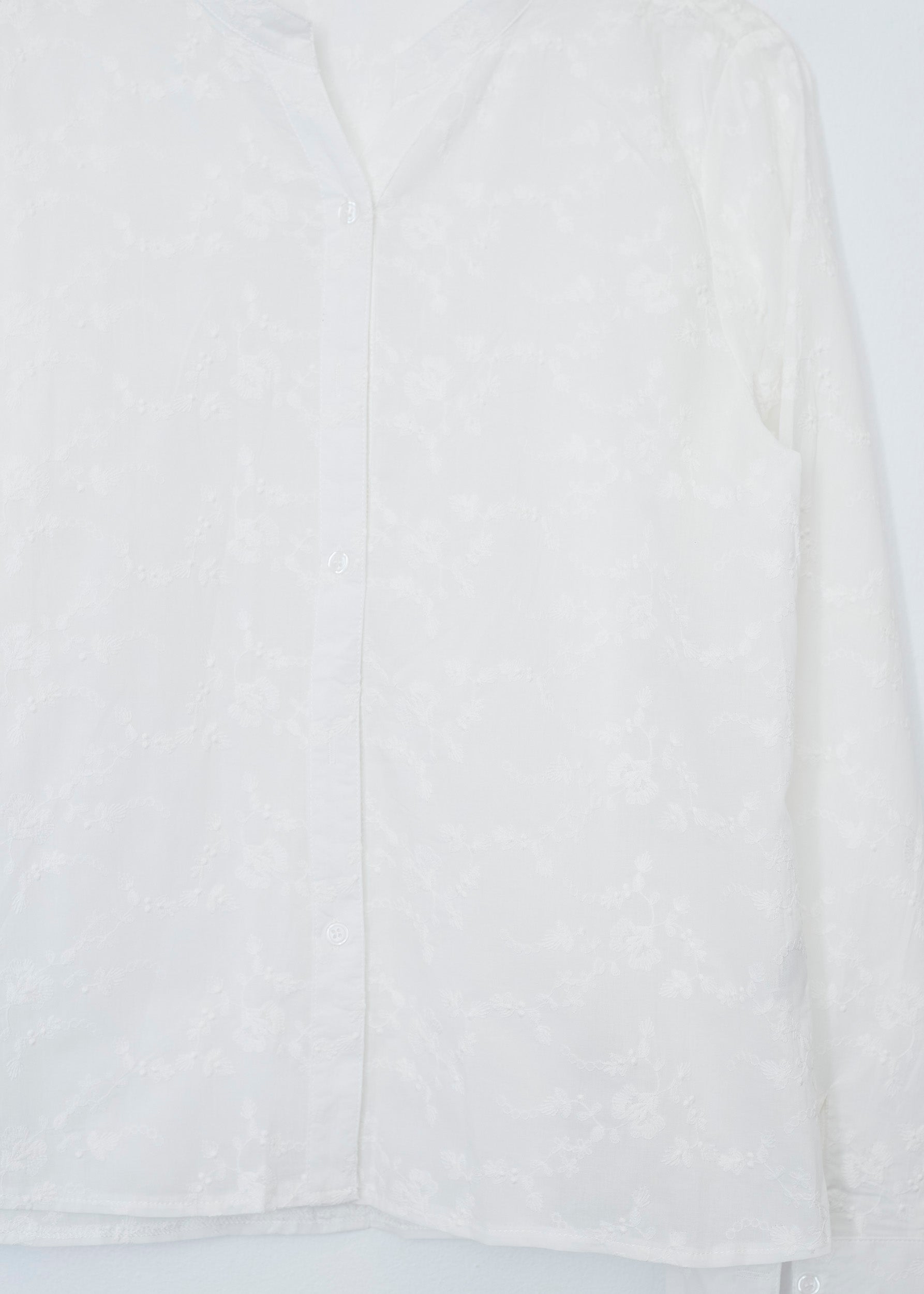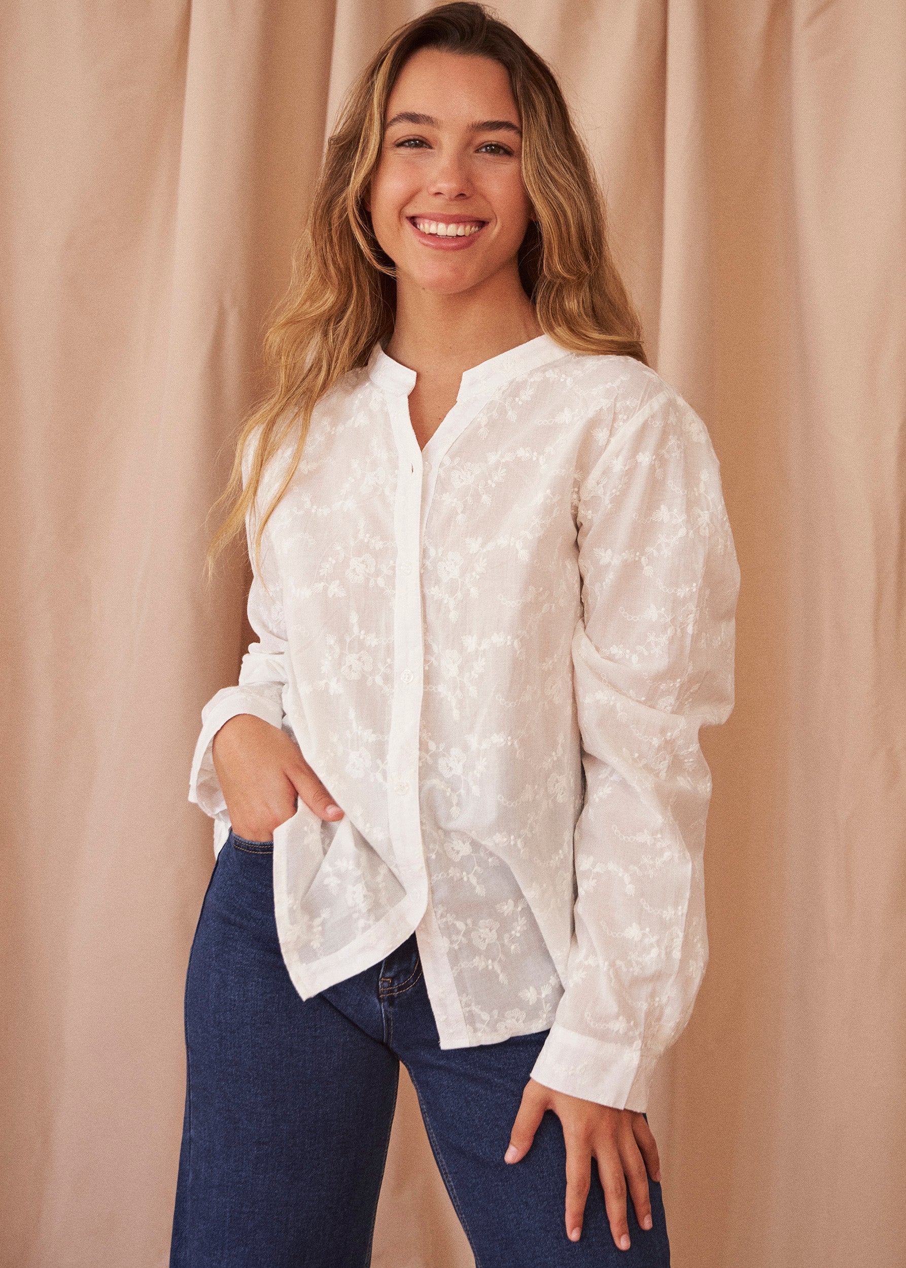 Shirt with a high collar and long sleeves. Front button closure. Floral embroidery detail.