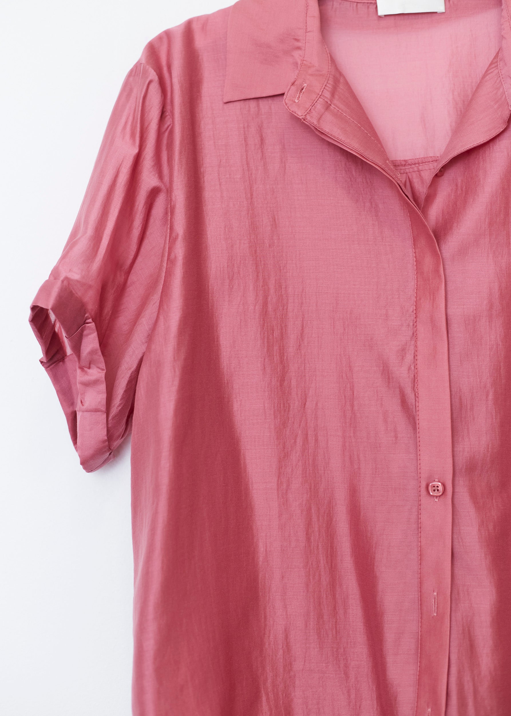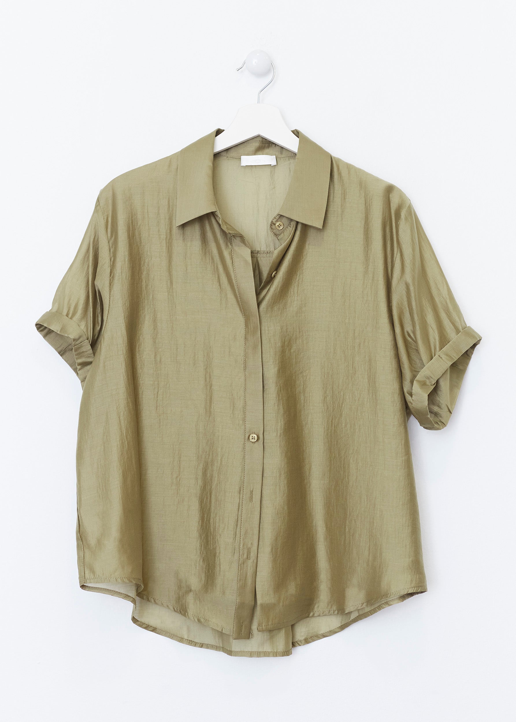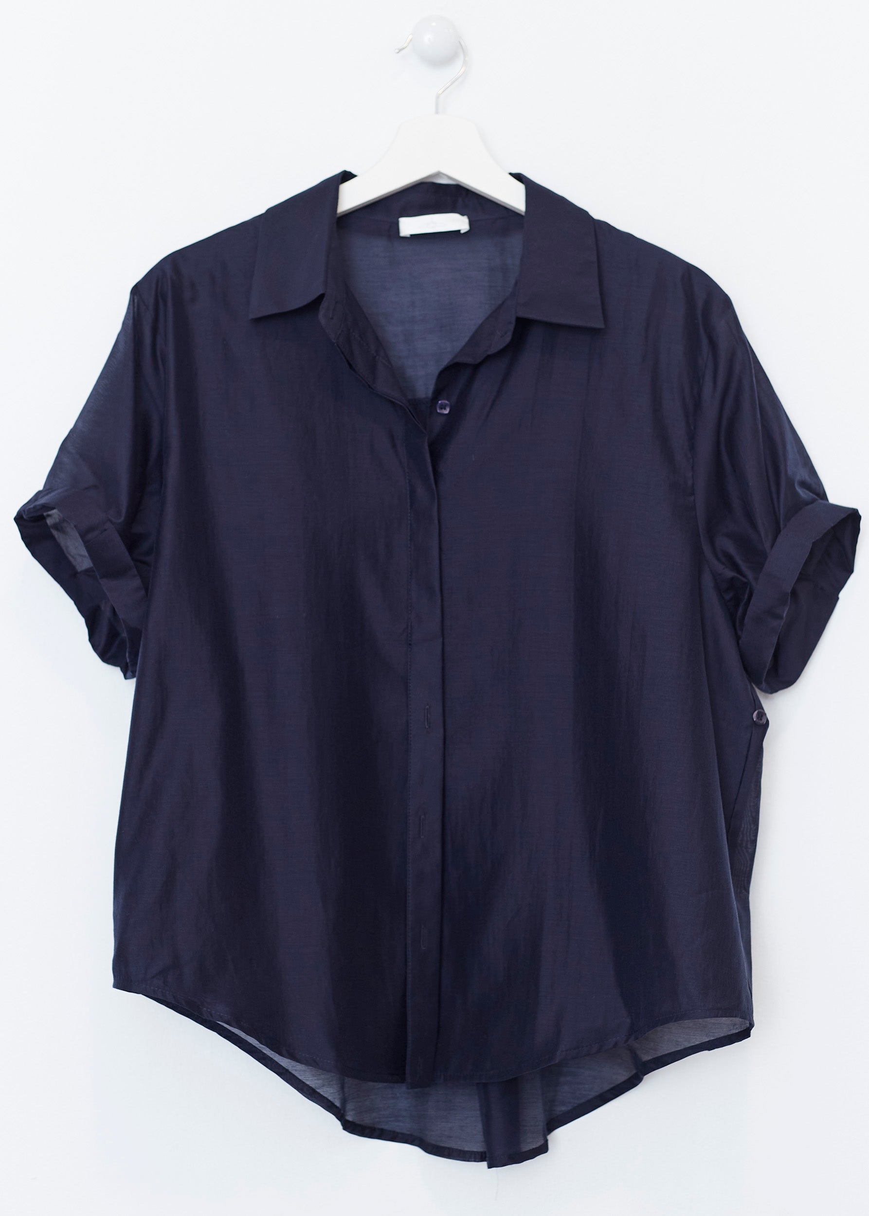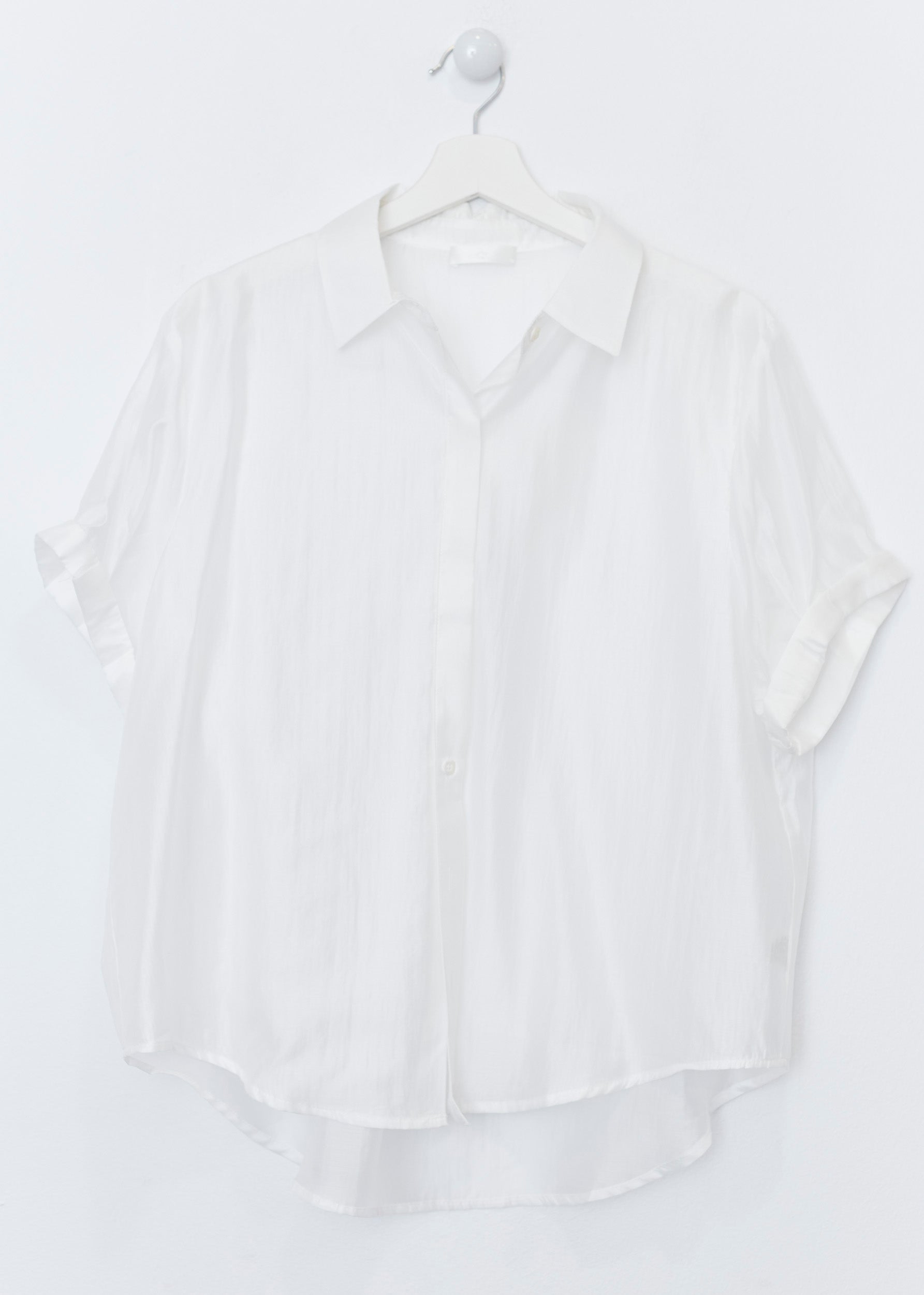 Shirt with lapel collar and short sleeves finished in a turn-up. Buttoned front closure. Irregular bottoms.