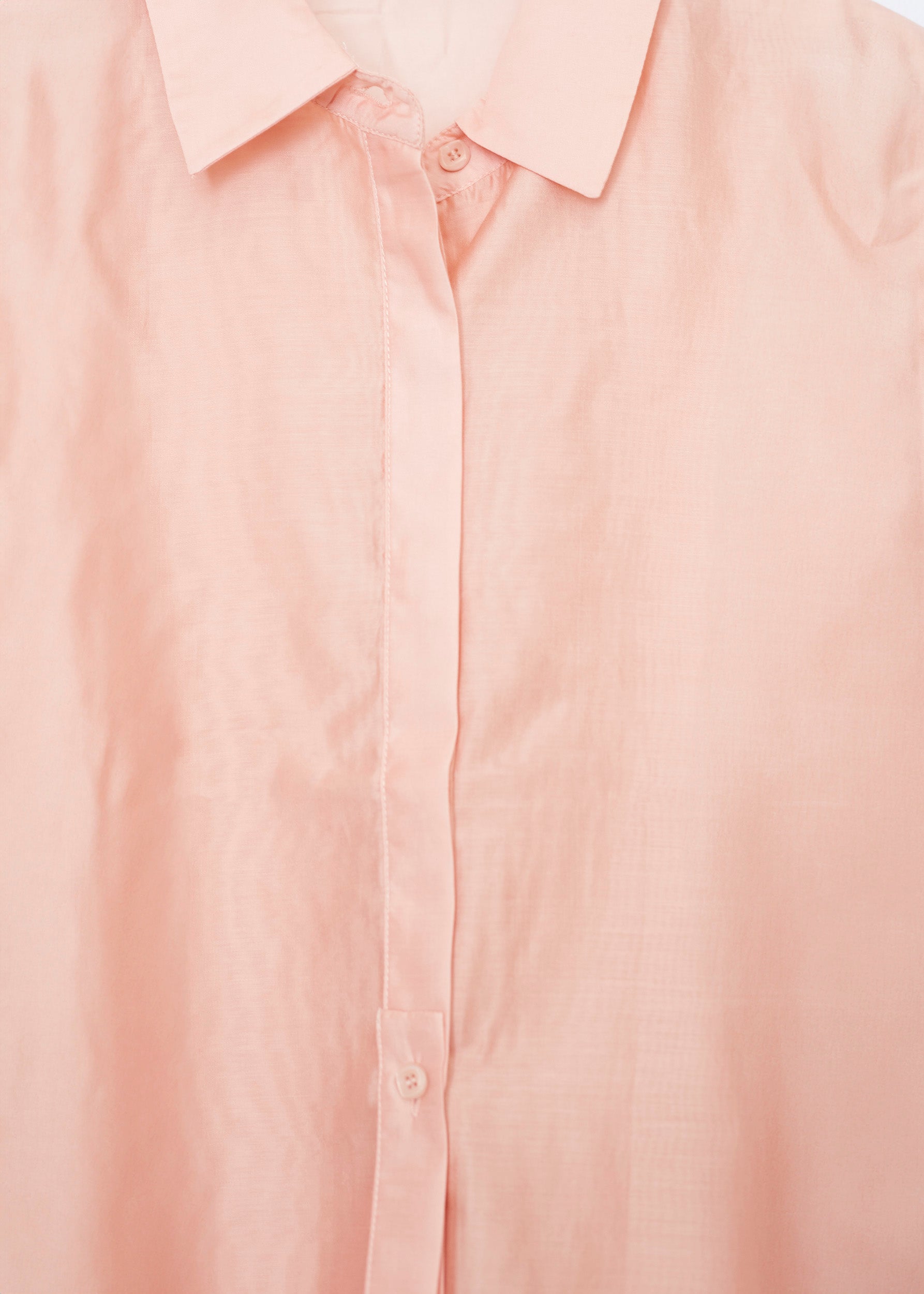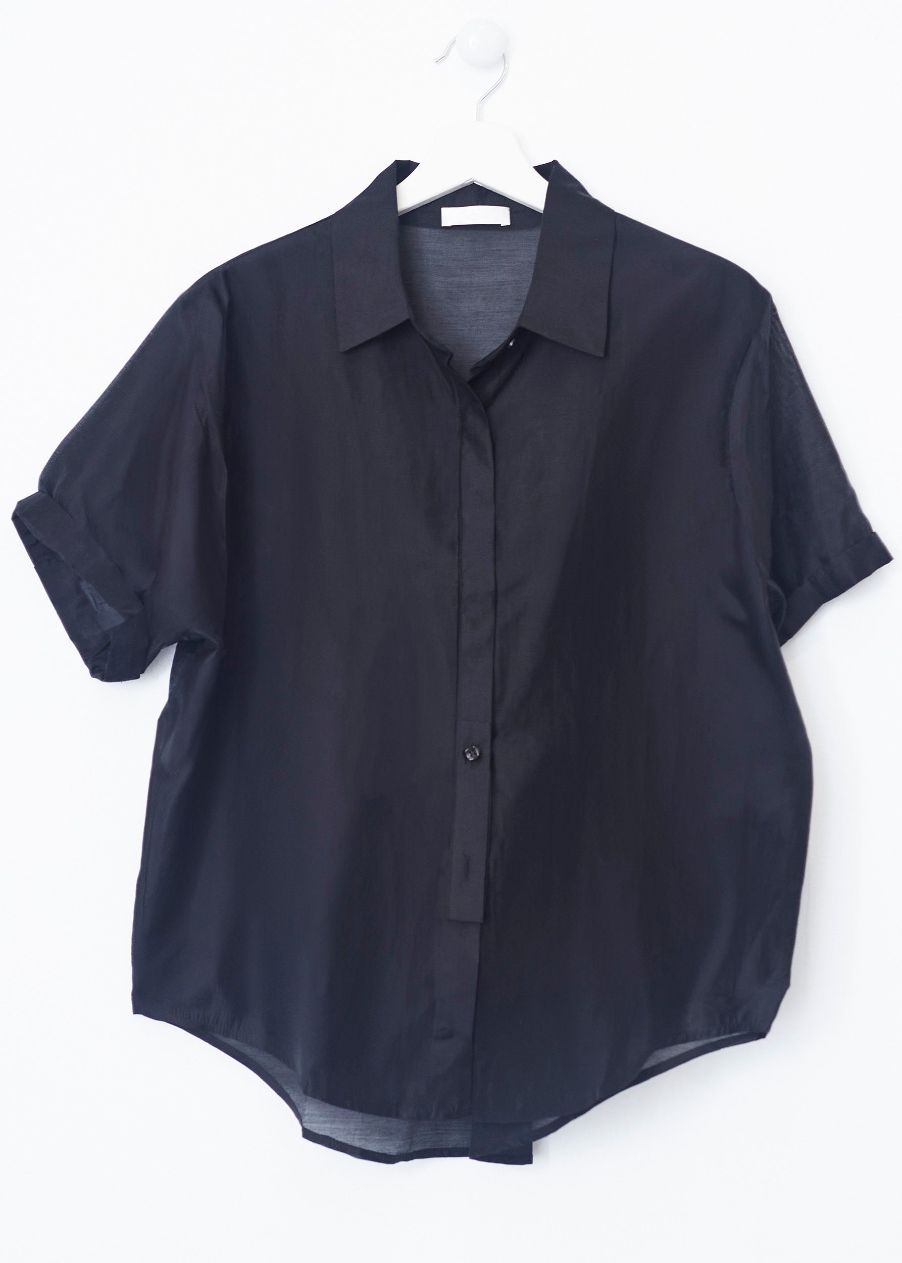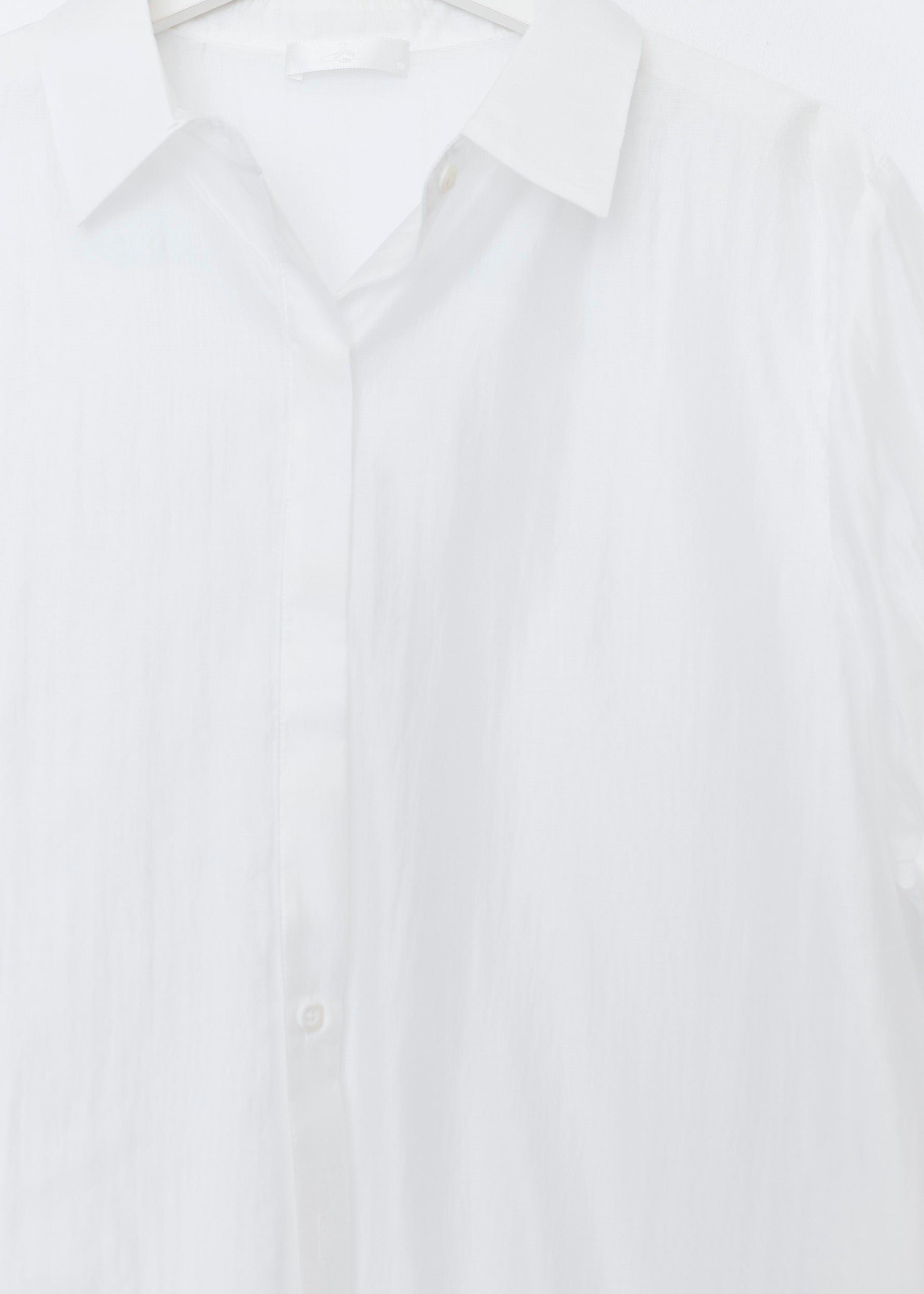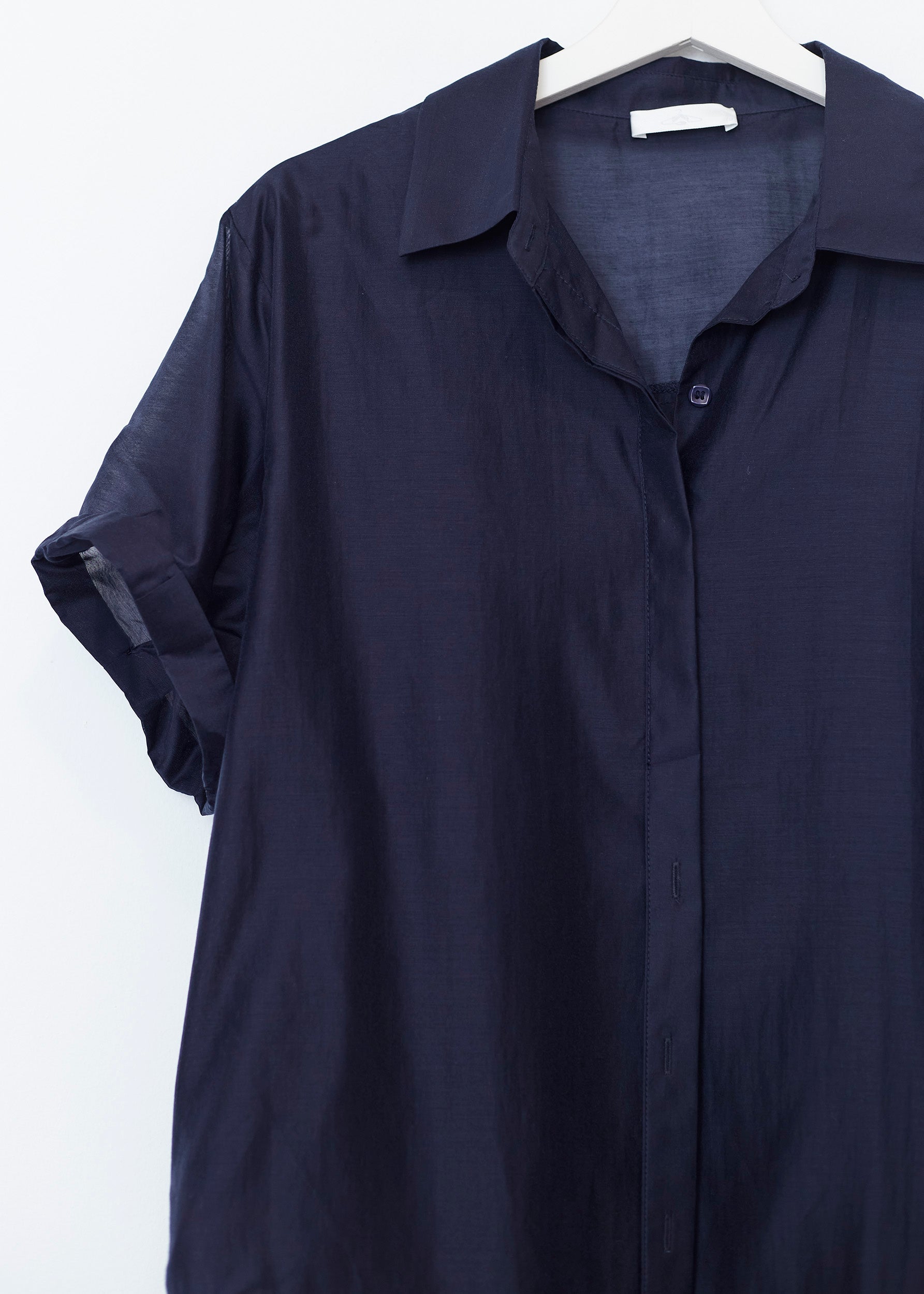 Shirt with lapel collar and short sleeves finished in a turn-up. Buttoned front closure. Irregular bottoms.