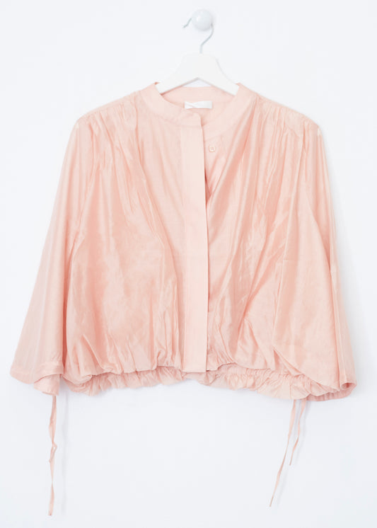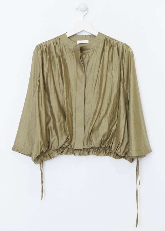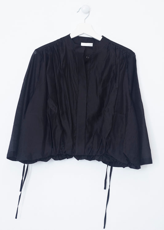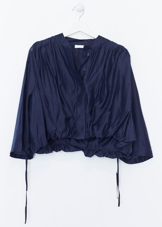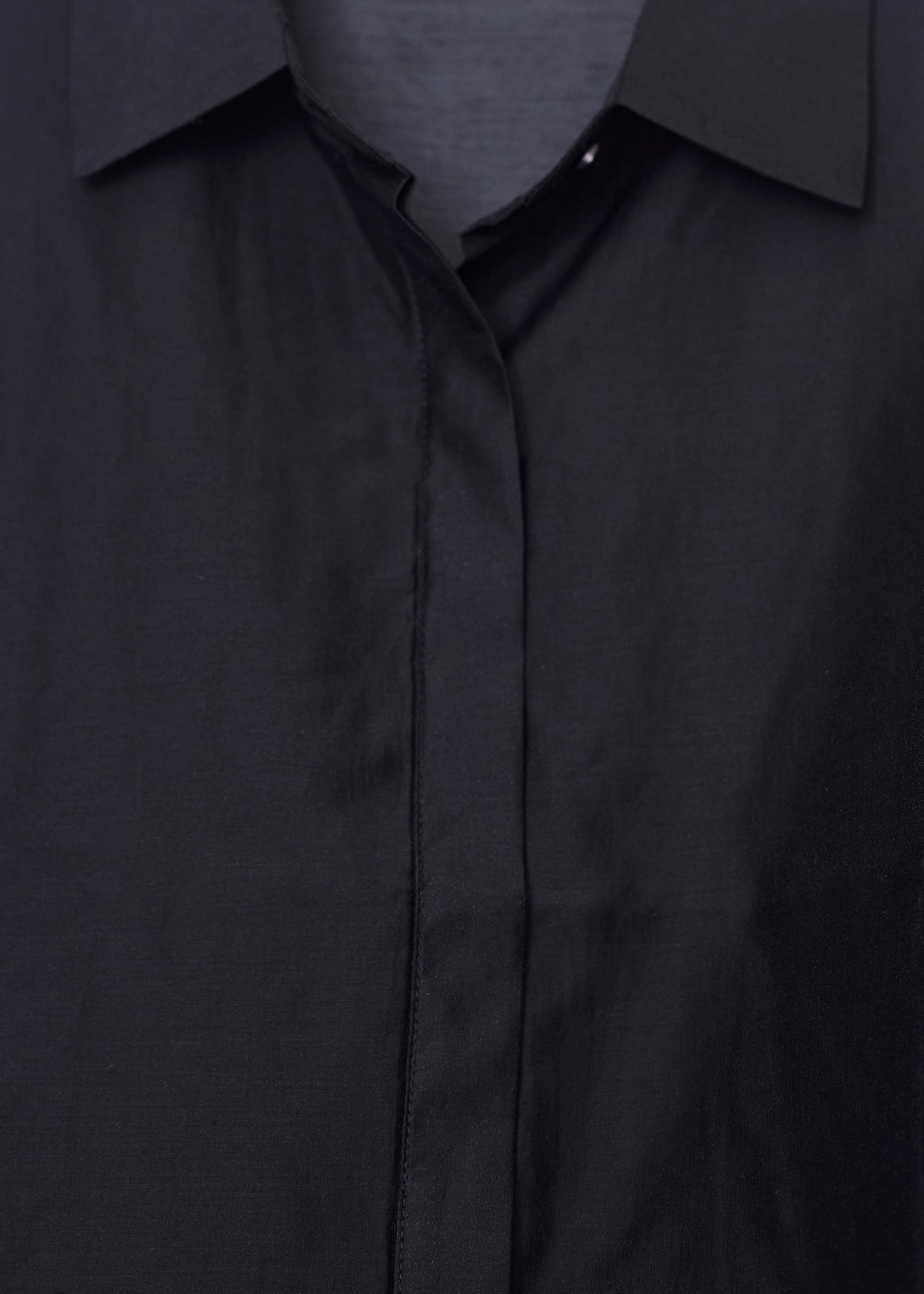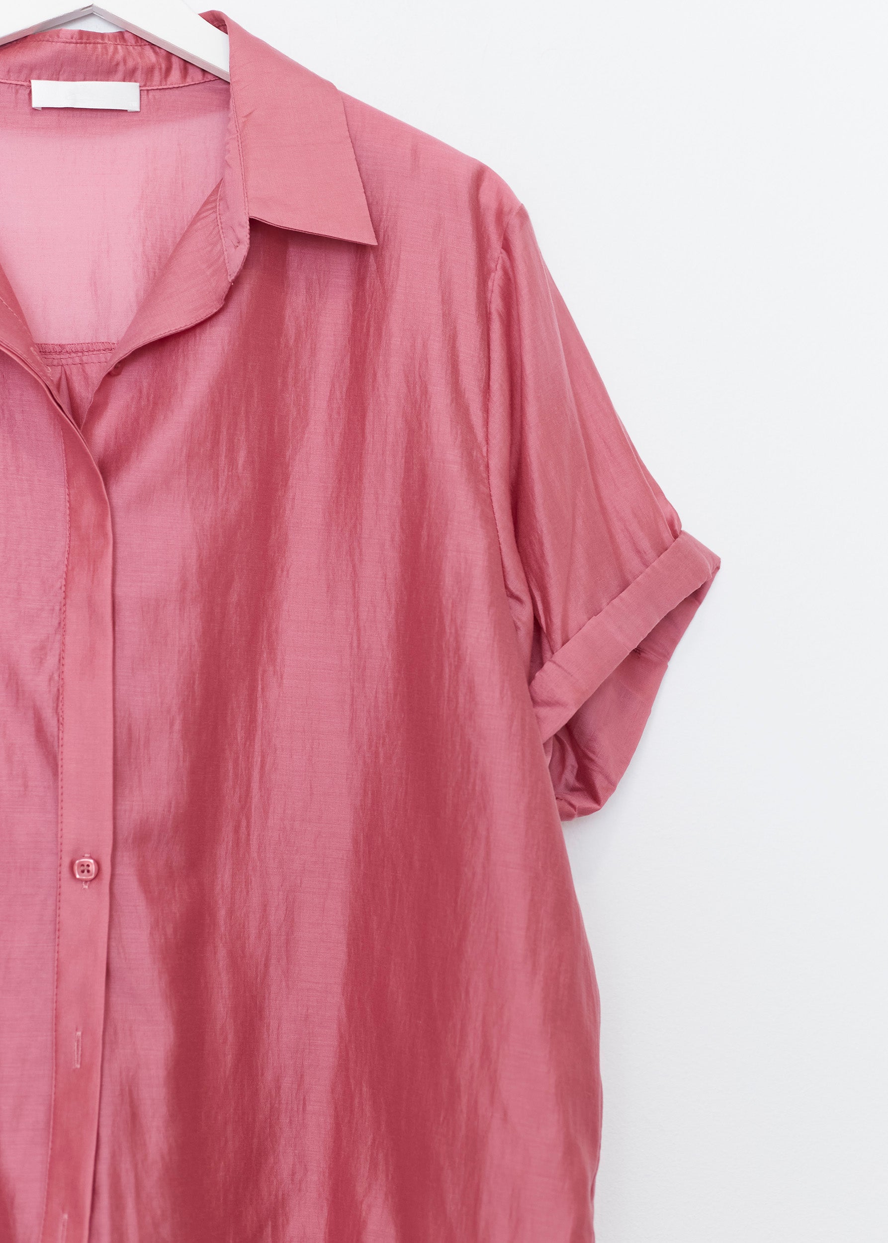 Shirt with lapel collar and short sleeves finished in a turn-up. Buttoned front closure. Irregular bottoms.