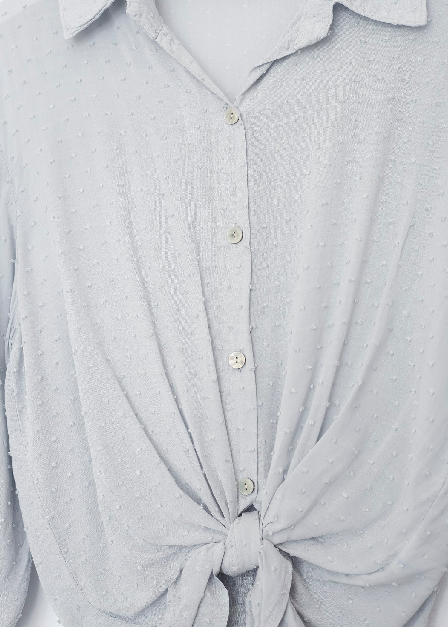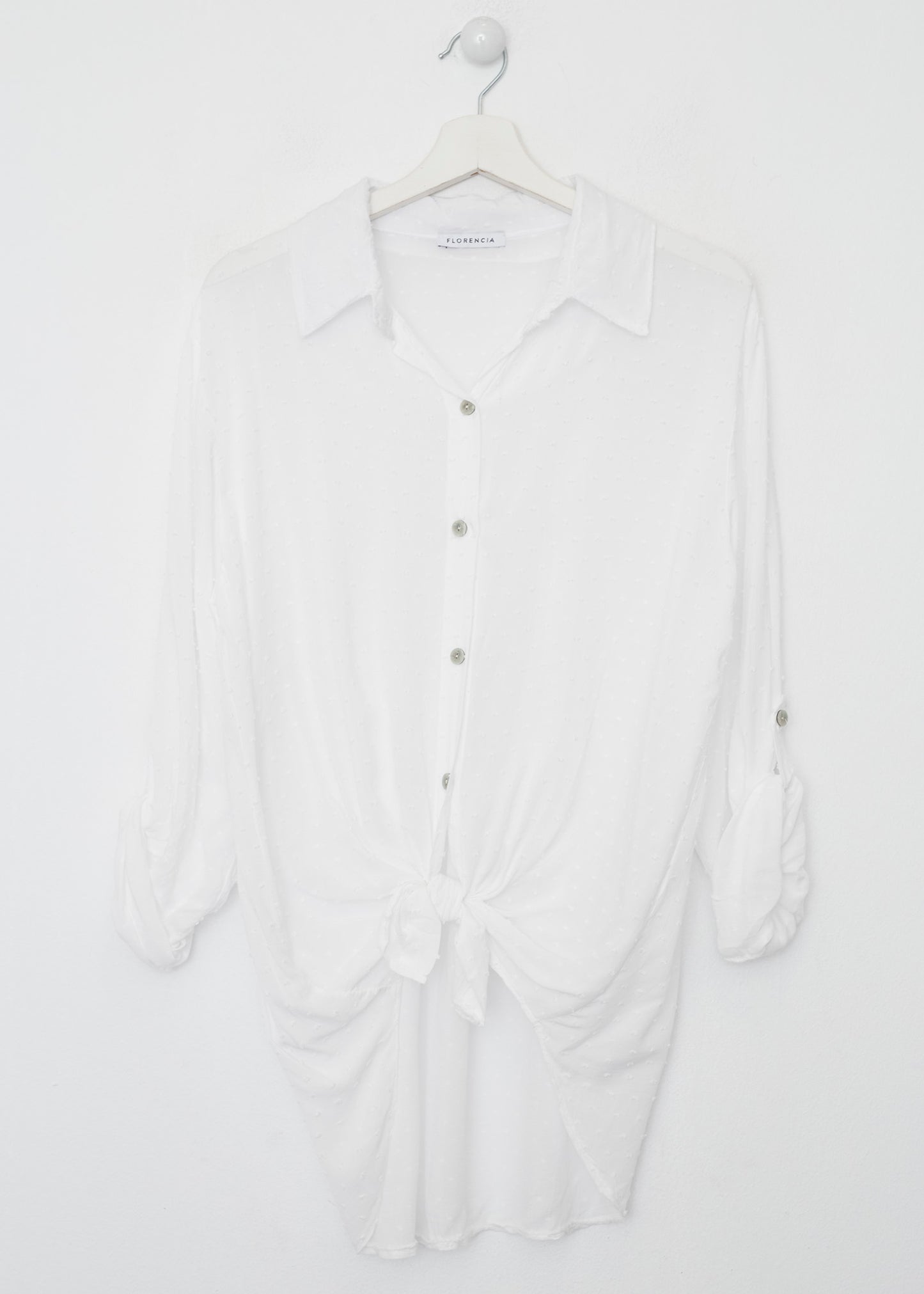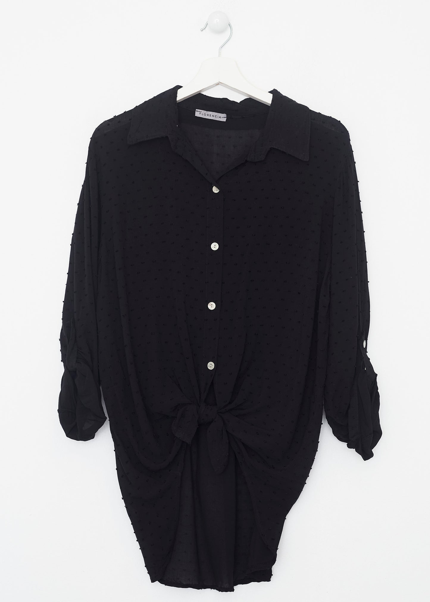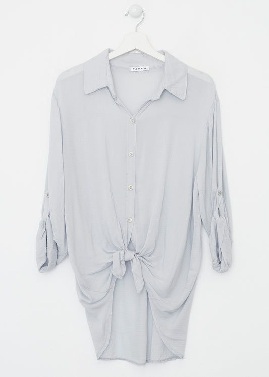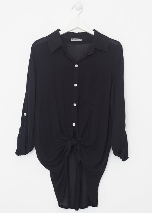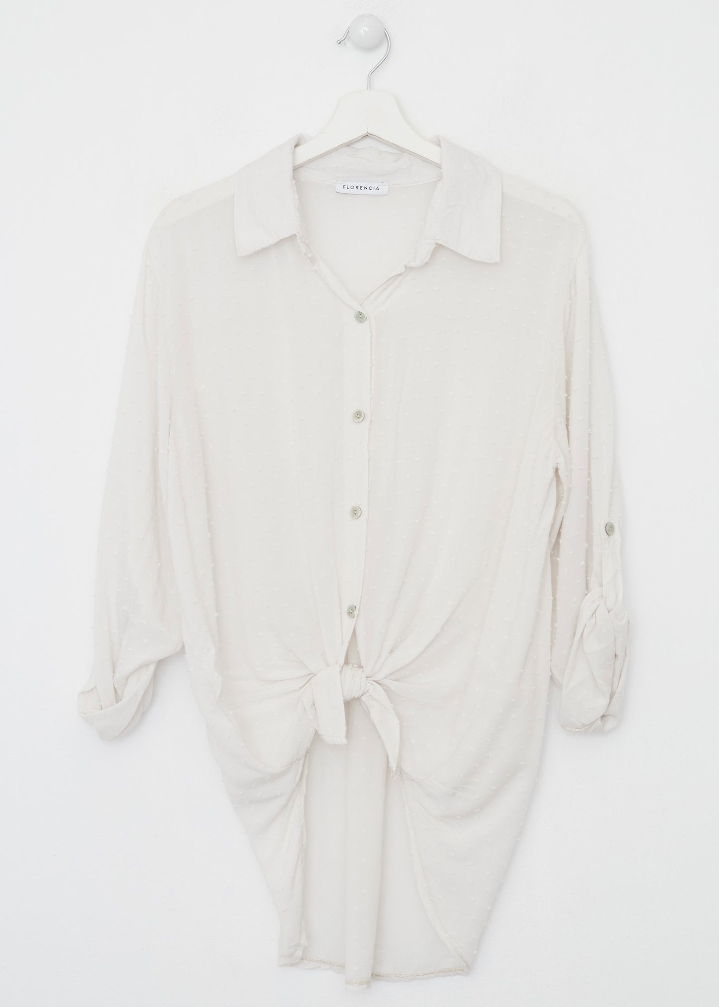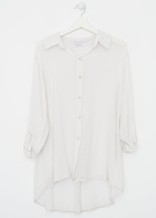 Camisa de cuello solapa y manga larga ajustable con detalle de trabilla y botón. Bajos asimétricos. Corte amplio. Tejido tipo plumeti.