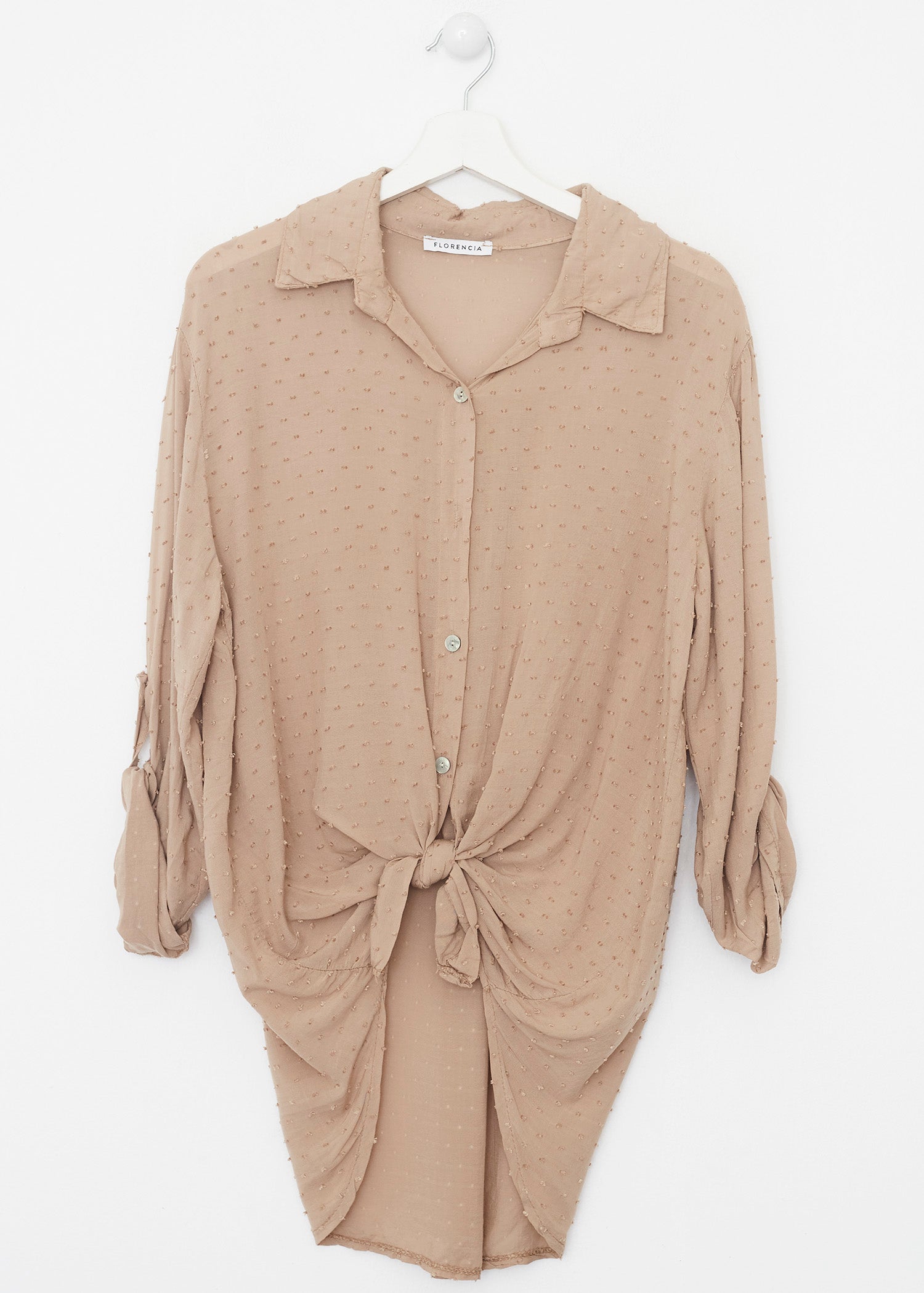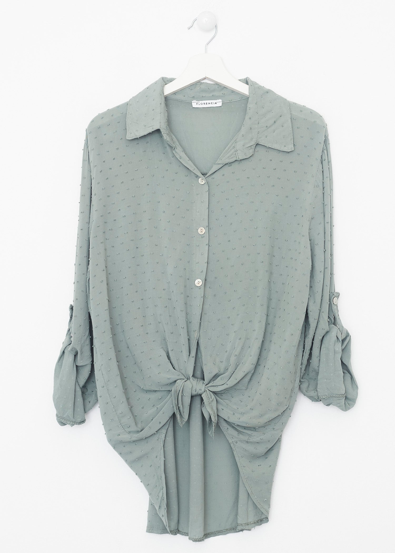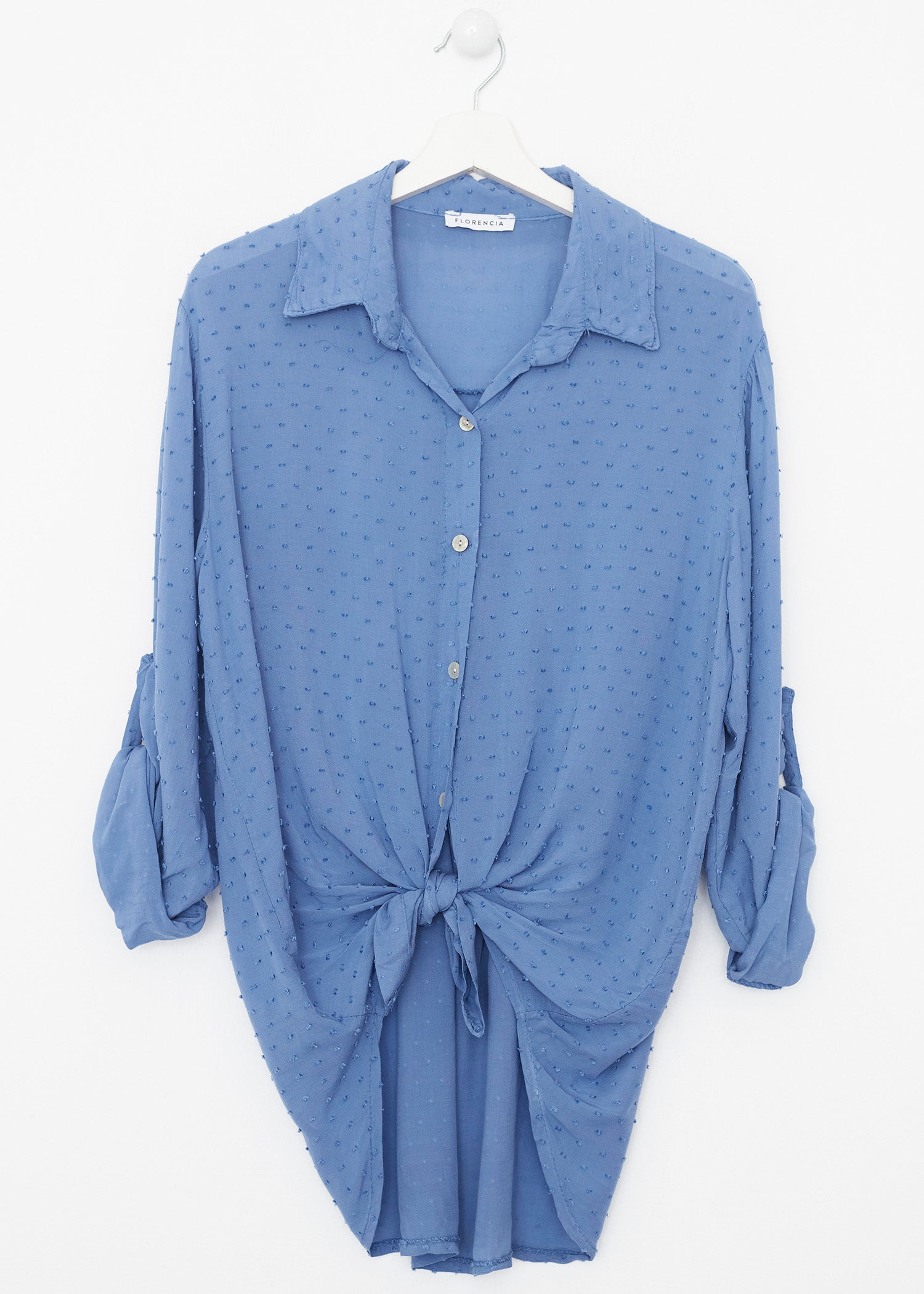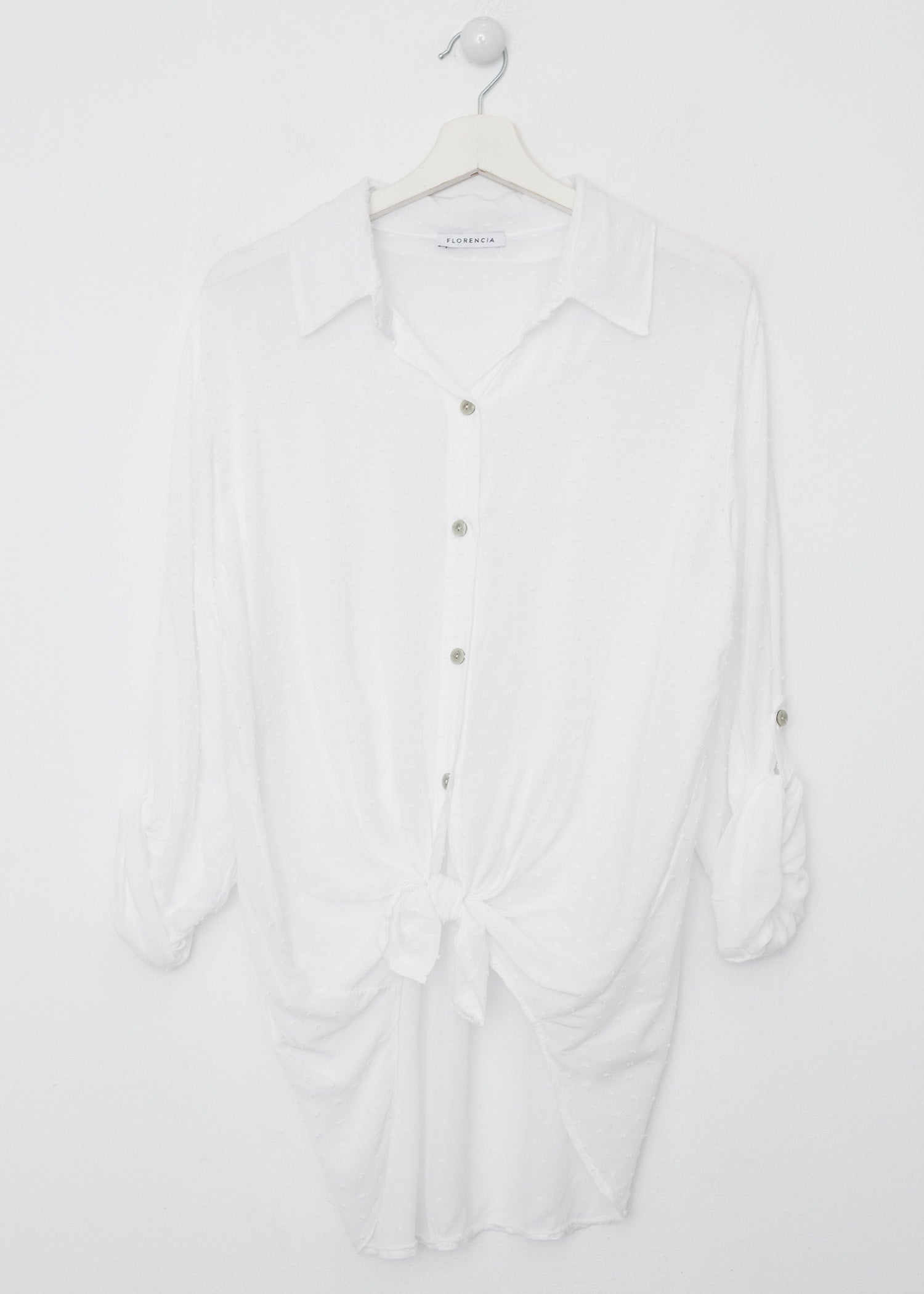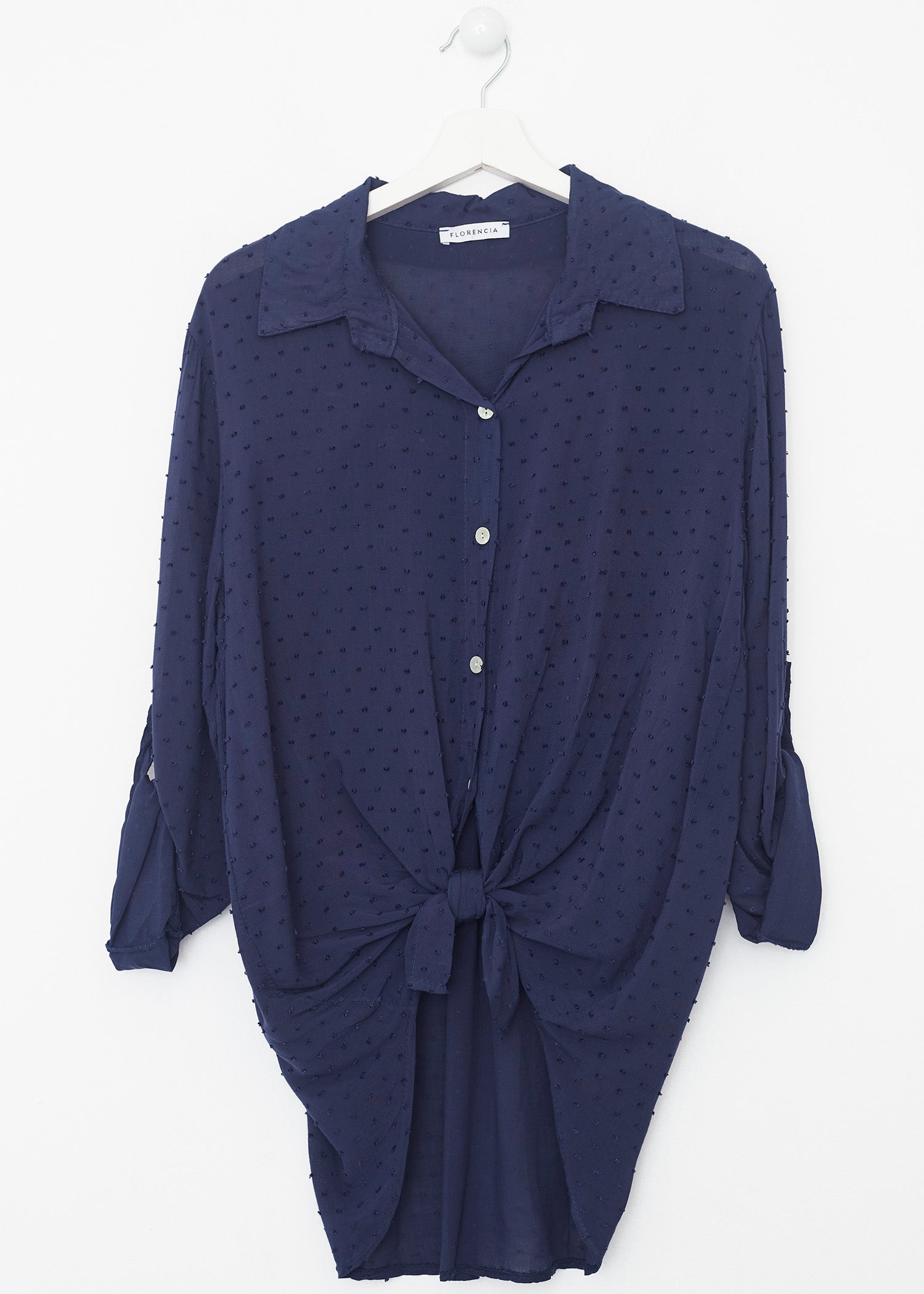 Camisa de cuello solapa y manga larga ajustable con detalle de trabilla y botón. Bajos asimétricos. Corte amplio. Tejido tipo plumeti.