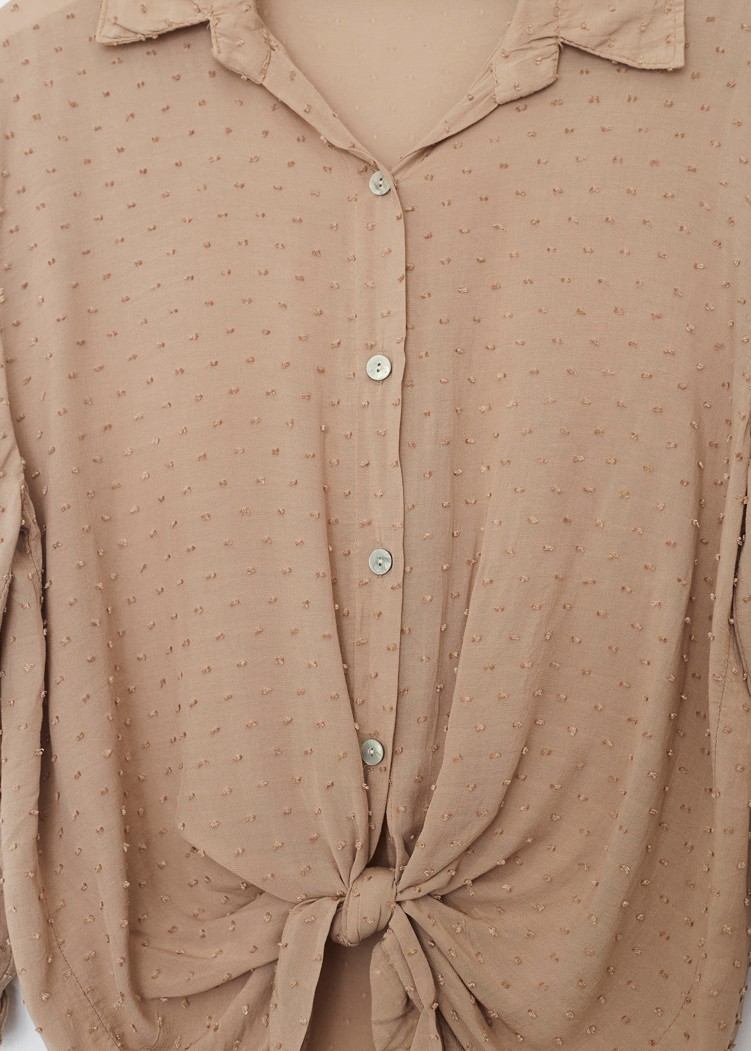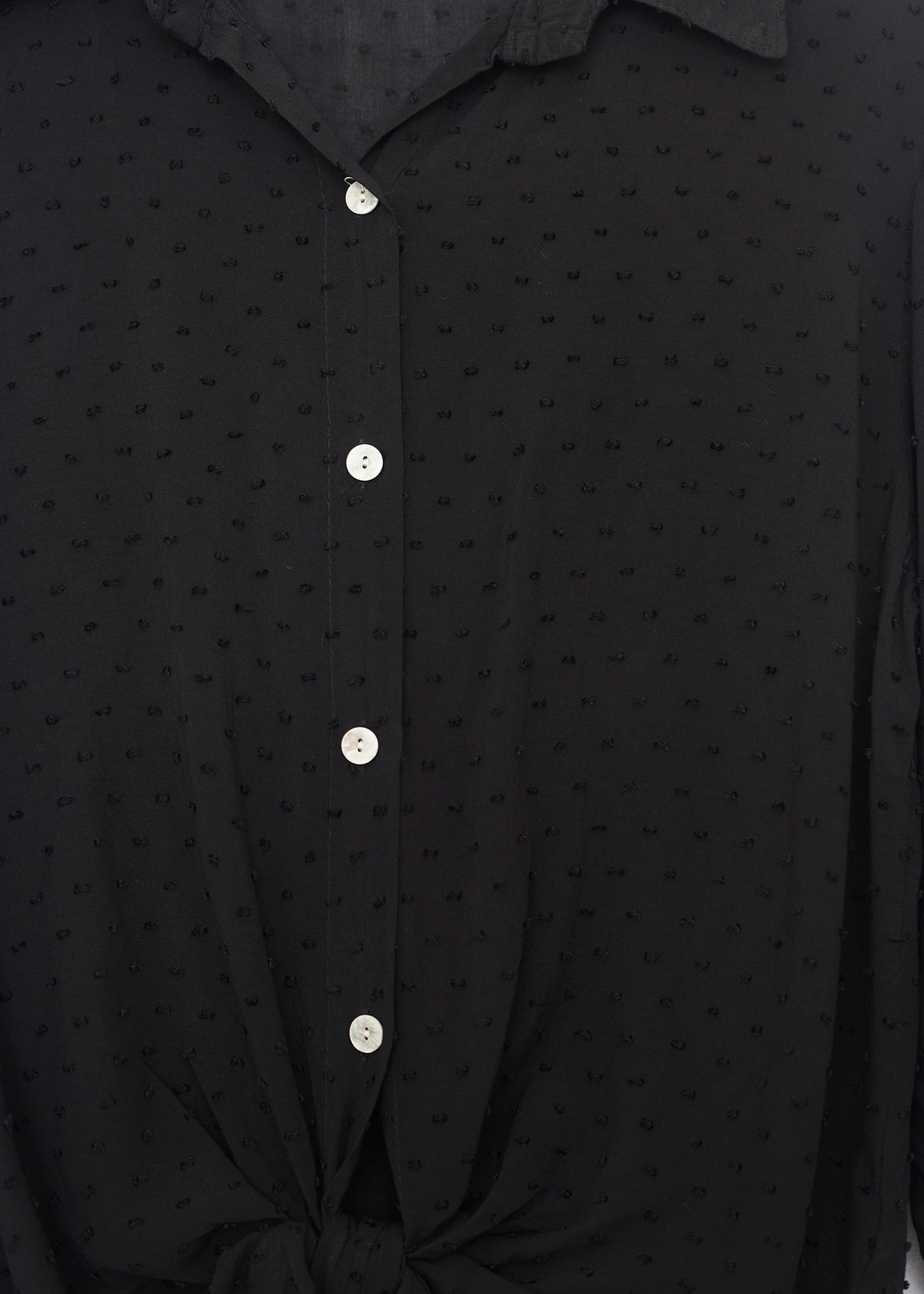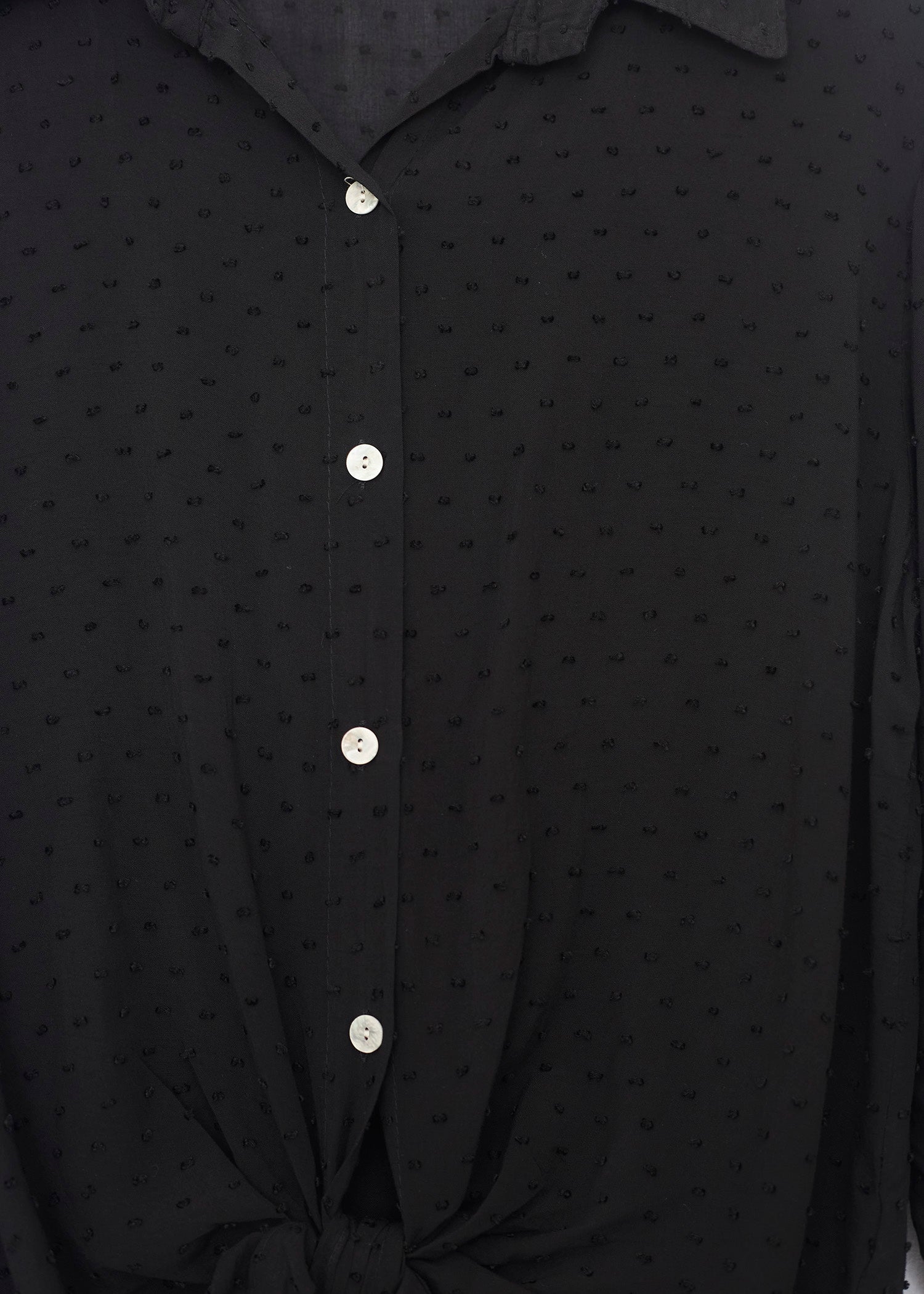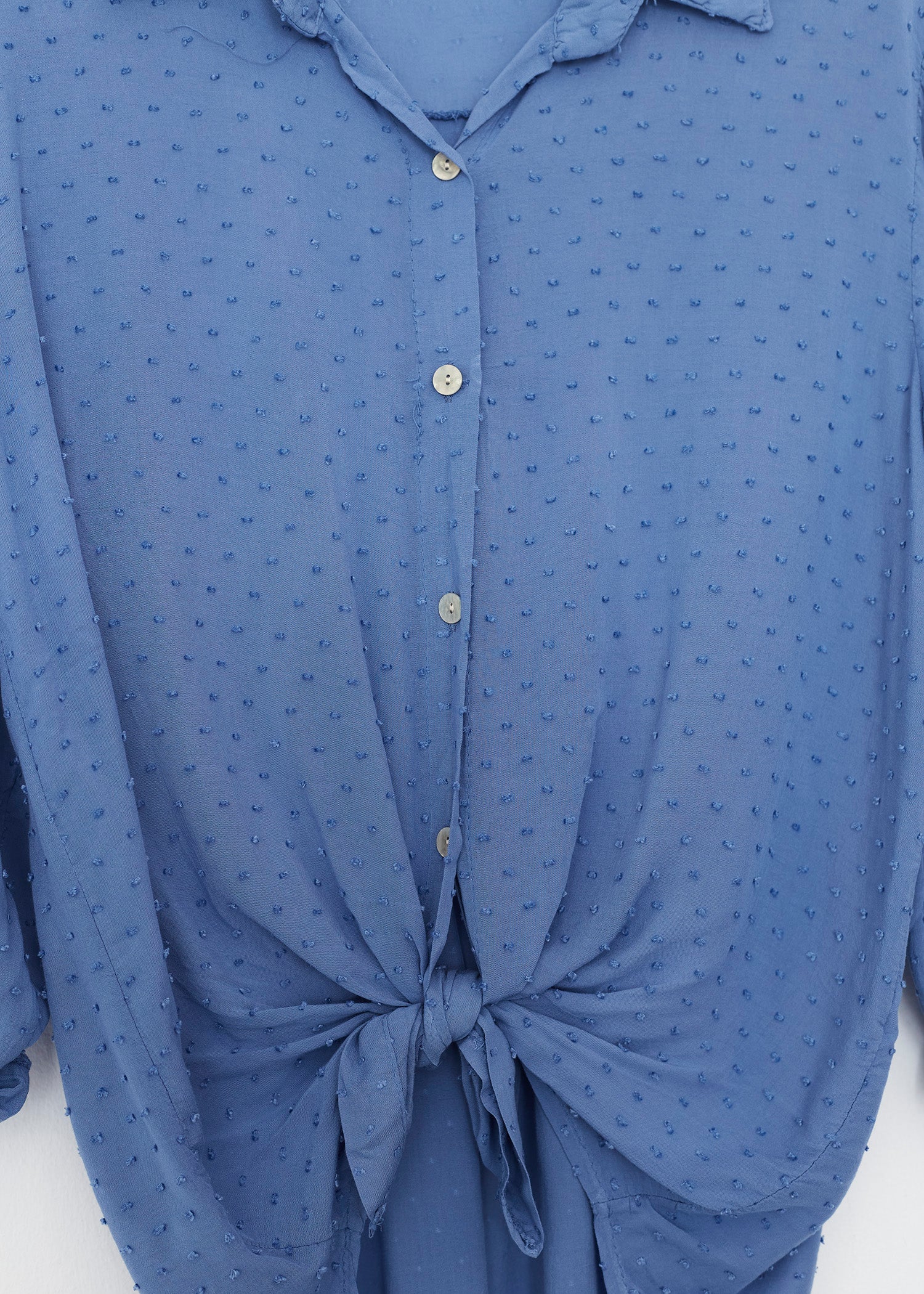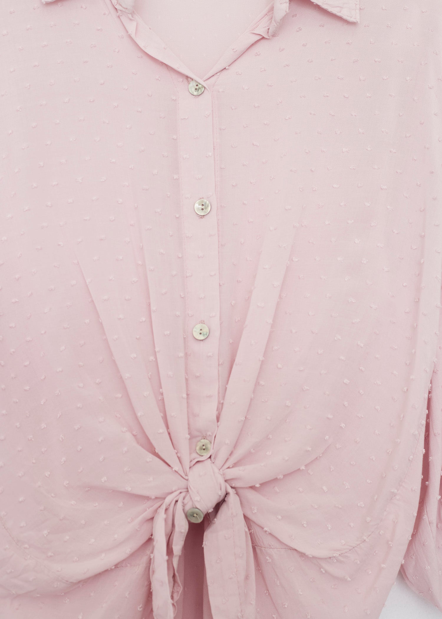 Camisa de cuello solapa y manga larga ajustable con detalle de trabilla y botón. Bajos asimétricos. Corte amplio. Tejido tipo plumeti.