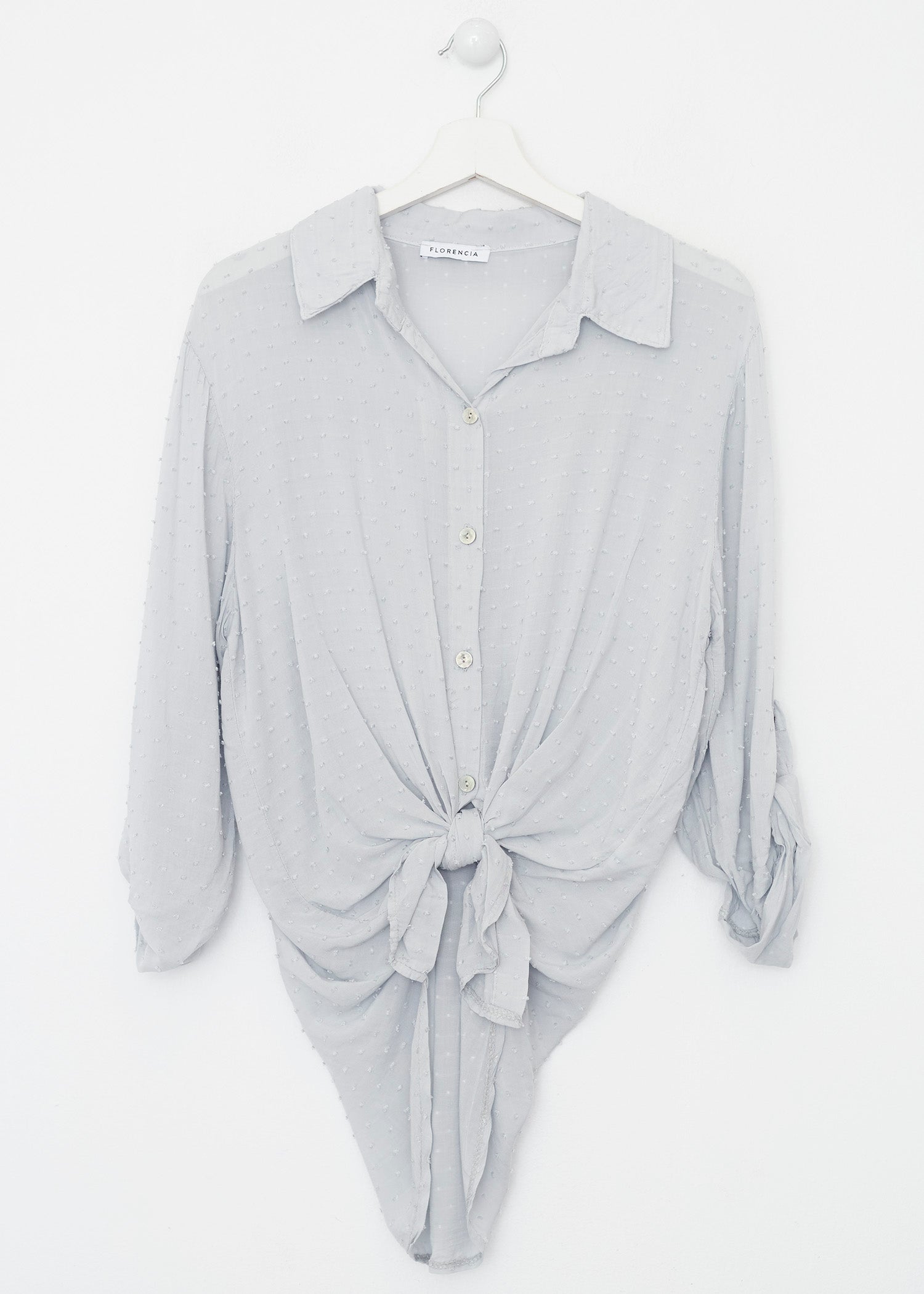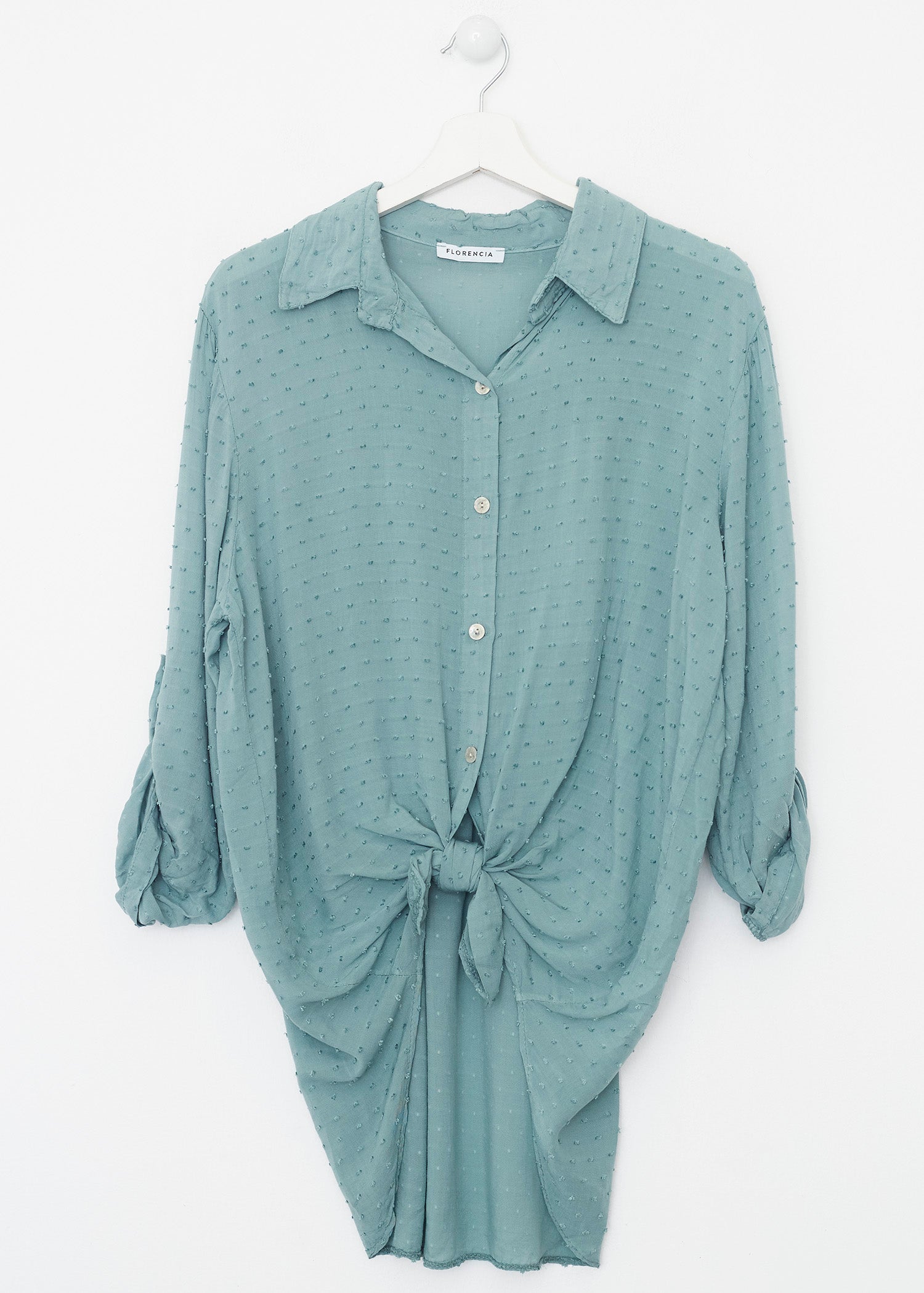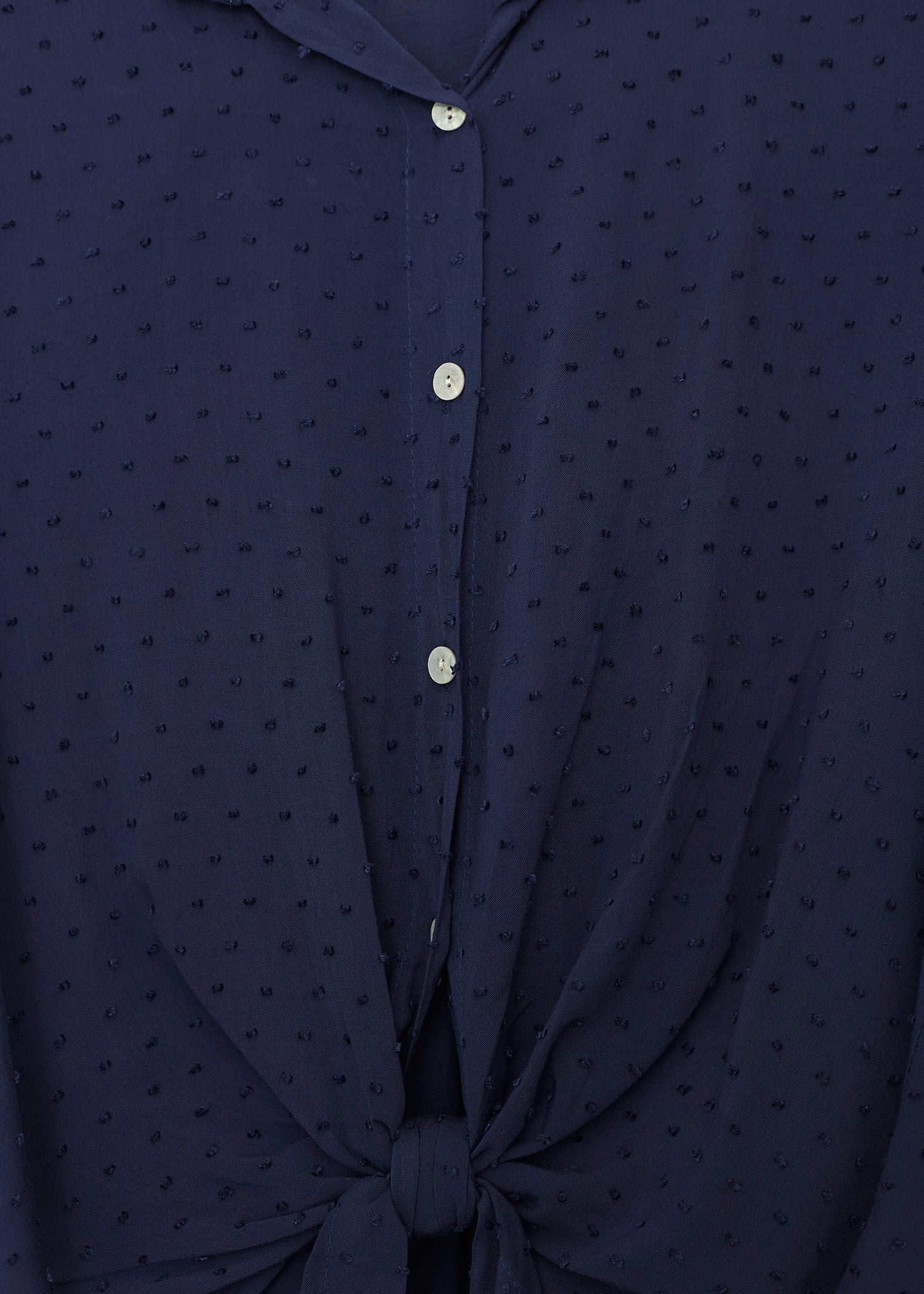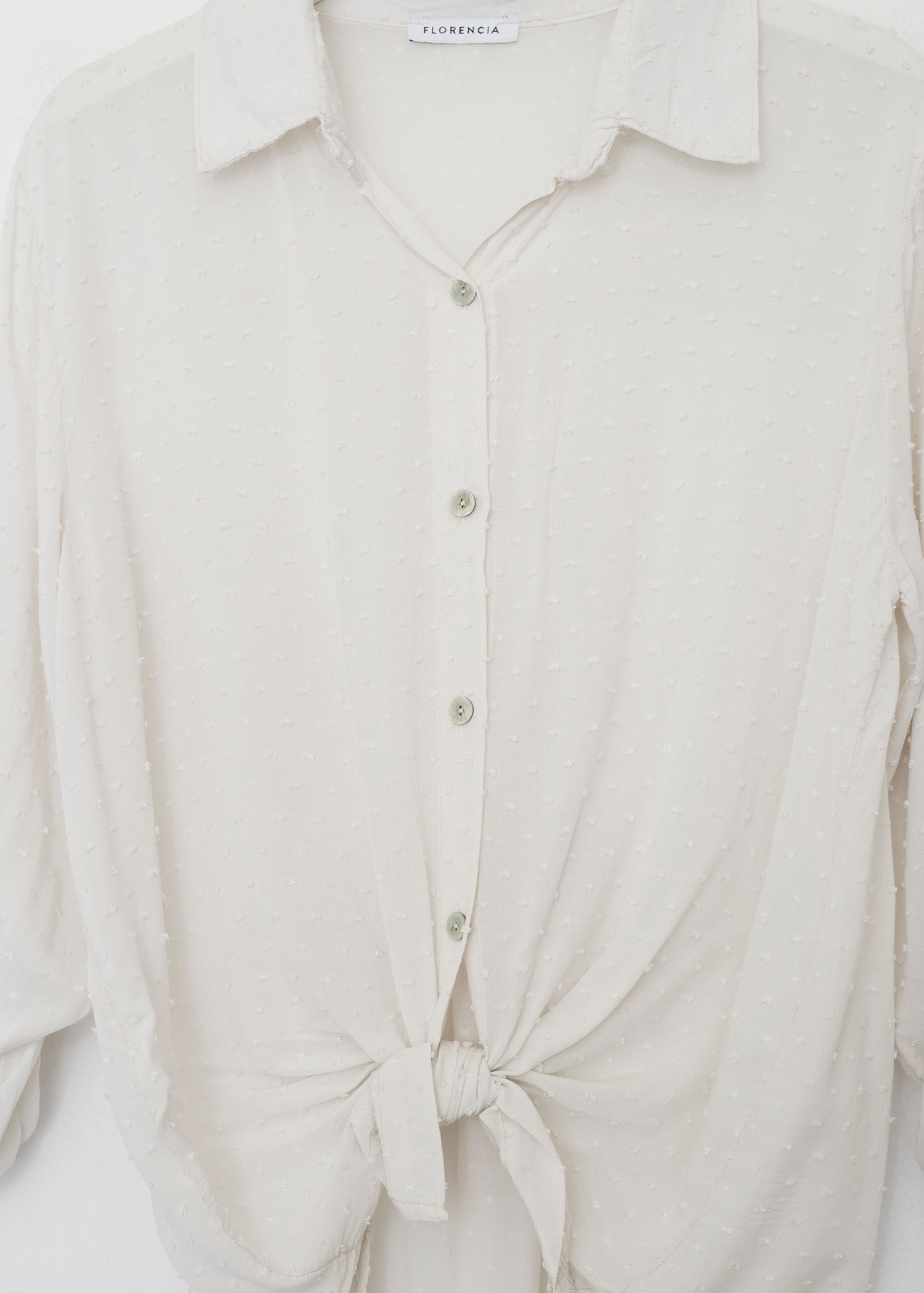 Camisa de cuello solapa y manga larga ajustable con detalle de trabilla y botón. Bajos asimétricos. Corte amplio. Tejido tipo plumeti.