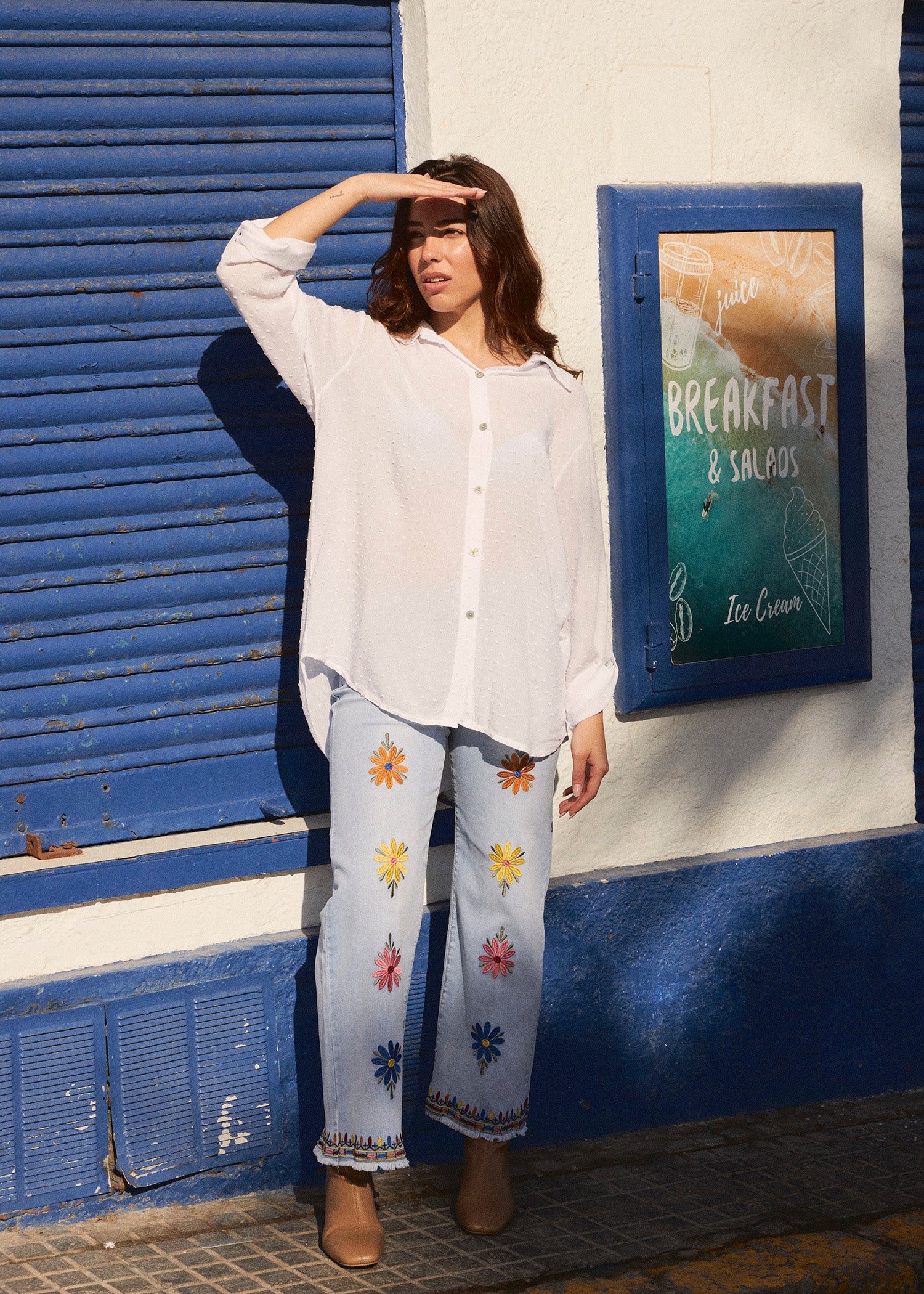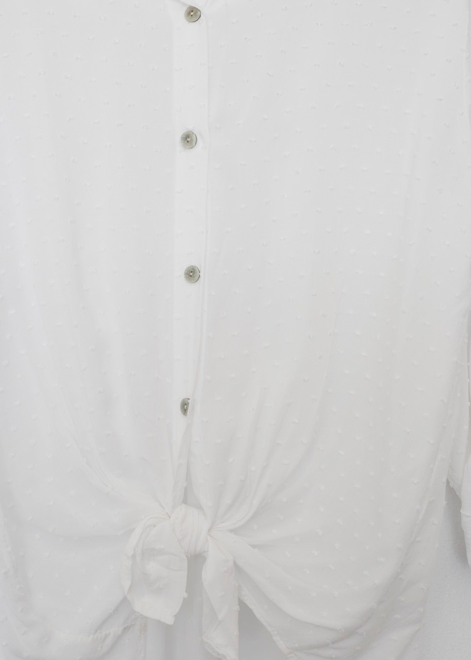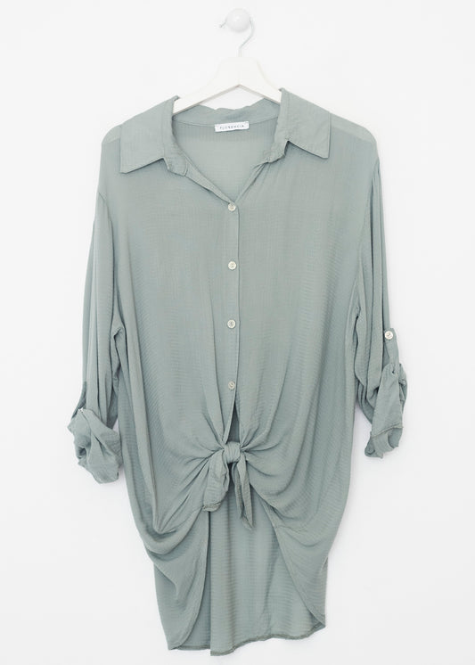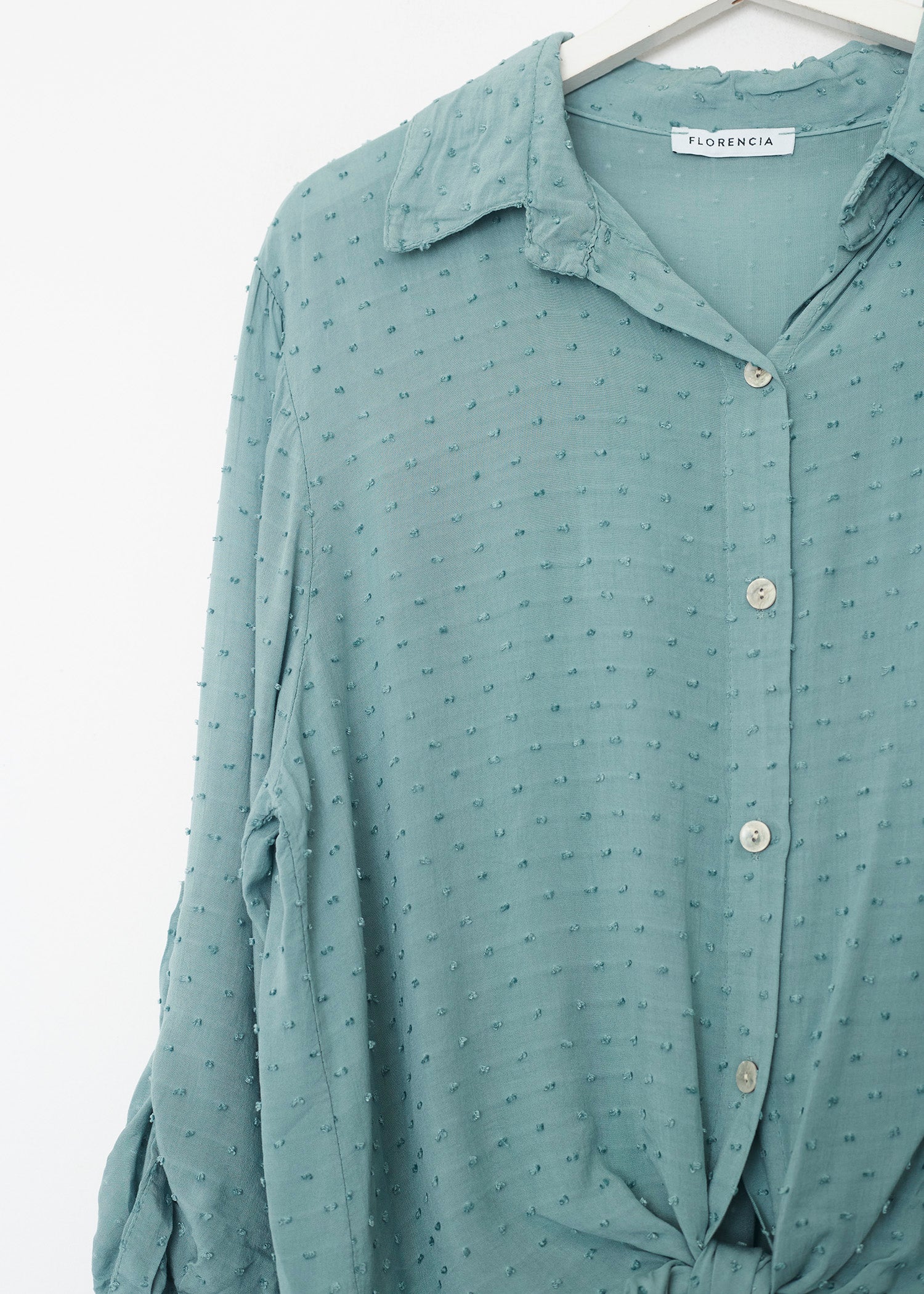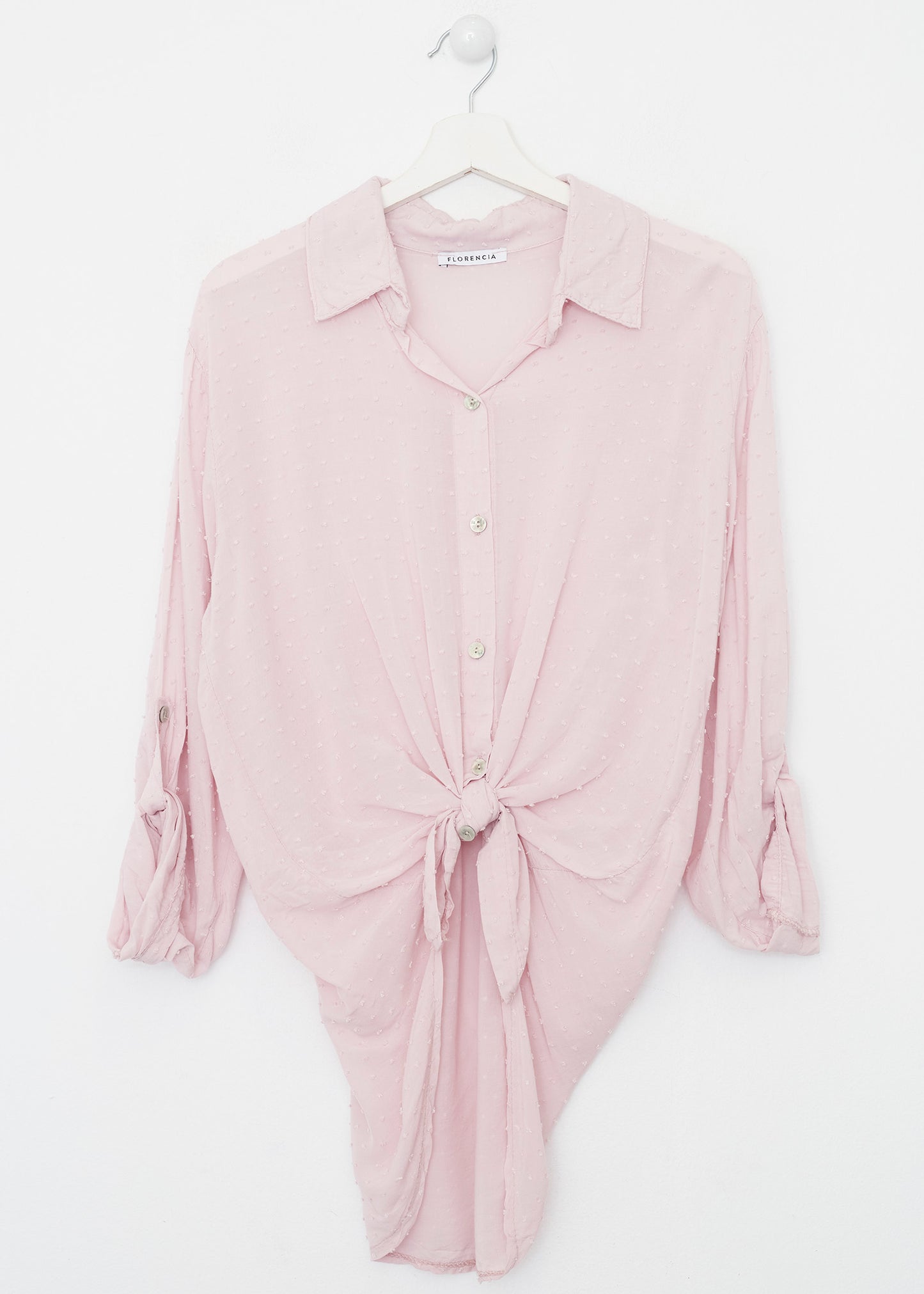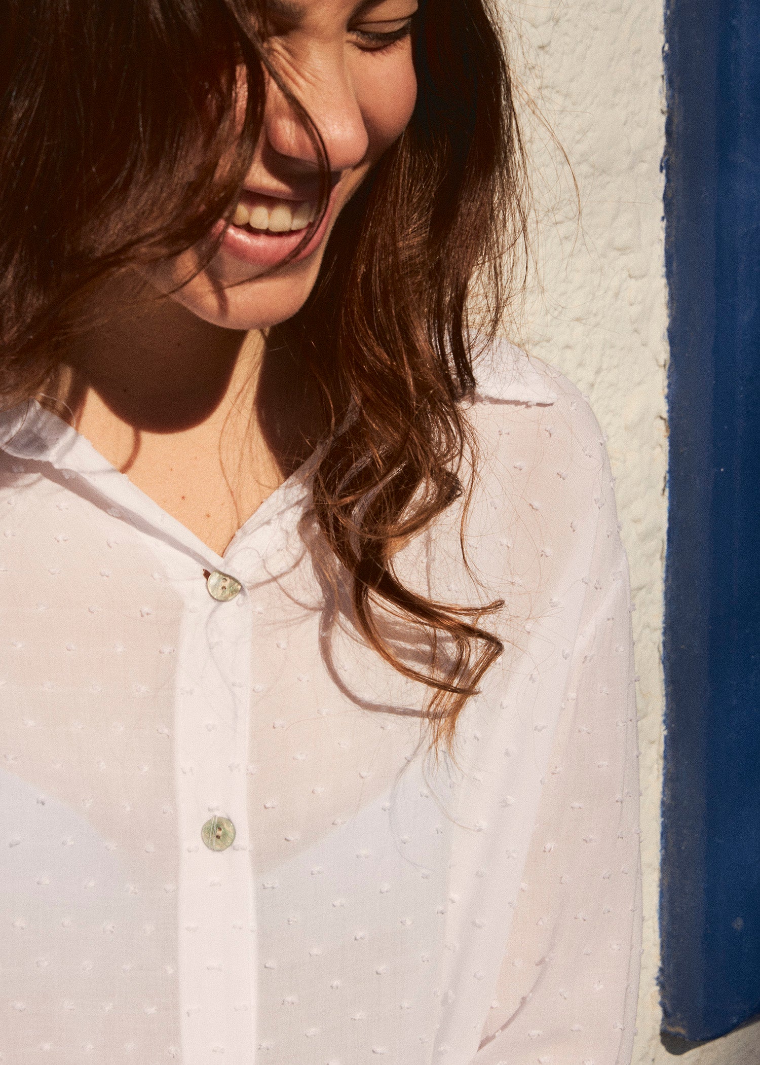Camisa de cuello solapa y manga larga ajustable con detalle de trabilla y botón. Bajos asimétricos. Corte amplio. Tejido tipo plumeti.