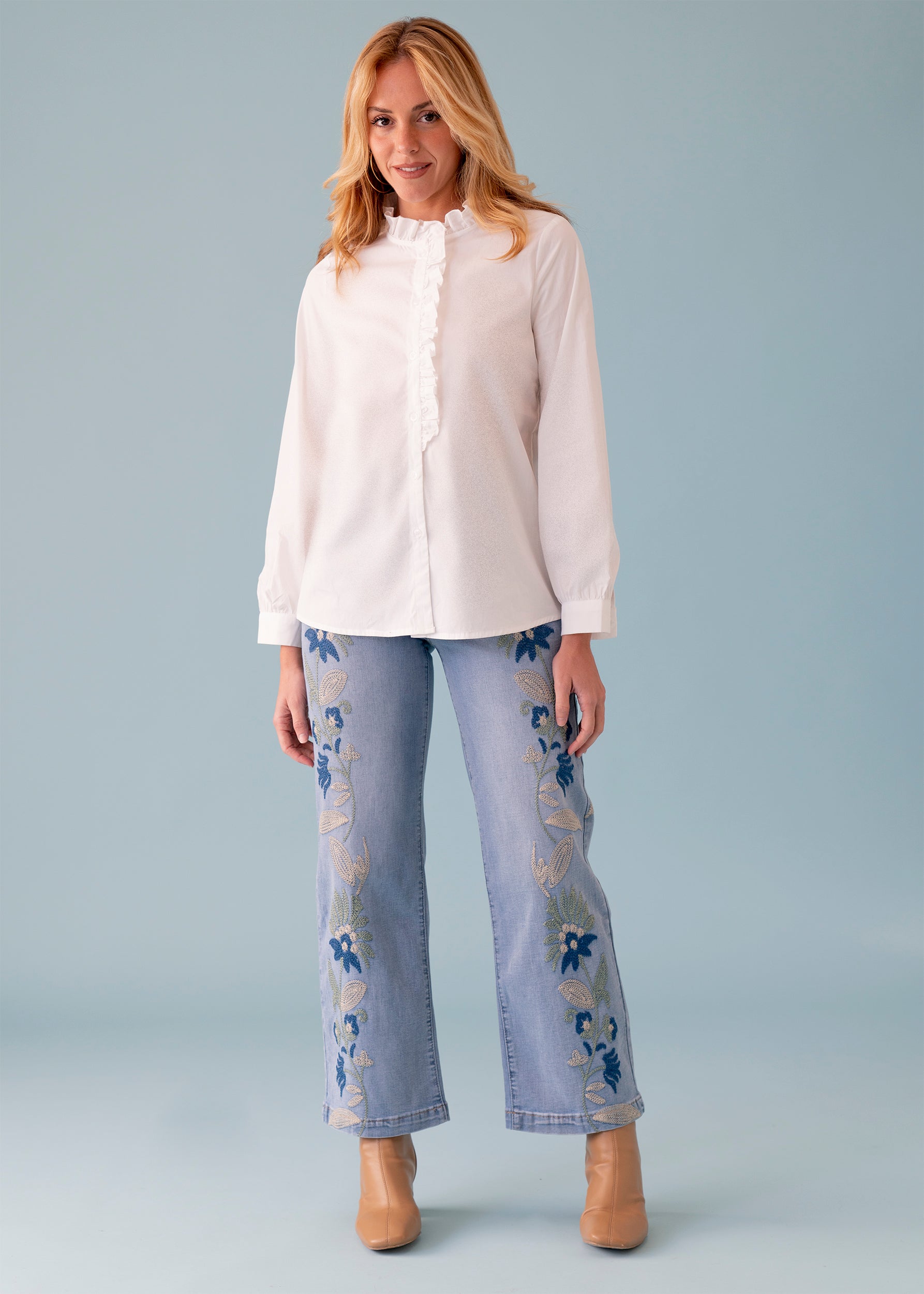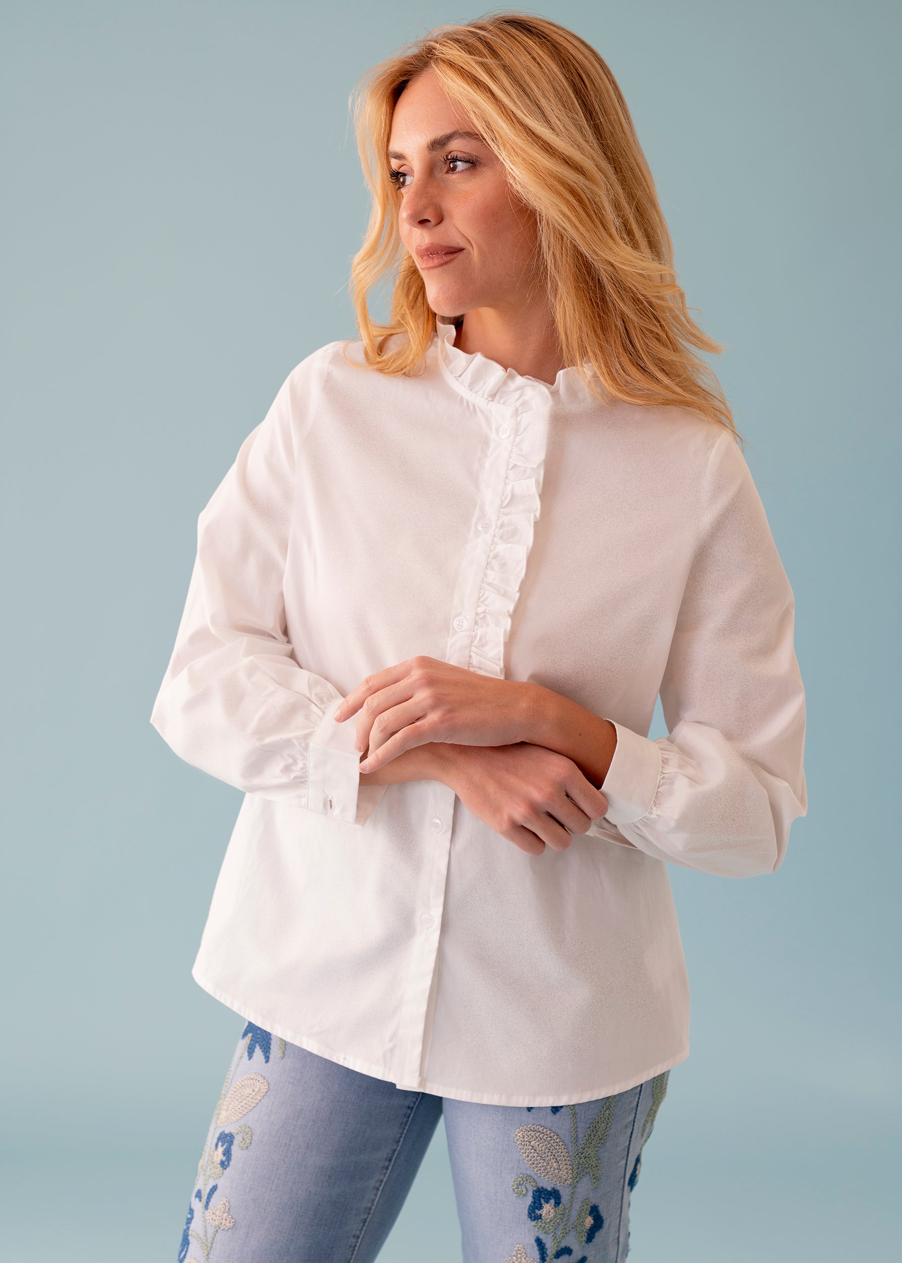 Camisa cuello subido y manga larga acabada en puños abotonados. Detalle de volantes en cuello y pecho. Cierre frontal abotonado. Corte recto.