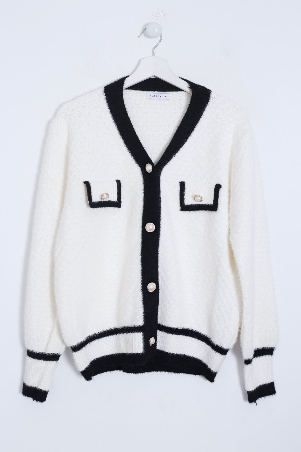 Cárdigan de escote en punta y manga larga. Cierre frontal con botones decorativos. Detalle de falsos bolsillos de plastrón delanteros con botón decorativo. Bajo y puños acabados en rib. Ribete a contraste.
