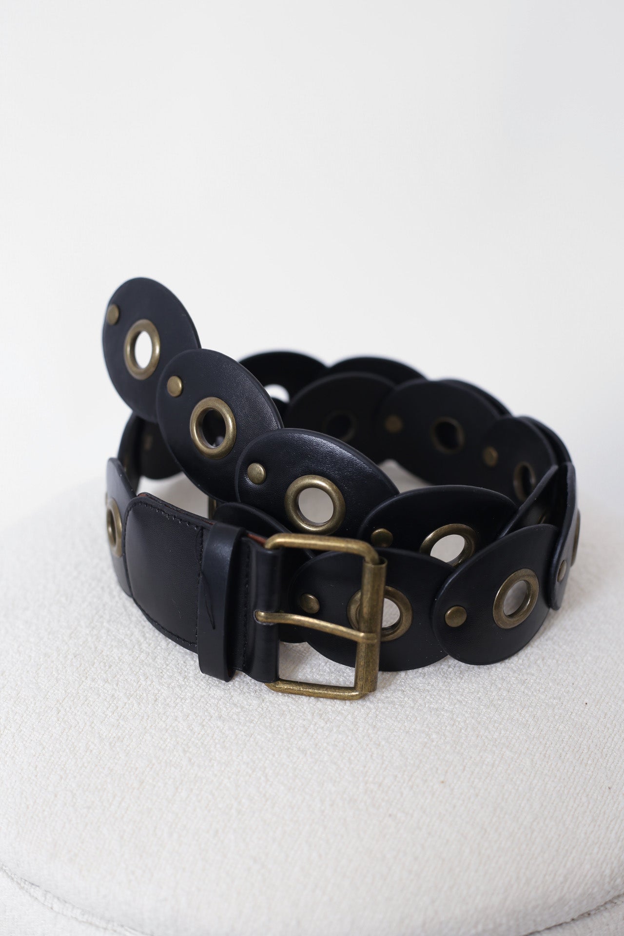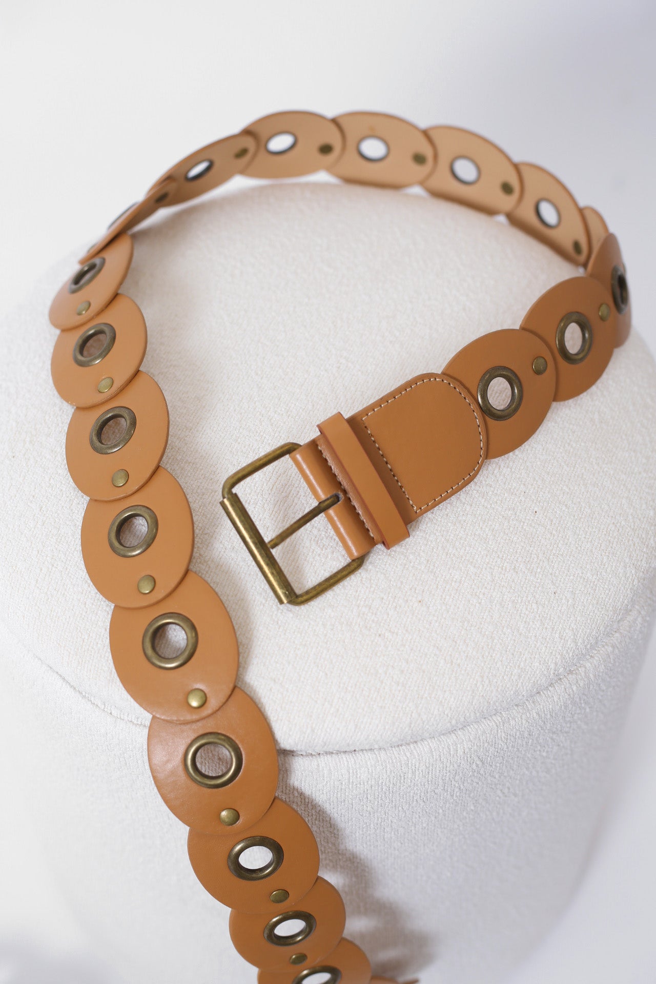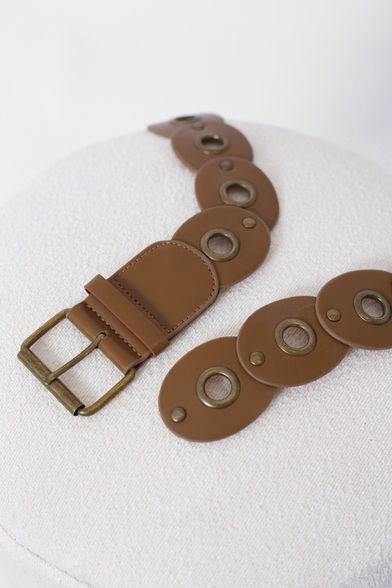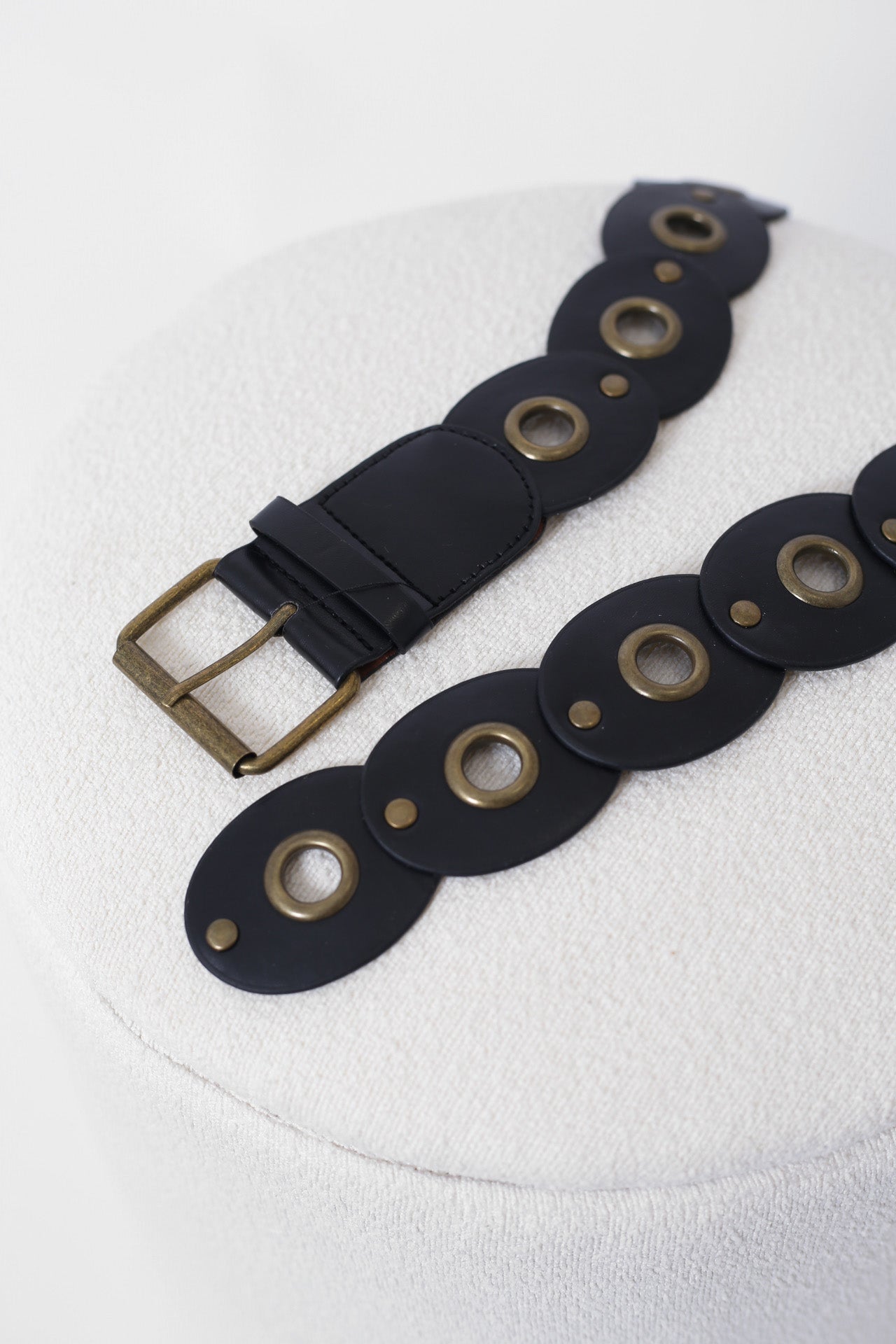 Cinturón con círculos combinados. Detalle de tachuelas y perforados. Hebilla metálica.