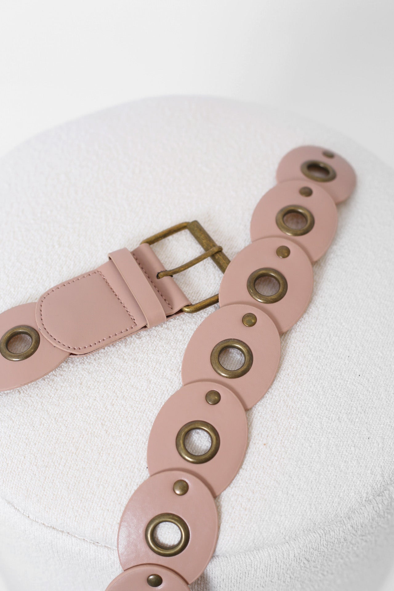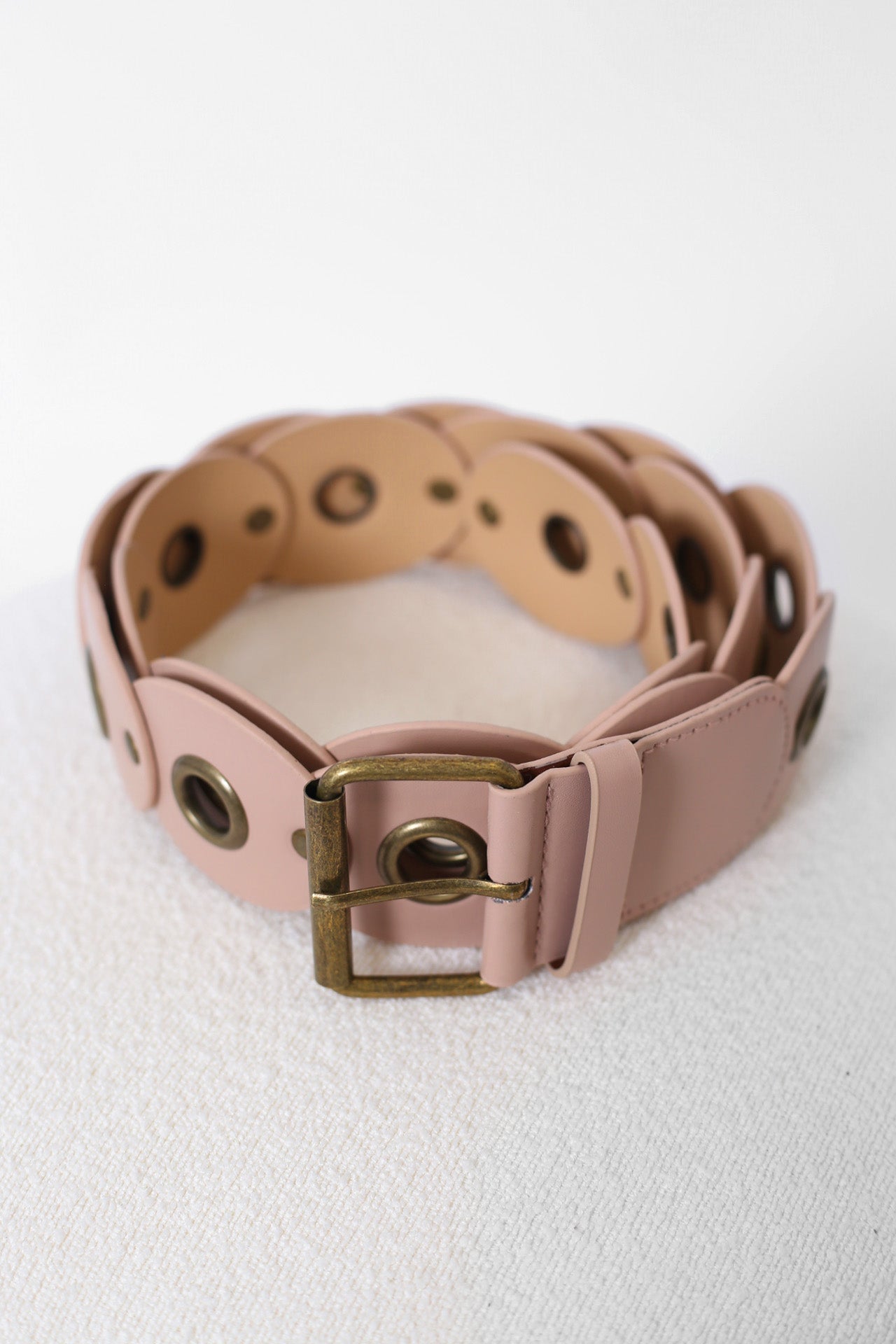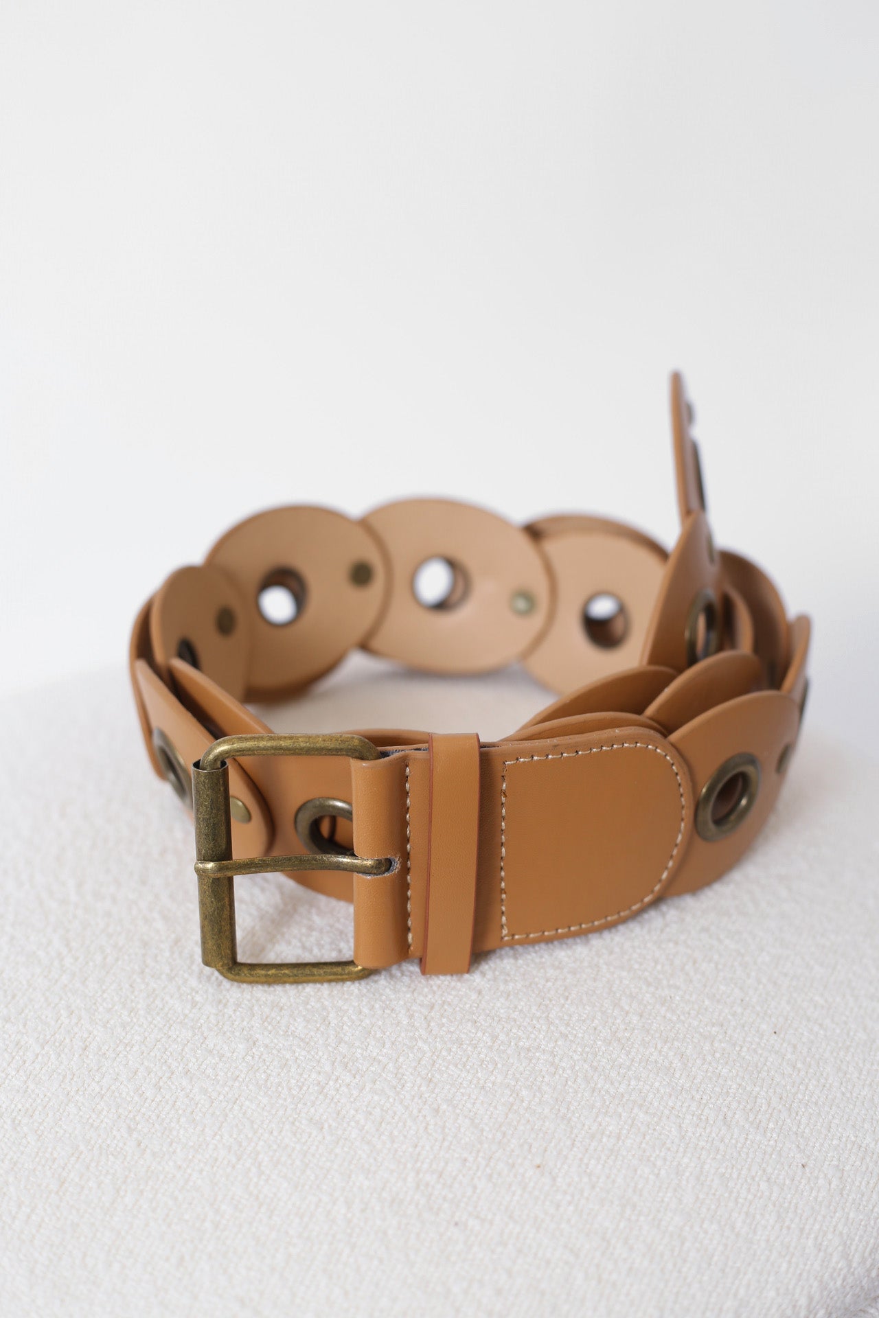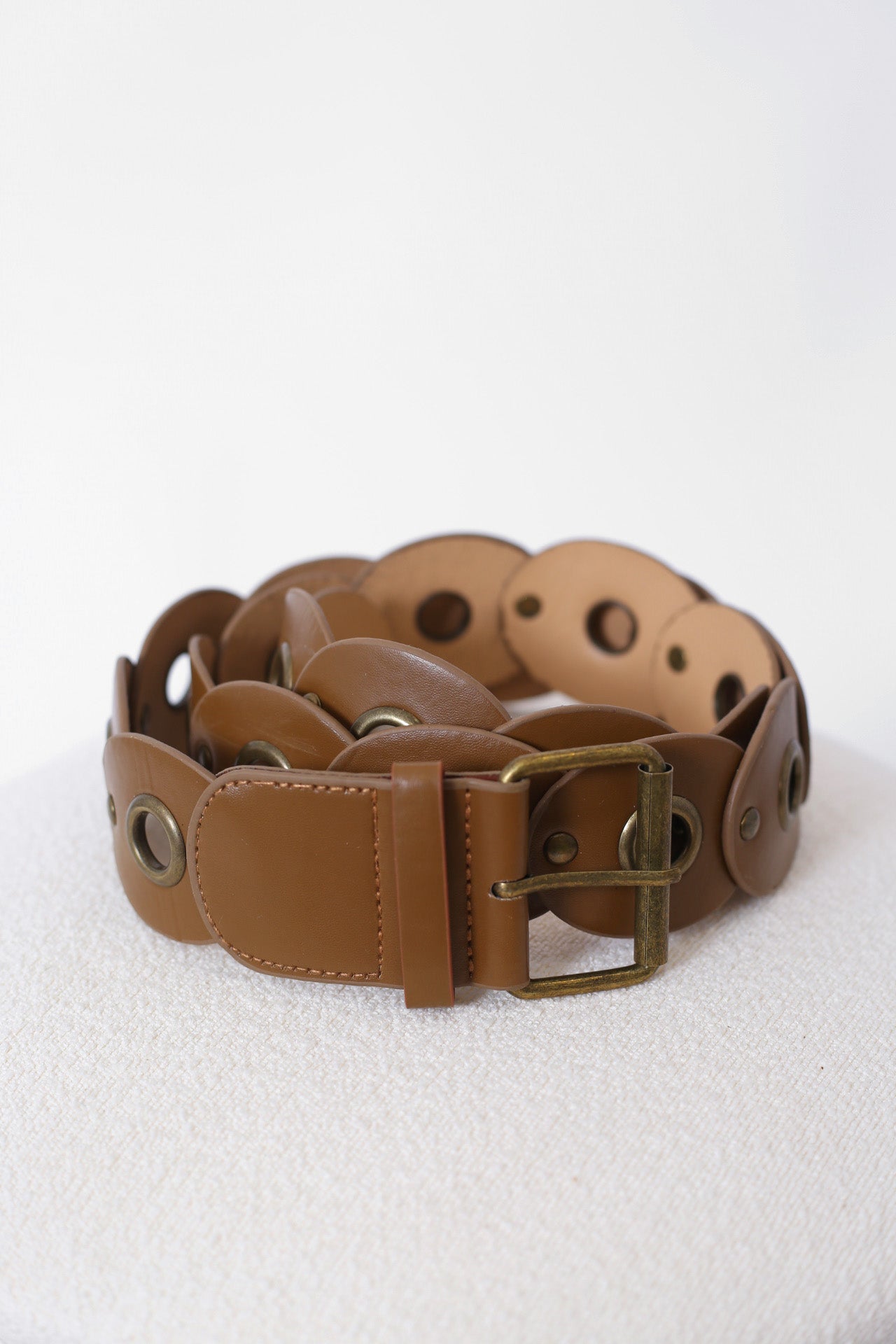 Cinturón con círculos combinados. Detalle de tachuelas y perforados. Hebilla metálica.