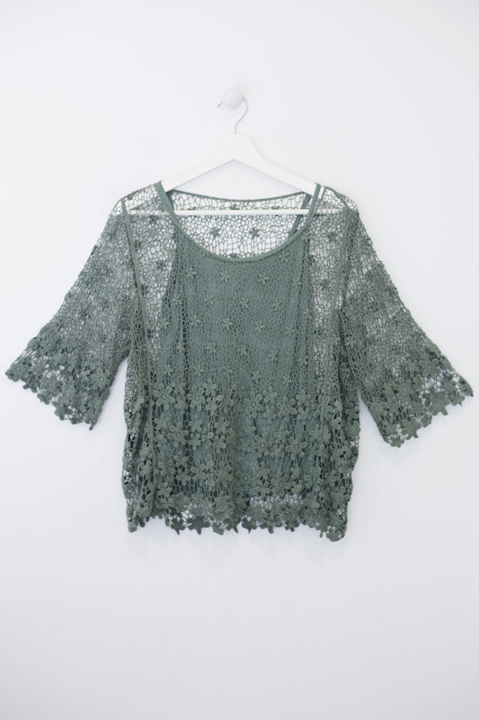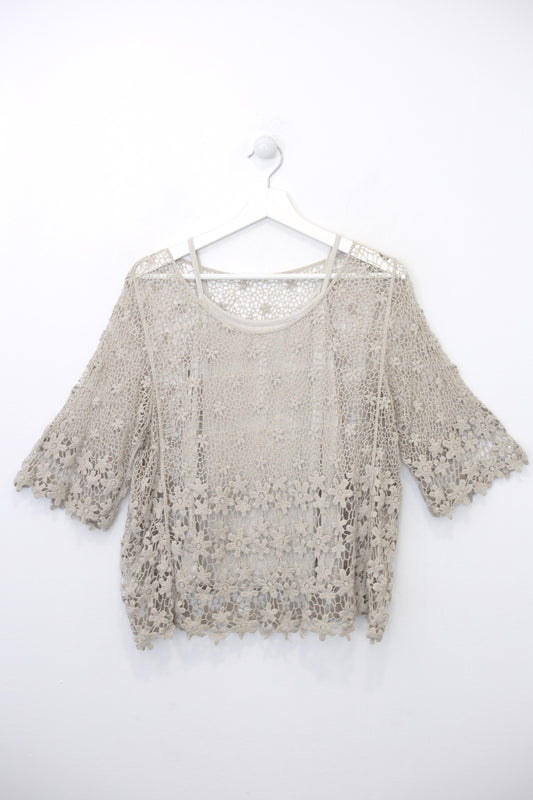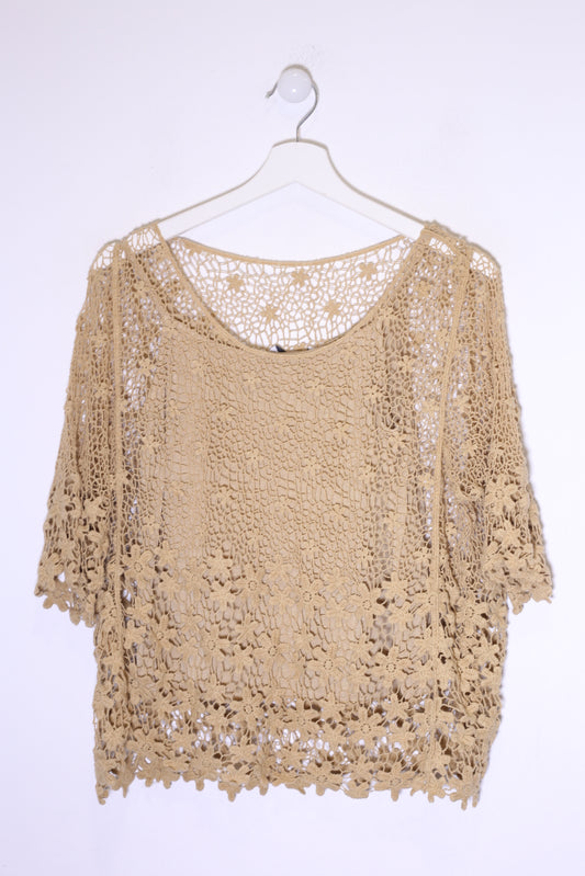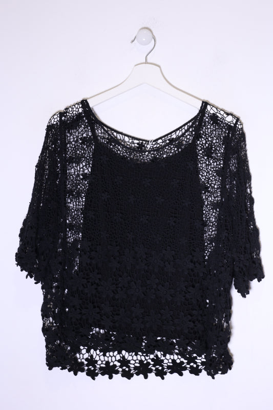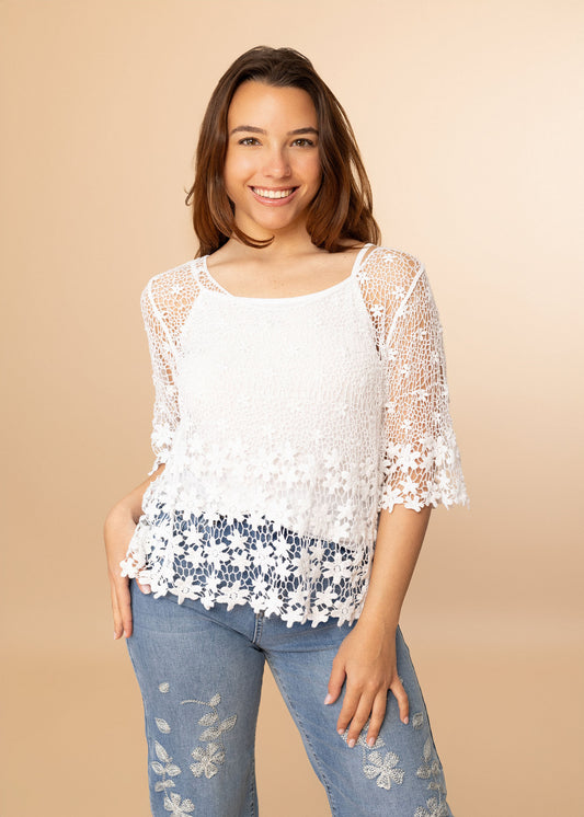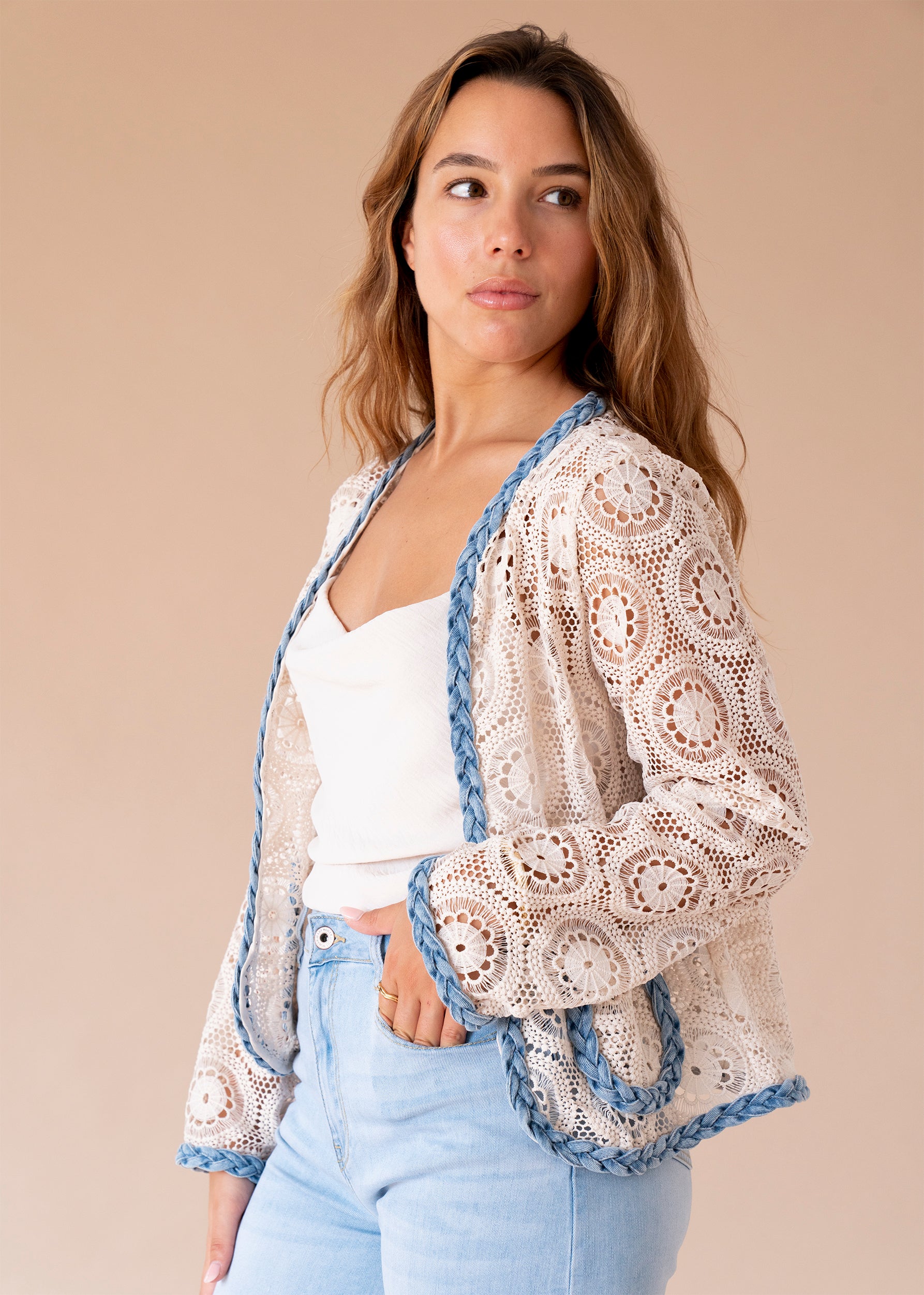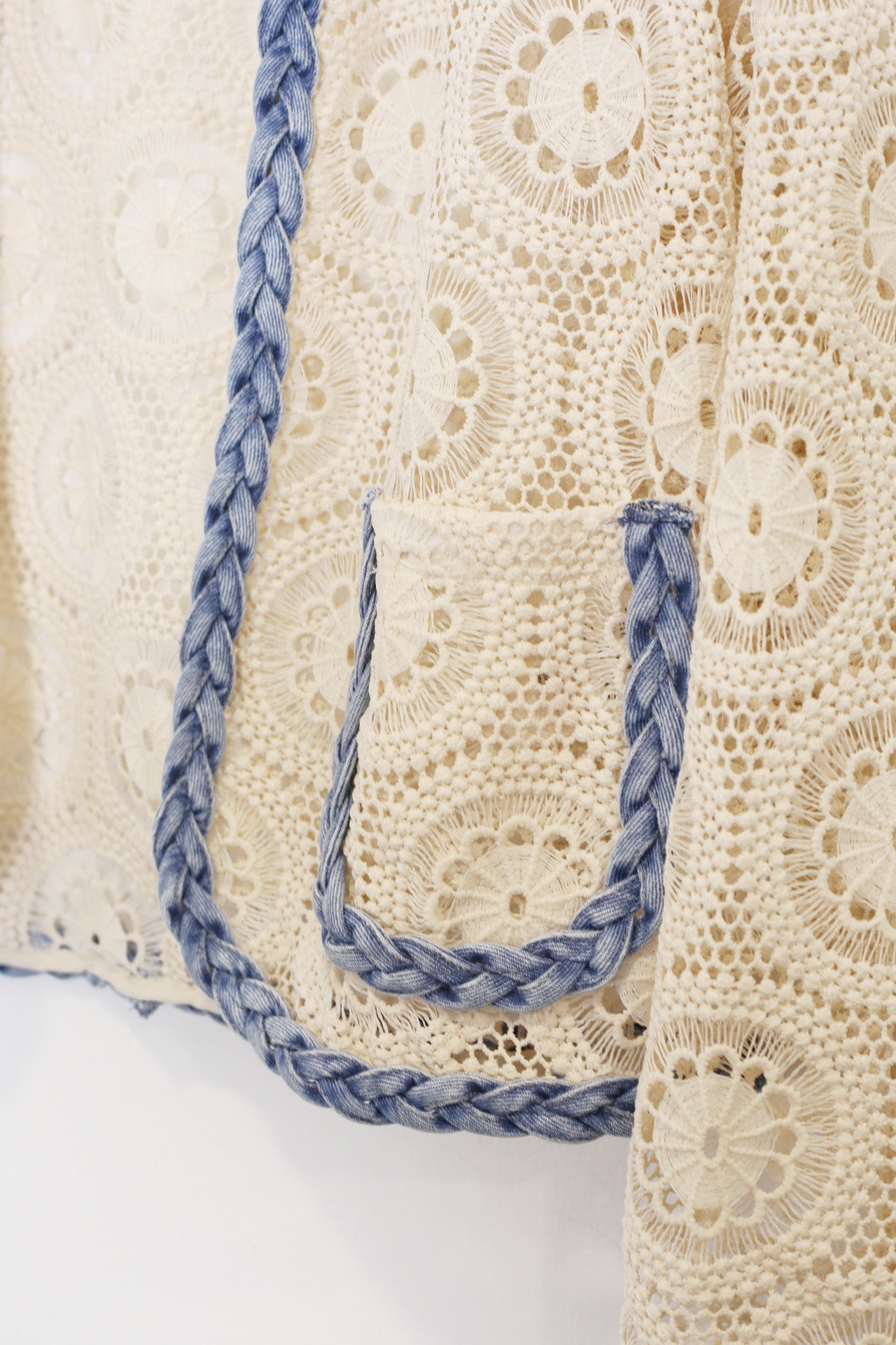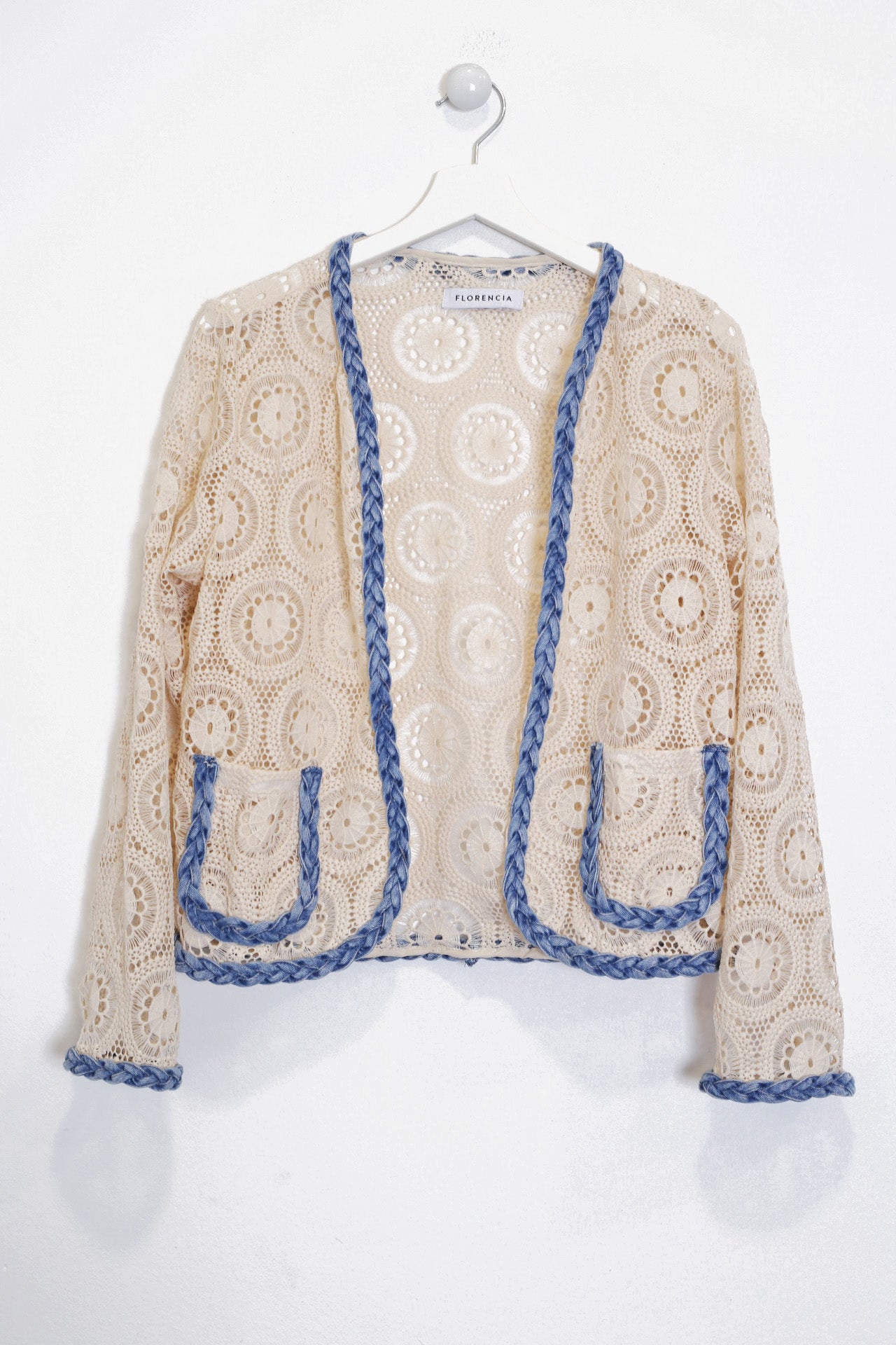 Chaqueta con escote recto y manga larga. Confeccionada en crochet. Bolsillos de plastrón delanteros. Detalle de aplicación denim trenzada en escote, bajo, puños y bolsillos.