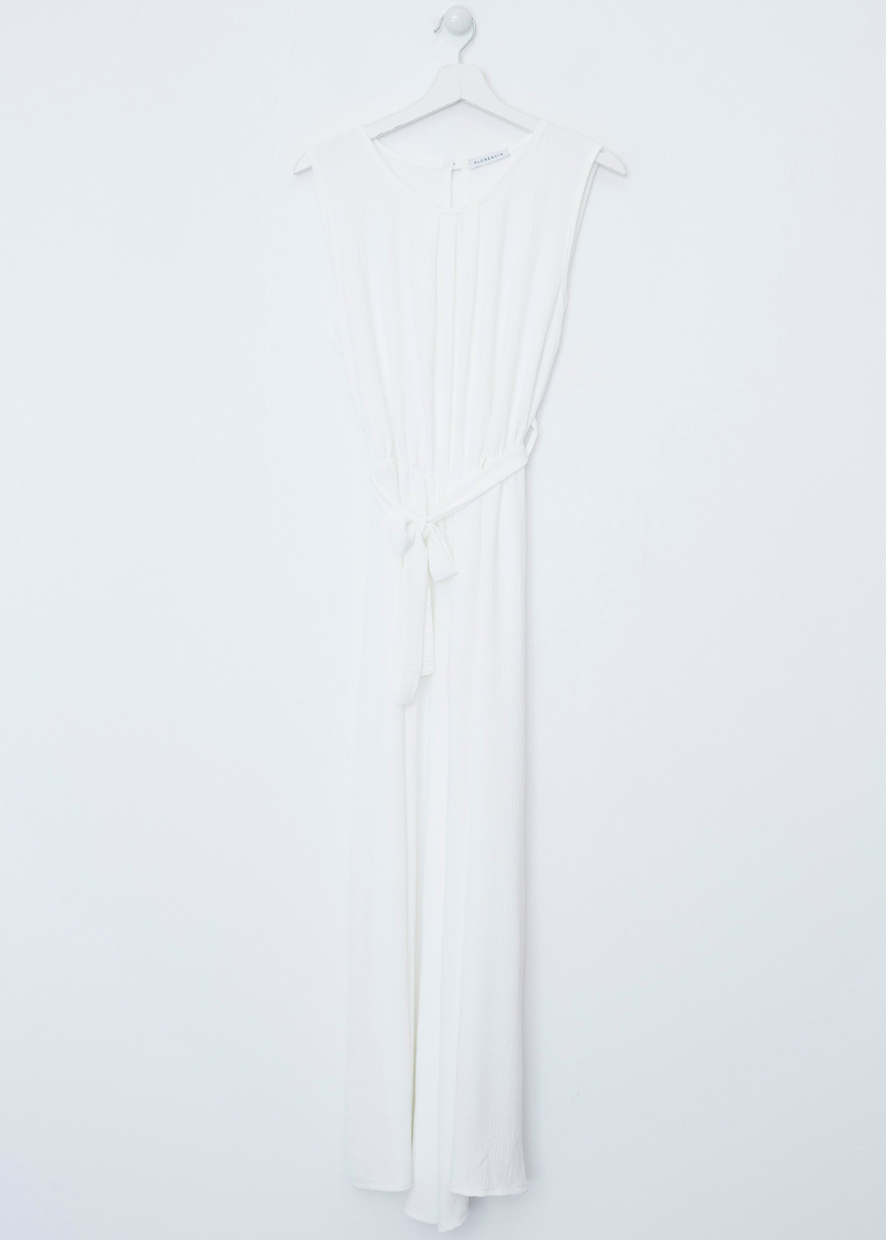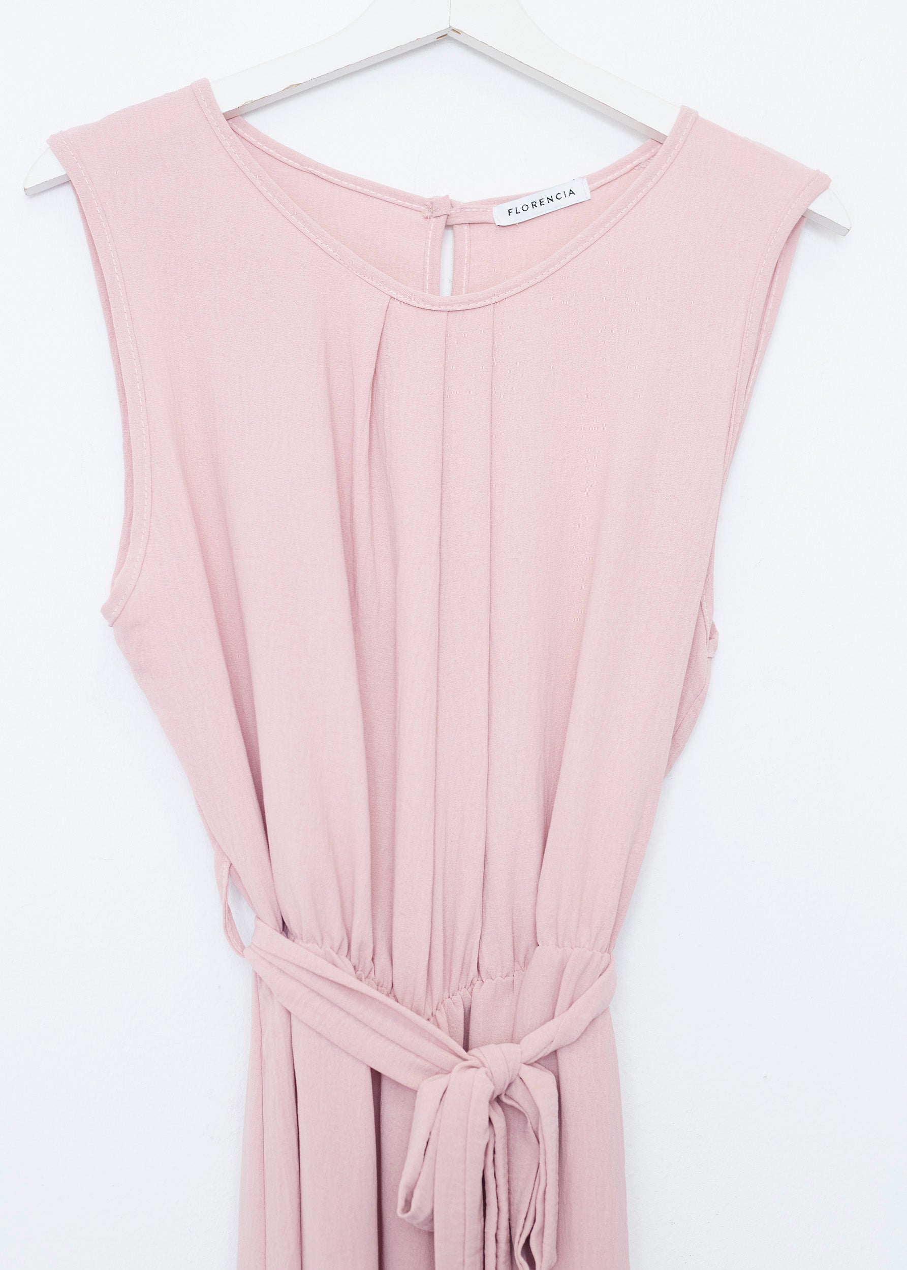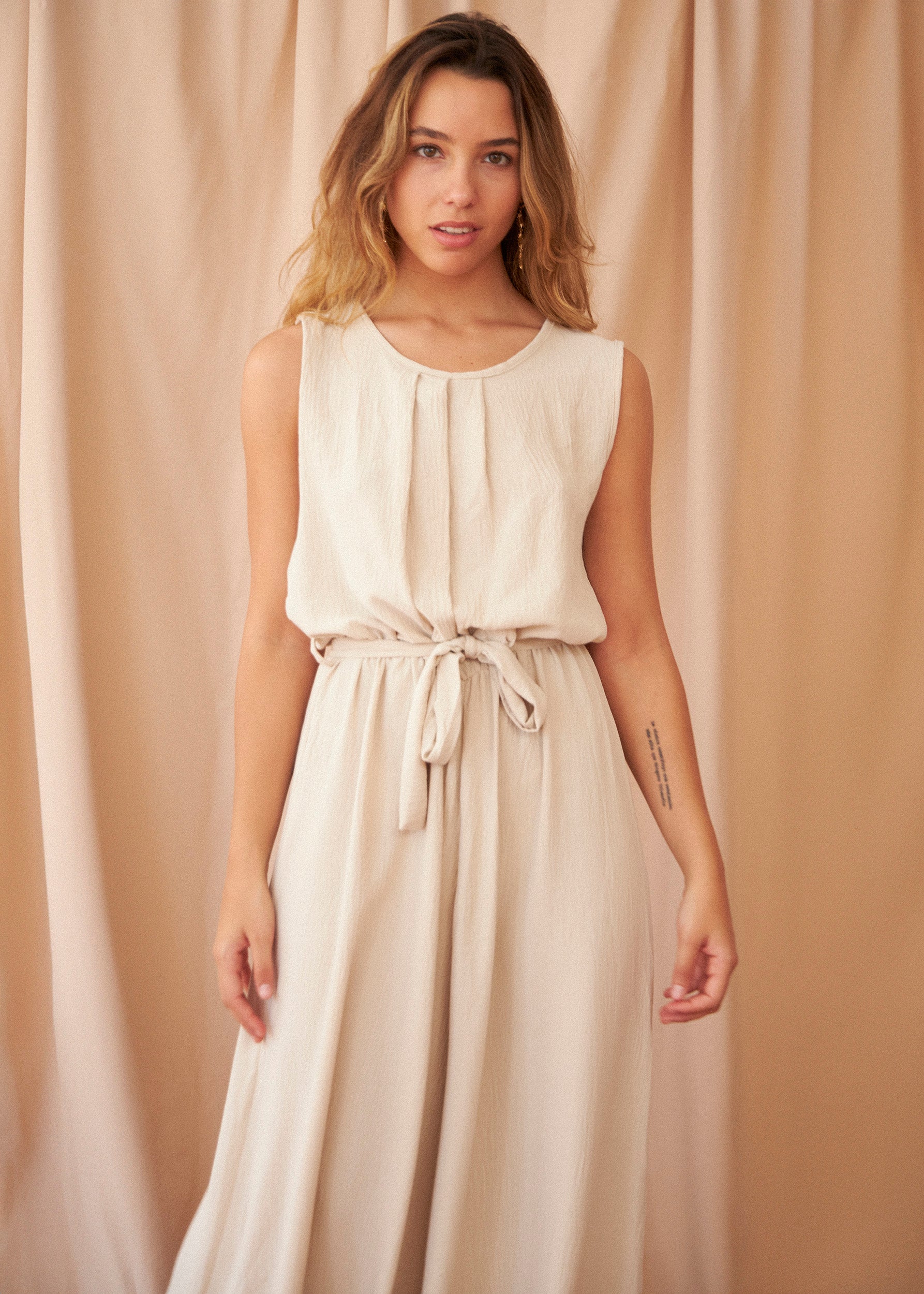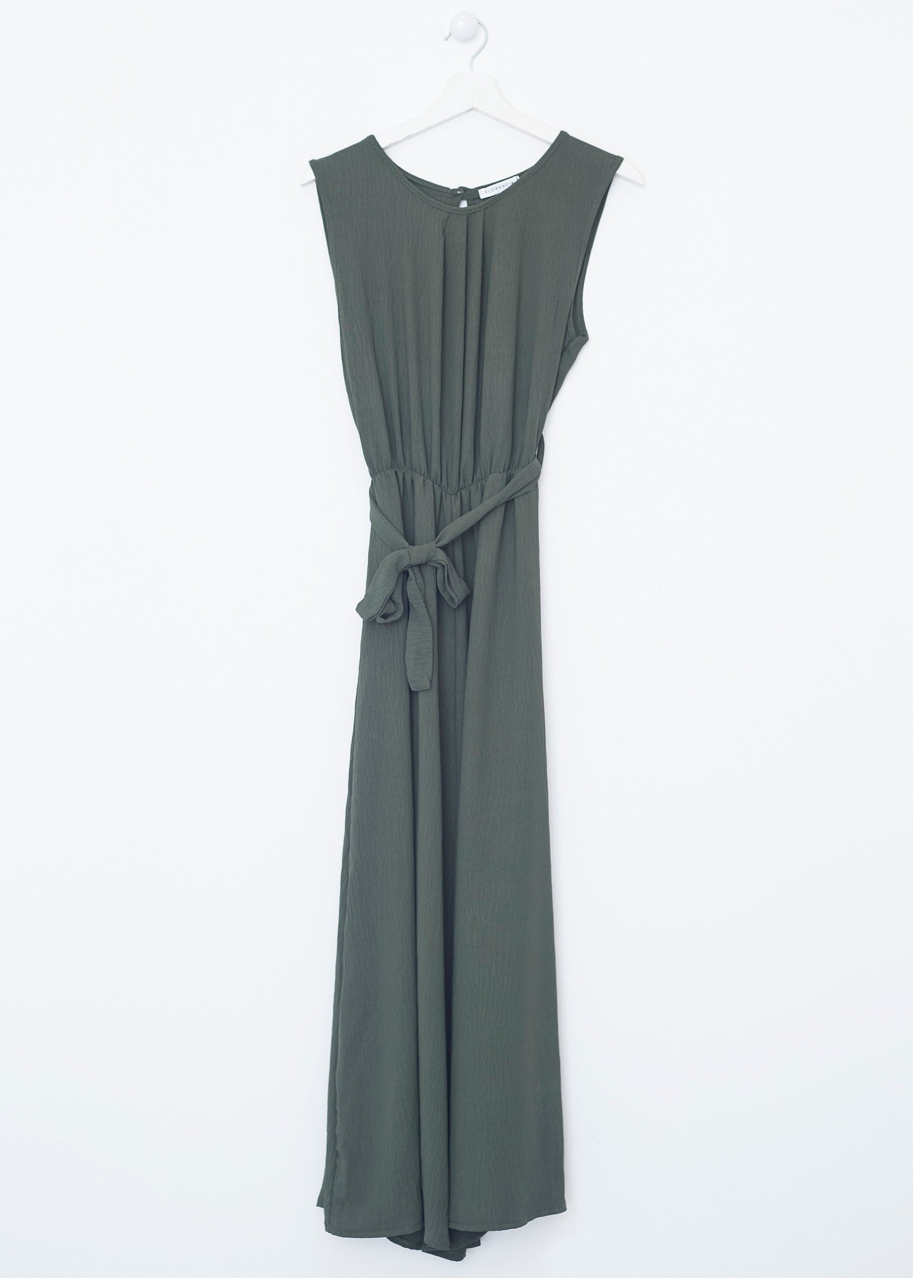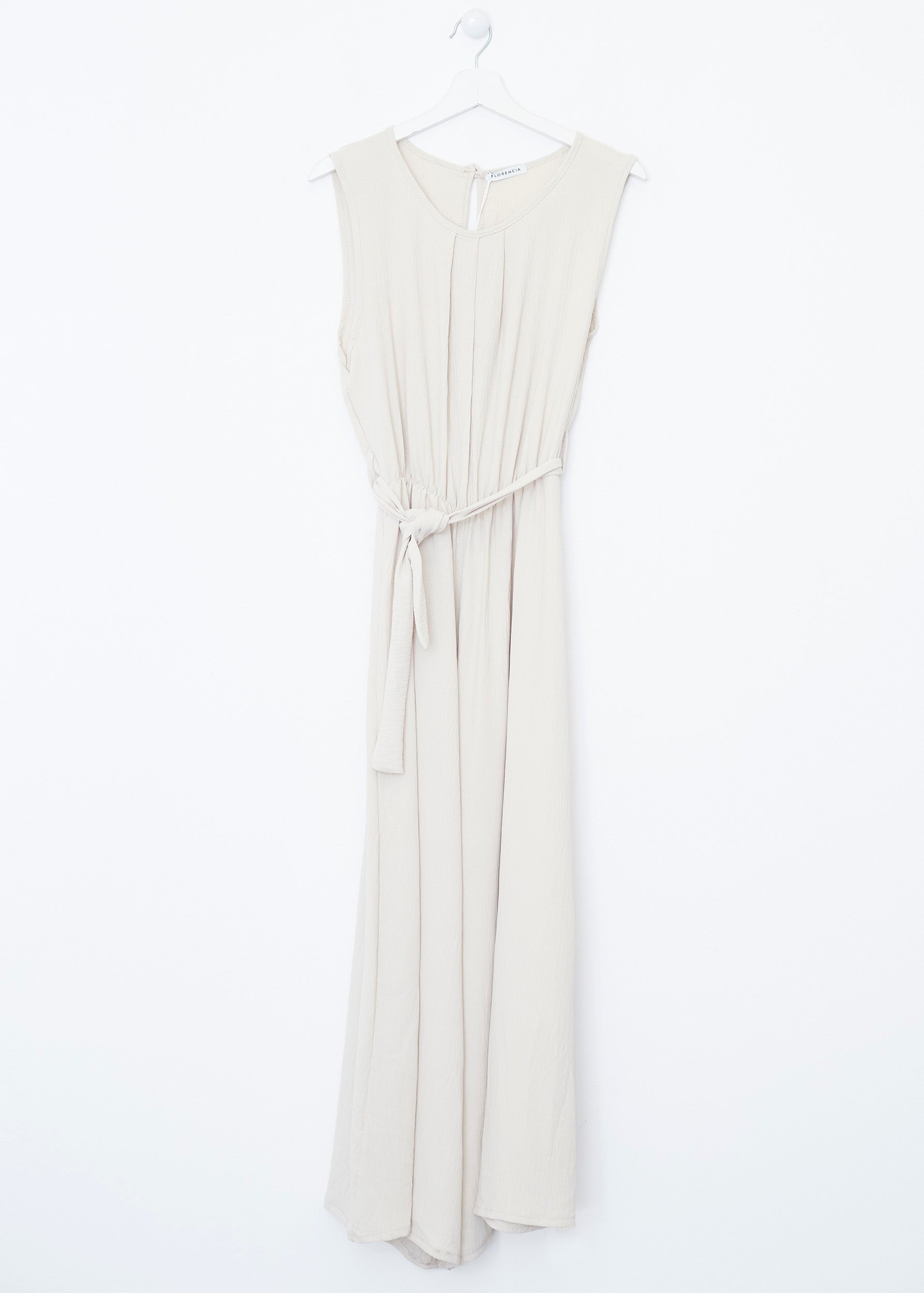 Long jumpsuit with sleeveless sleeves and round neck. Back opening detail with button closure. Elastic waist with matching belt.