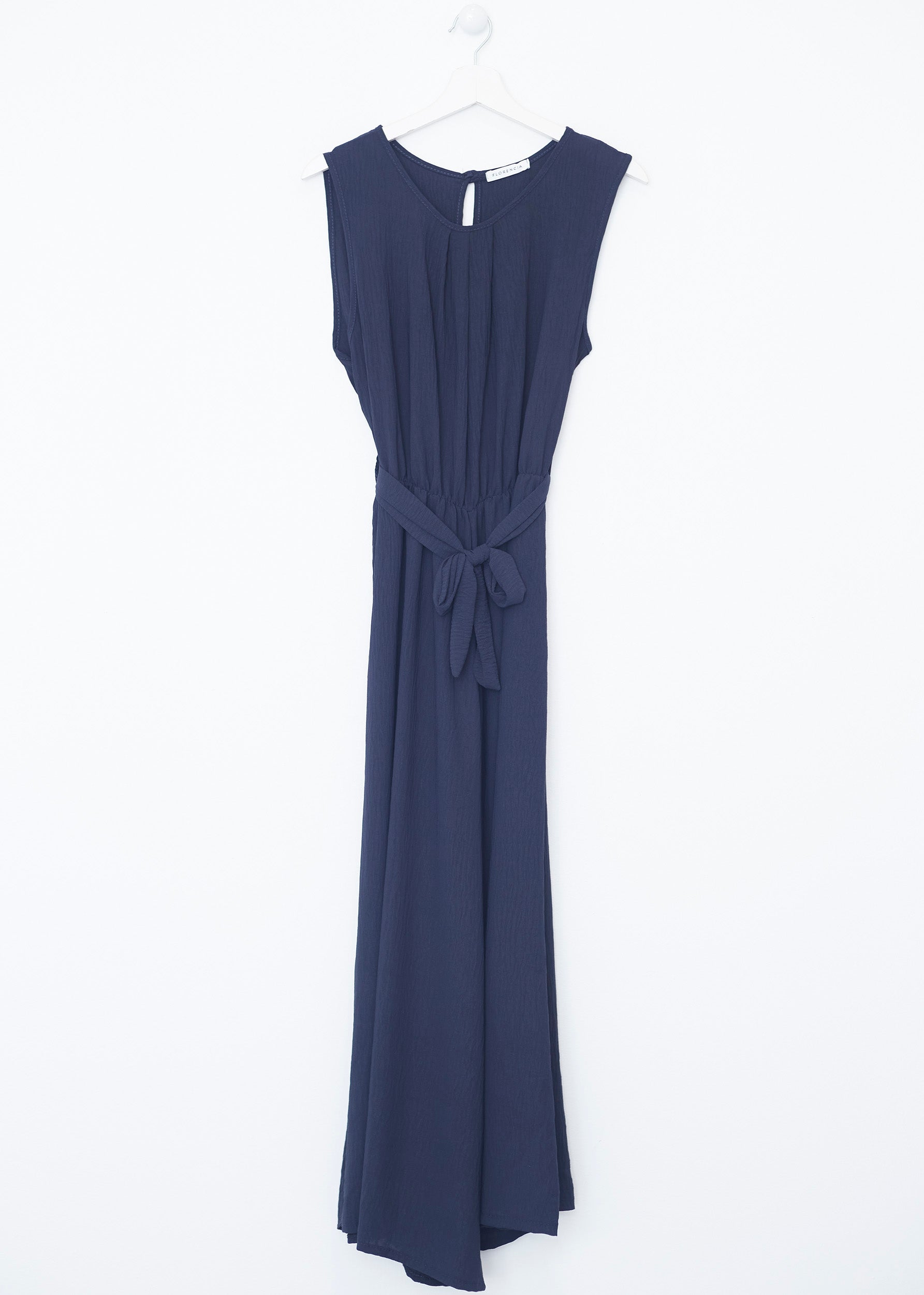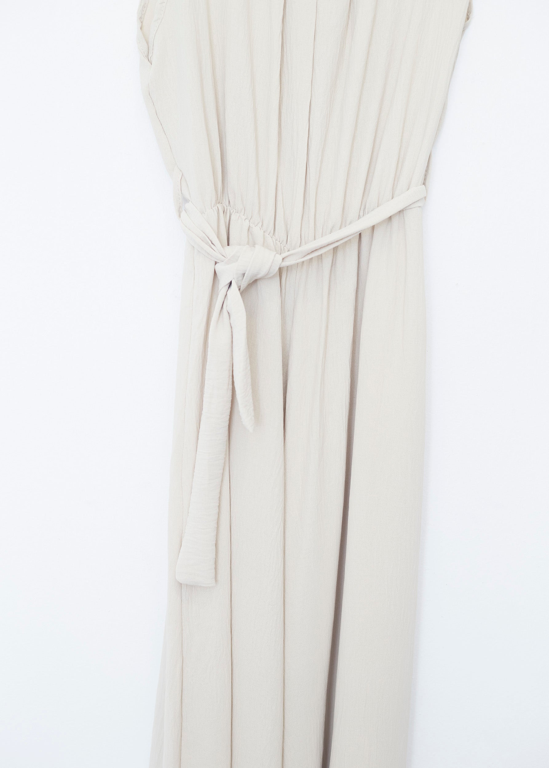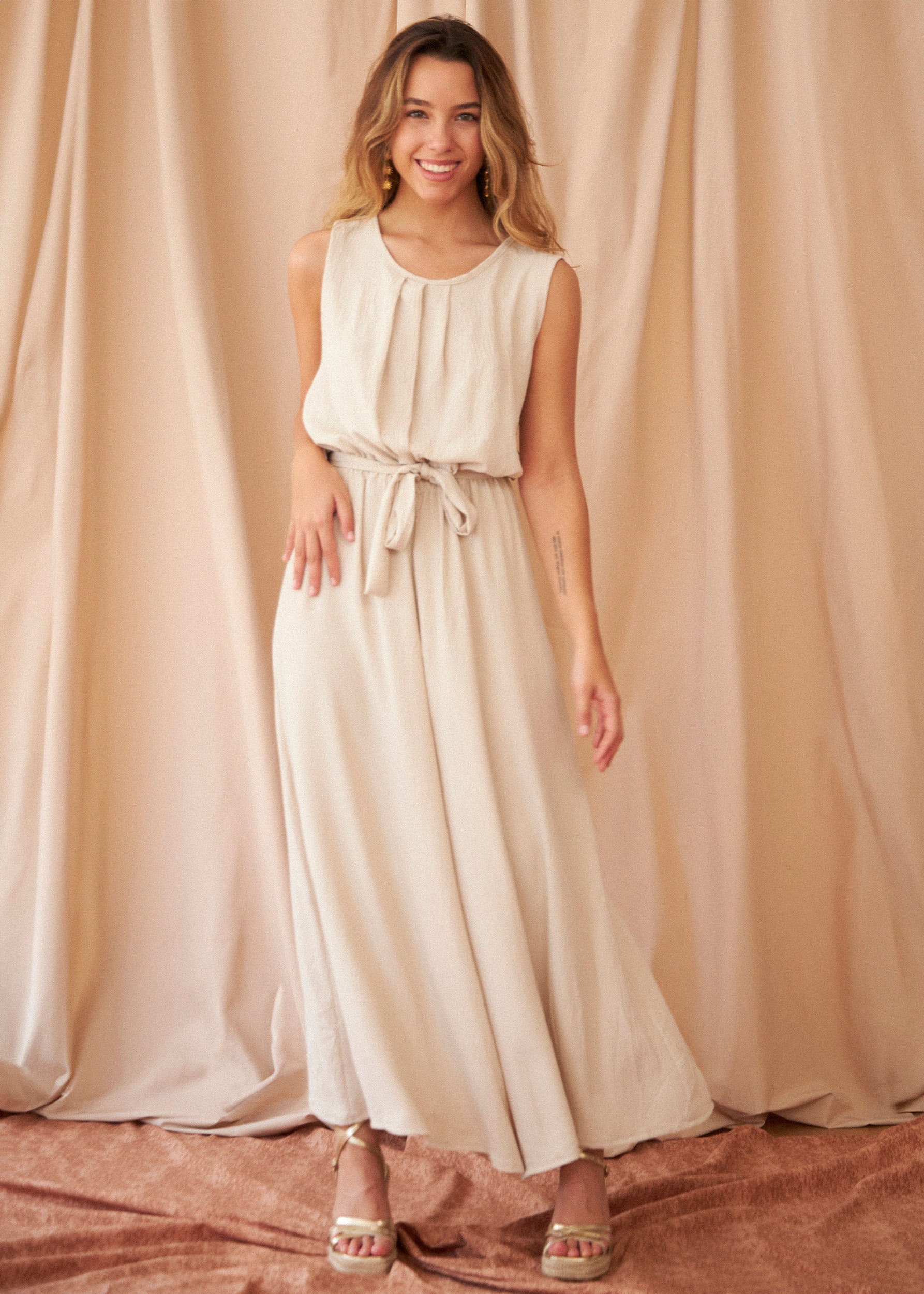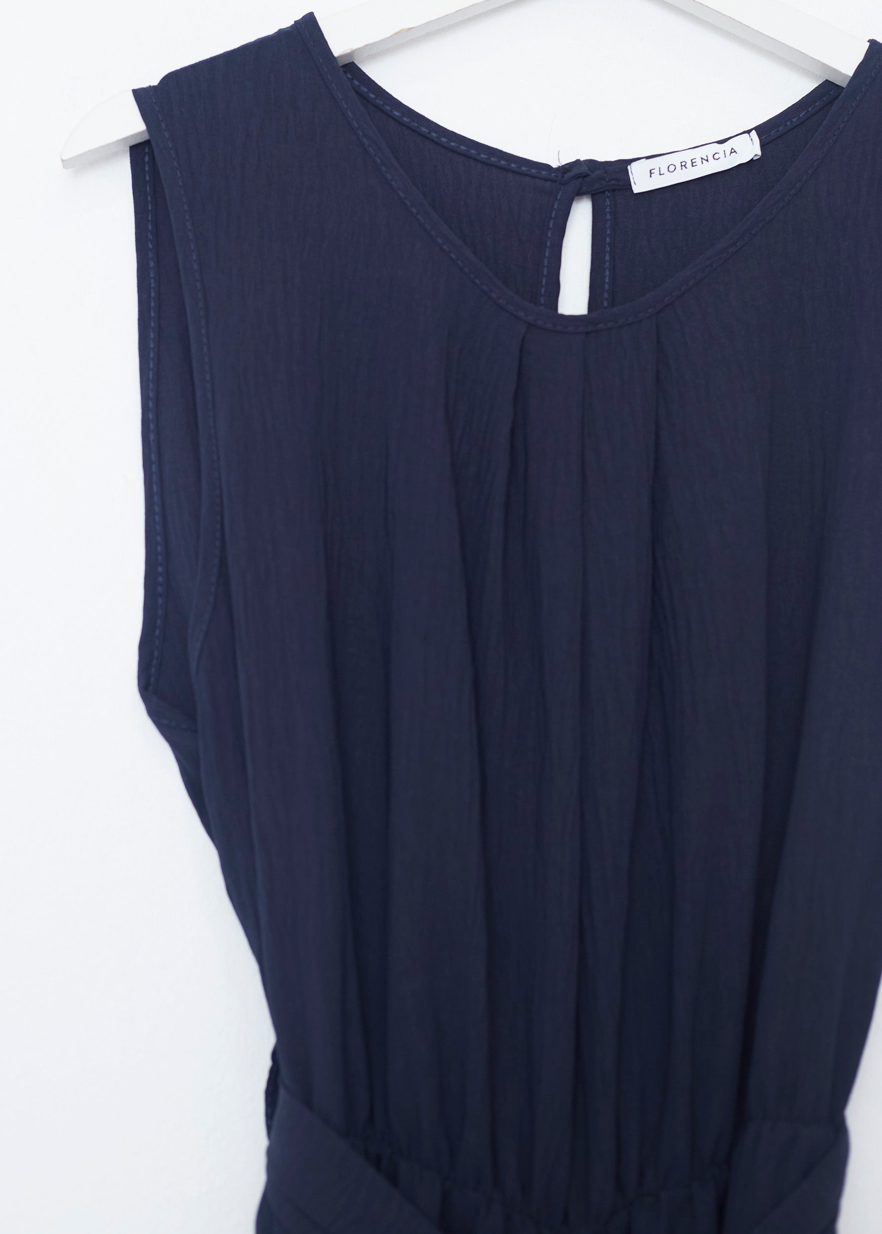 Long jumpsuit with sleeveless sleeves and round neck. Back opening detail with button closure. Elastic waist with matching belt.