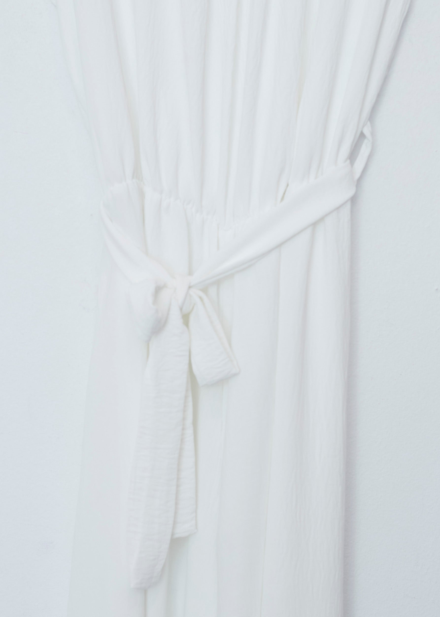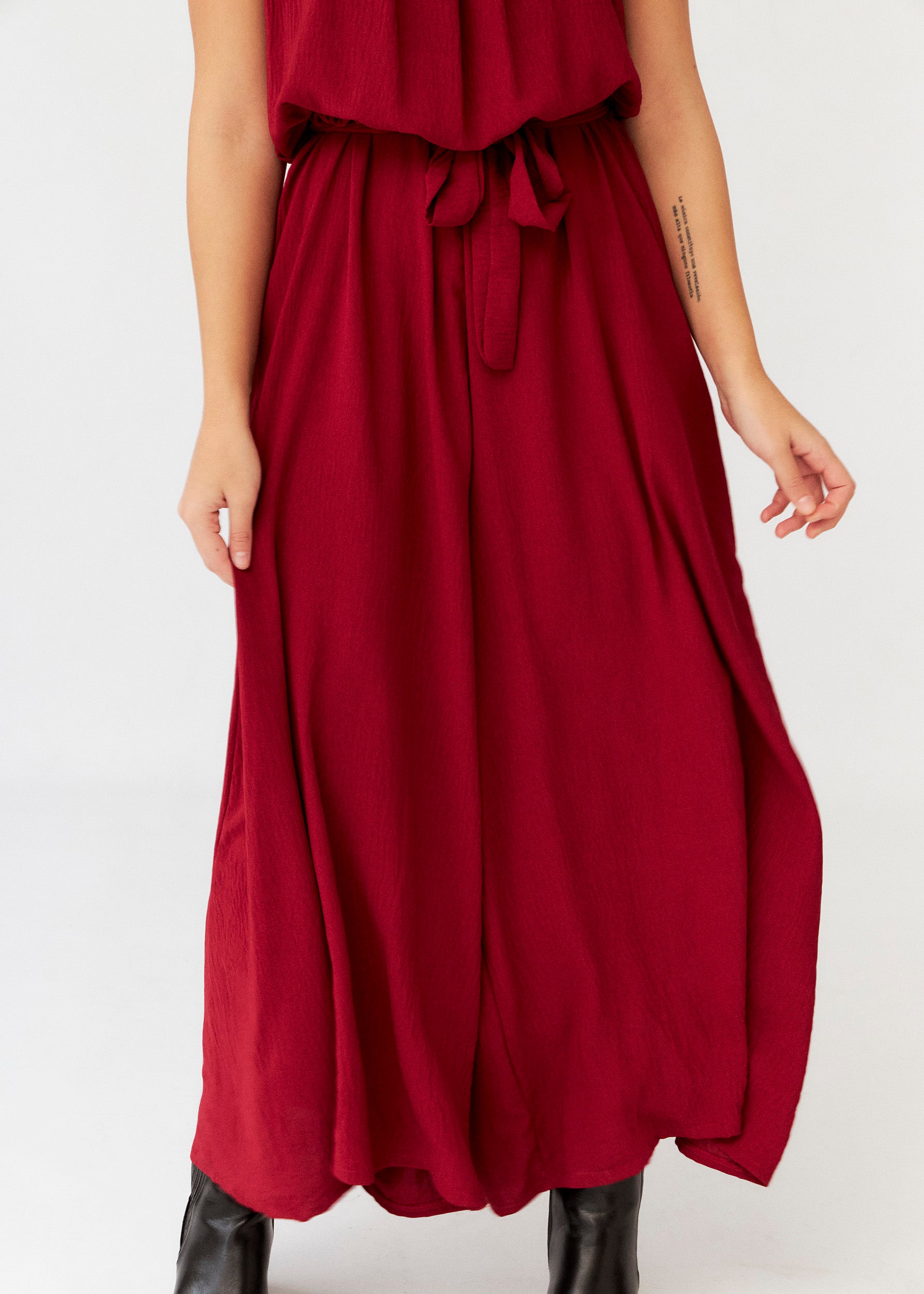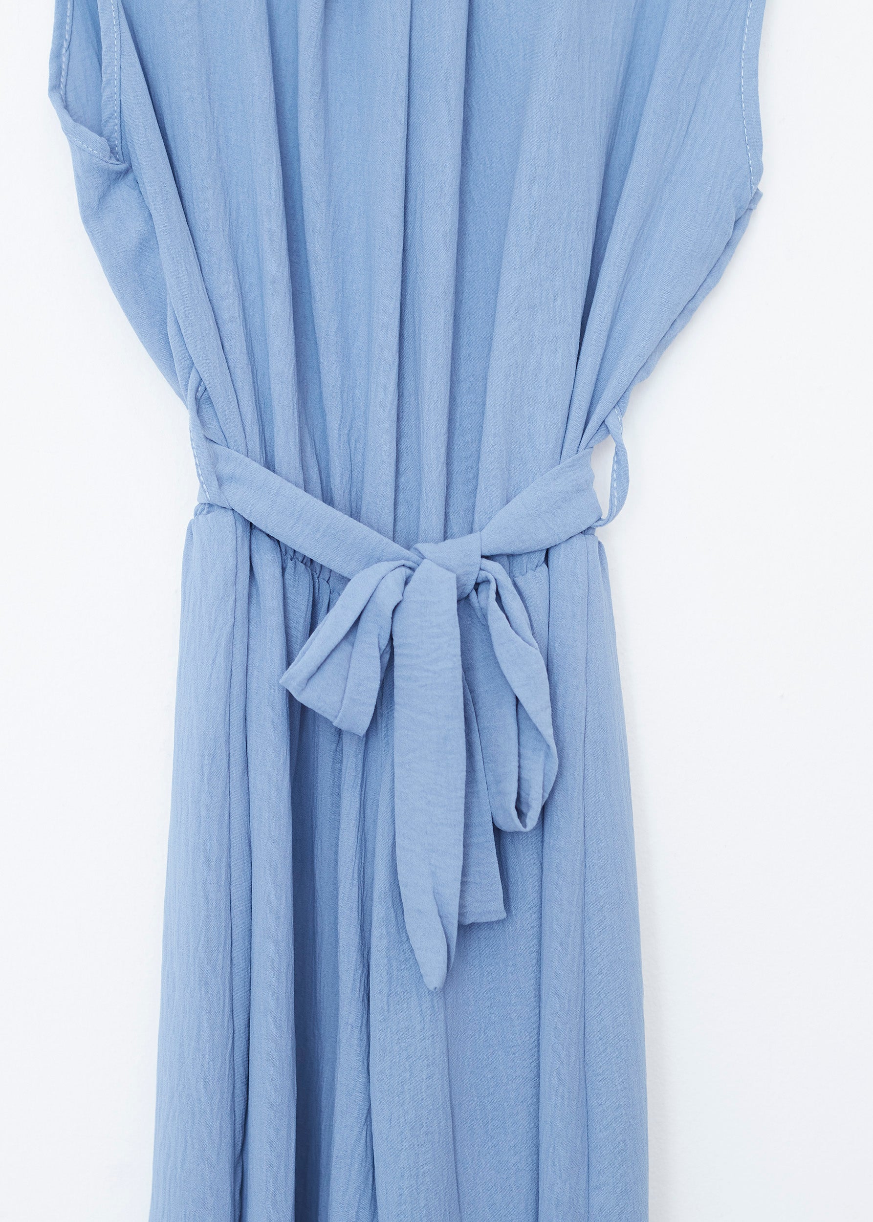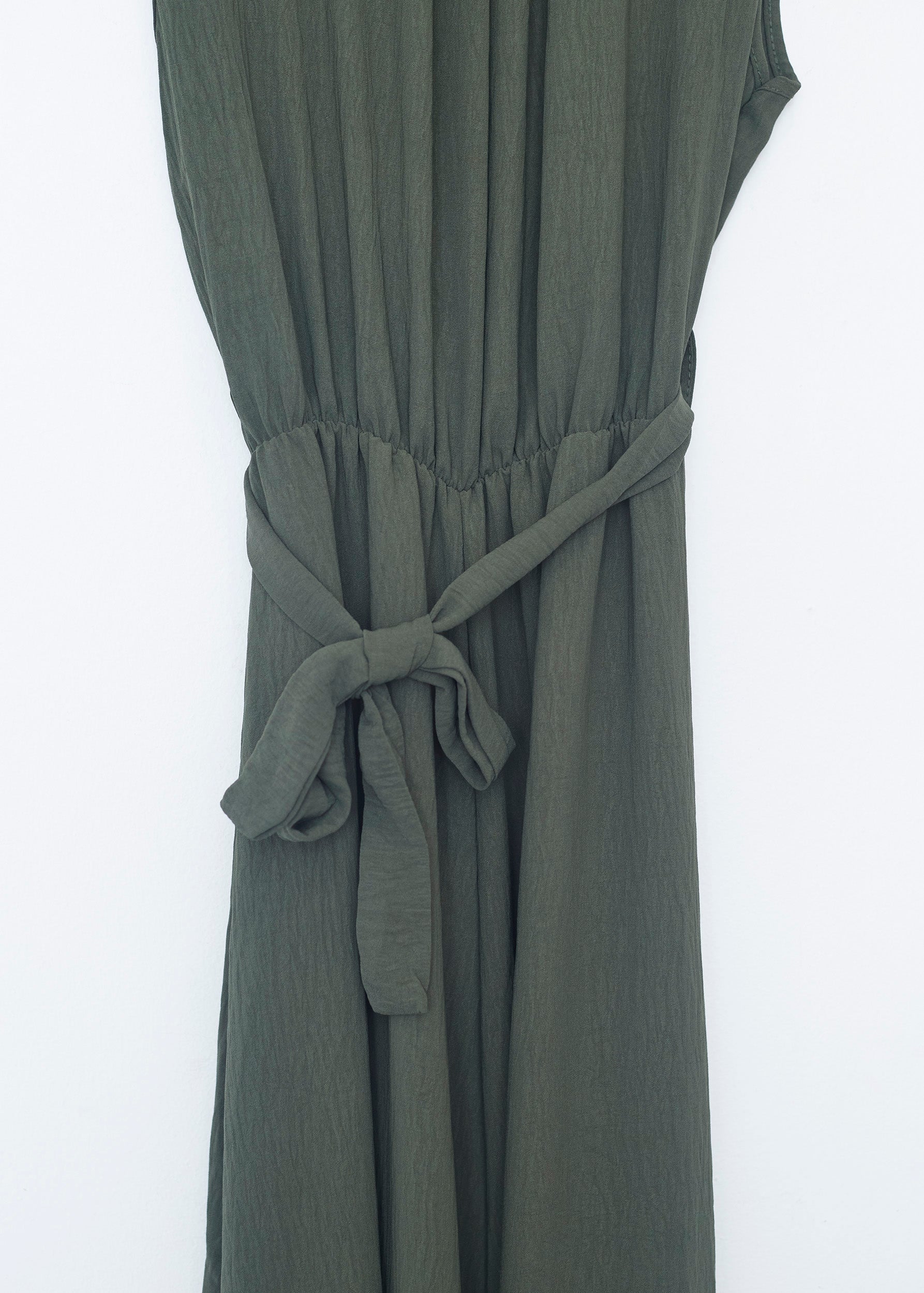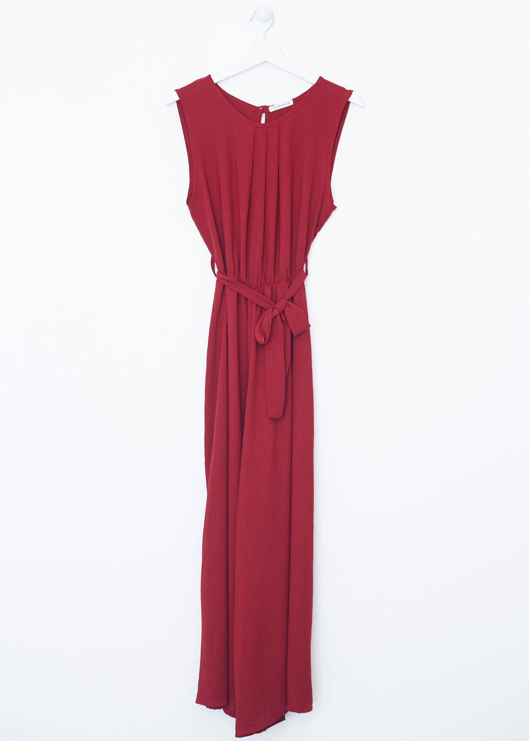 Long jumpsuit with sleeveless sleeves and round neck. Back opening detail with button closure. Elastic waist with matching belt.
