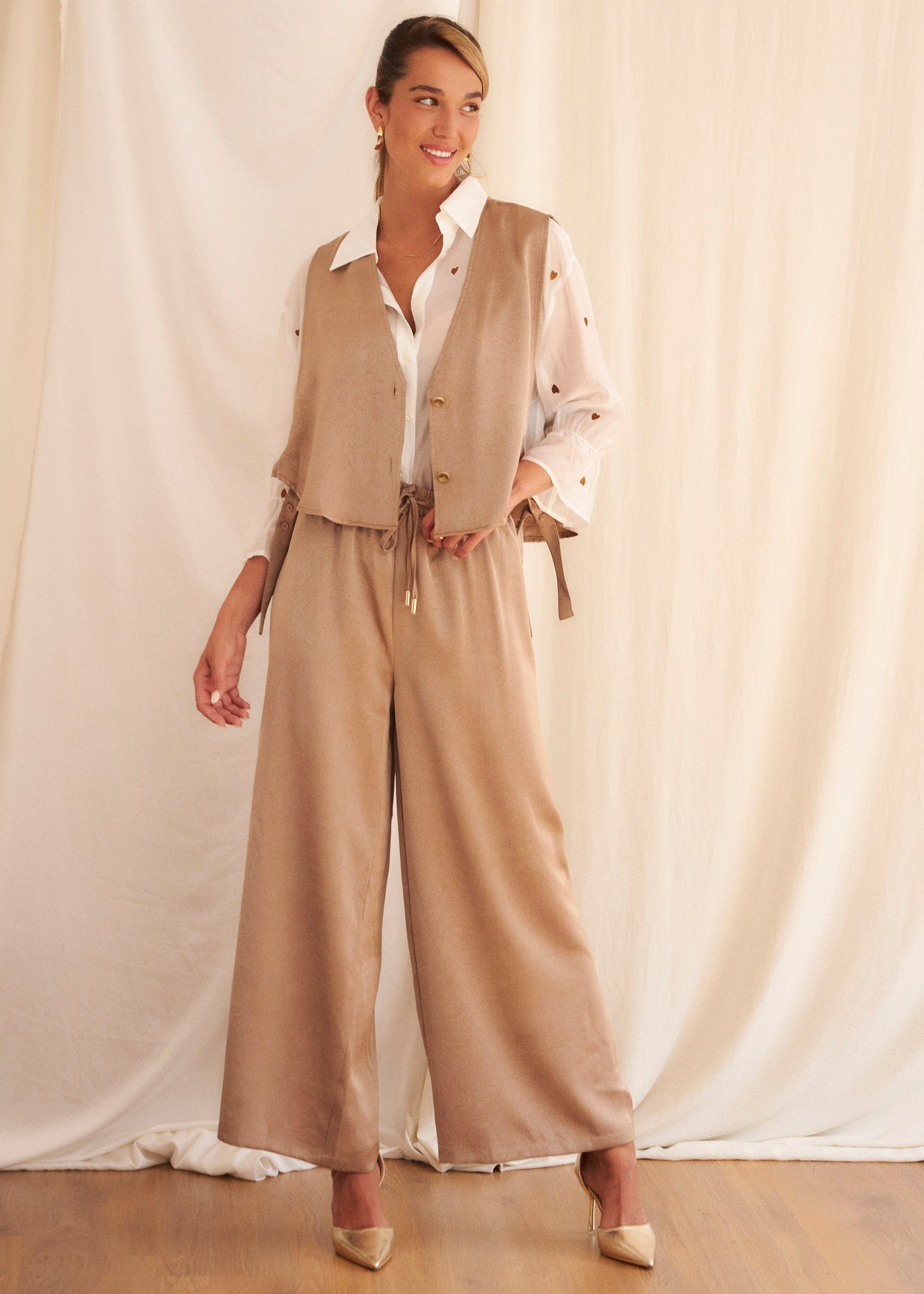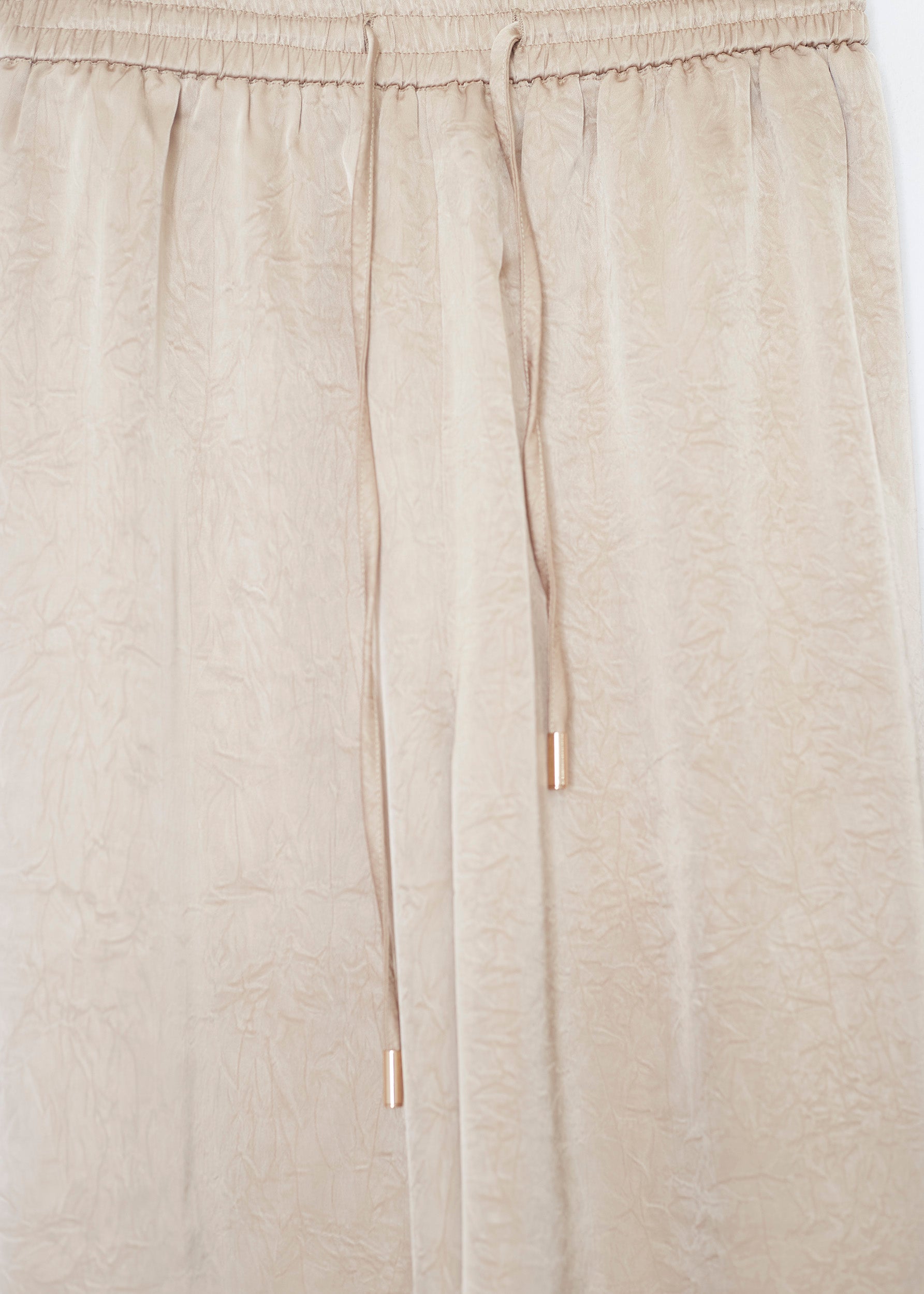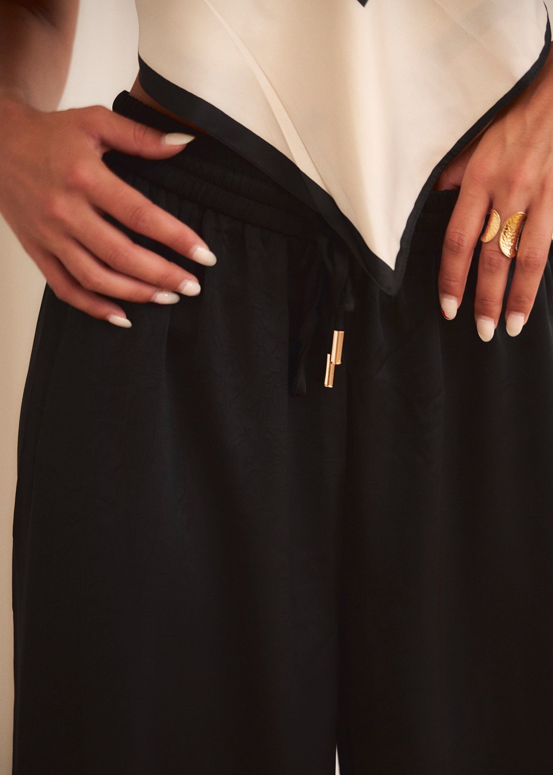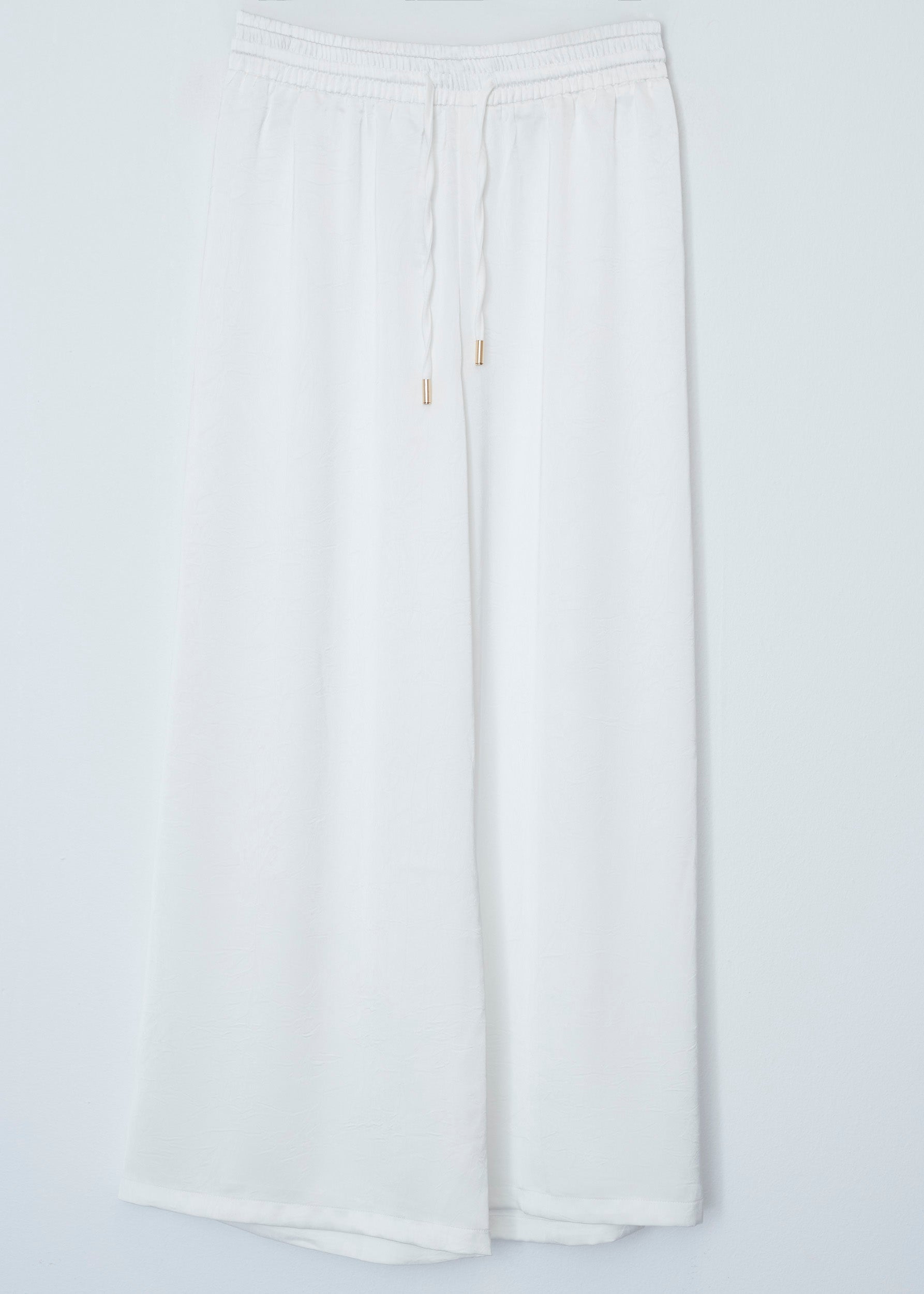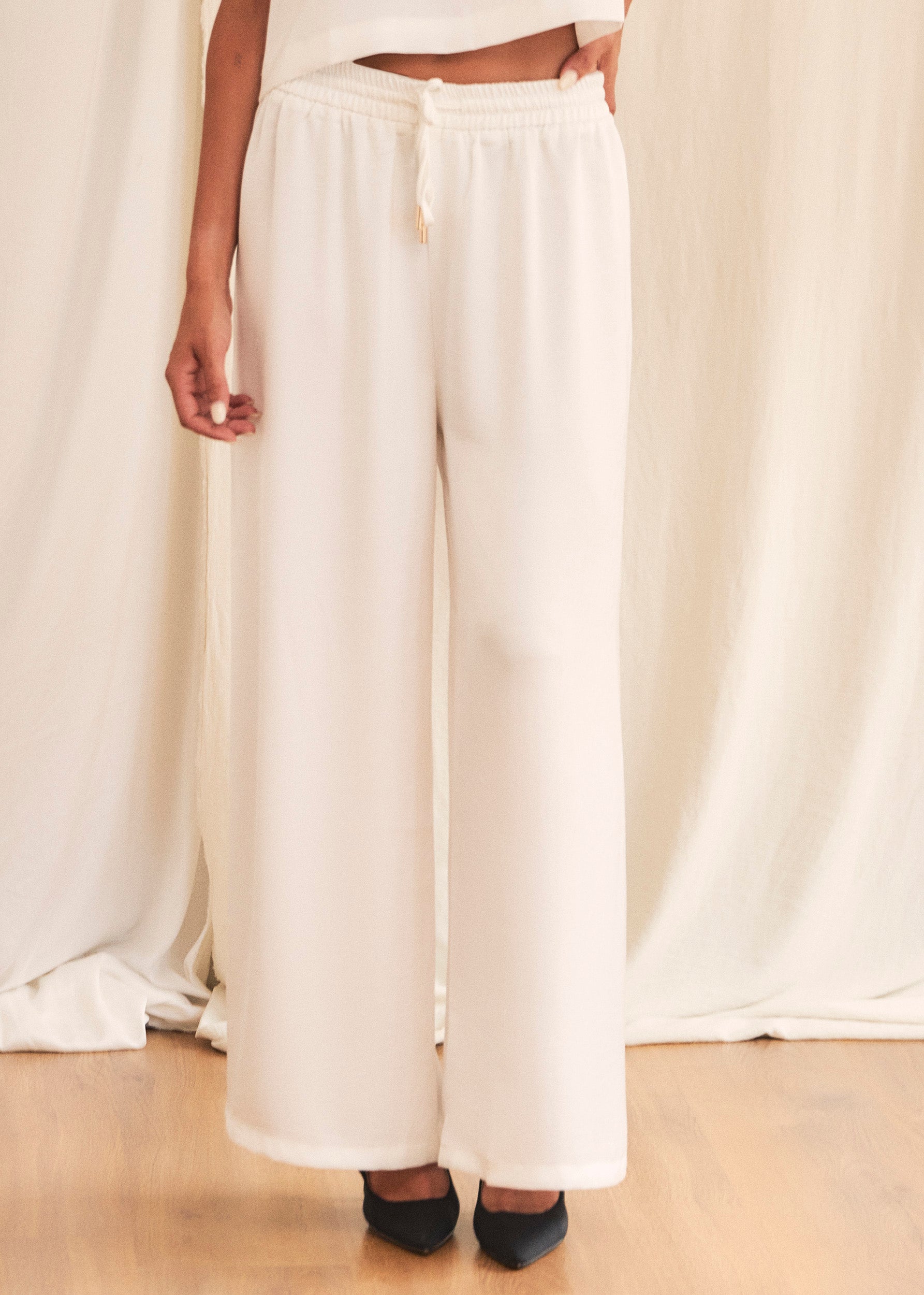 Long wide-leg trousers. Drawstring closure and gold trim. Elastic waist.