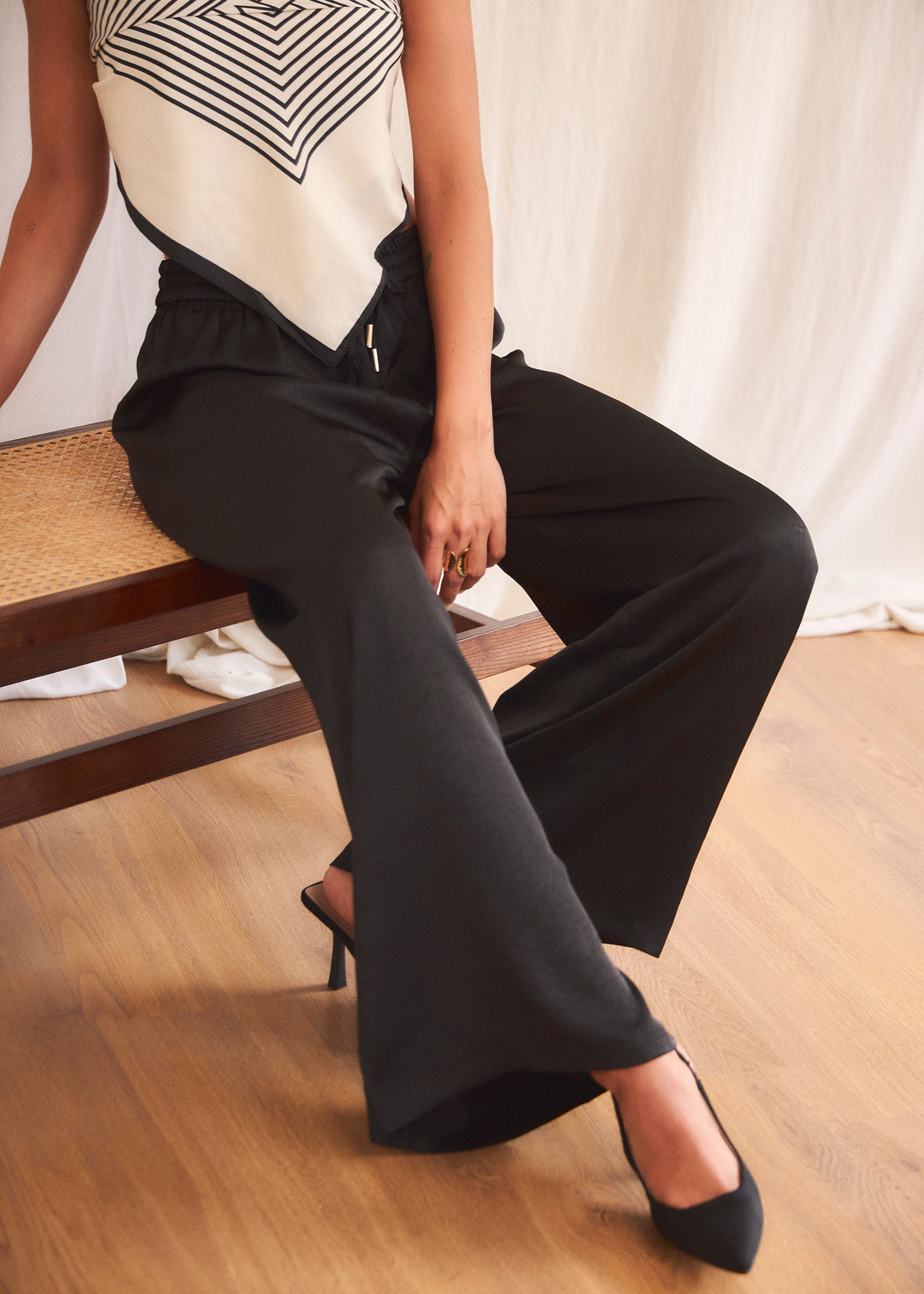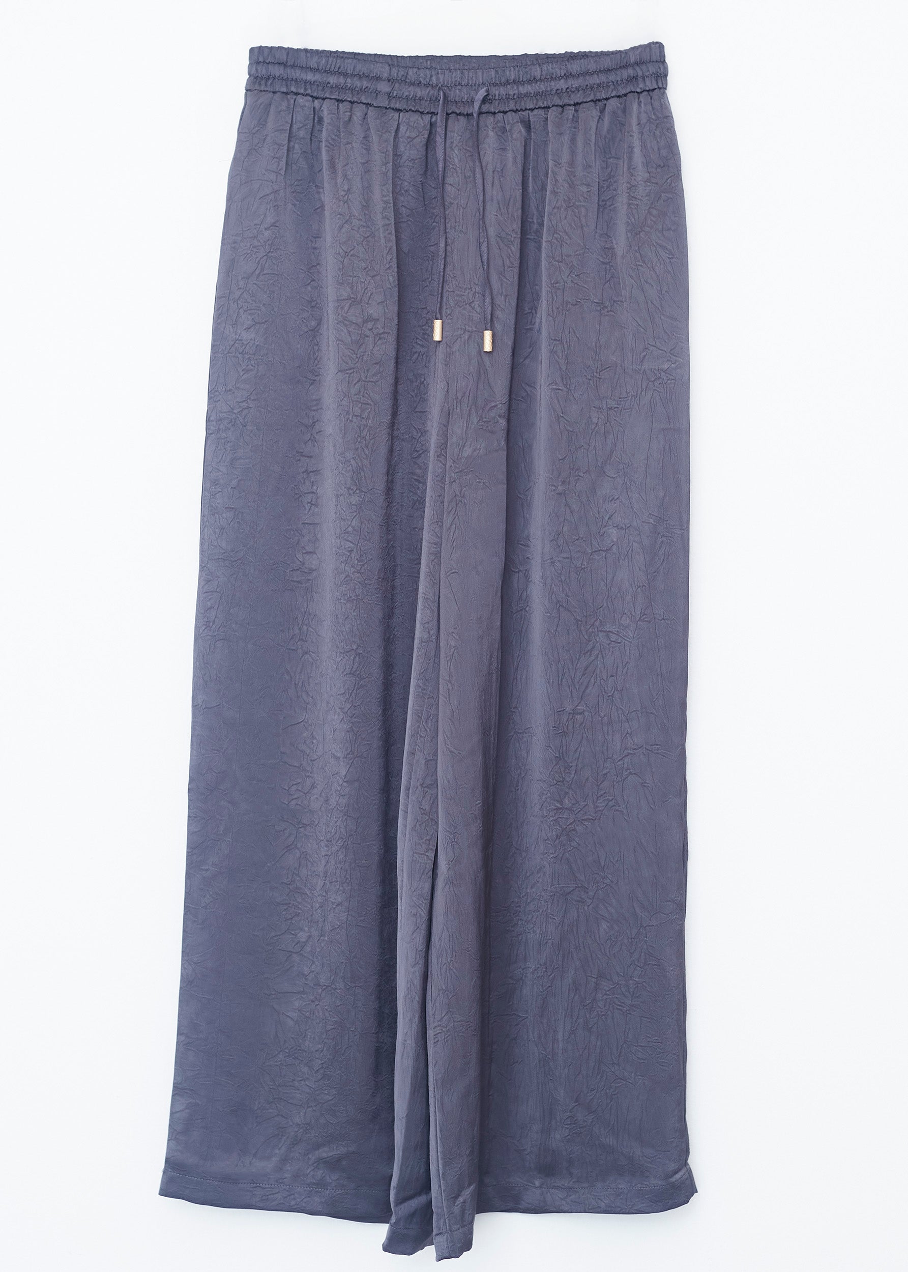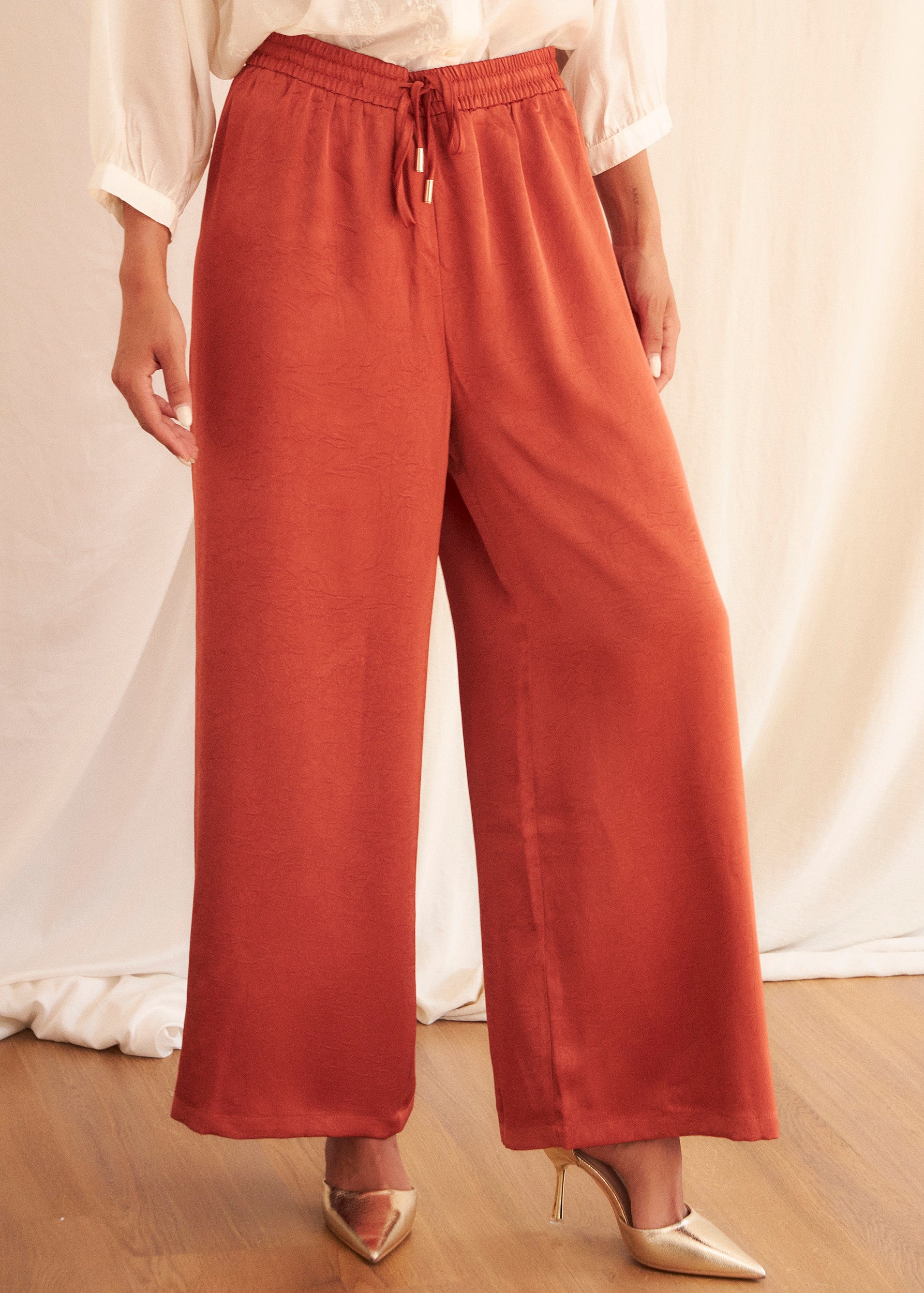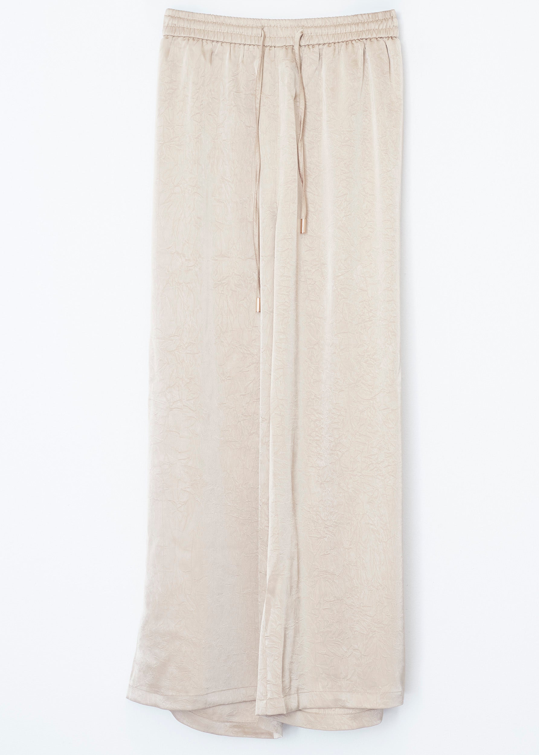 Long wide-leg trousers. Drawstring closure and gold trim. Elastic waist.