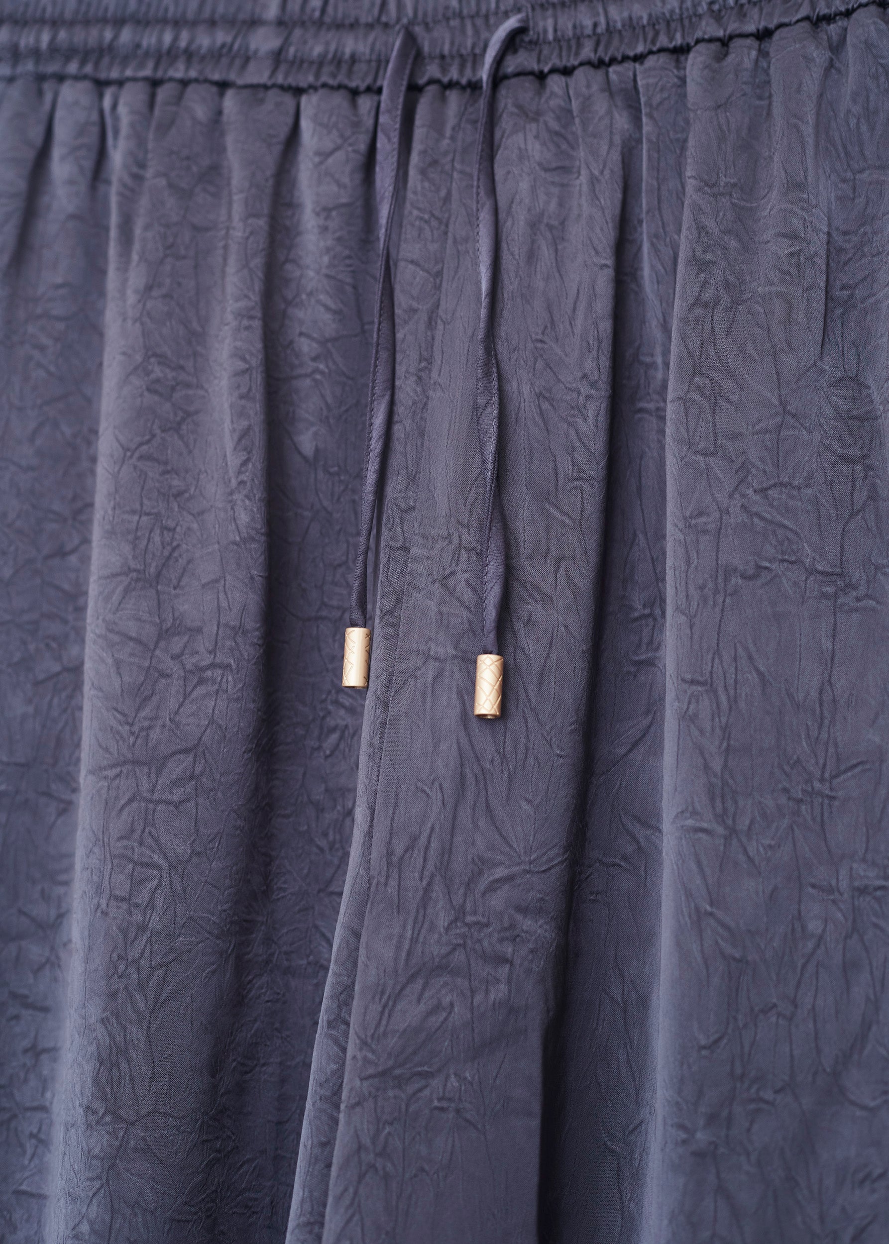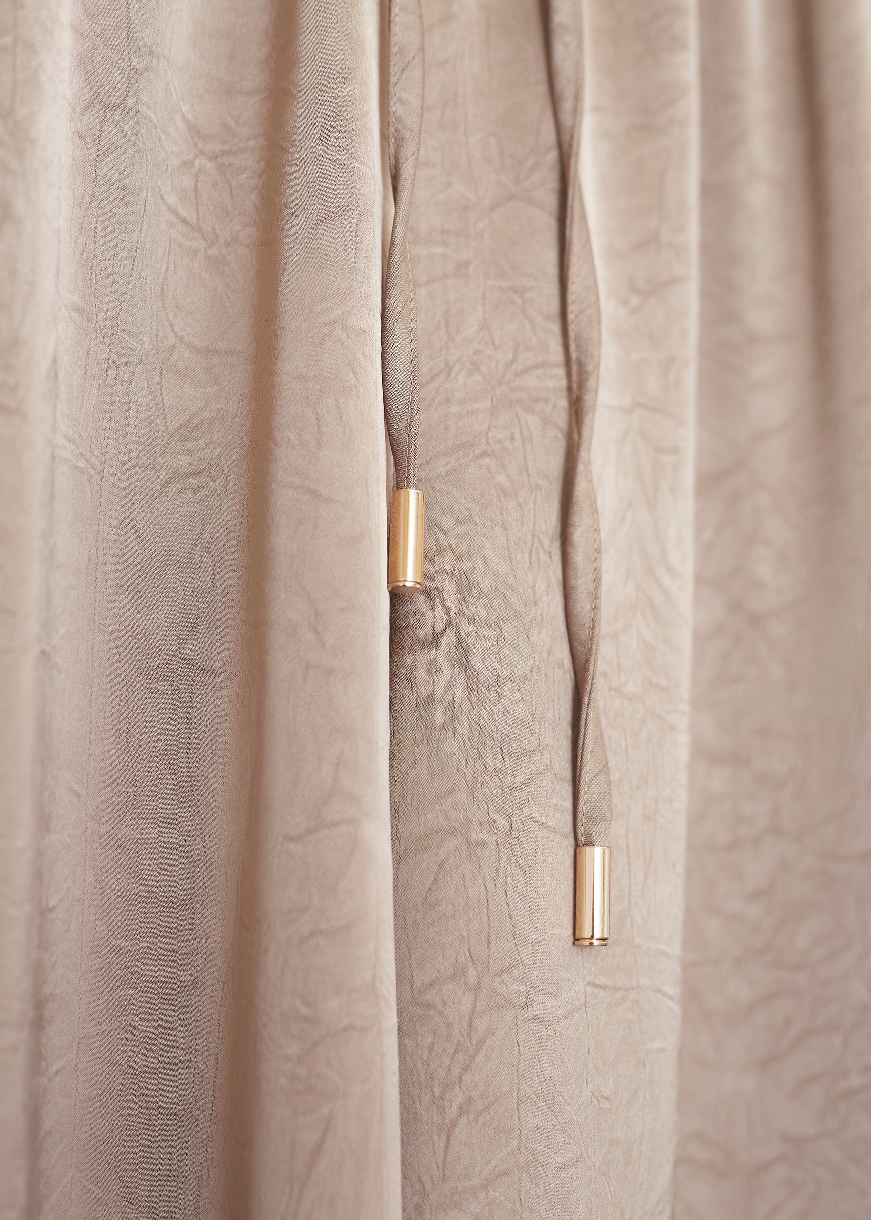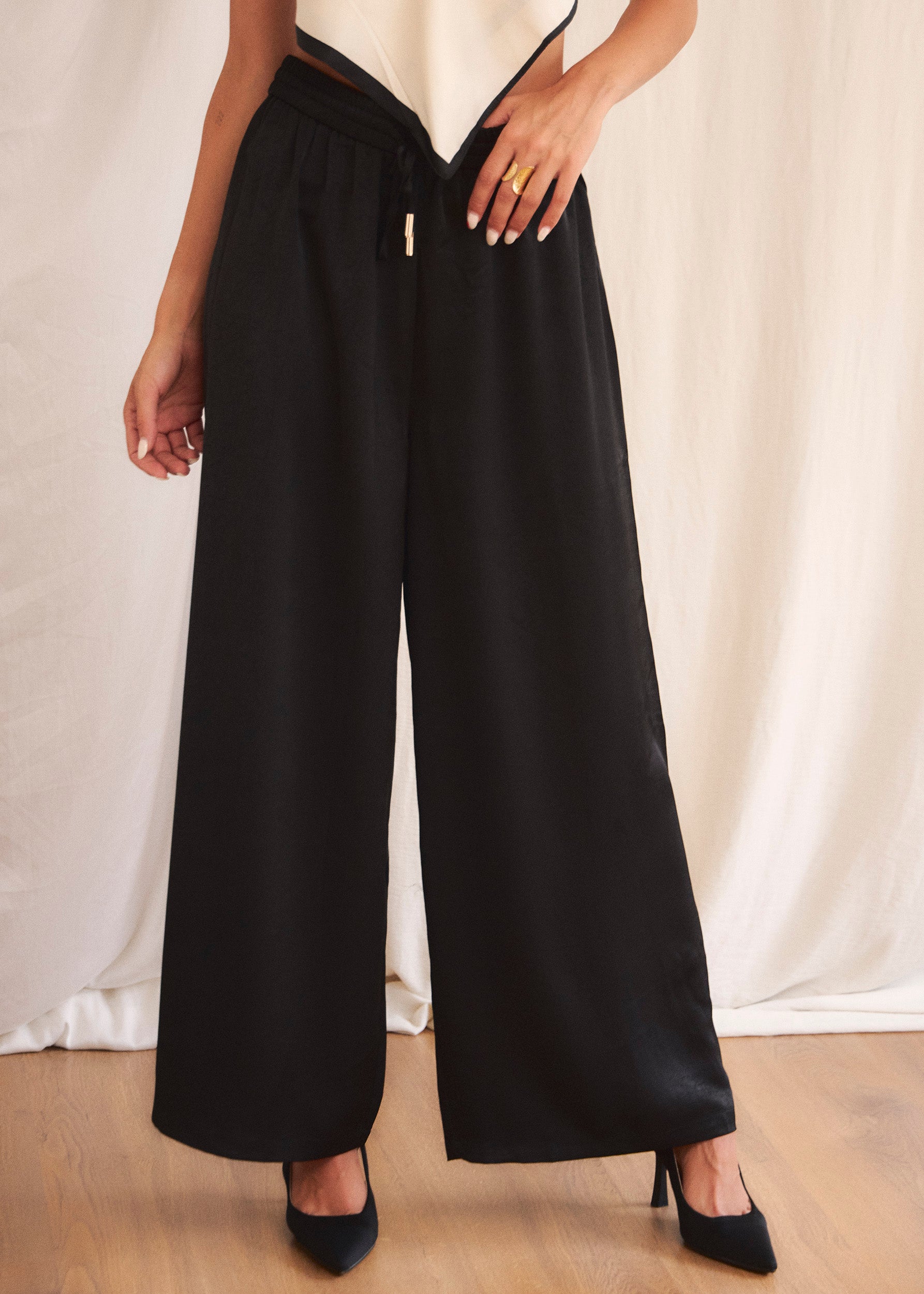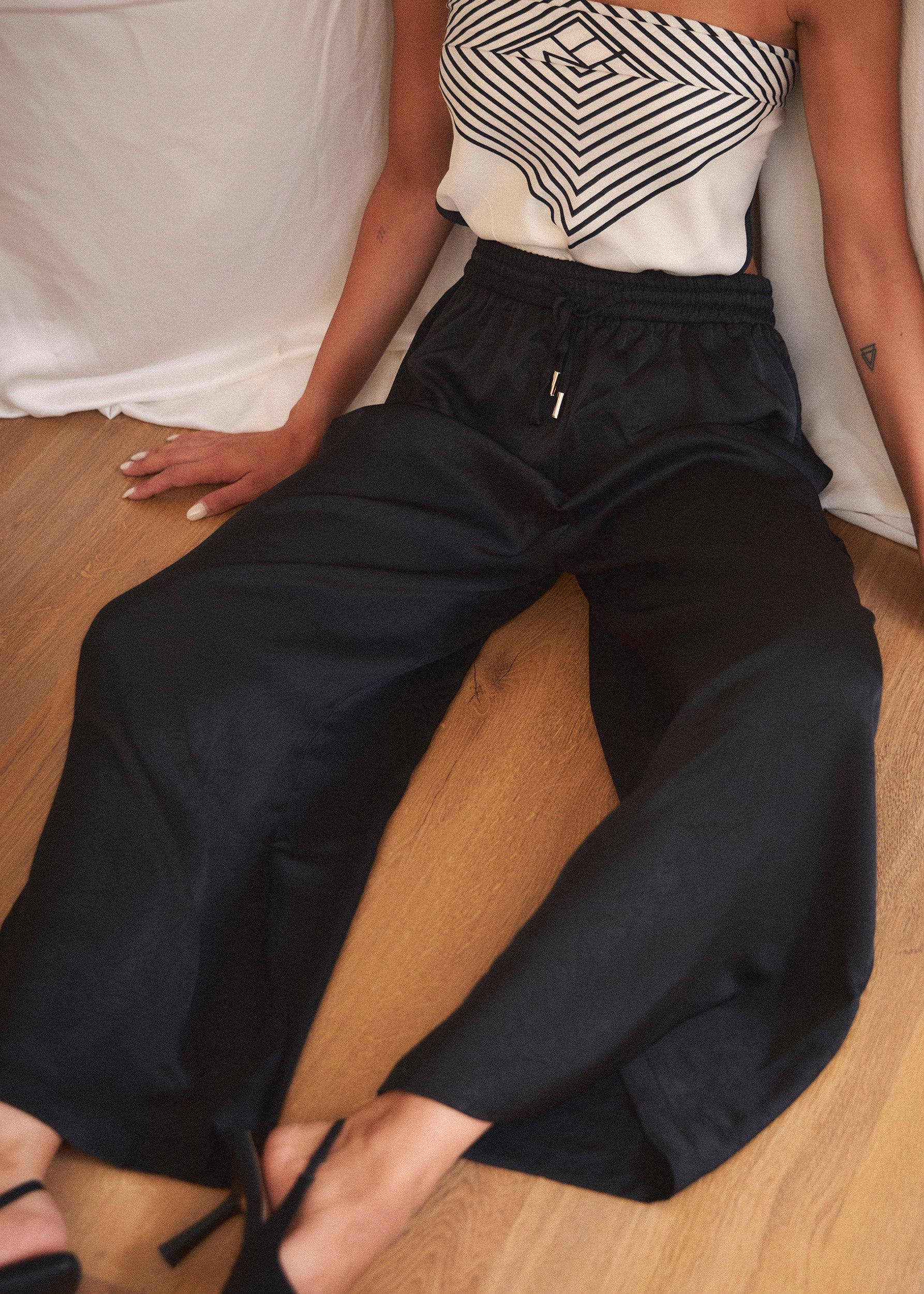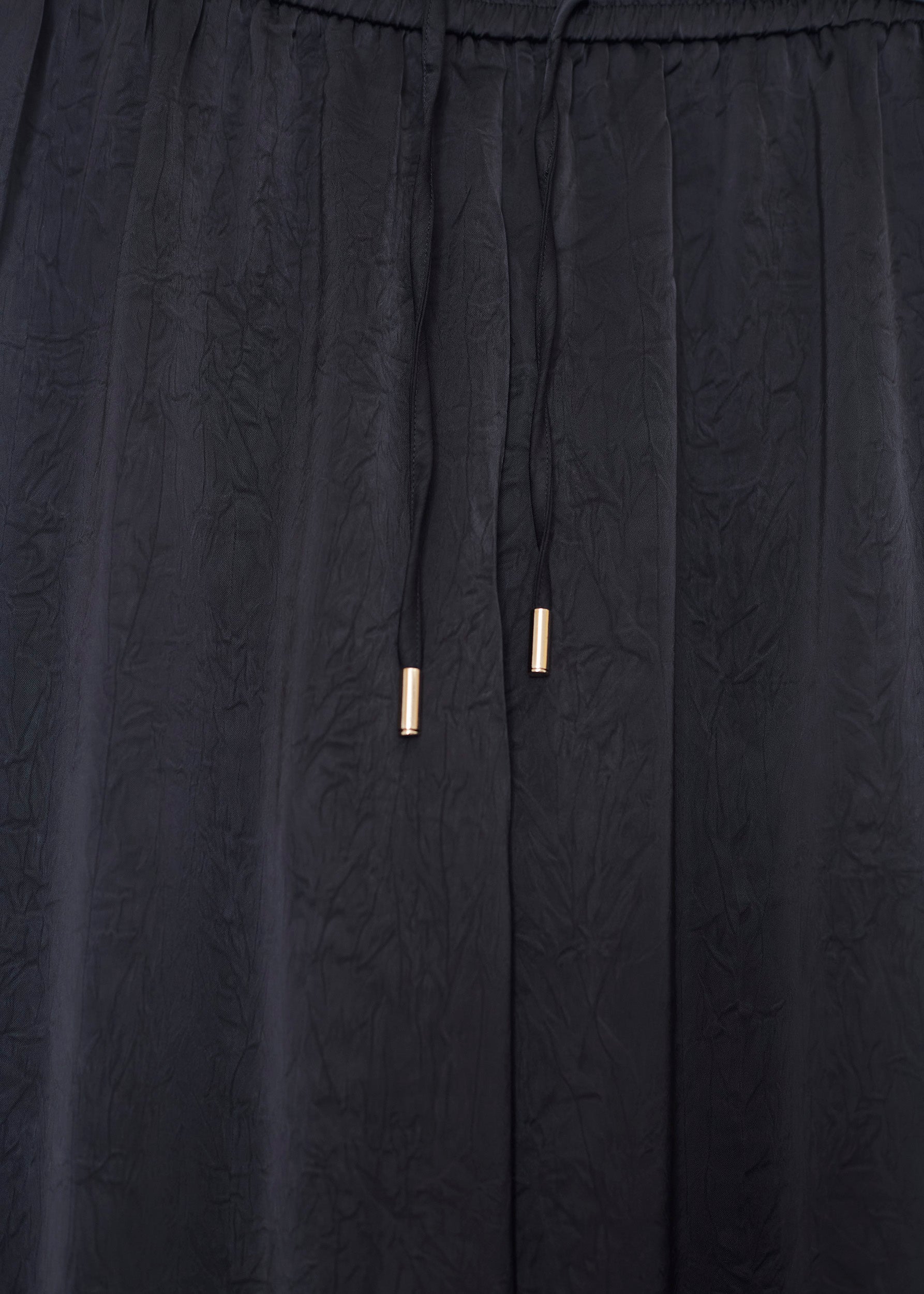 Long wide-leg trousers. Drawstring closure and gold trim. Elastic waist.
