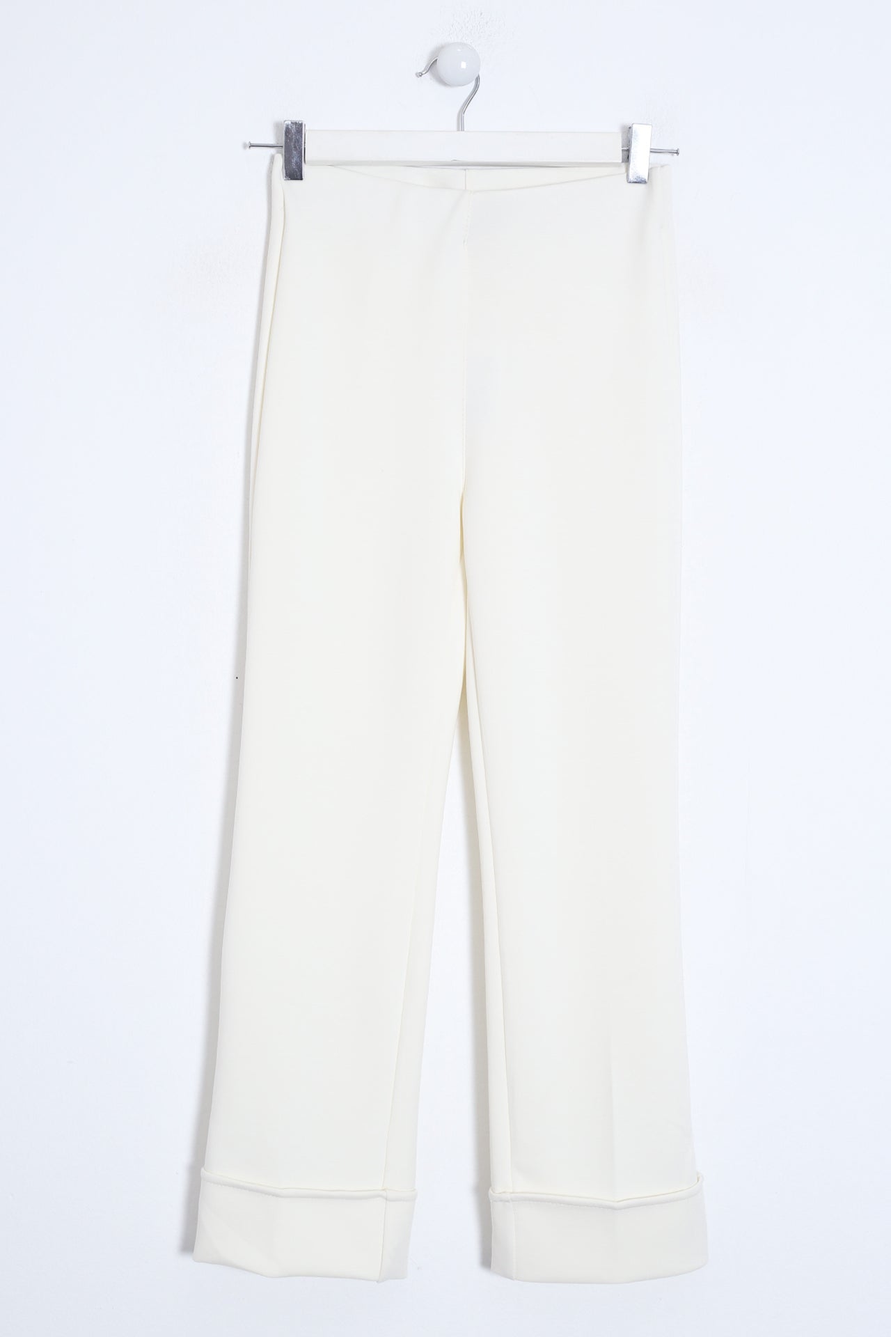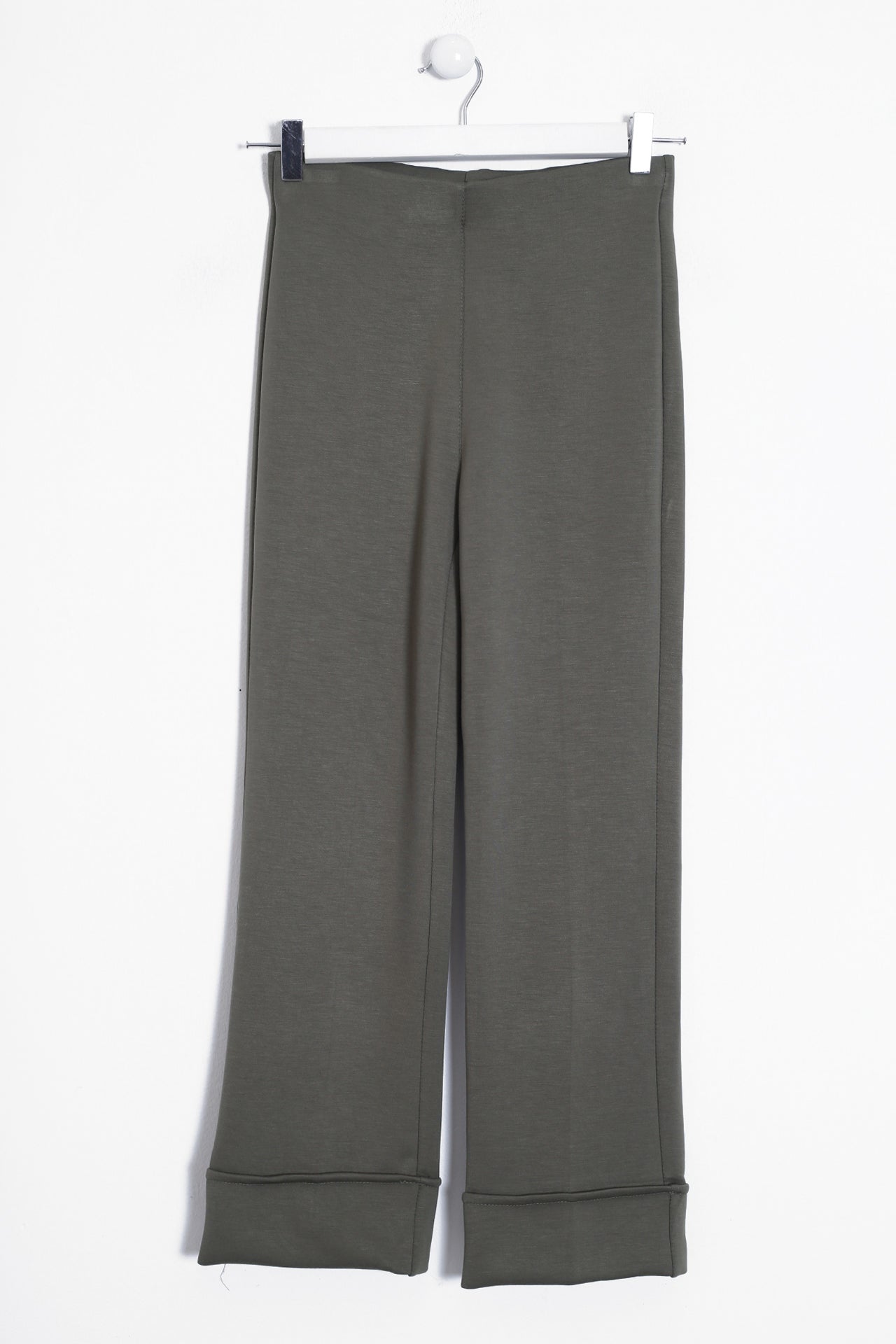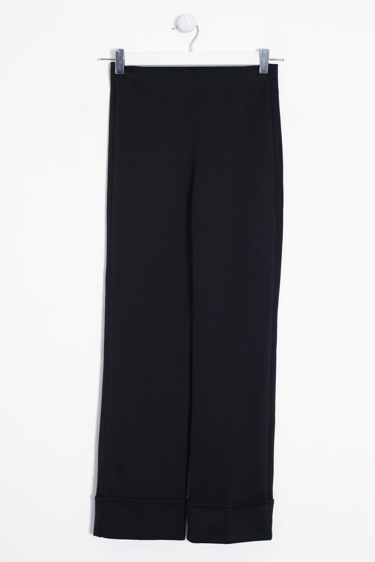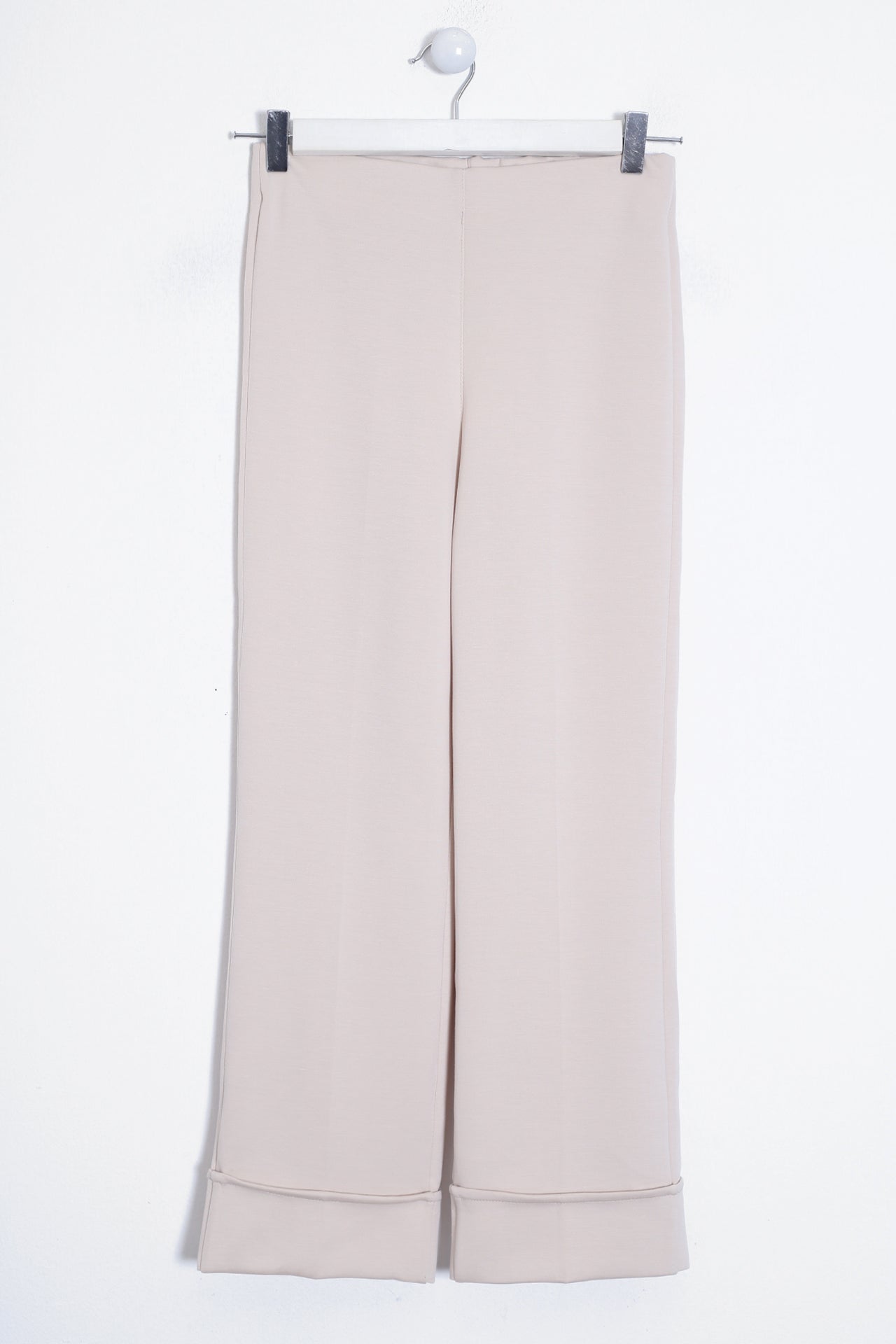 Pantalones de tiro alto y pierna recta acabada en vuelta. Cintura elástica oculta. Tejido elástico.
