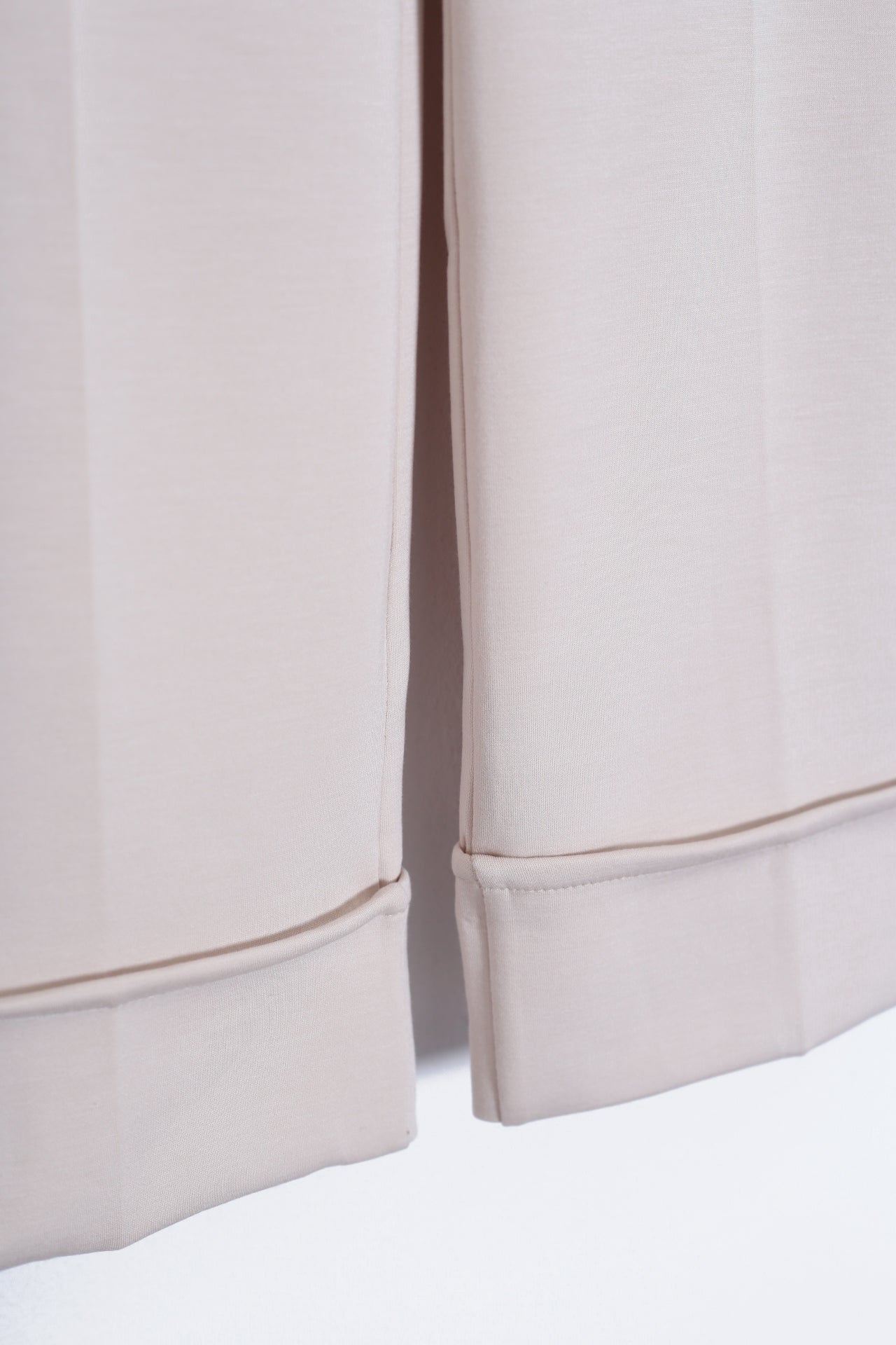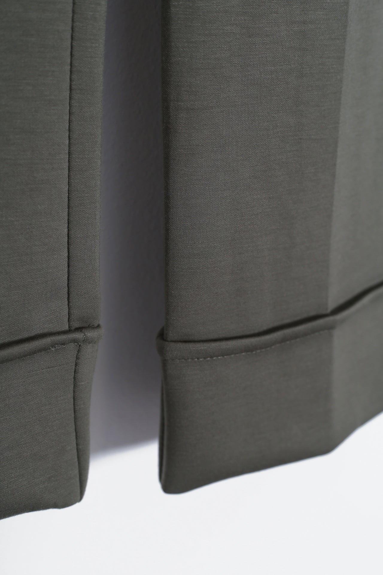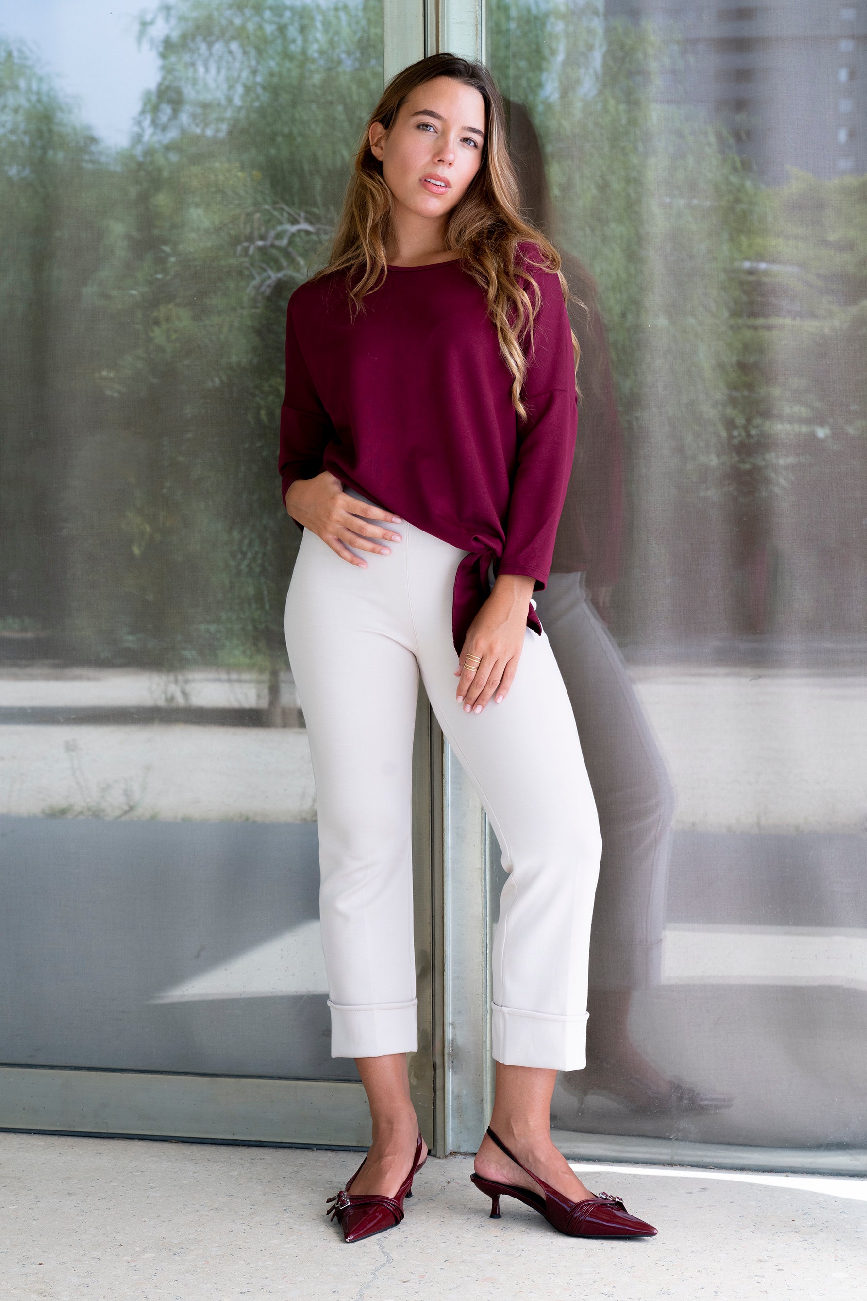 Pantalones de tiro alto y pierna recta acabada en vuelta. Cintura elástica oculta. Tejido elástico.
