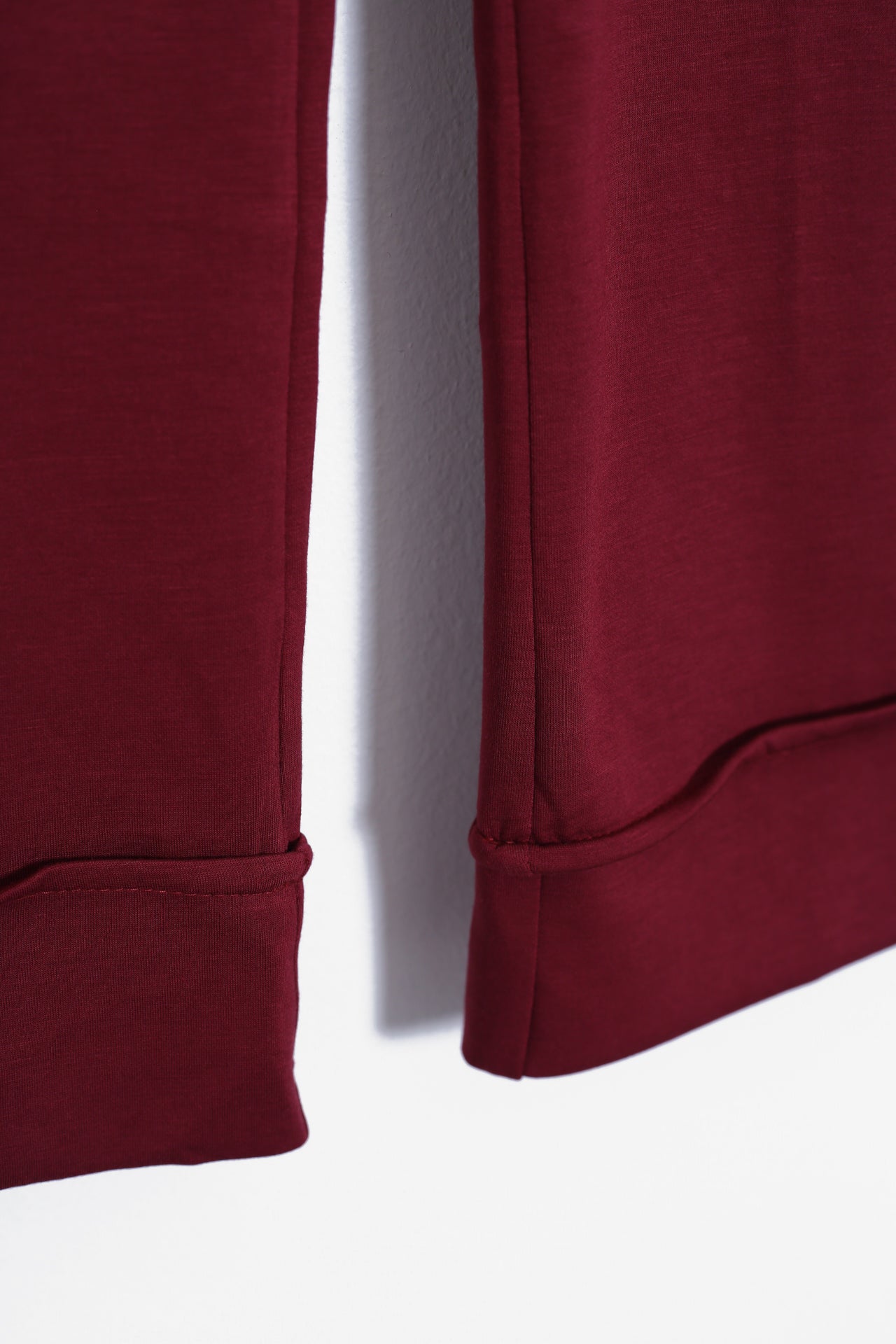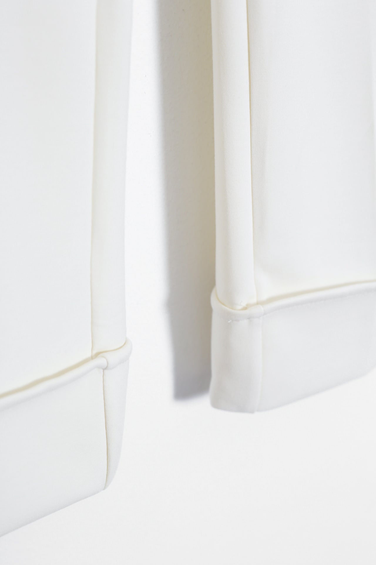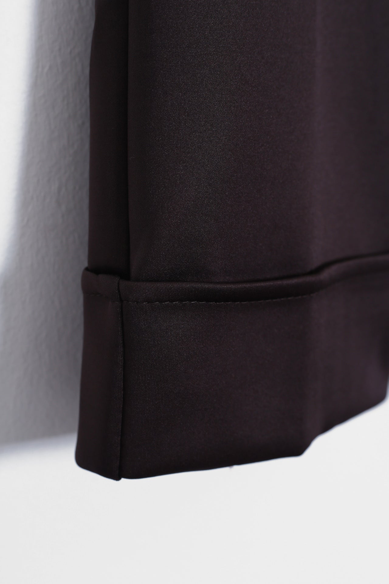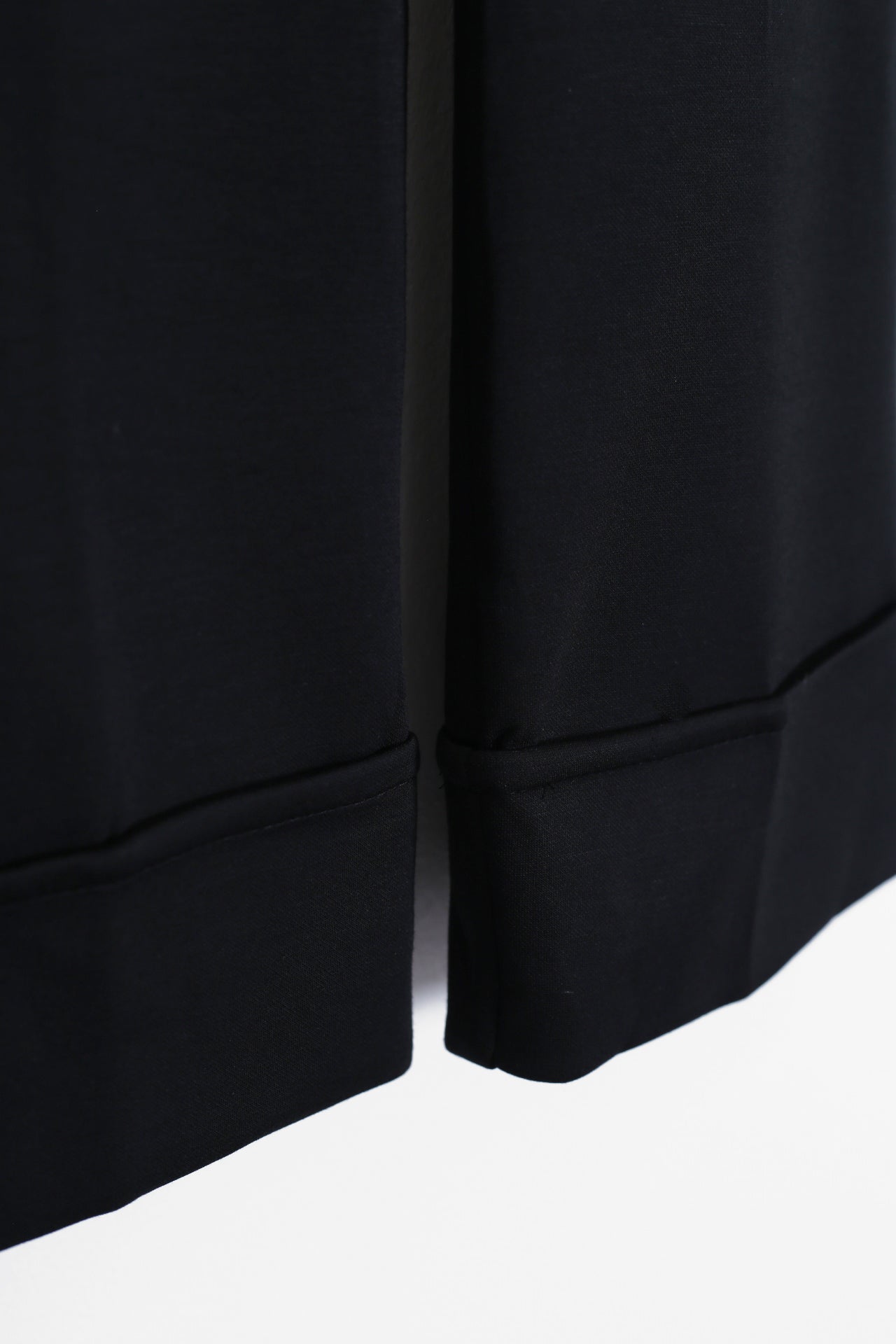 Pantalones de tiro alto y pierna recta acabada en vuelta. Cintura elástica oculta. Tejido elástico.