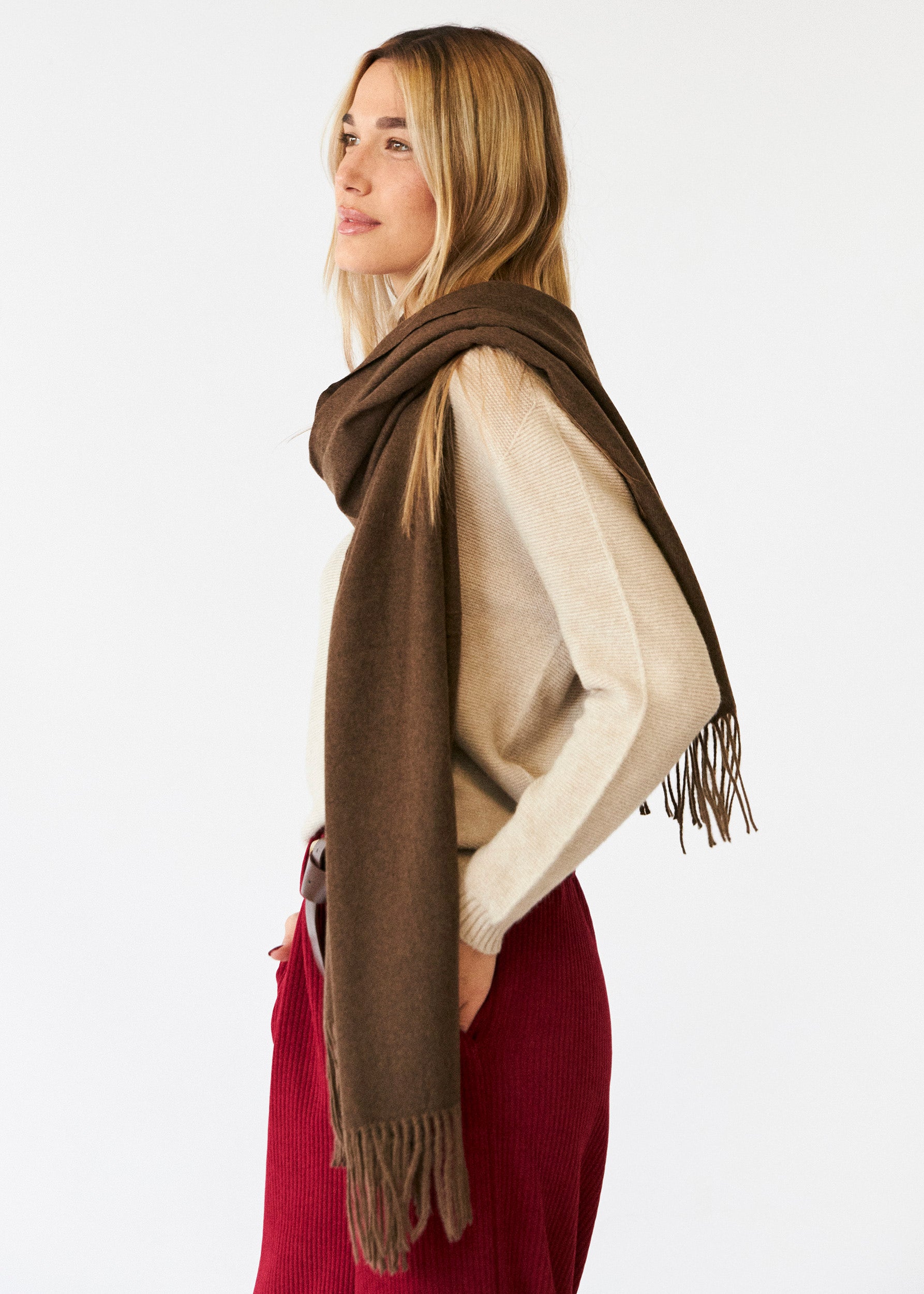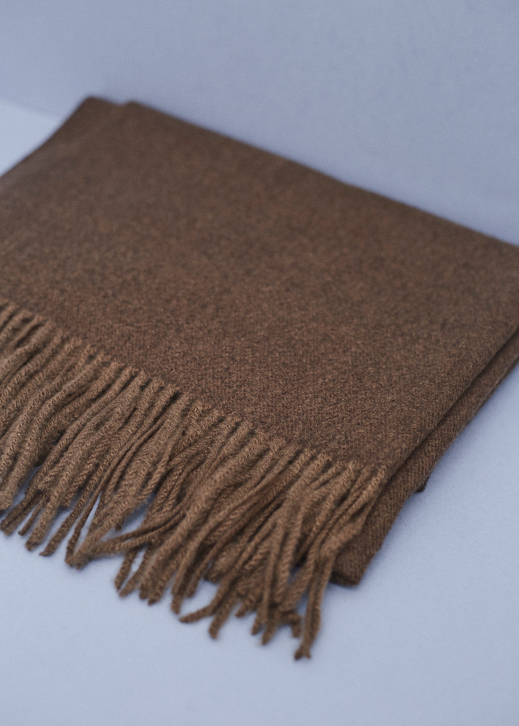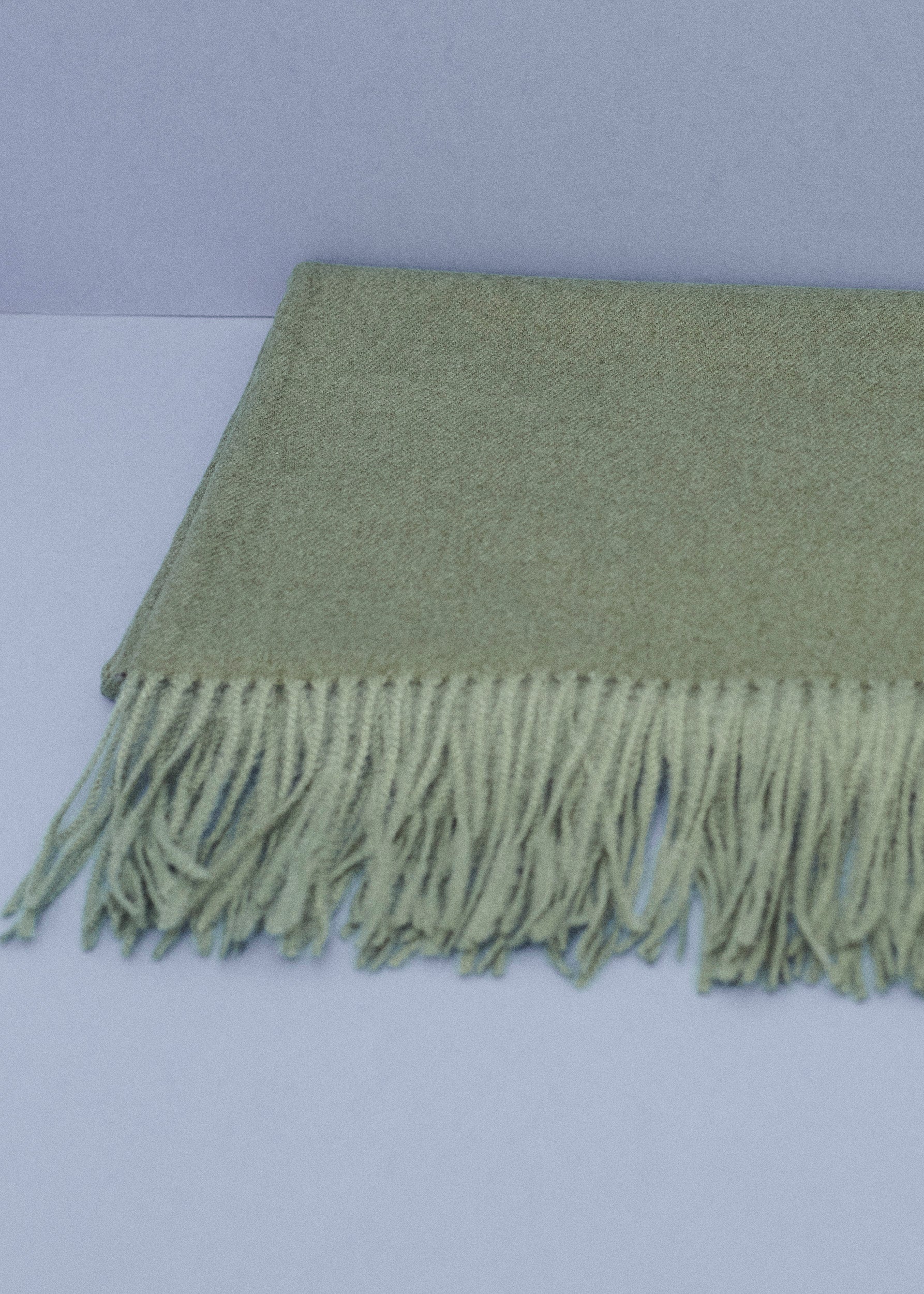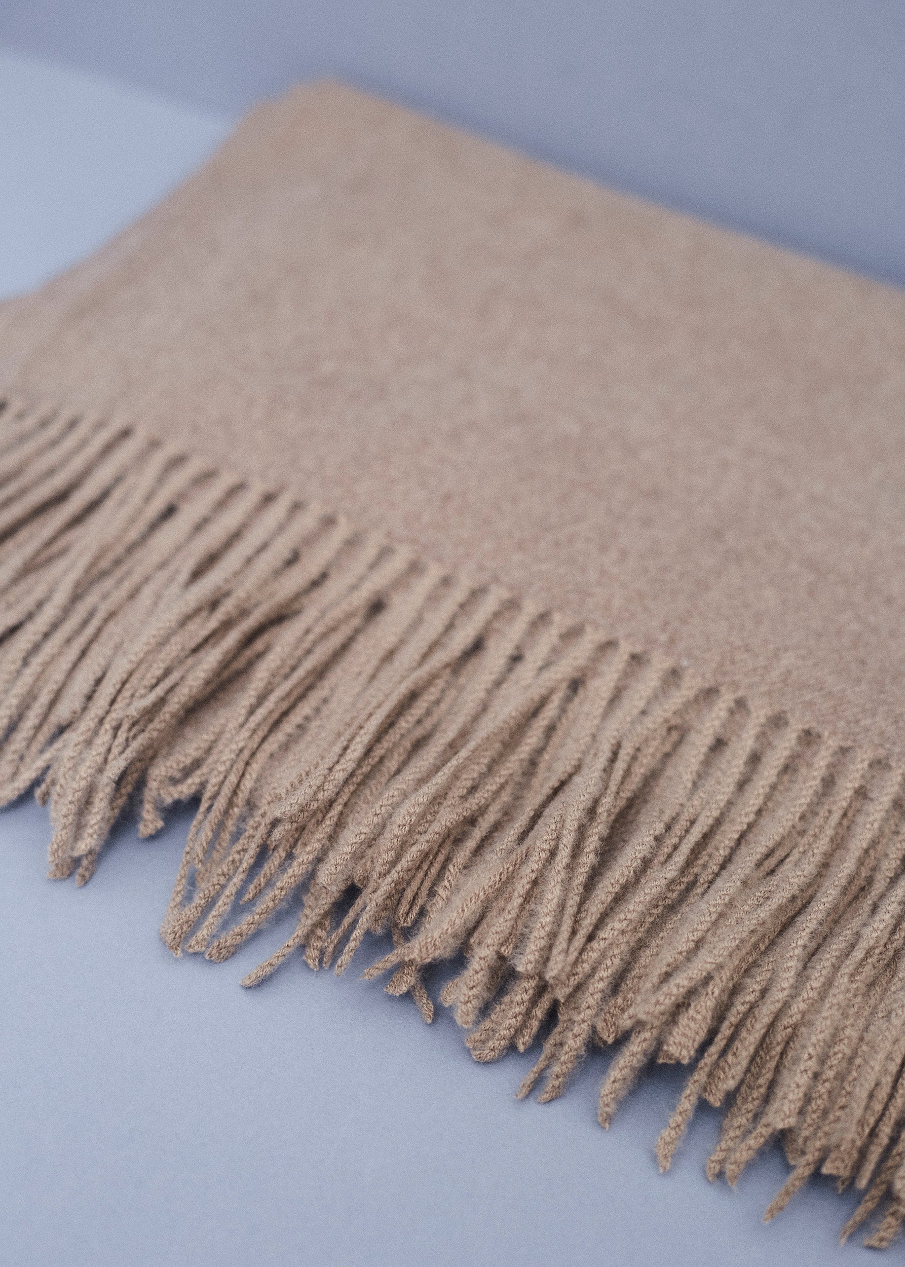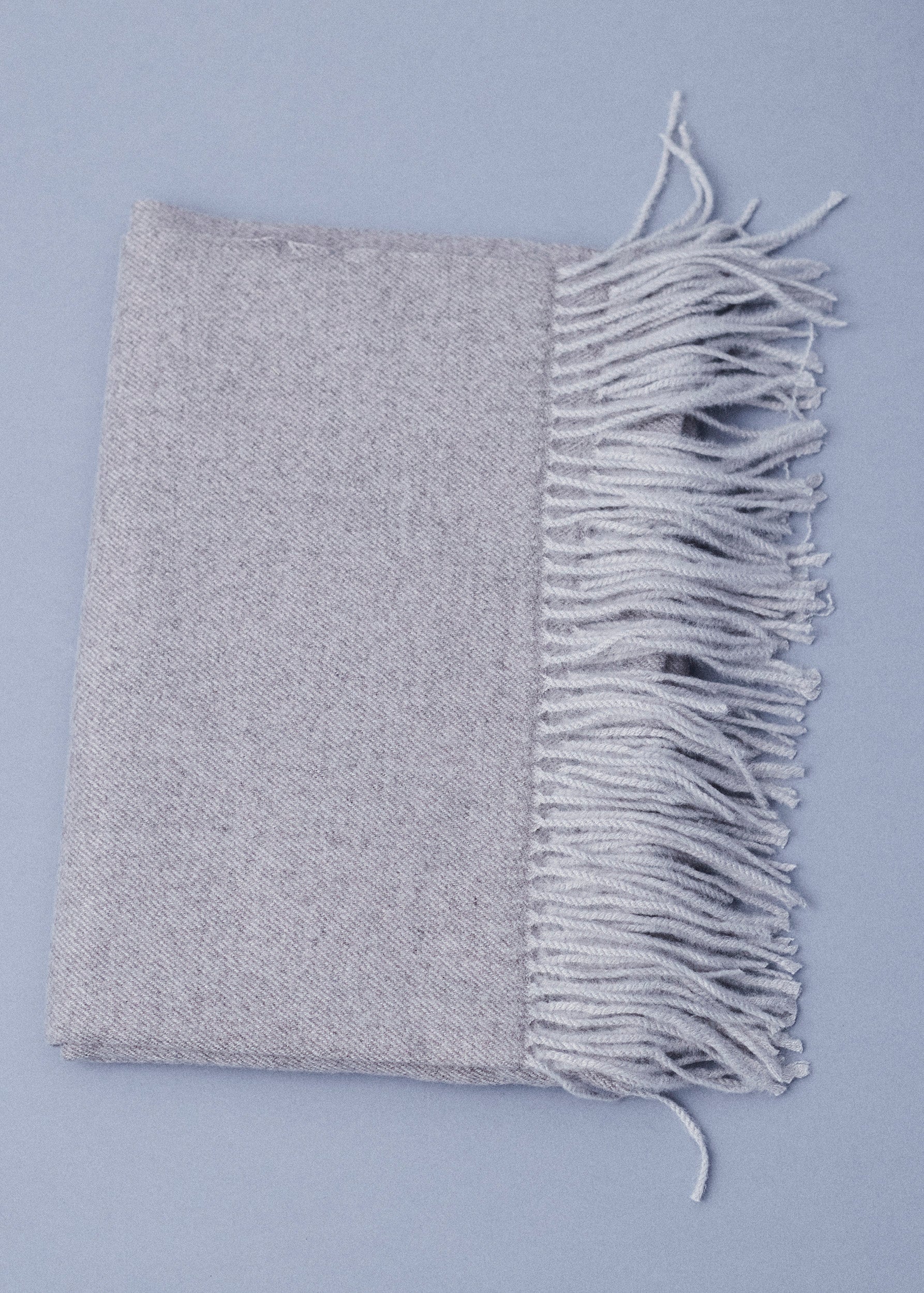 Triangular shawl with checked fabric and finished with contrasting trim detail.