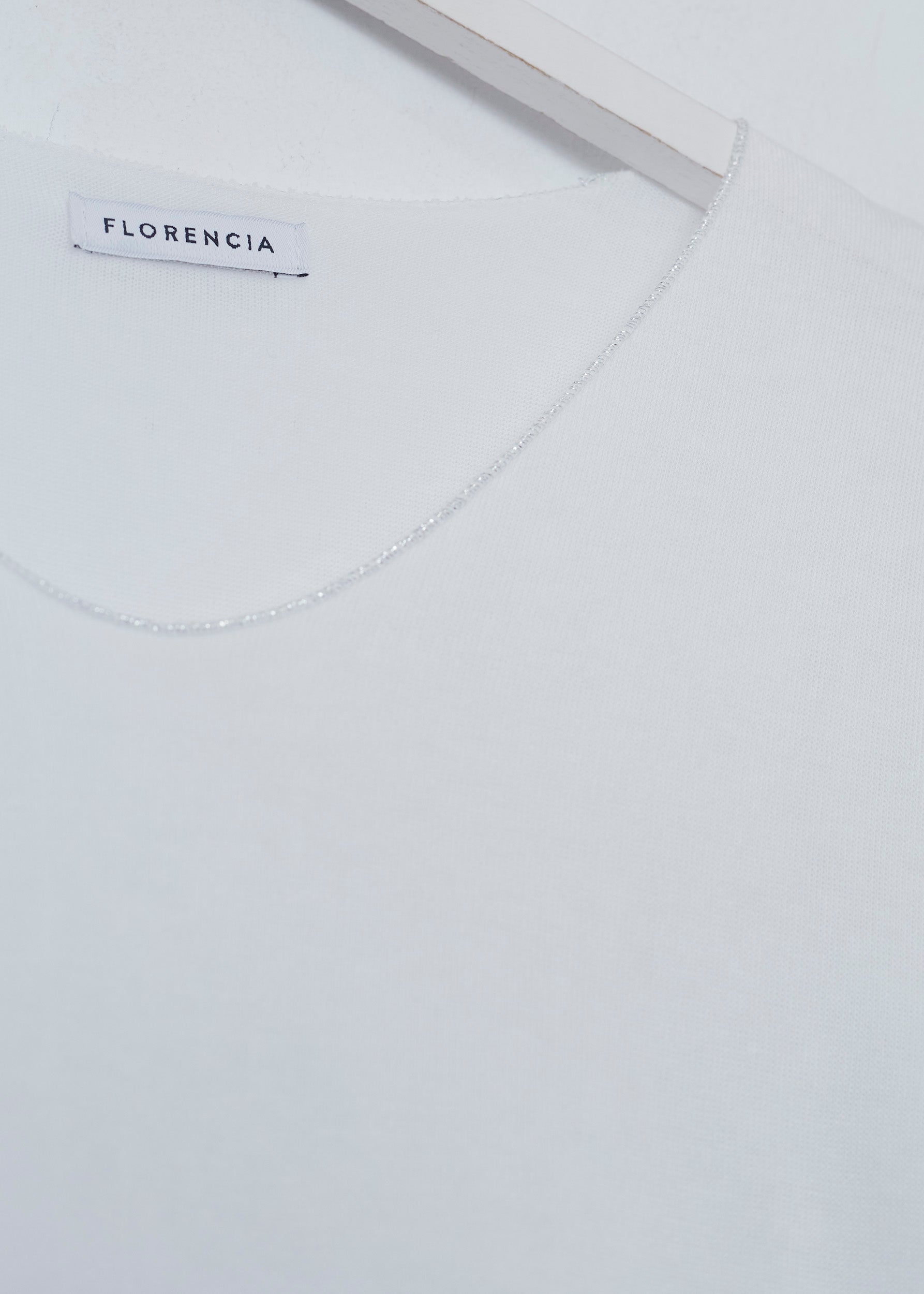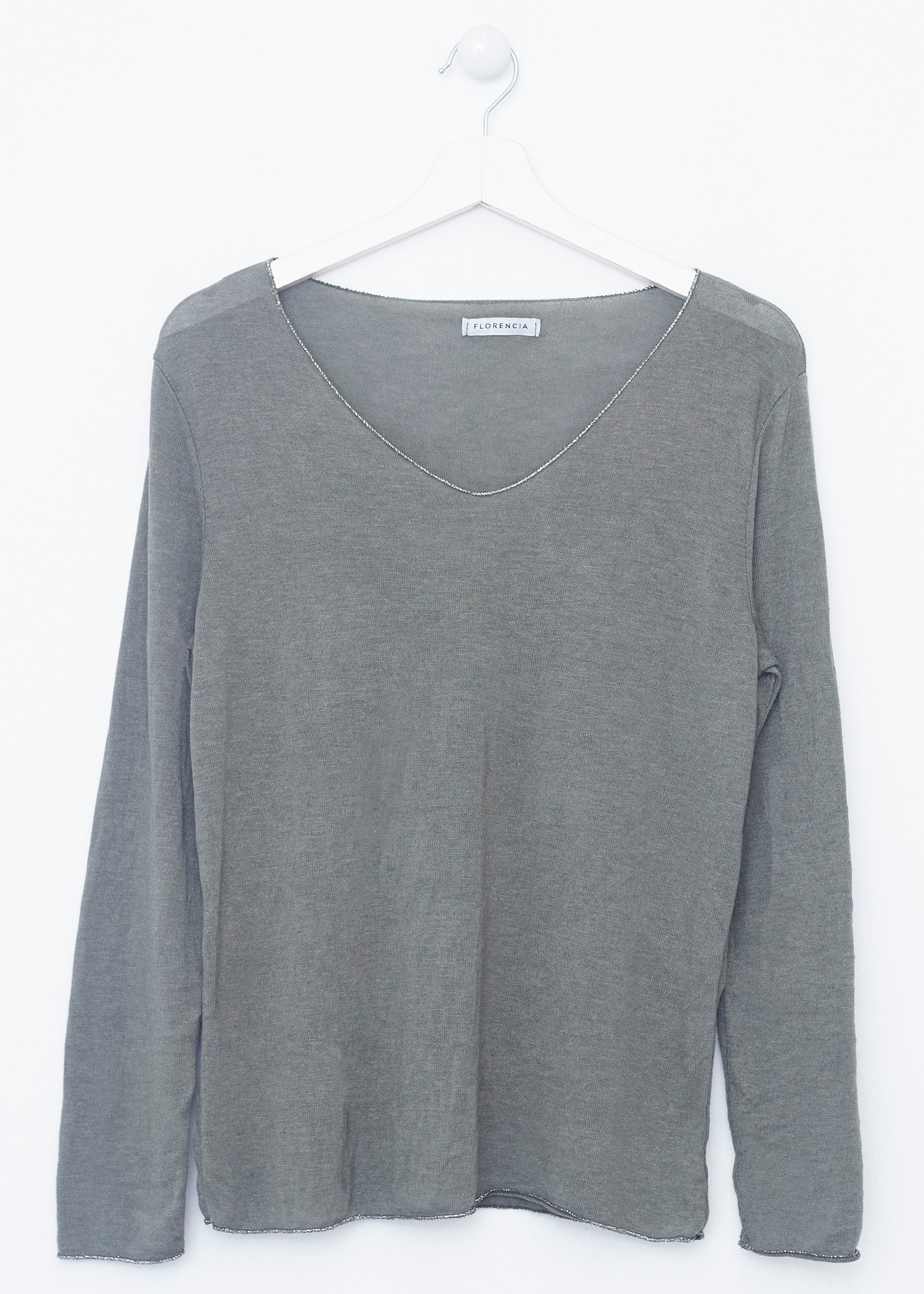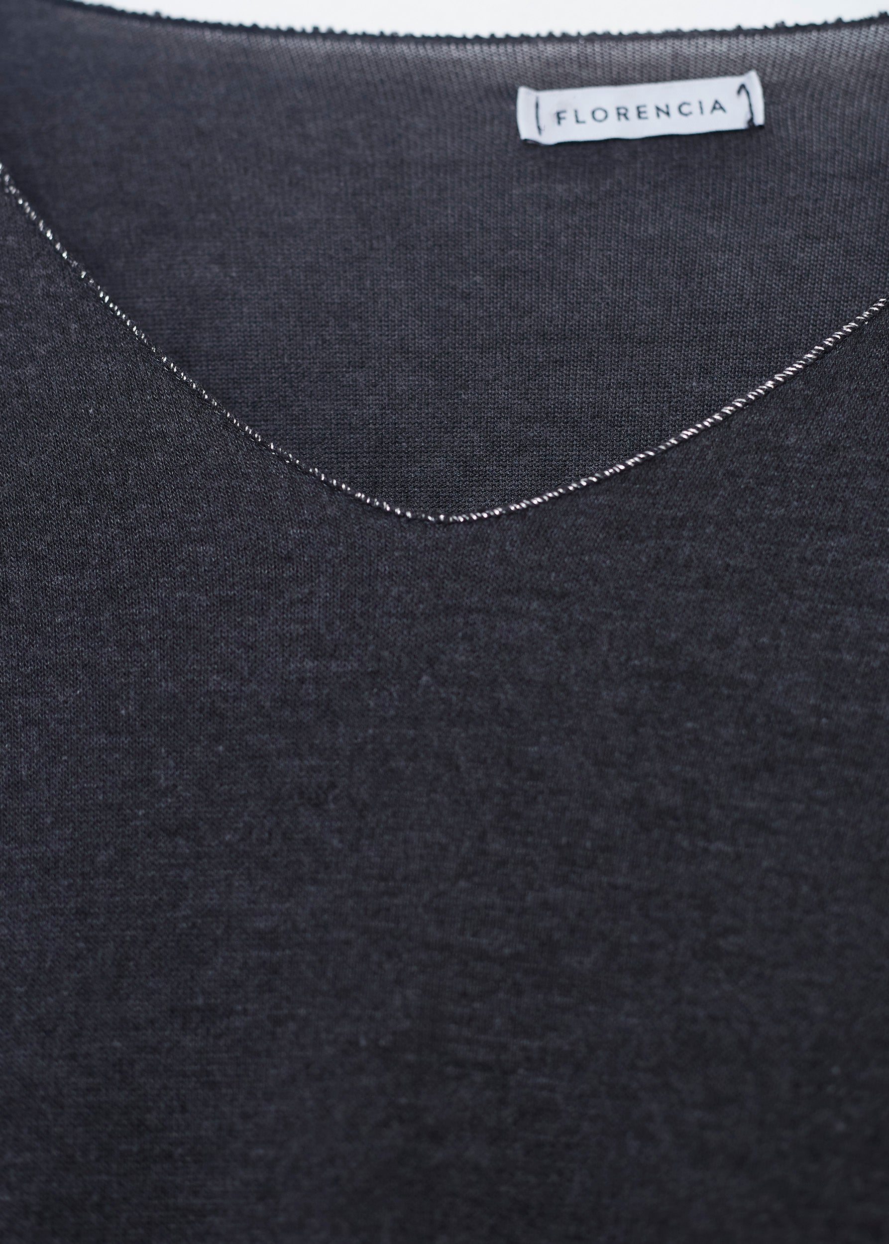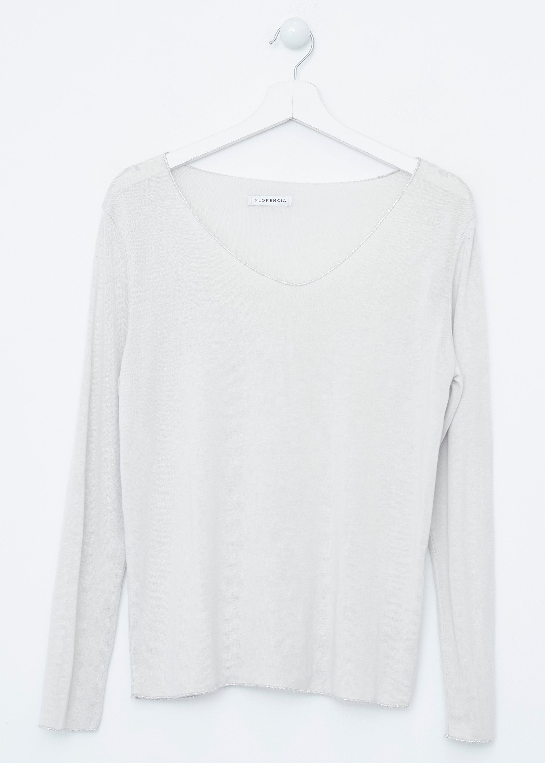 Knitted T-shirt with a pointed collar and long sleeves. Shiny detail on the collar, cuffs and bottom.