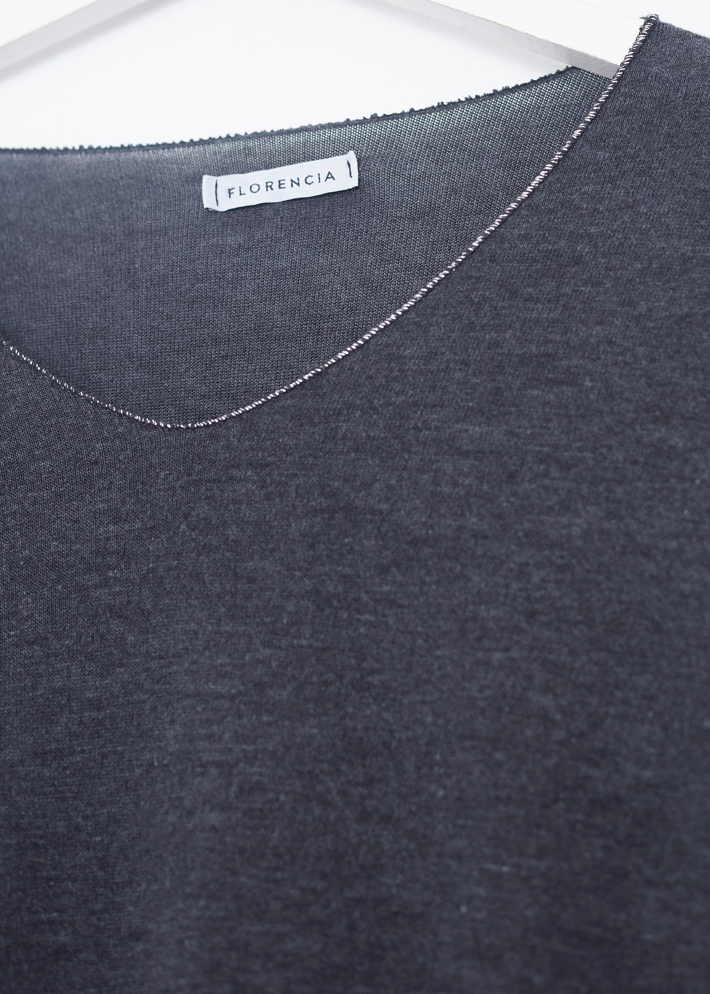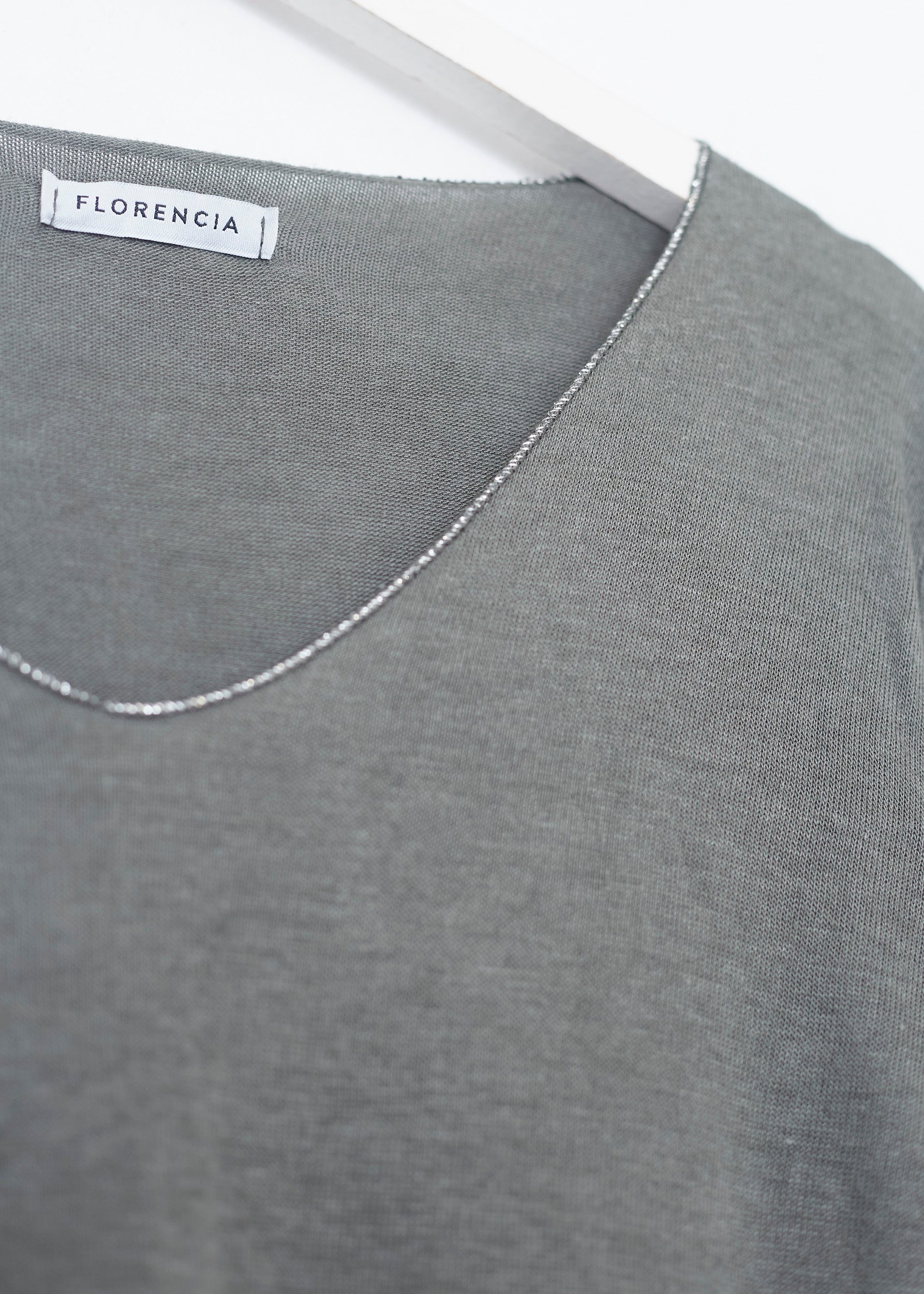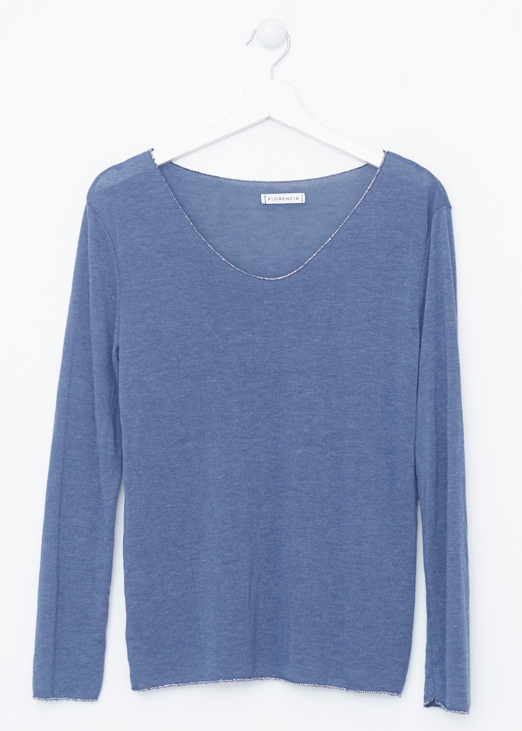 Knitted T-shirt with a pointed collar and long sleeves. Shiny detail on the collar, cuffs and bottom.