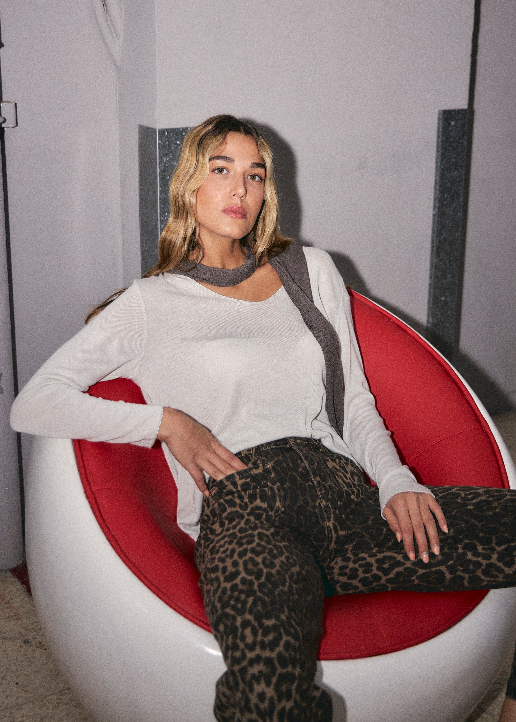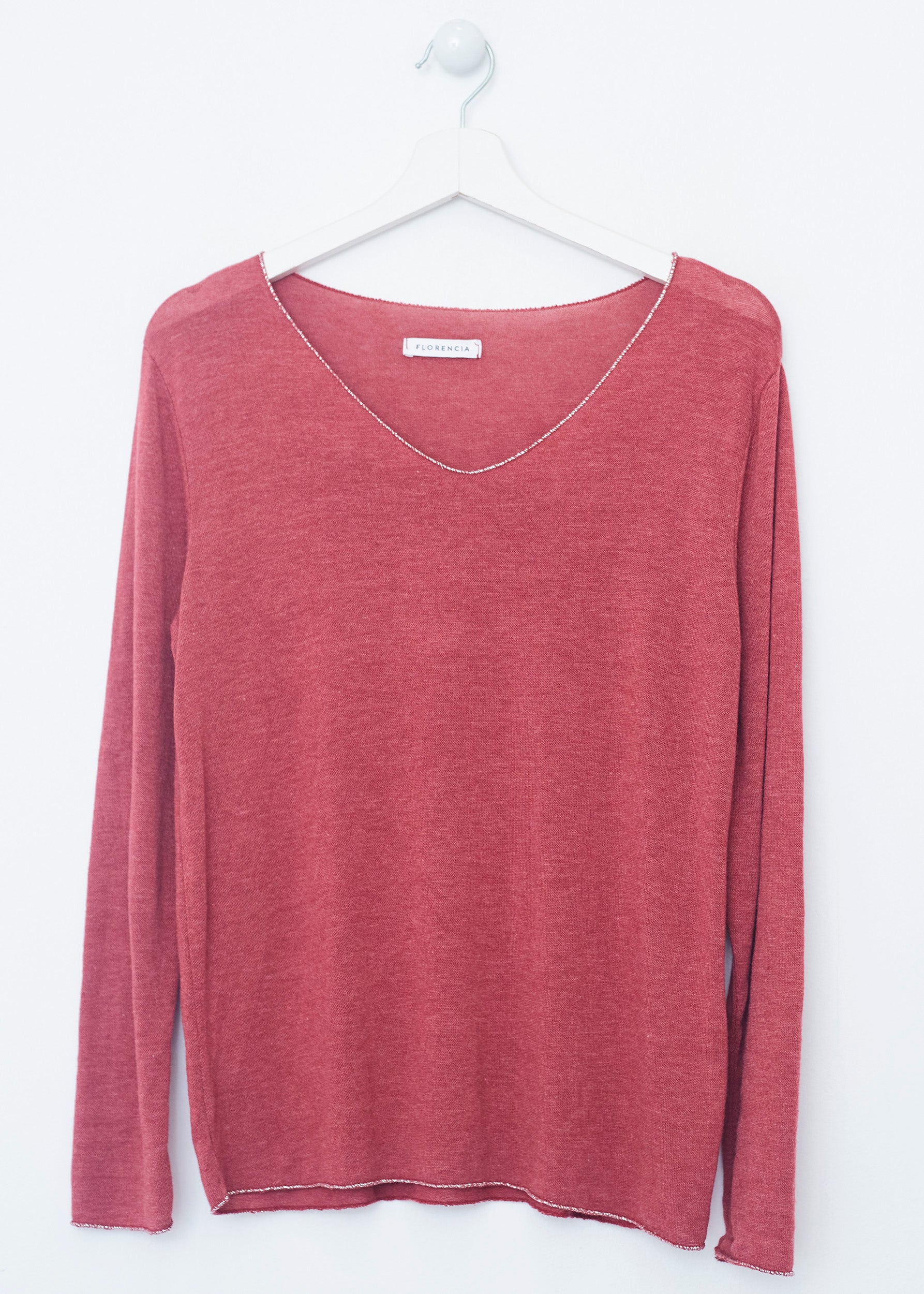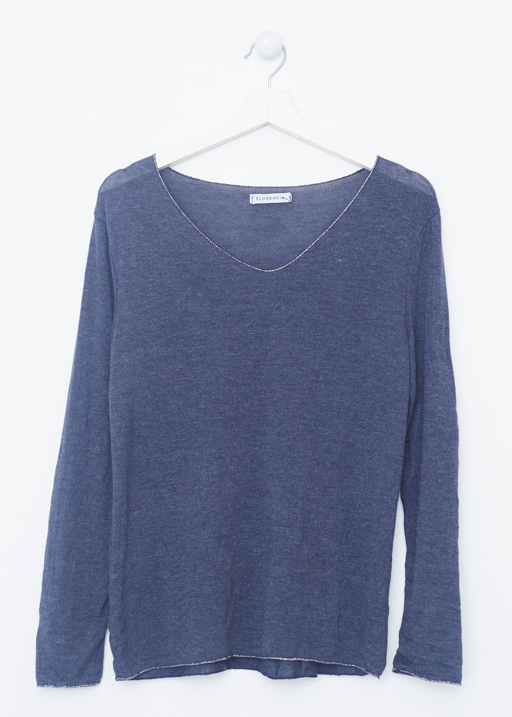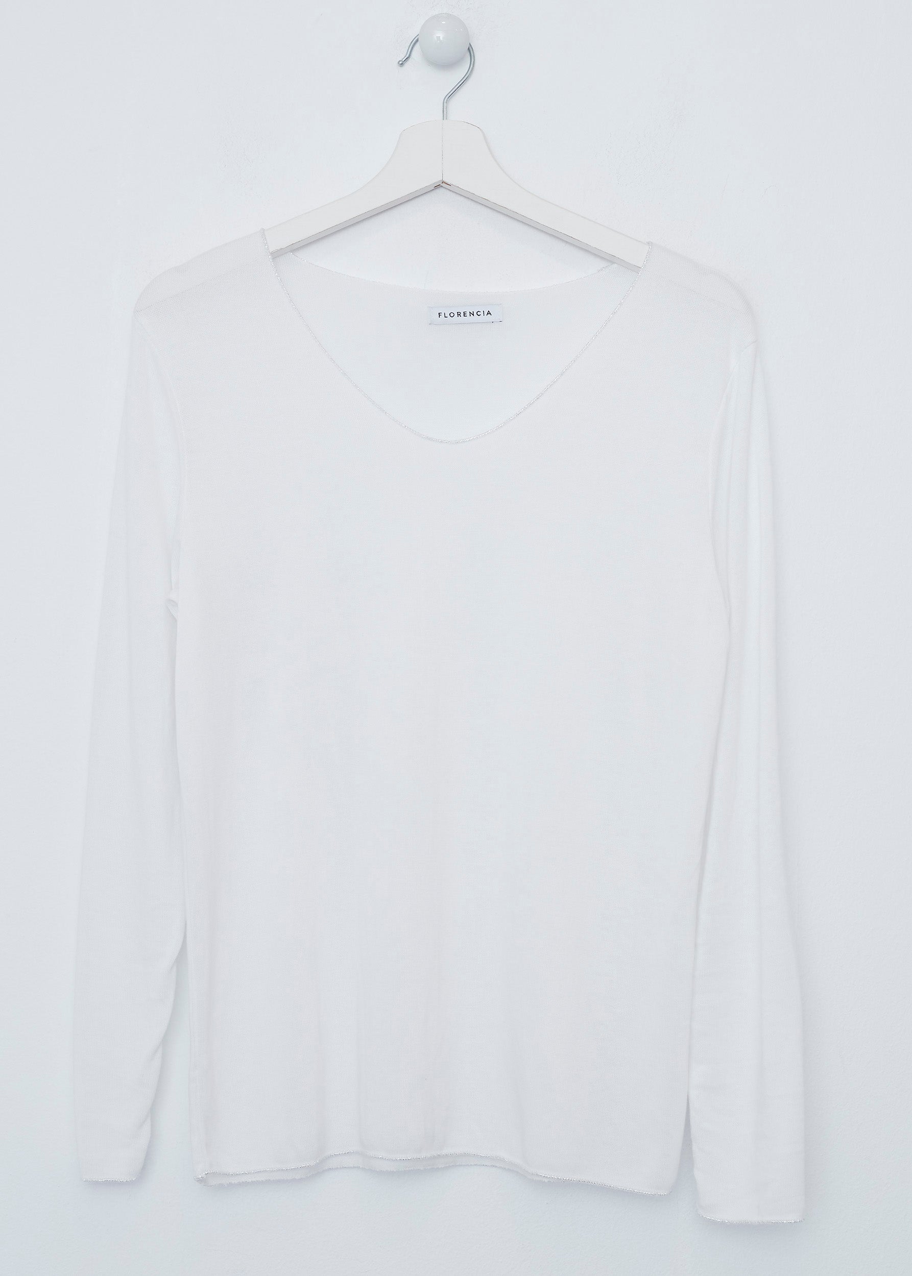 Knitted T-shirt with a pointed collar and long sleeves. Shiny detail on the collar, cuffs and bottom.