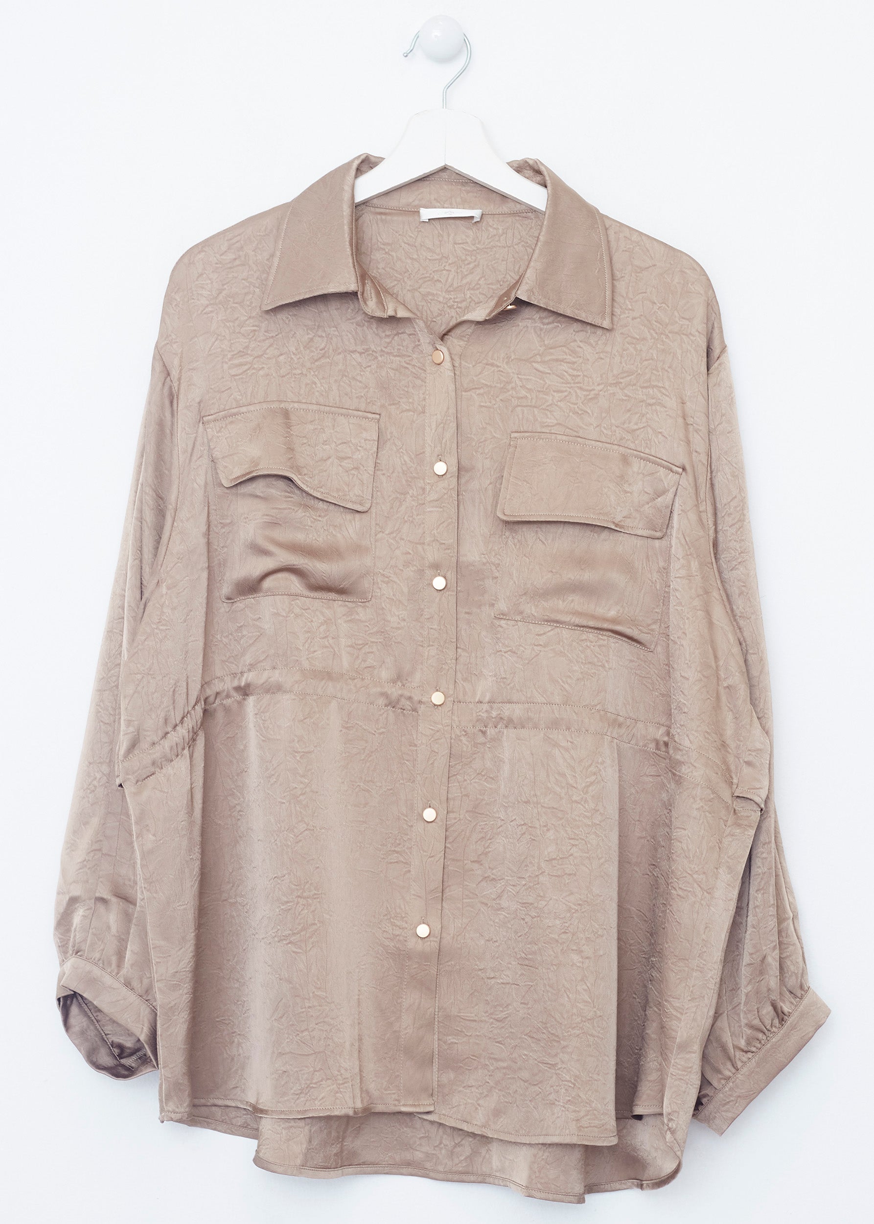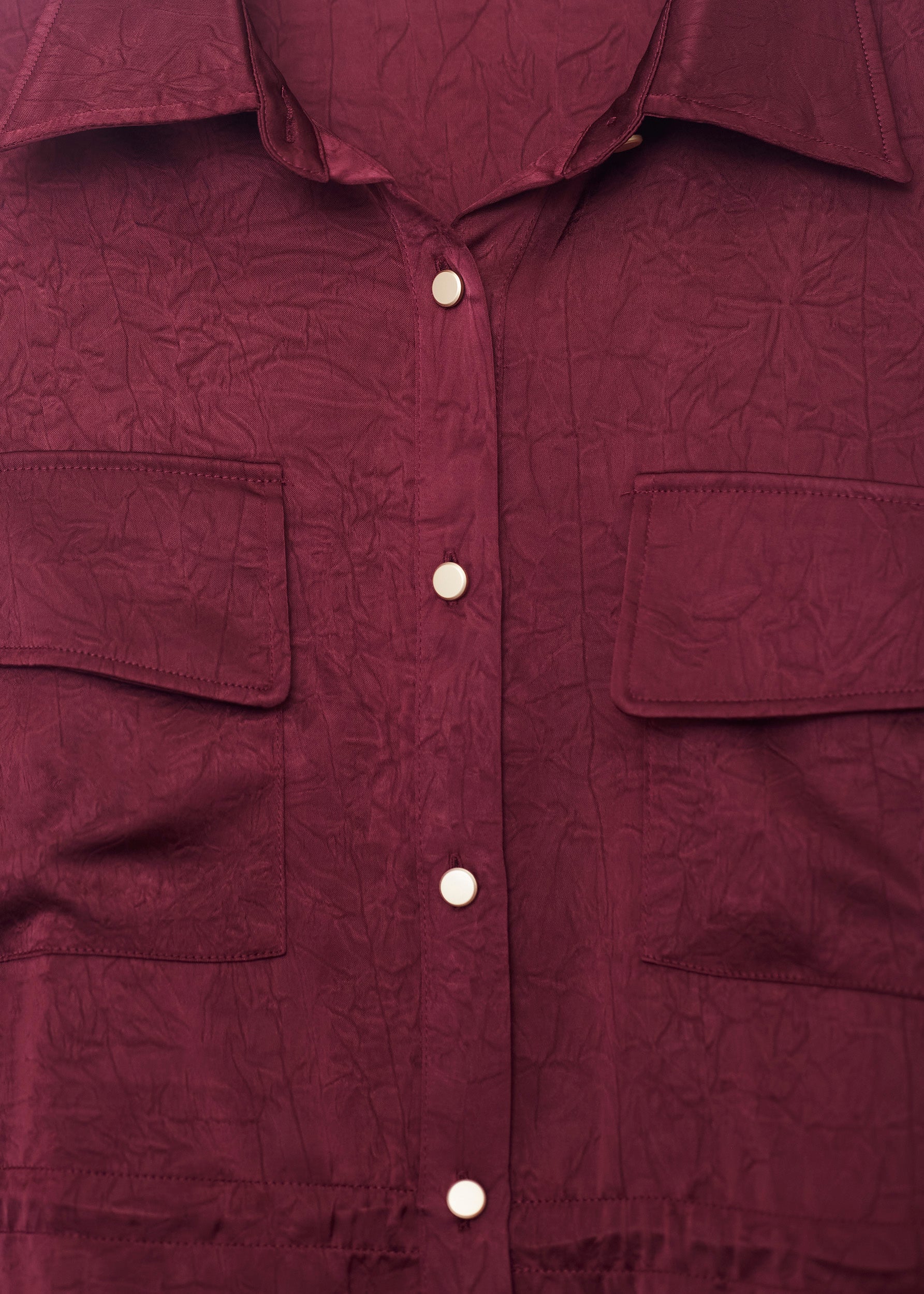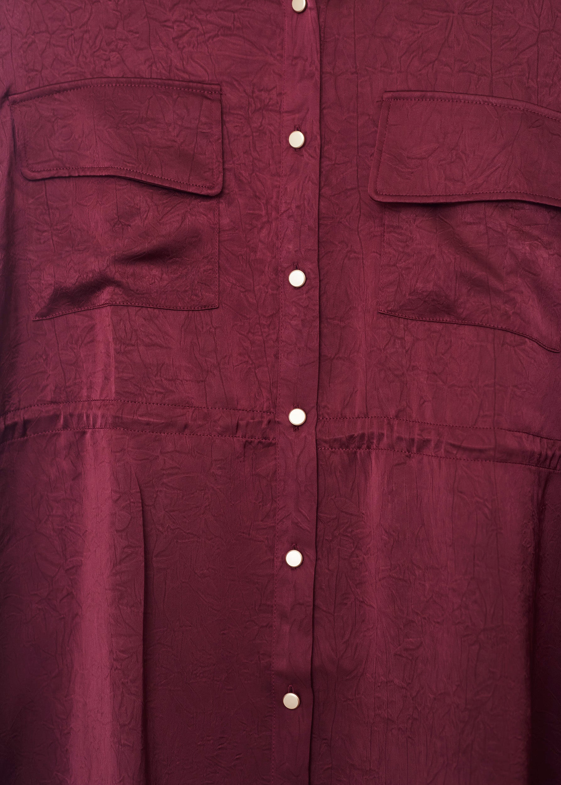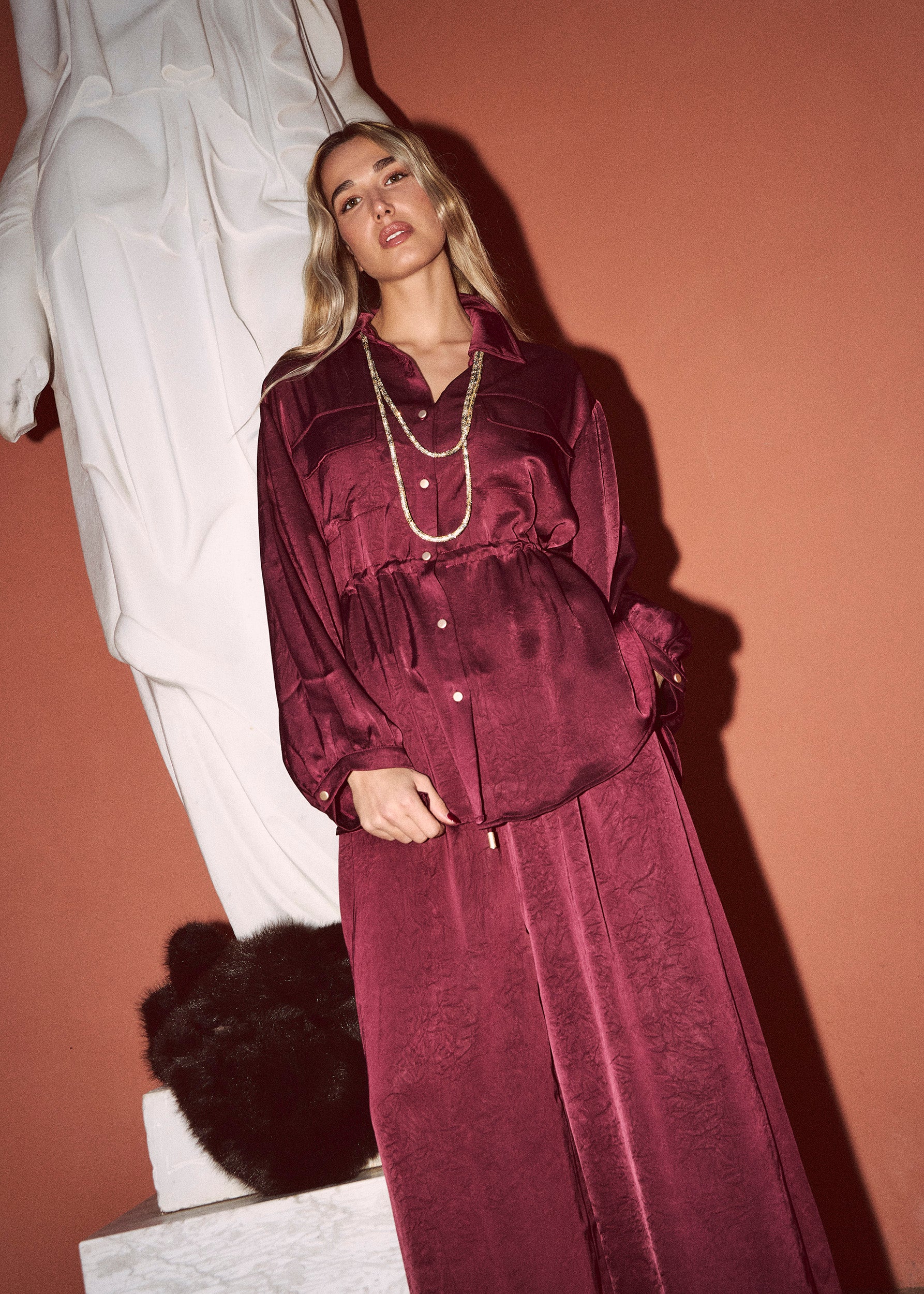 Overshirt with lapel collar and long sleeves with cuffs. Front patch pockets. Front button closure. Adjustable waist with hidden drawstring.