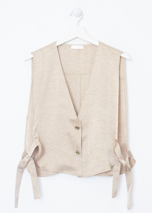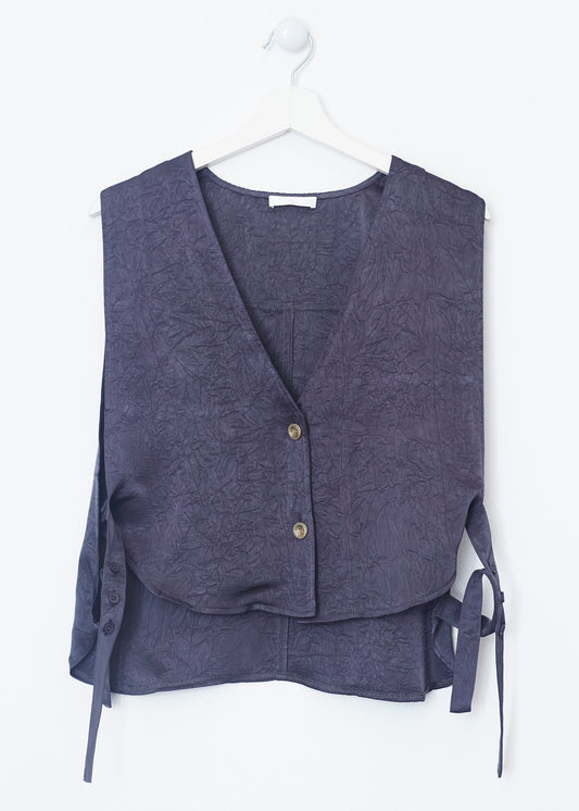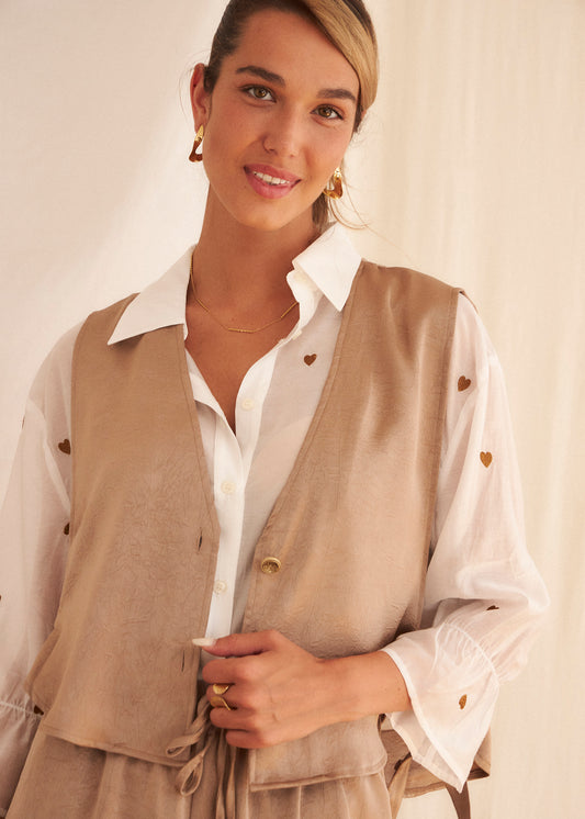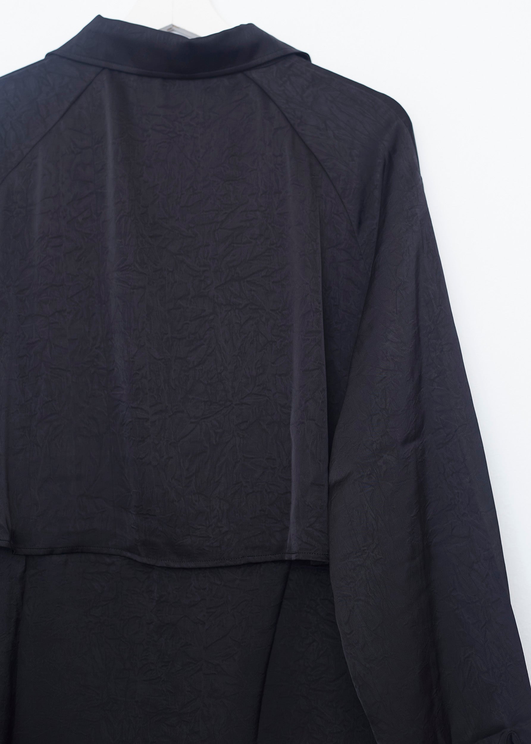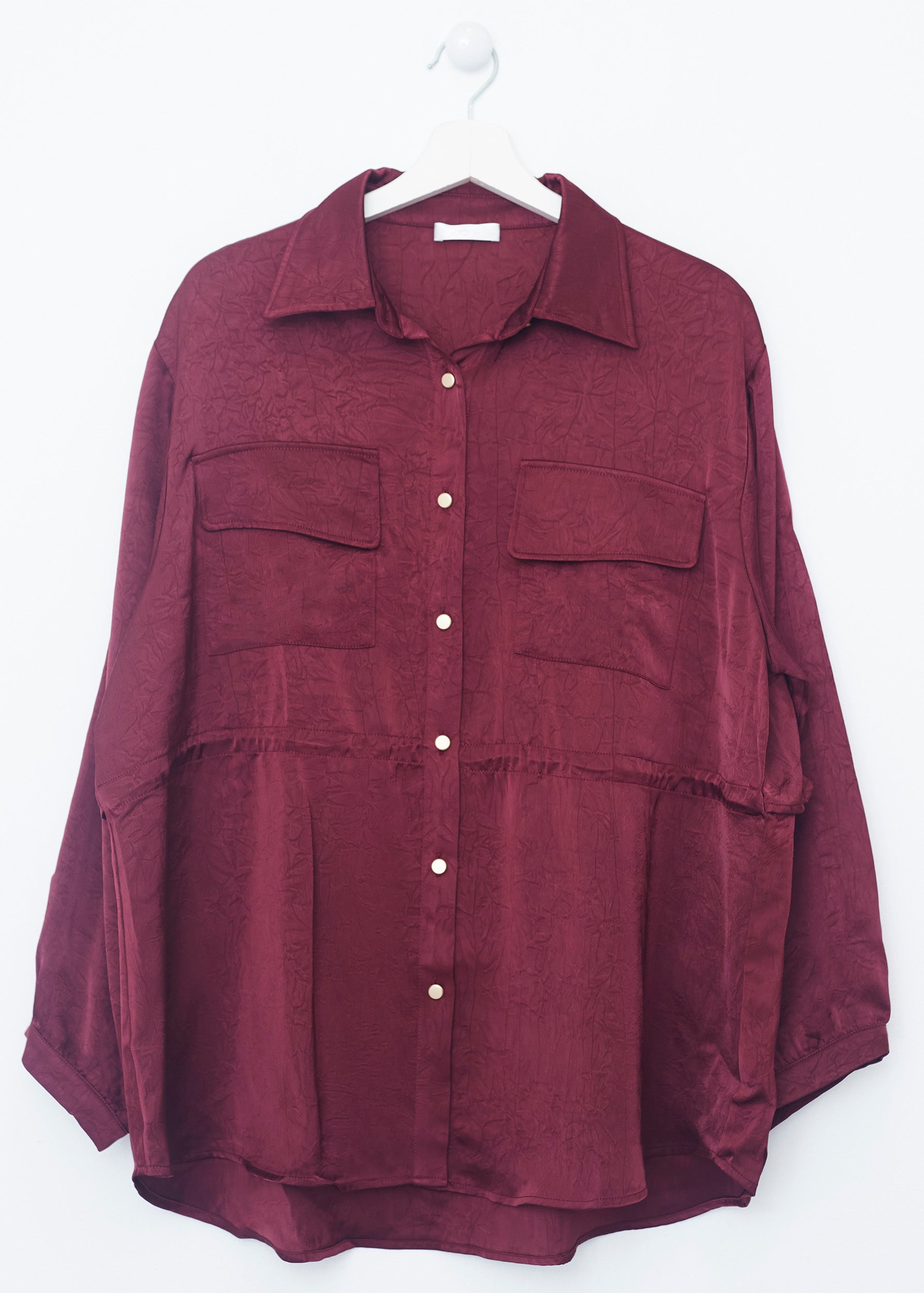 Overshirt with lapel collar and long sleeves with cuffs. Front patch pockets. Front button closure. Adjustable waist with hidden drawstring.