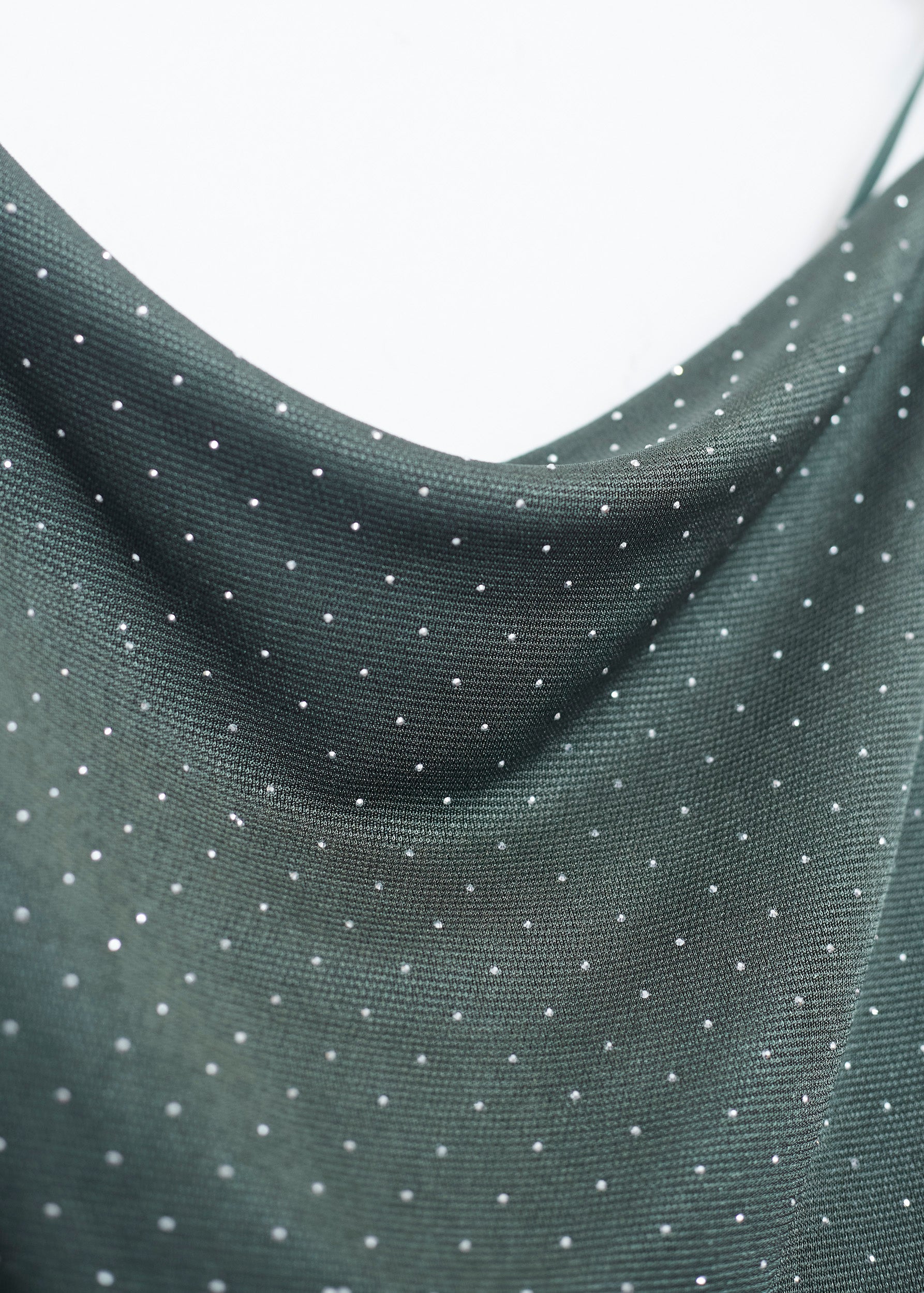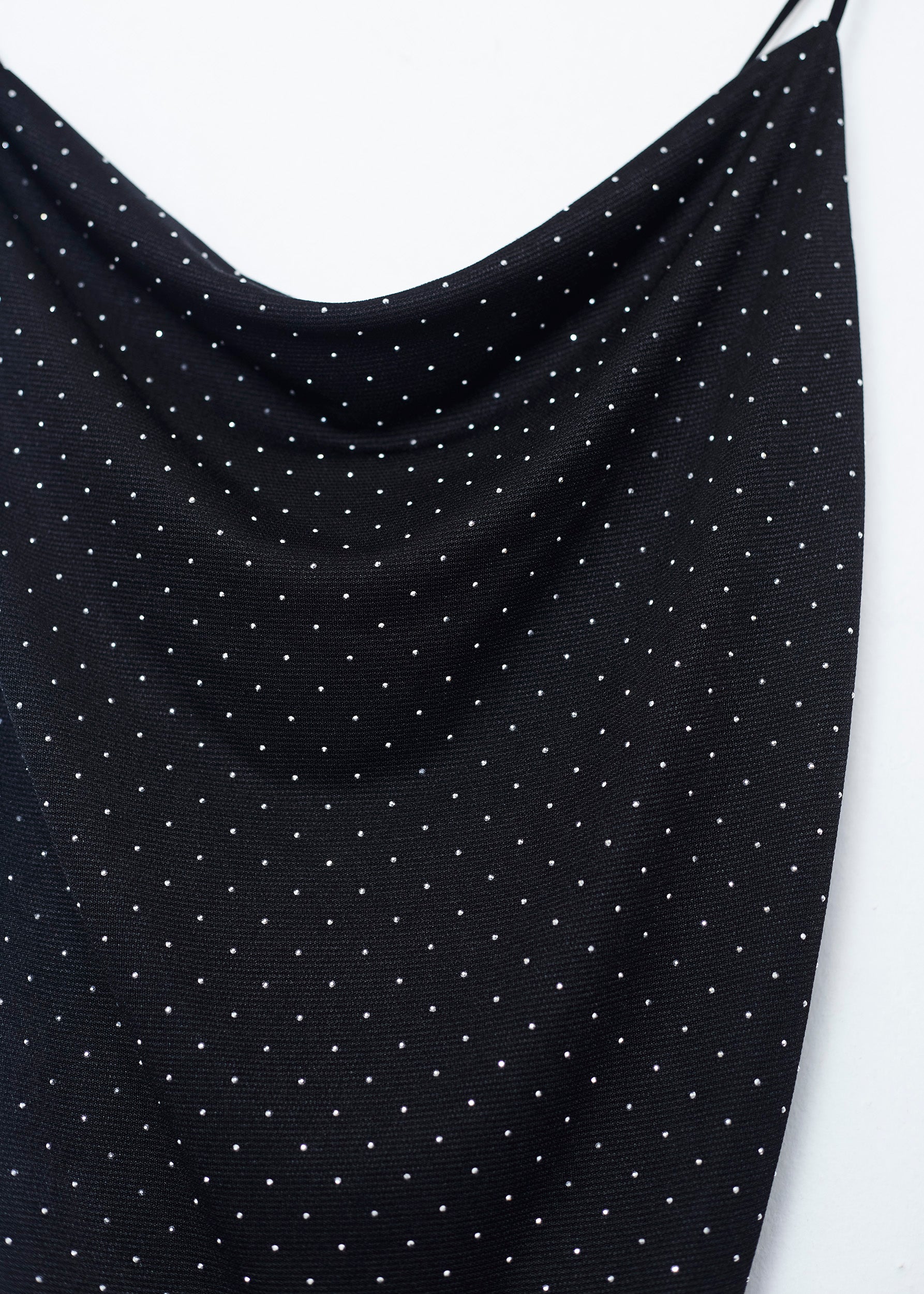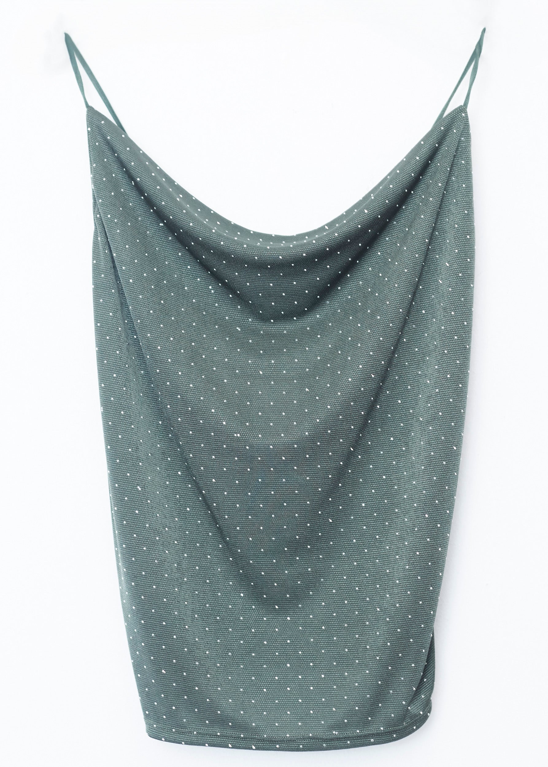 Thin strap top with draped pointed neckline. Fabric with shiny detail.