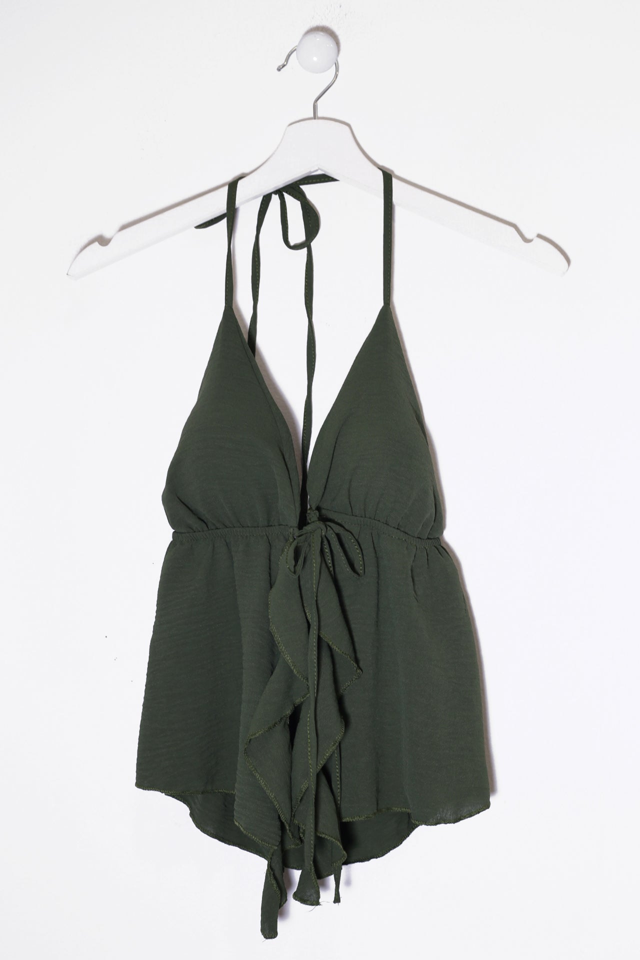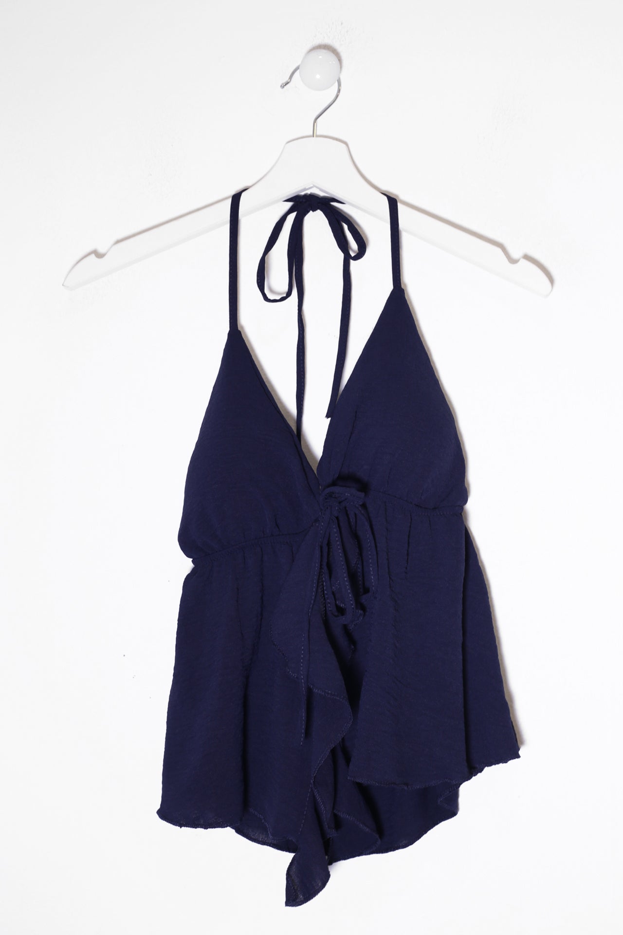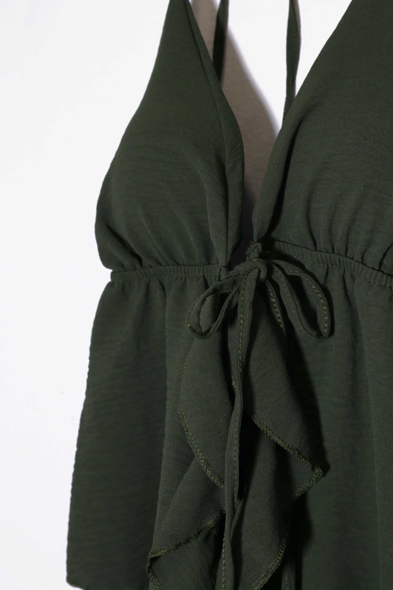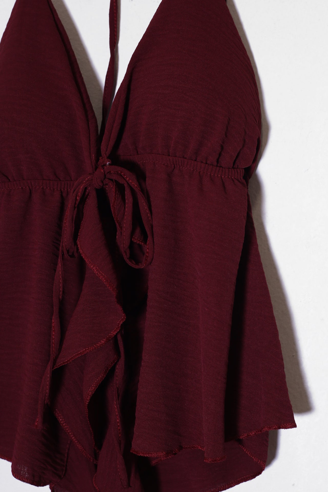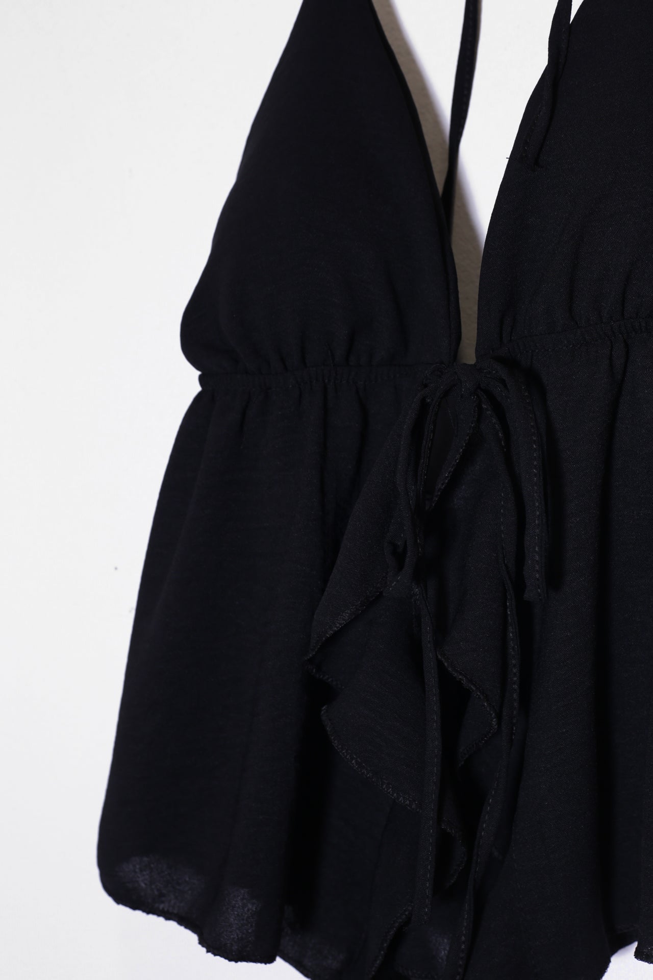 Top con escote en punta delantero, escote pronunciado en espalda y tirantes anudados en el cuello. Cierre frontal anudado con cordón y detalle de volante. Elástico bajo el pecho. Corte fluido.