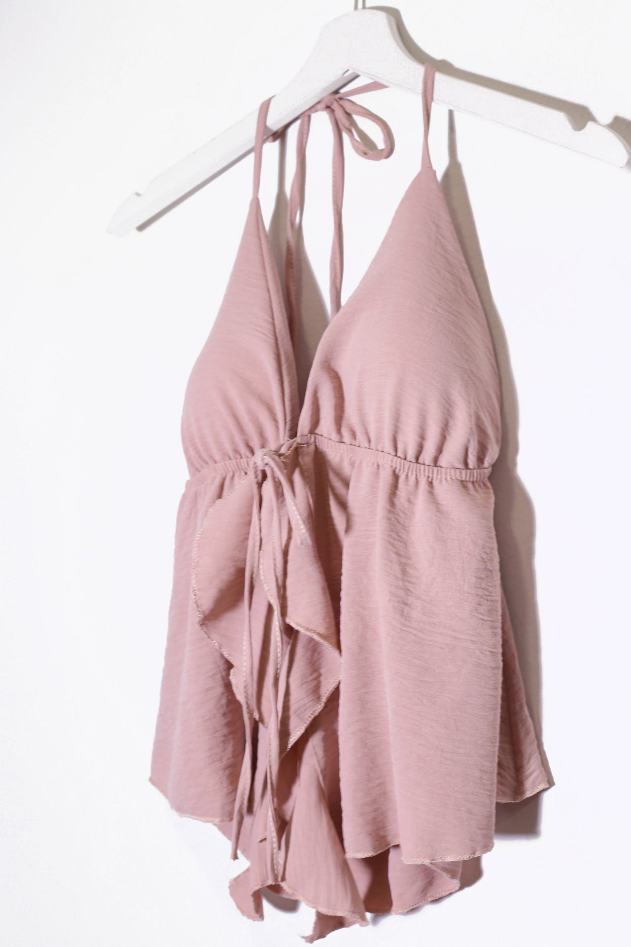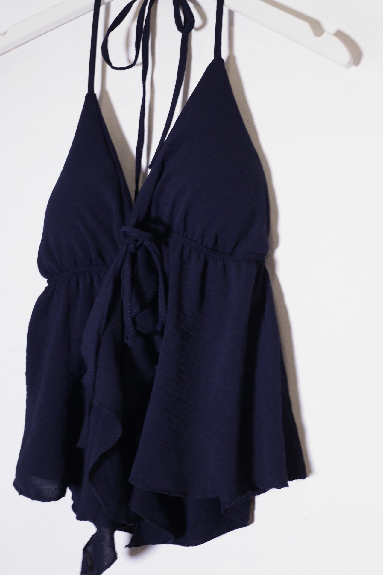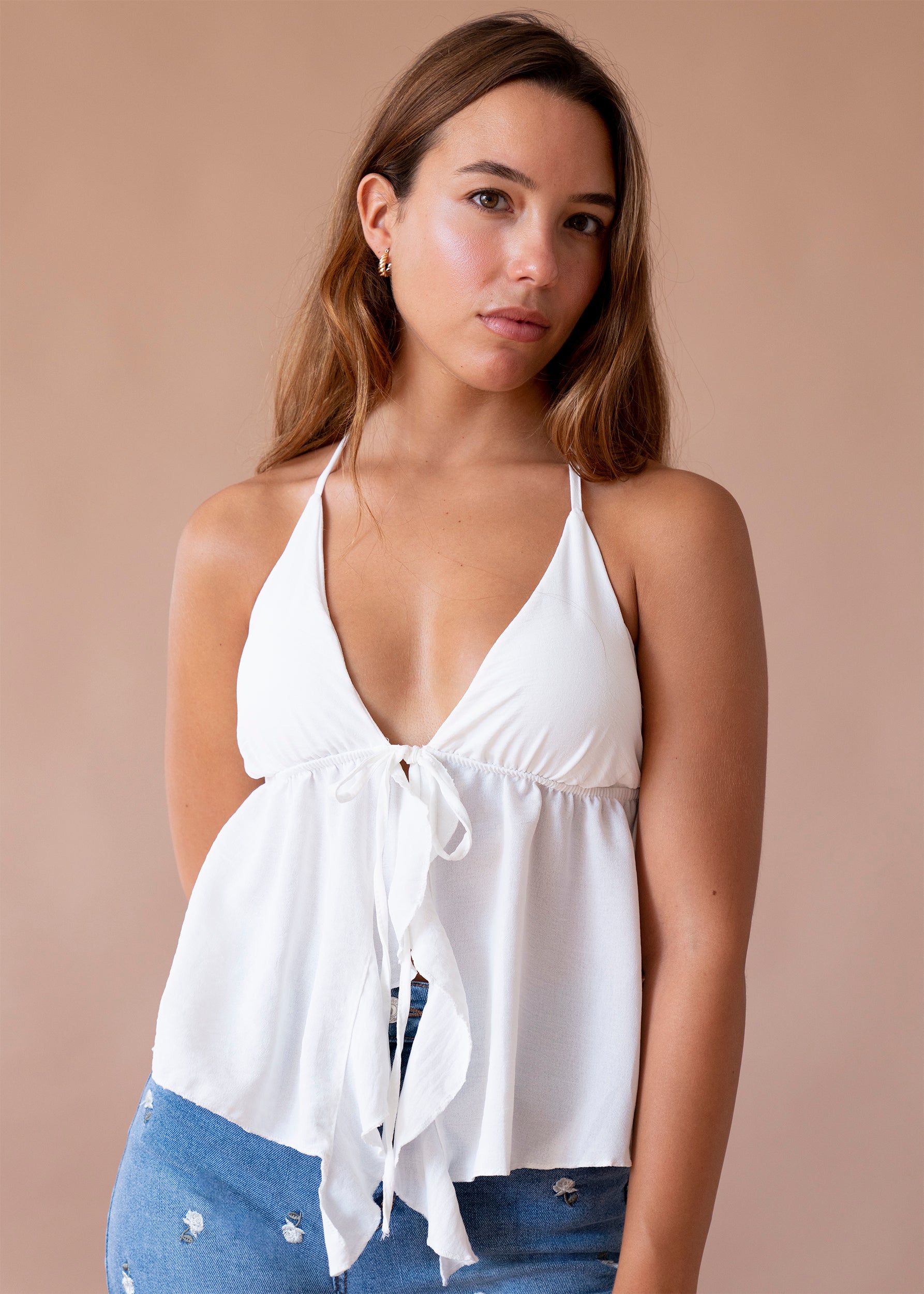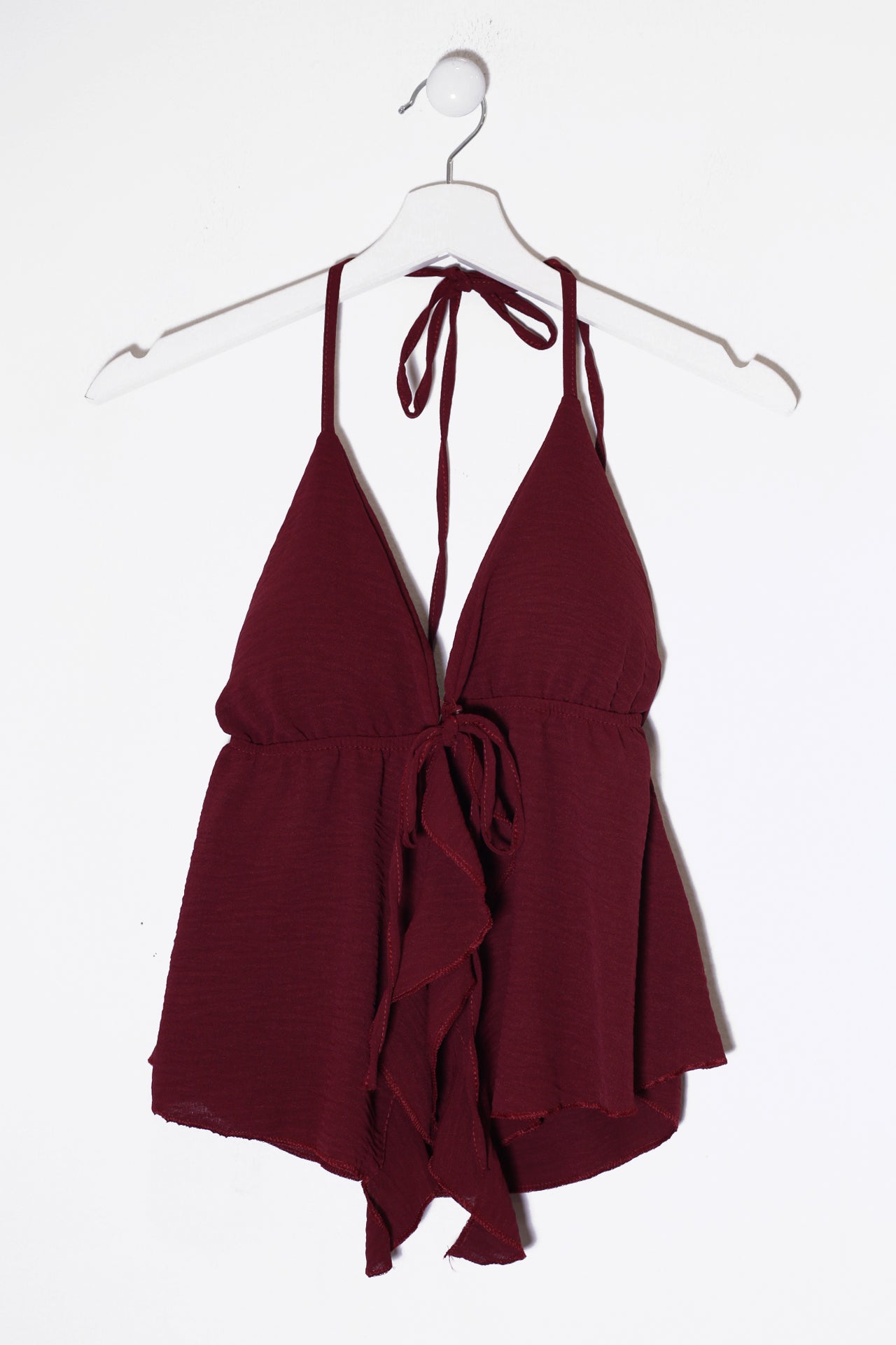 Top con escote en punta delantero, escote pronunciado en espalda y tirantes anudados en el cuello. Cierre frontal anudado con cordón y detalle de volante. Elástico bajo el pecho. Corte fluido.