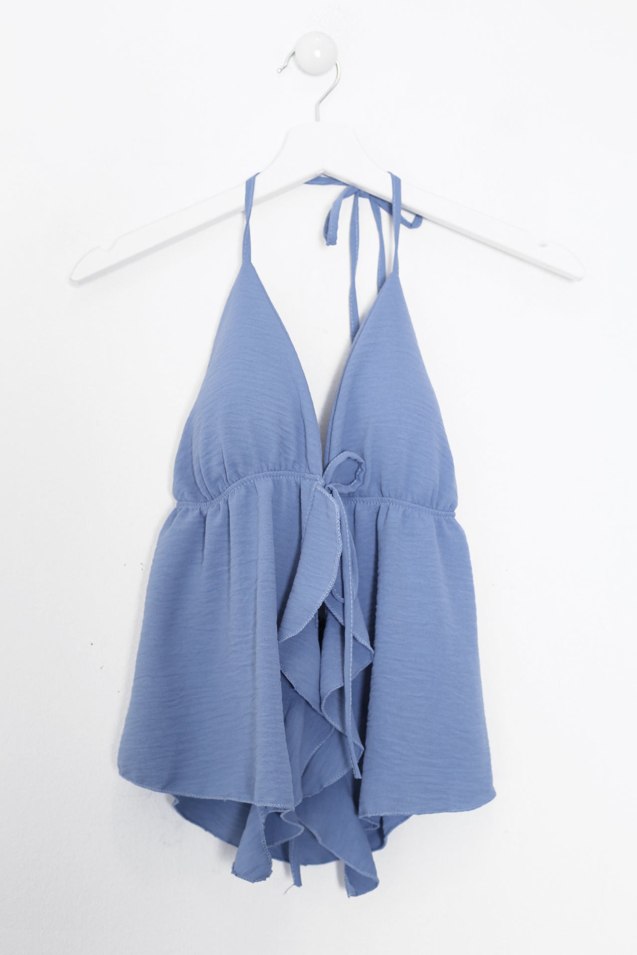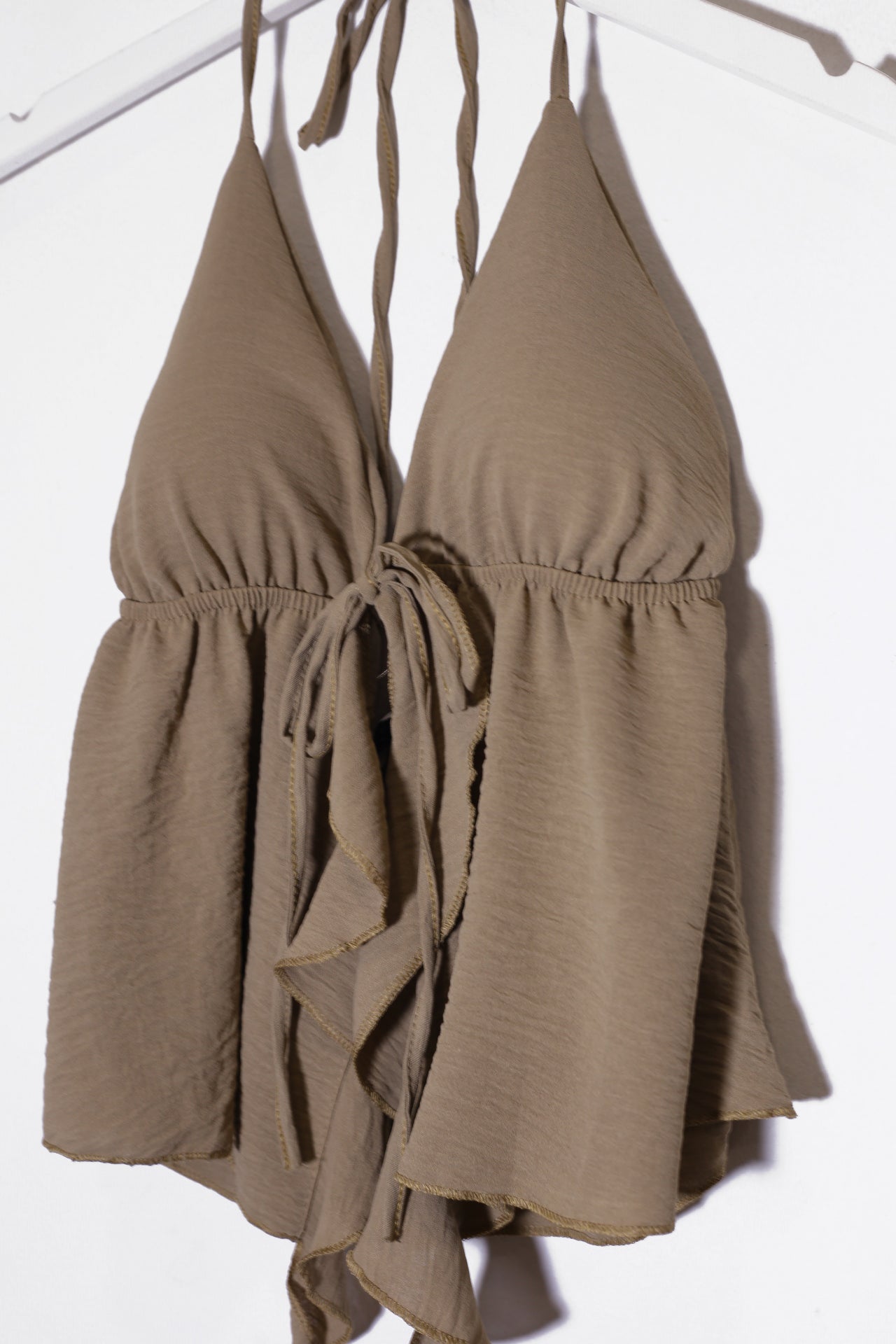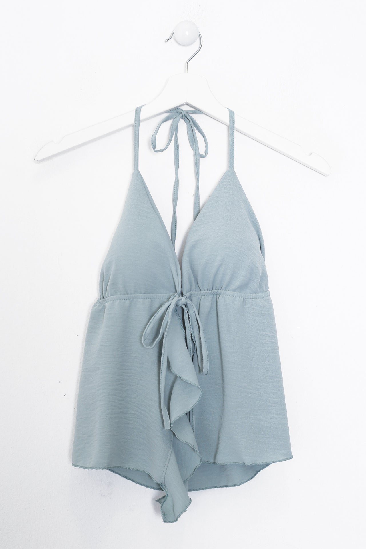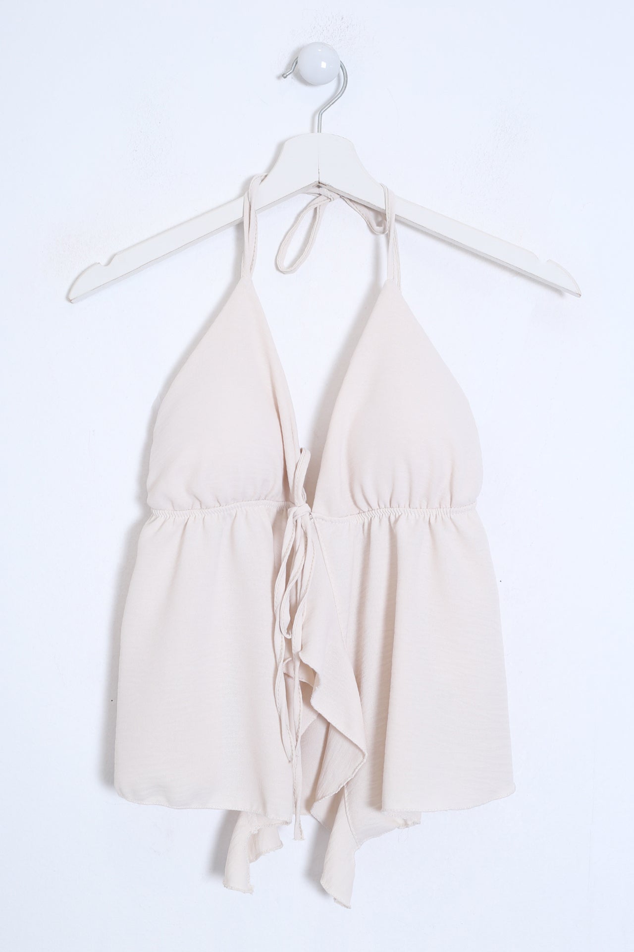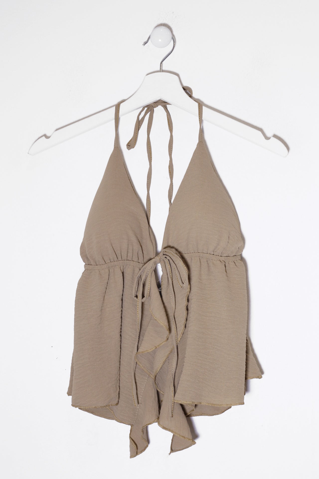 Top con escote en punta delantero, escote pronunciado en espalda y tirantes anudados en el cuello. Cierre frontal anudado con cordón y detalle de volante. Elástico bajo el pecho. Corte fluido.