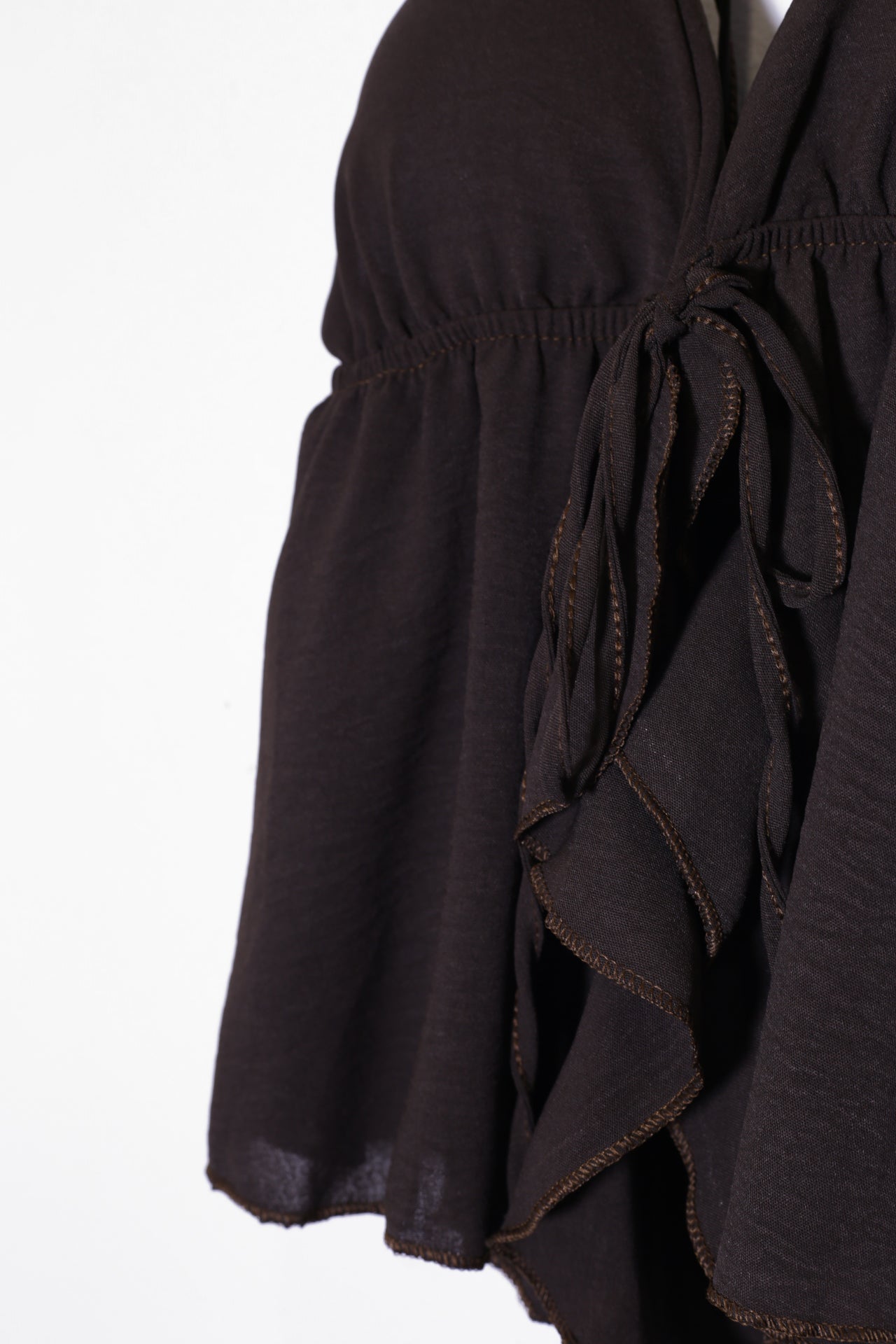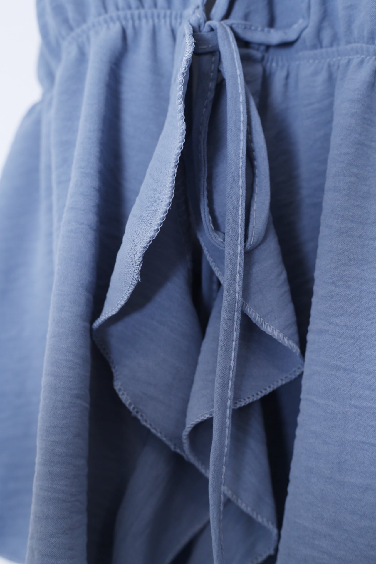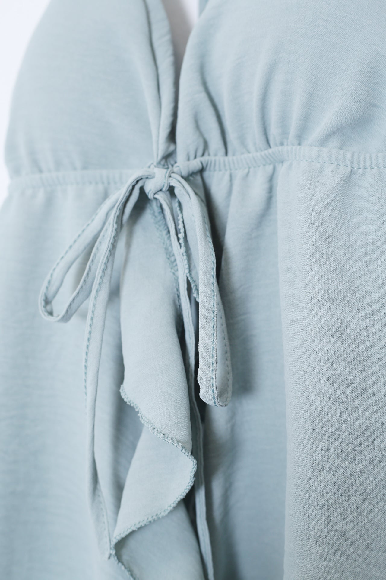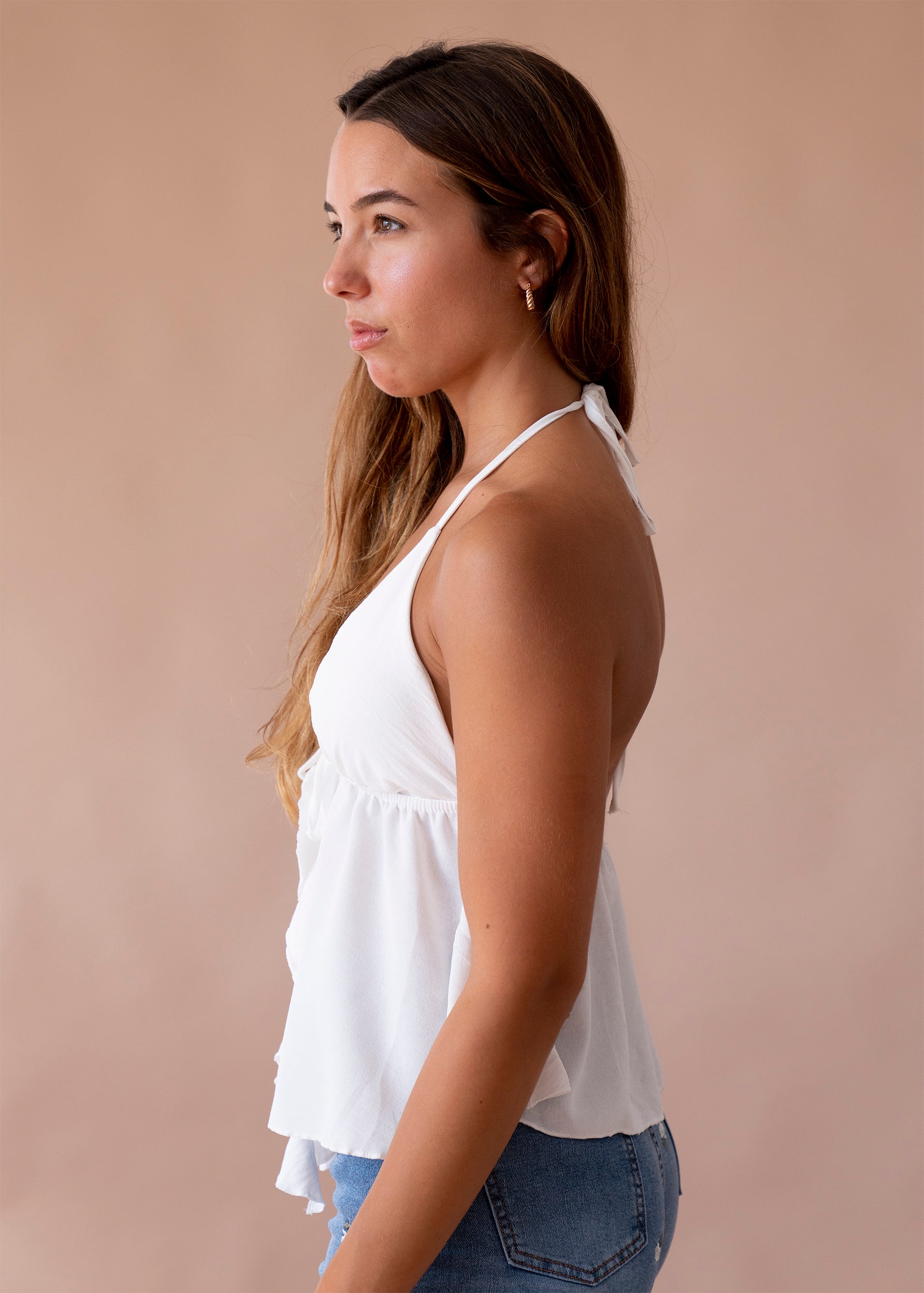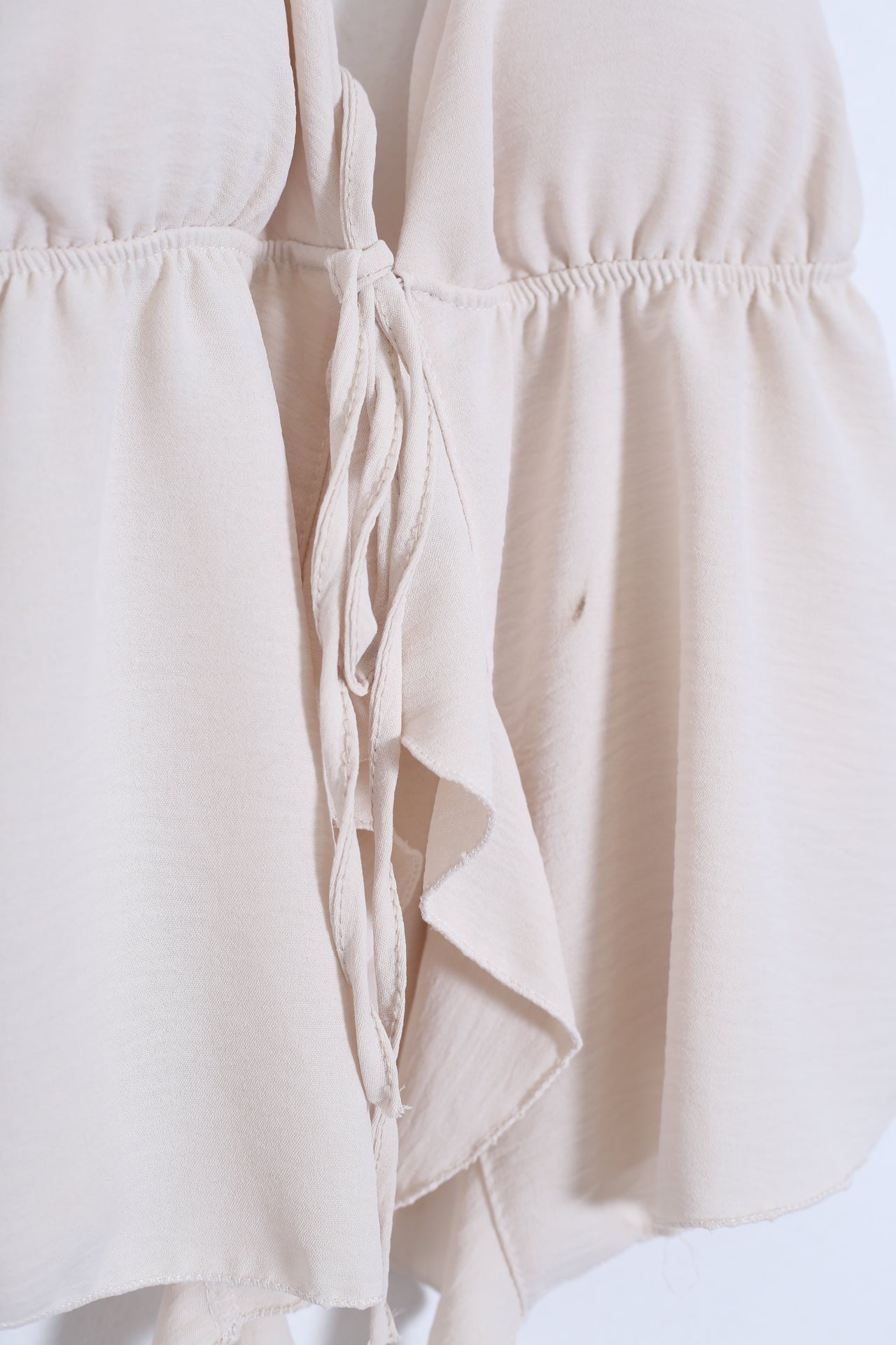 Top con escote en punta delantero, escote pronunciado en espalda y tirantes anudados en el cuello. Cierre frontal anudado con cordón y detalle de volante. Elástico bajo el pecho. Corte fluido.