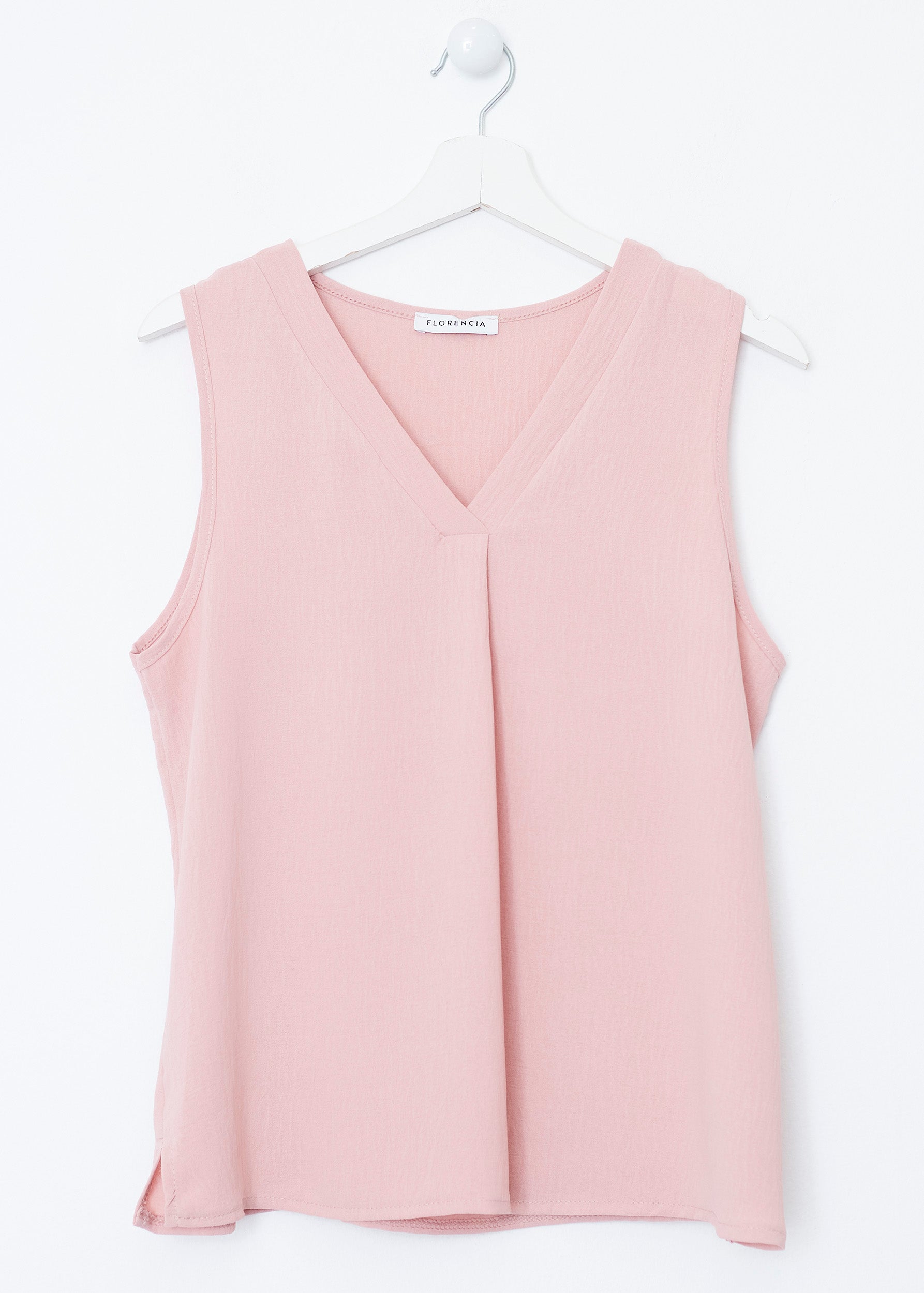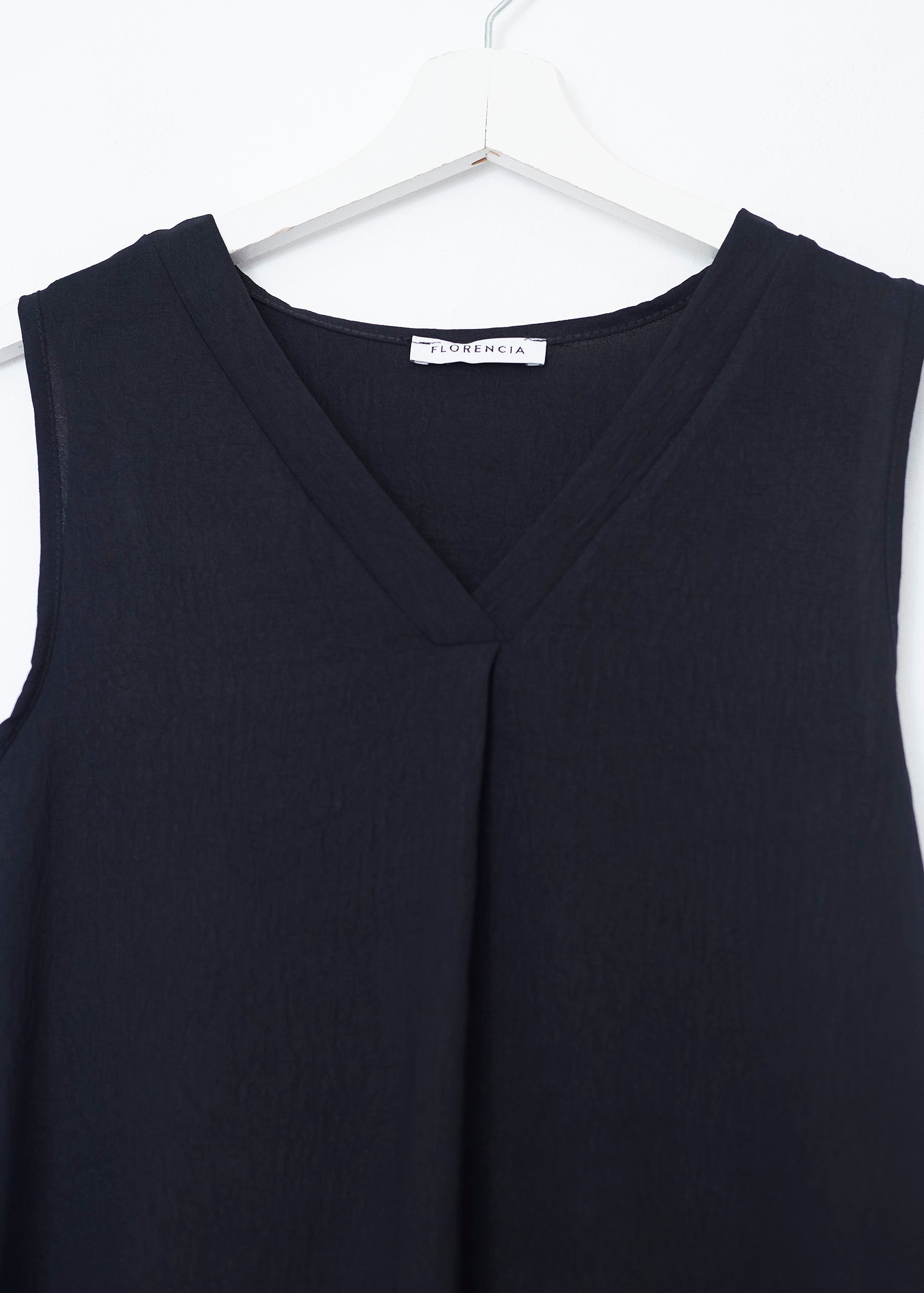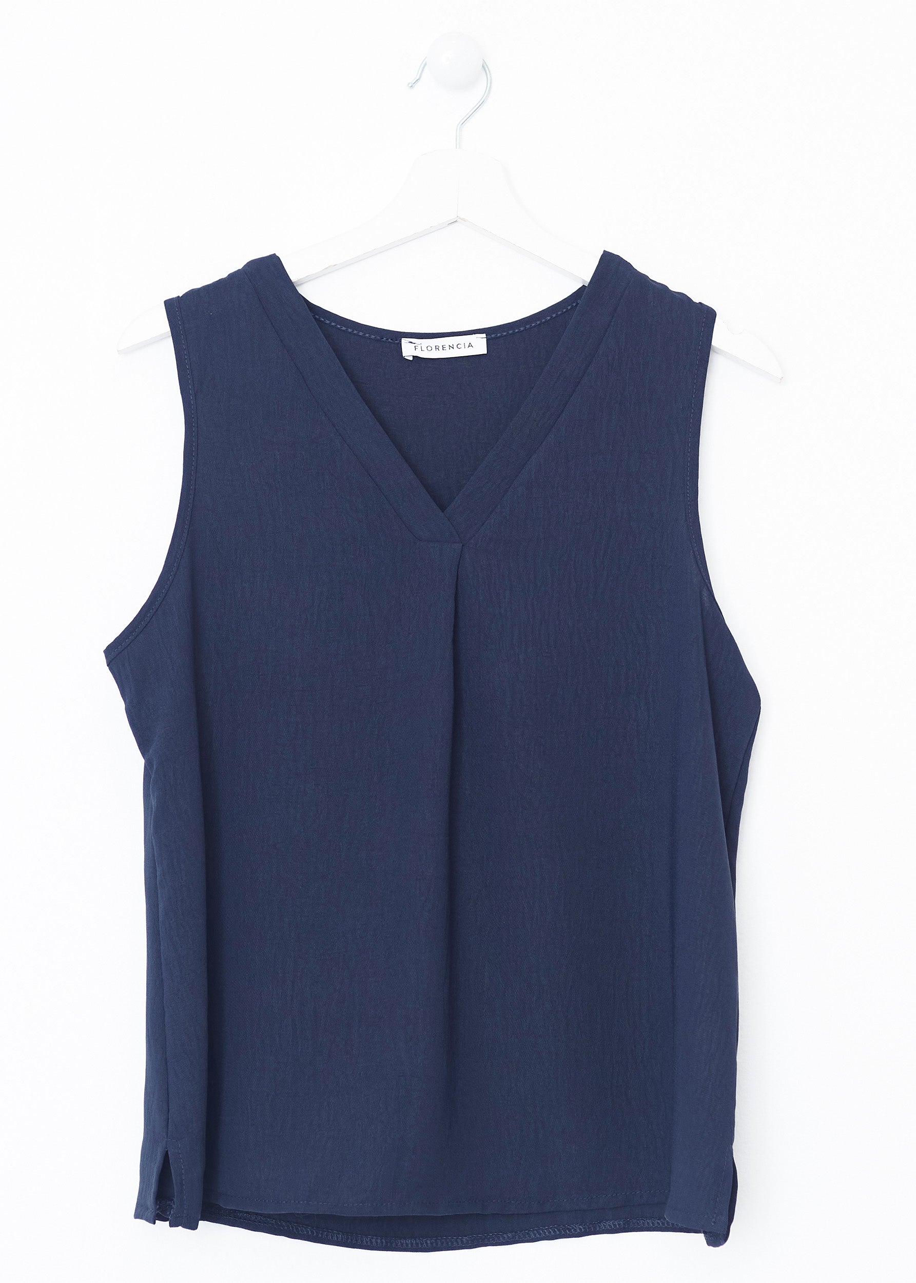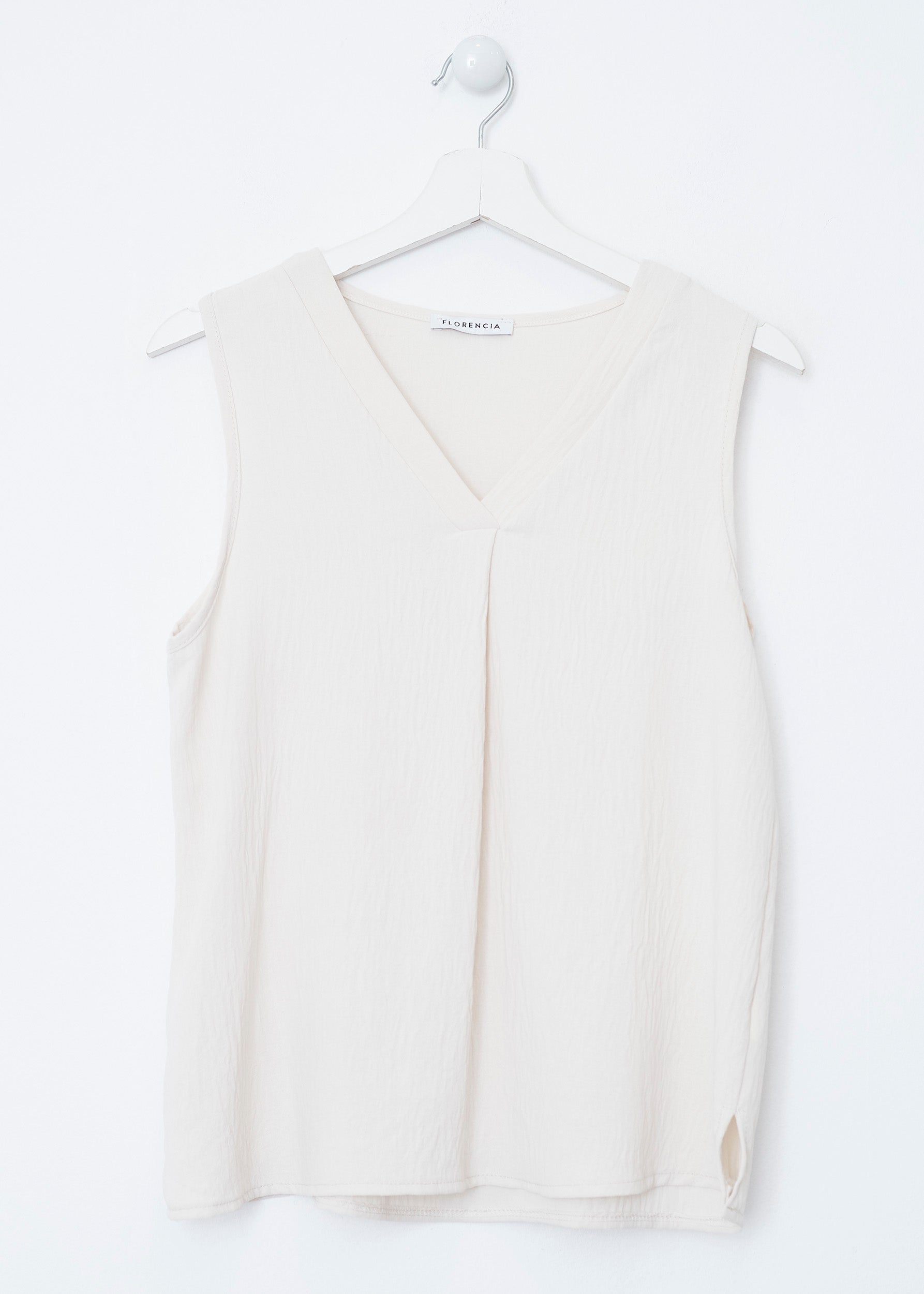 Flowy top with wide straps and pointed neckline. Finished with side slits. Pleated detail on neckline.