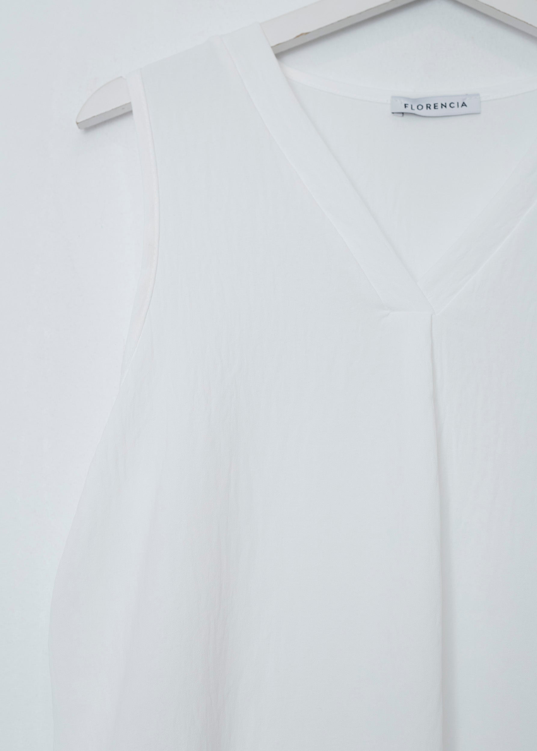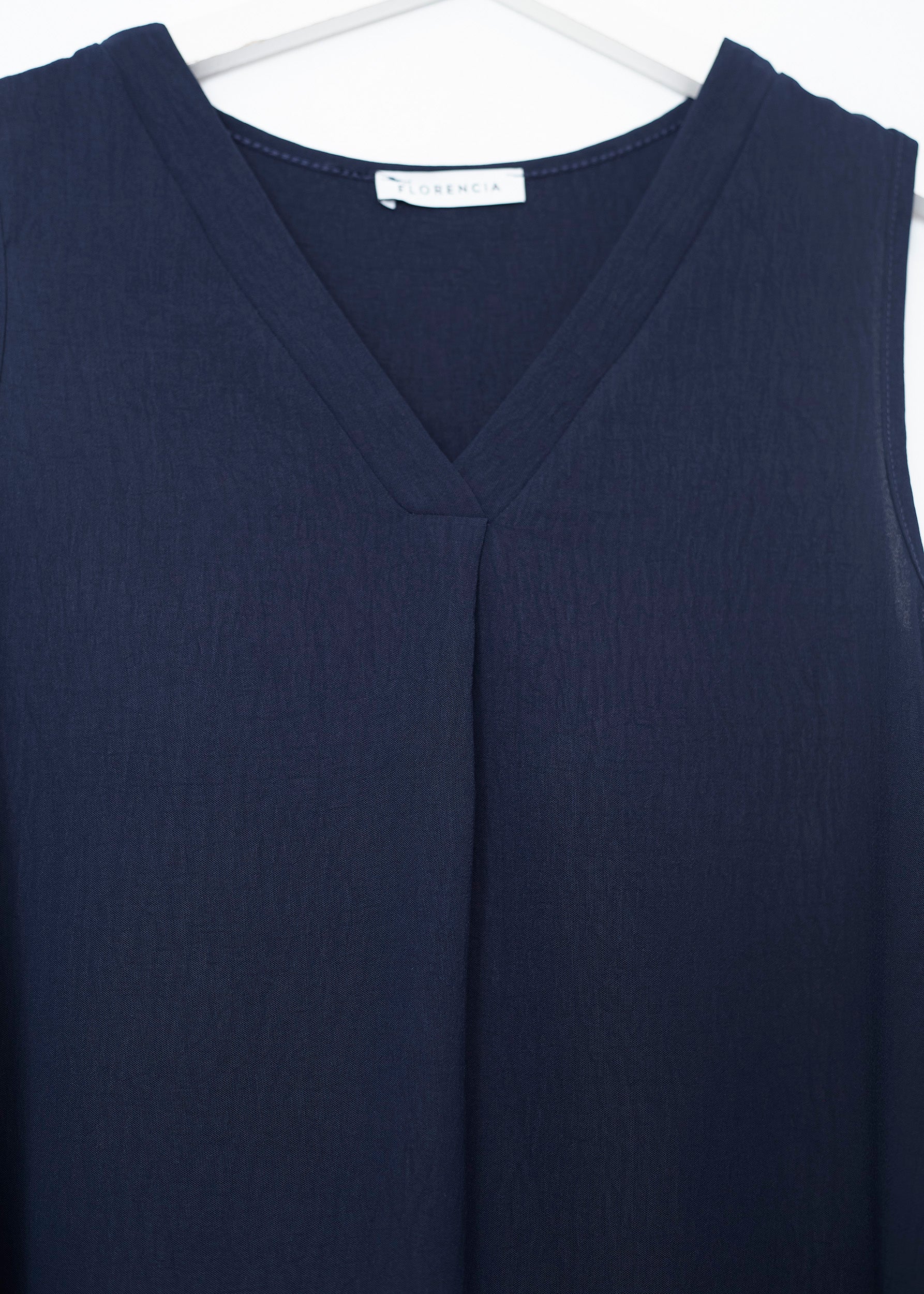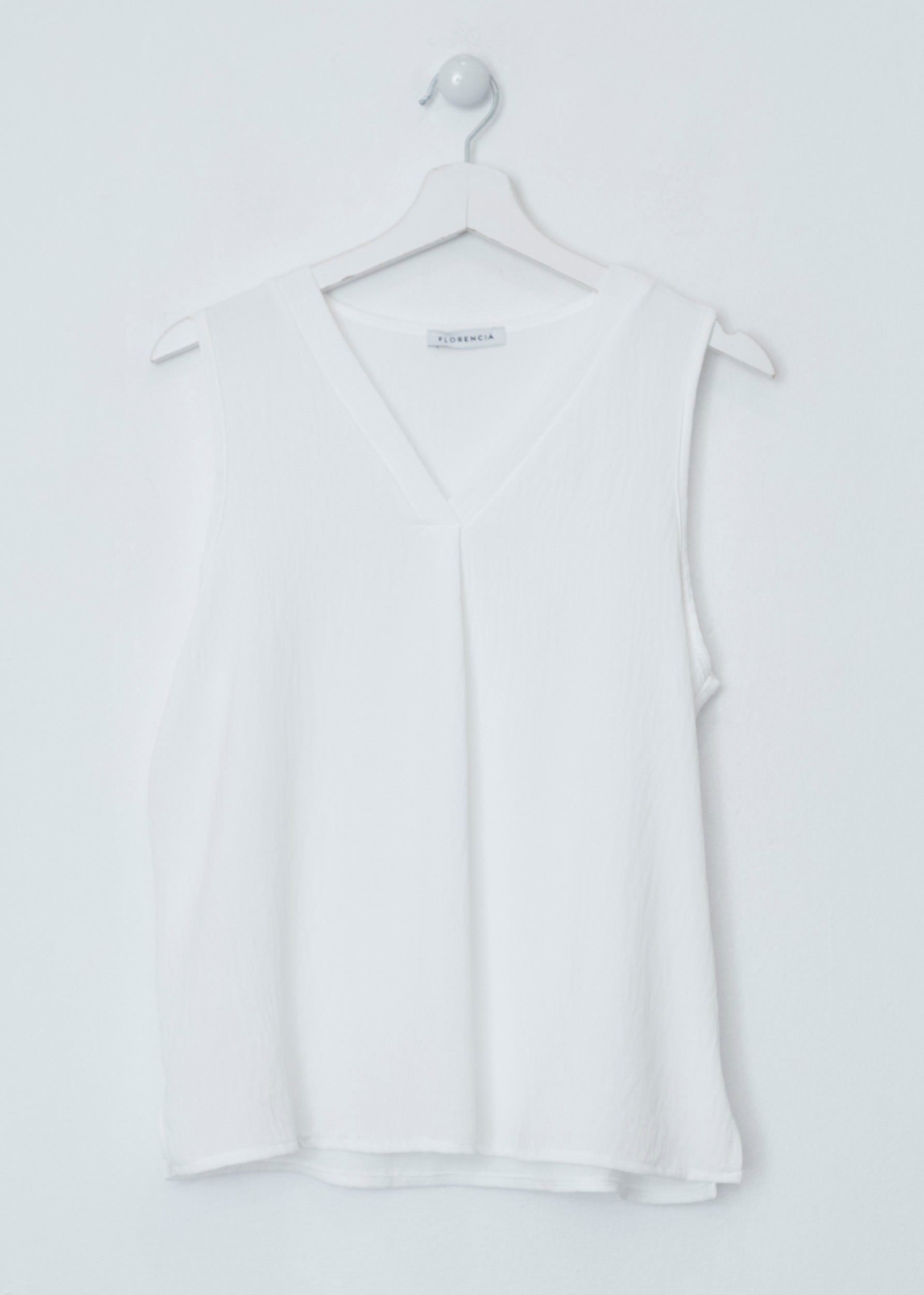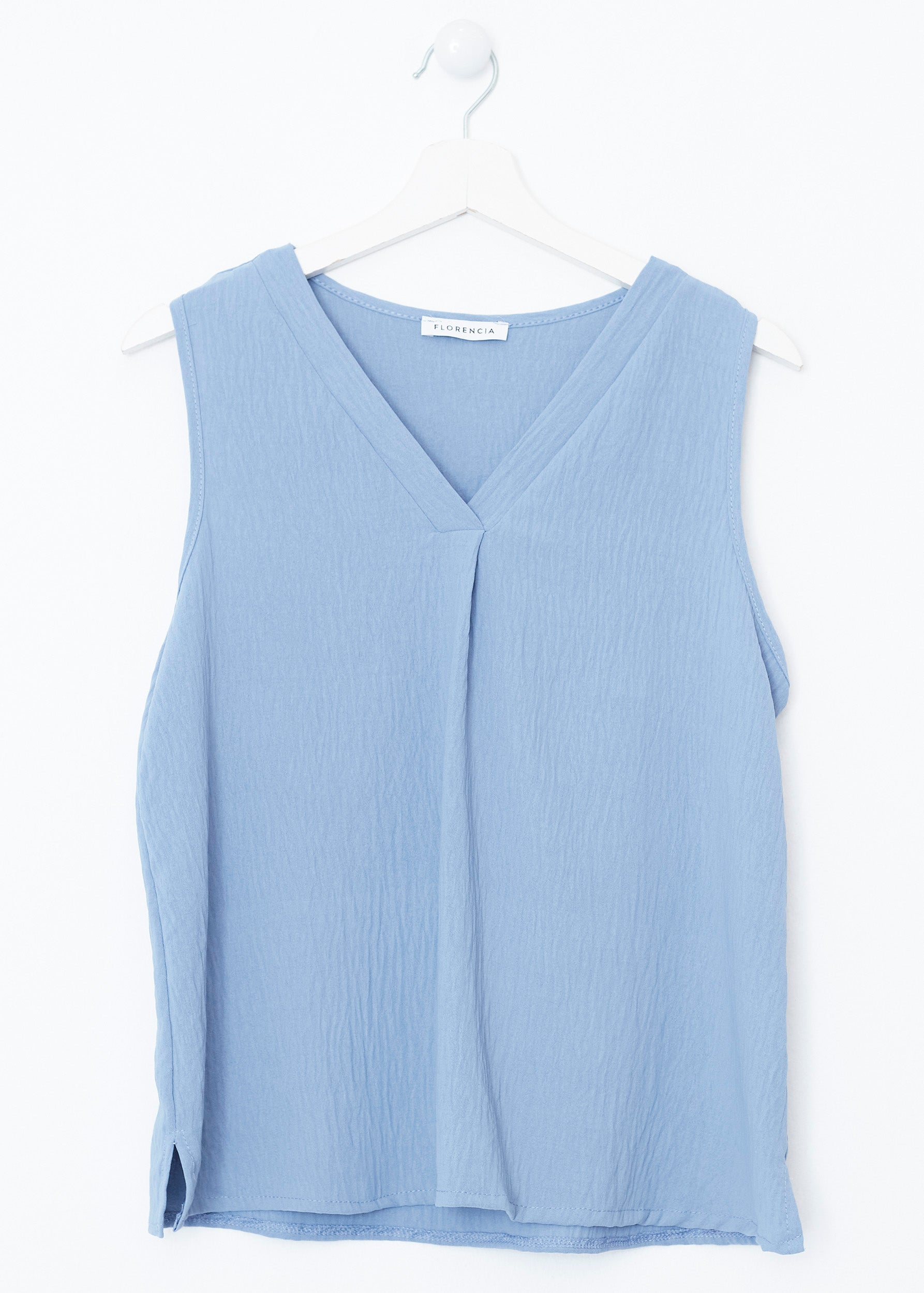 Flowy top with wide straps and pointed neckline. Finished with side slits. Pleated detail on neckline.