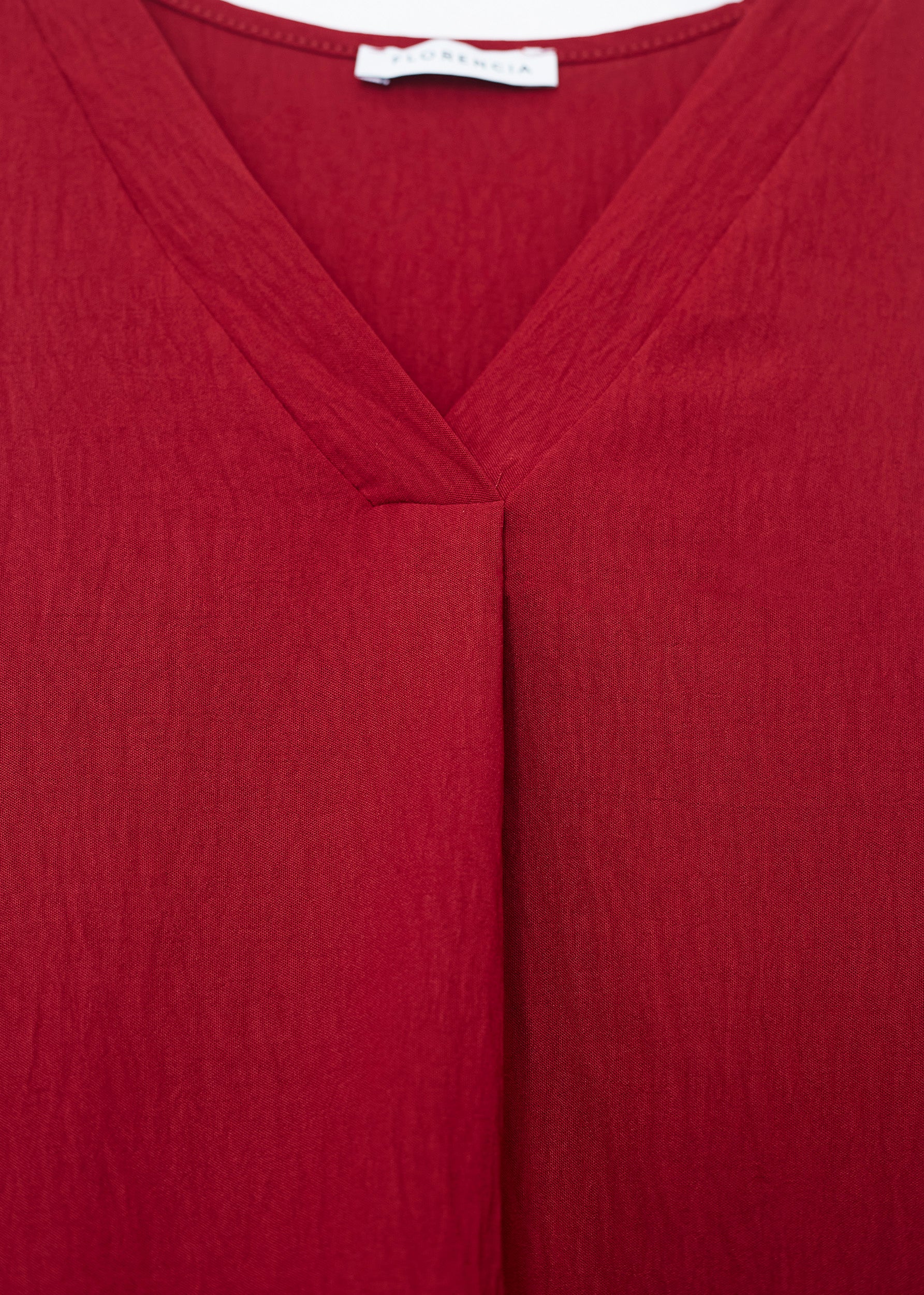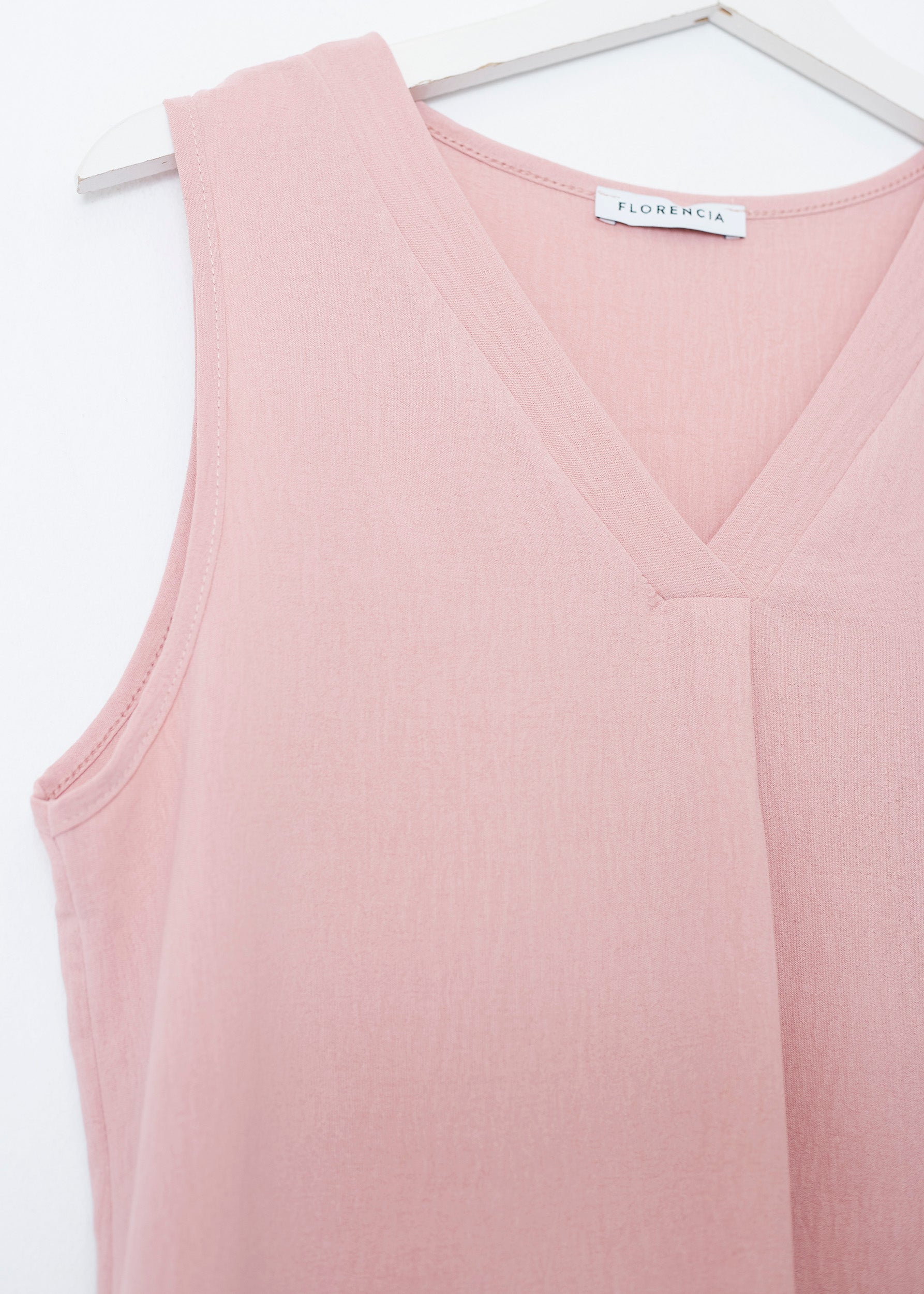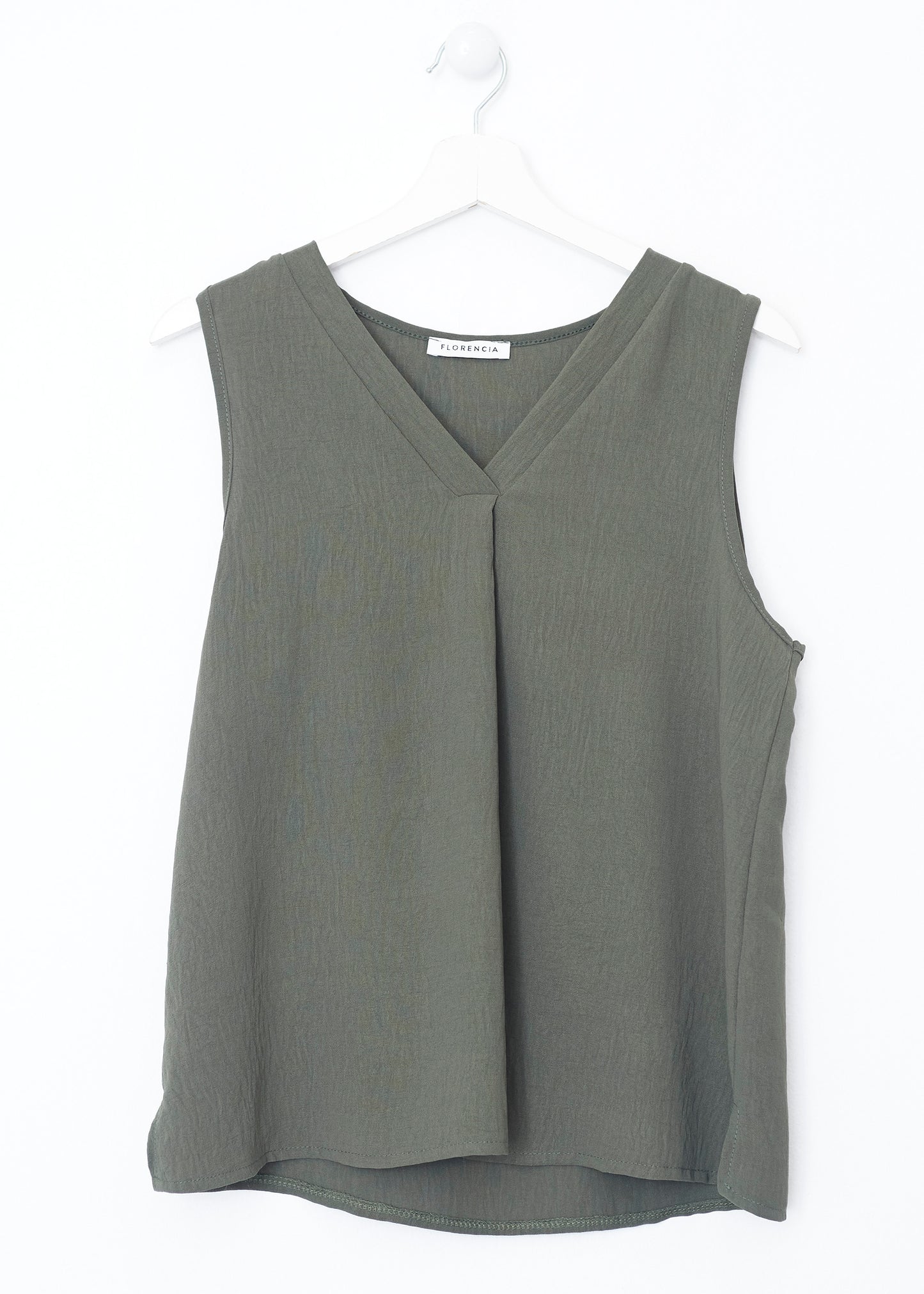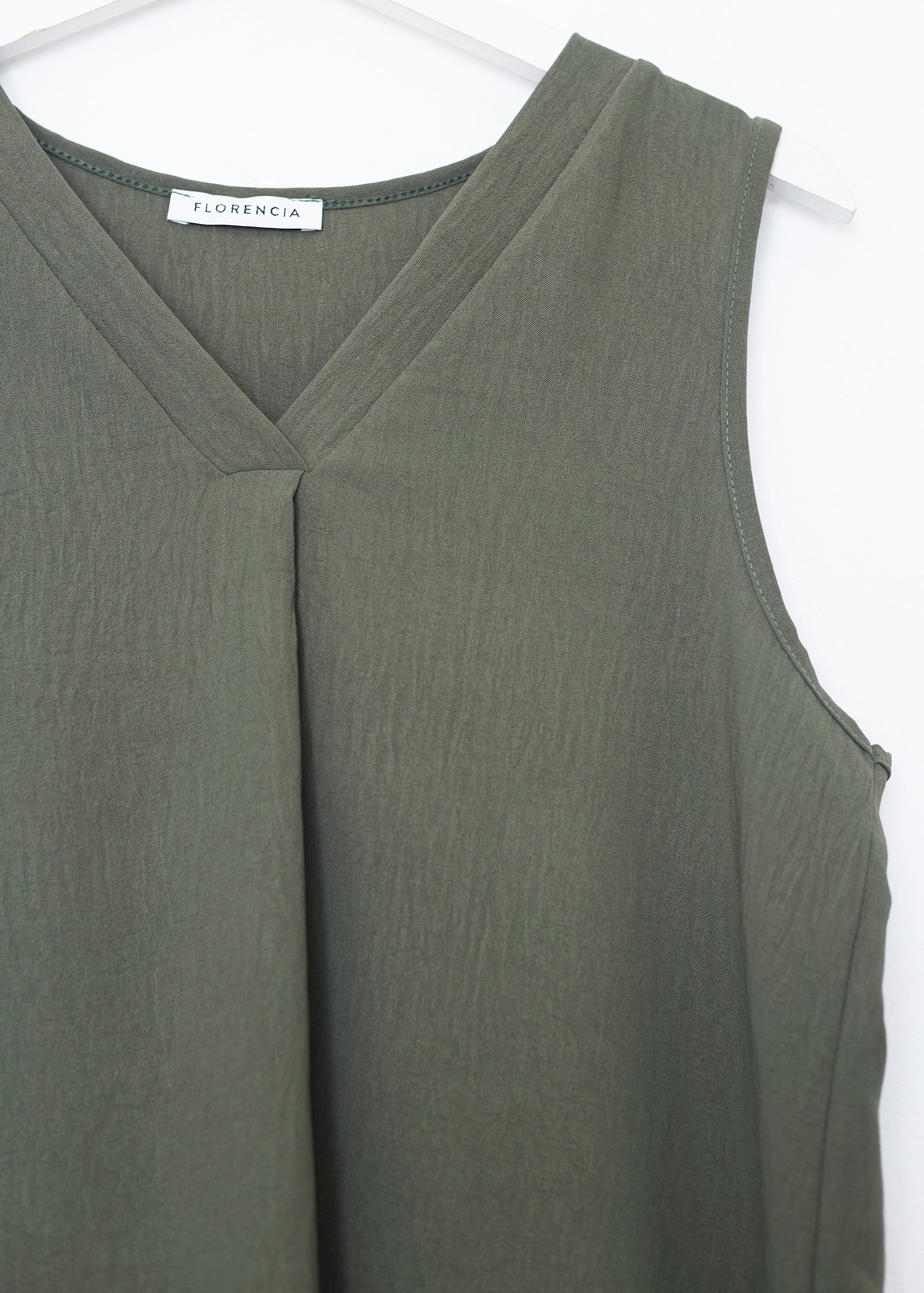 Flowy top with wide straps and pointed neckline. Finished with side slits. Pleated detail on neckline.