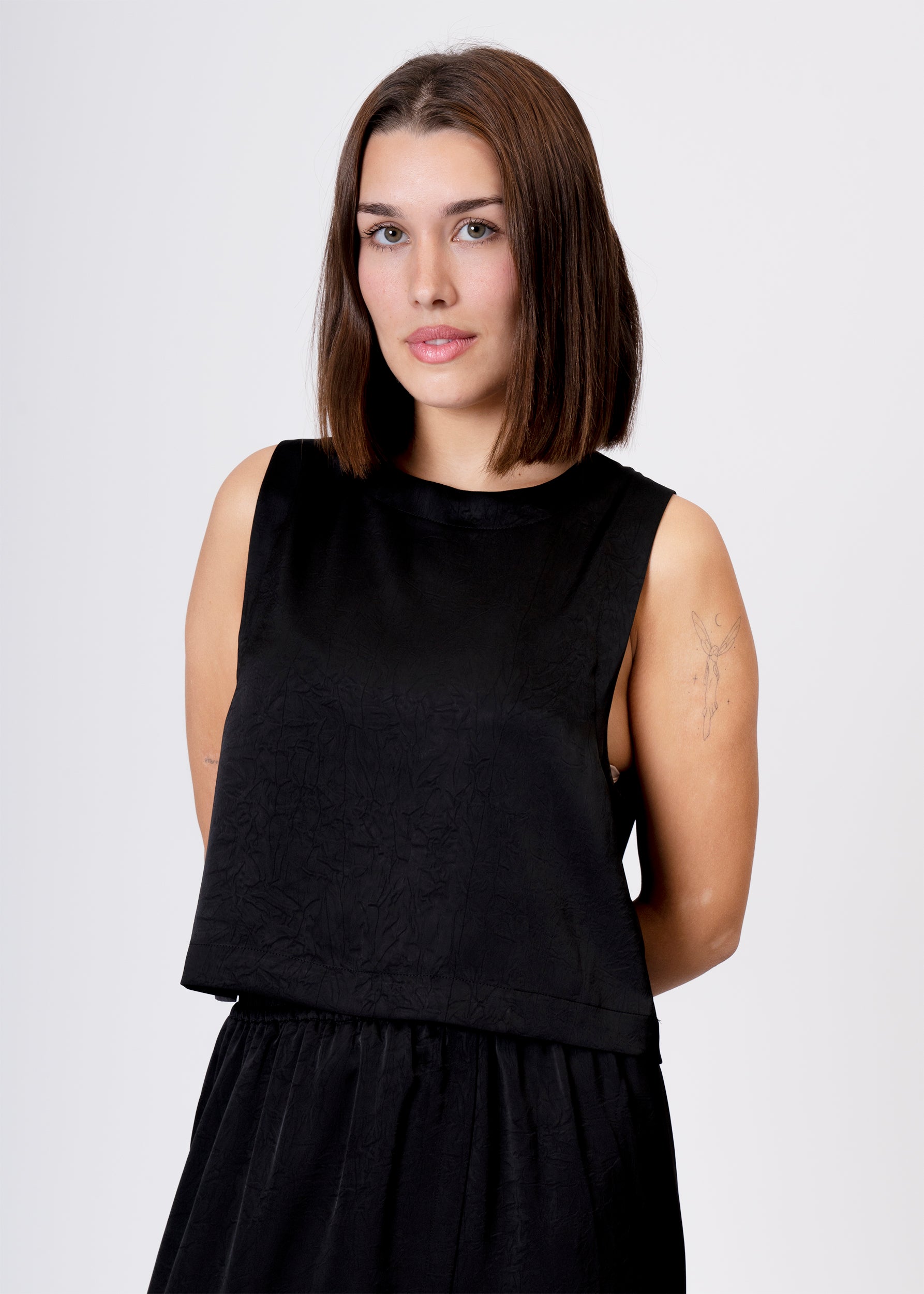 Top with wide sleeves and round neck. Double-cuffed finish. Button closure at the back.