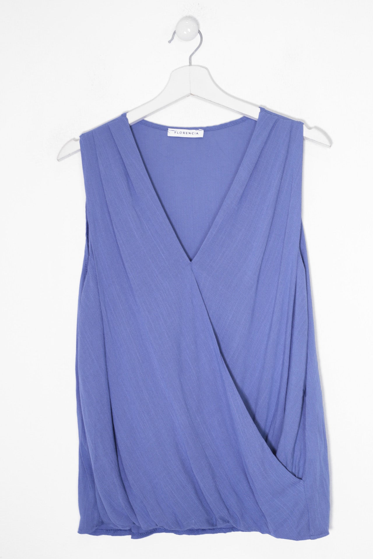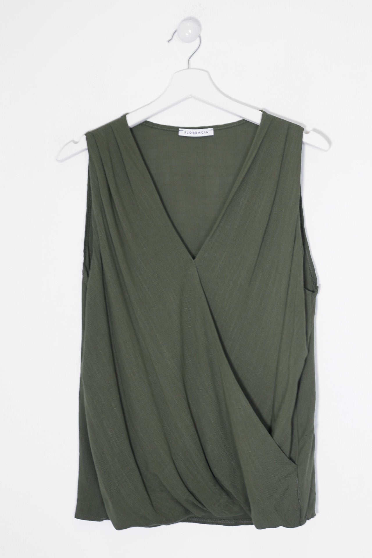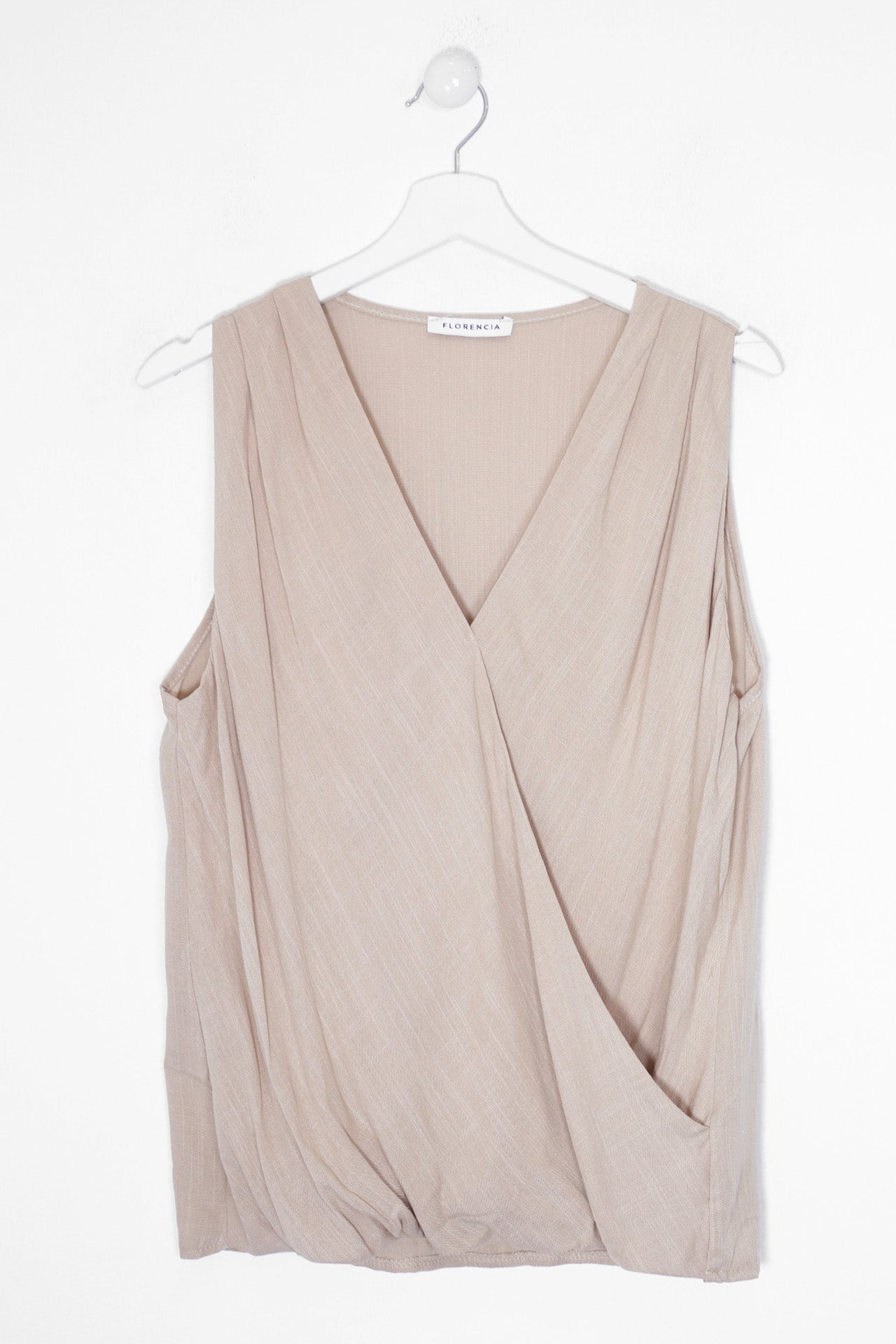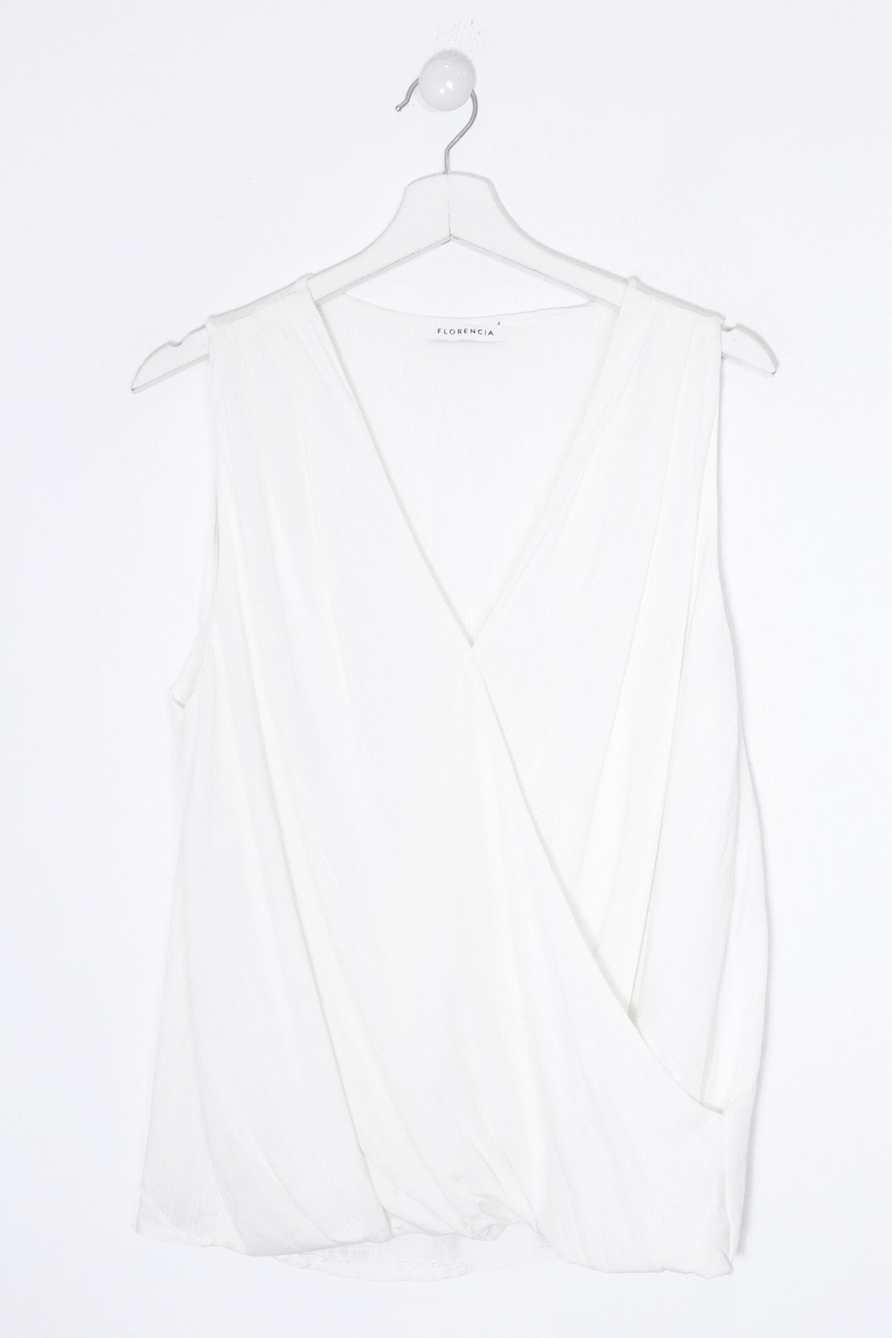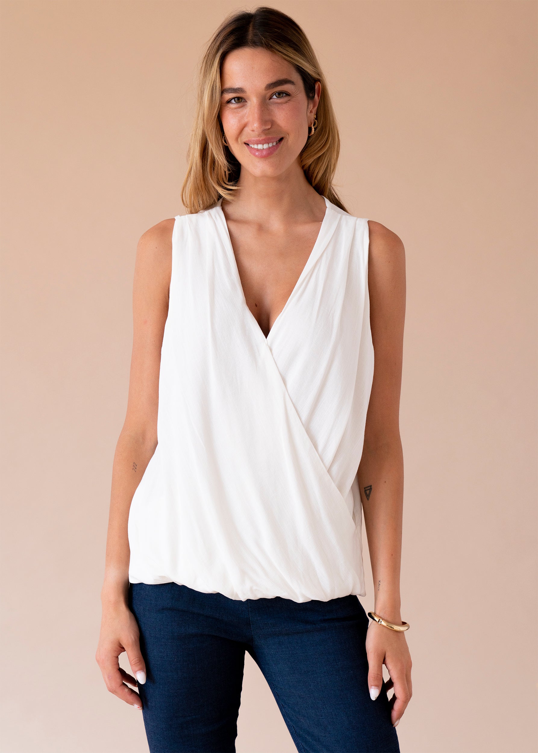 Top sin mangas con escote en punta cruzado. Detalle frontal drapeado. Tejido ligeramente texturado.