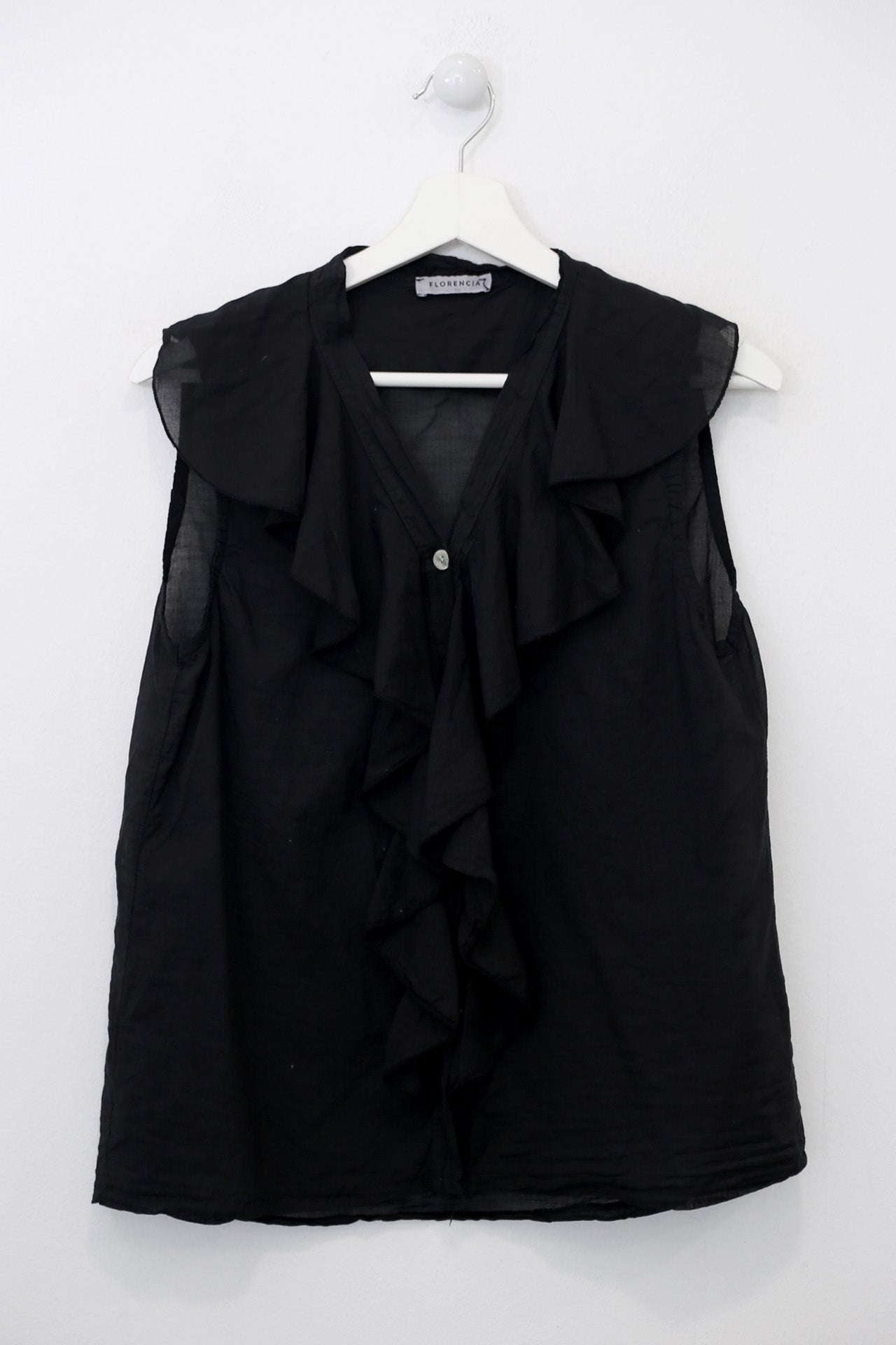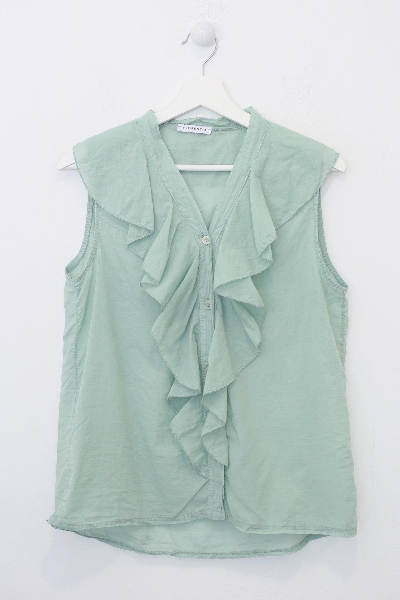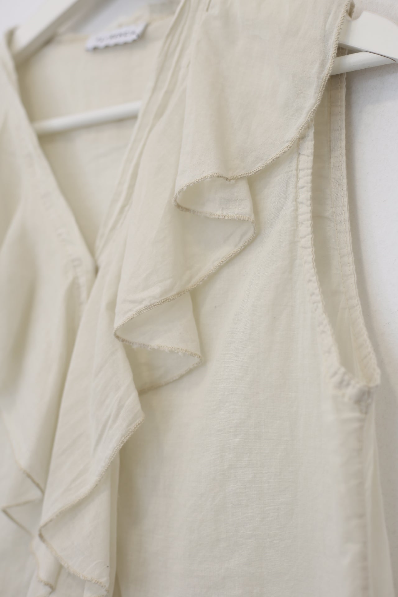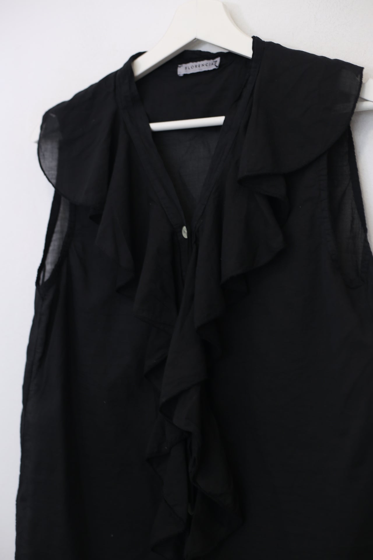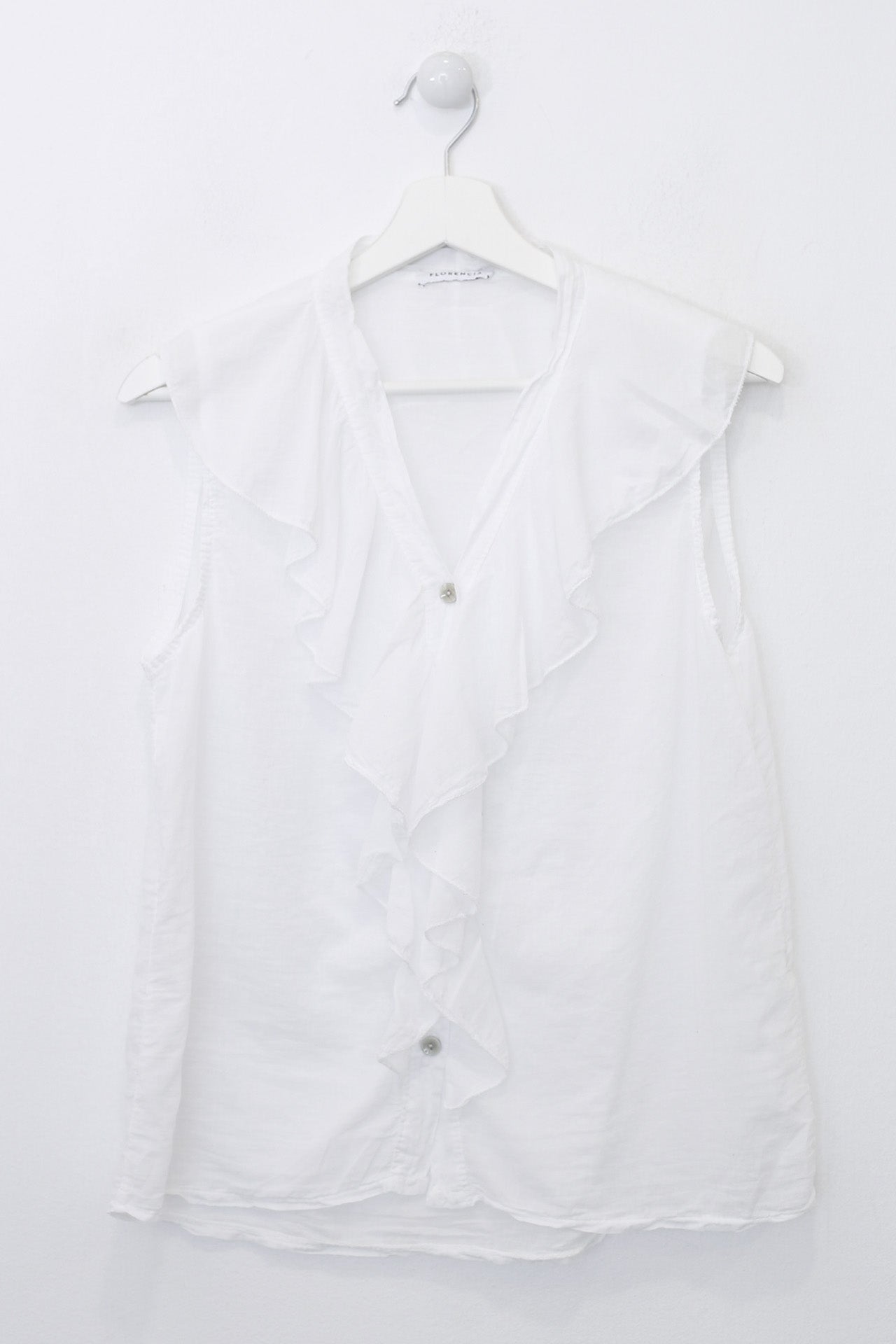 Blusa sin mangas de cuello en punta con detalle de volantes. Cierre frontal abotonado. Corte holgado.
