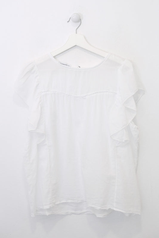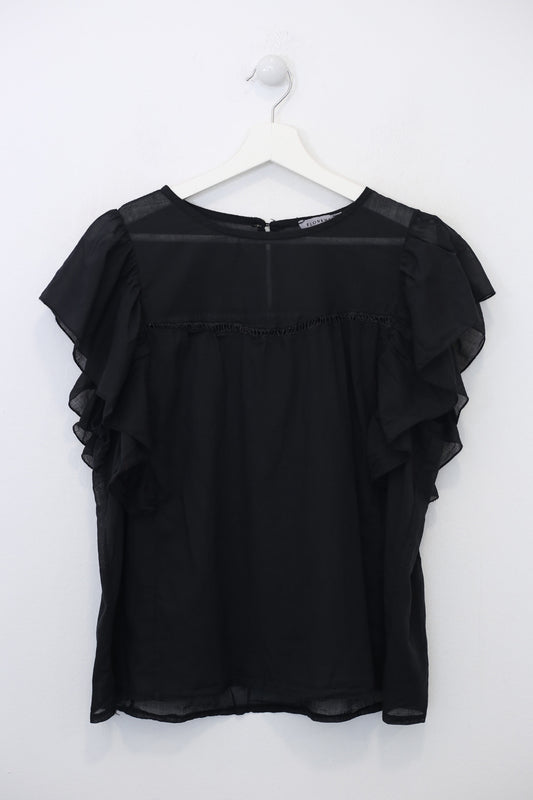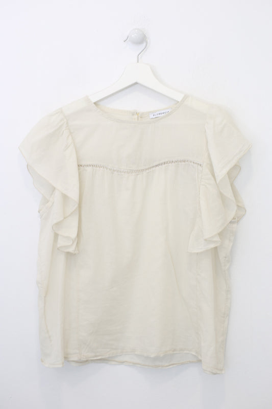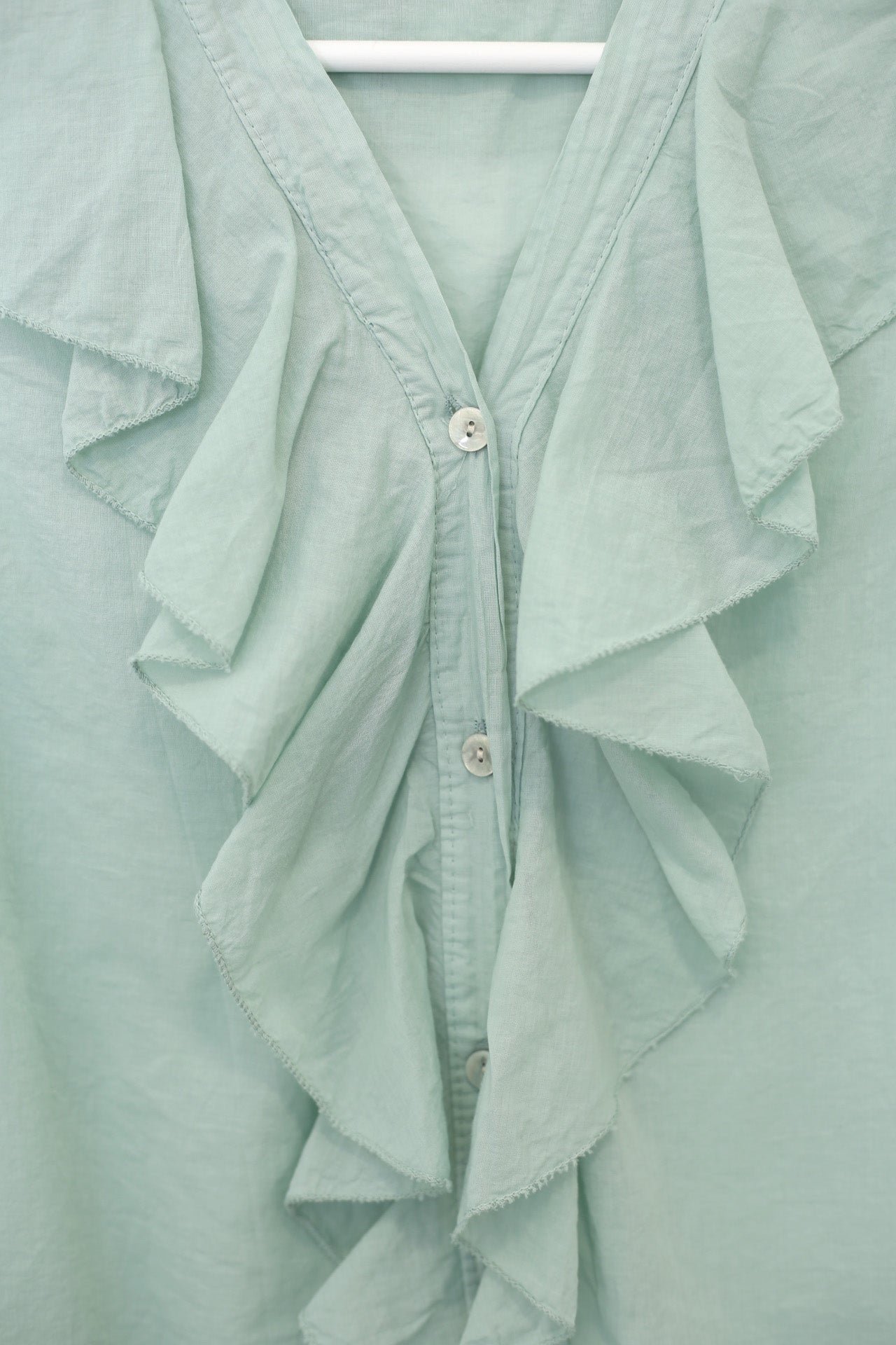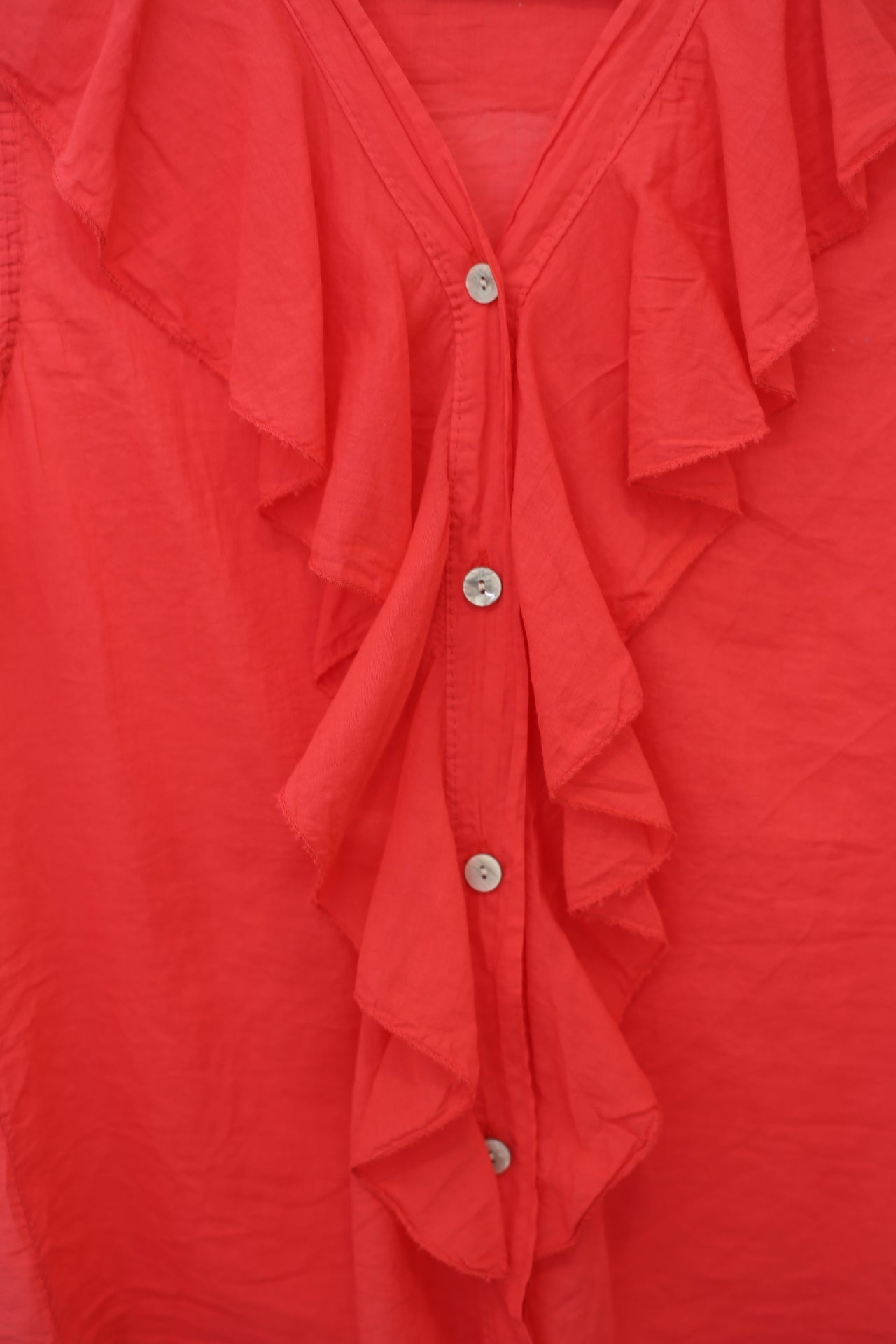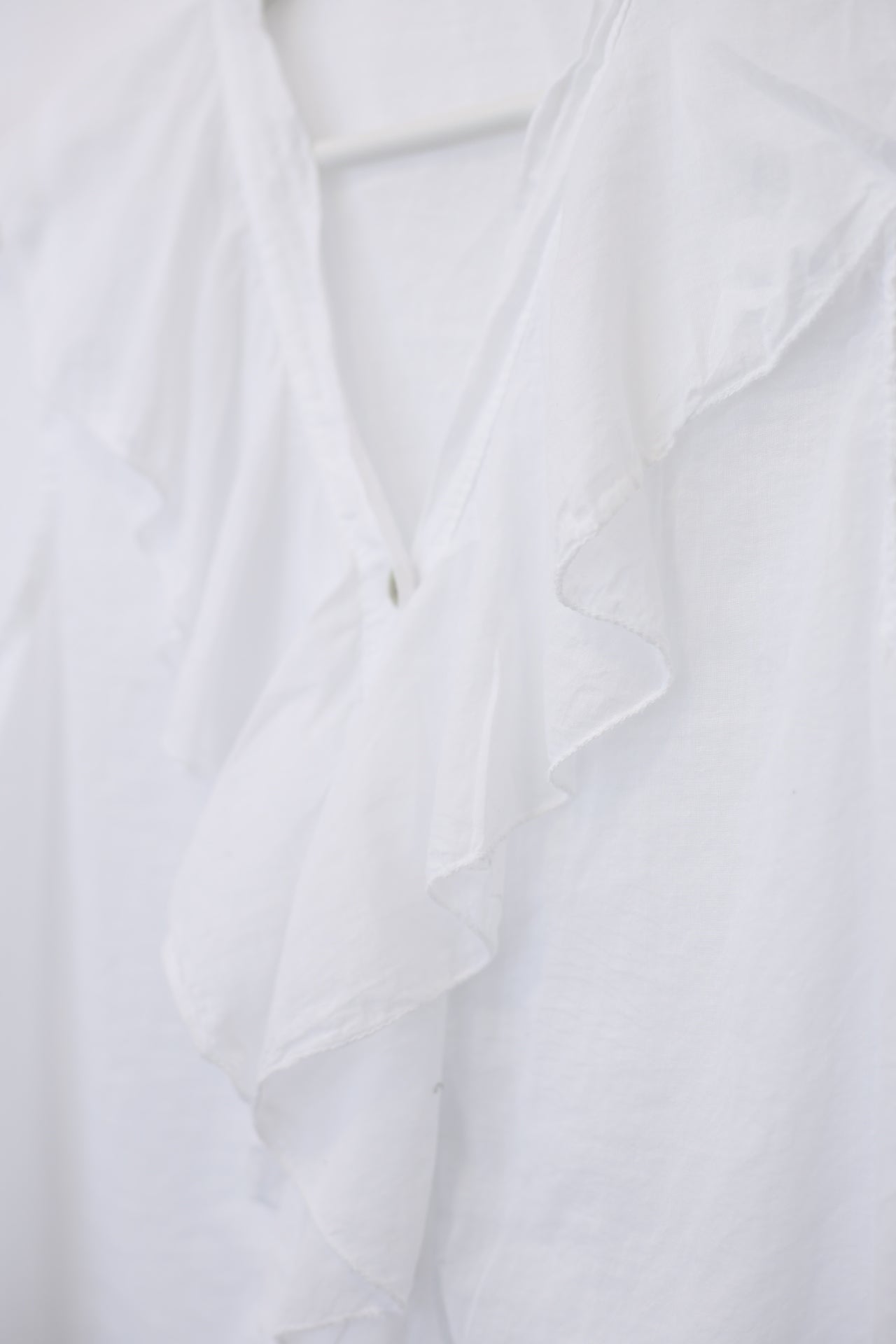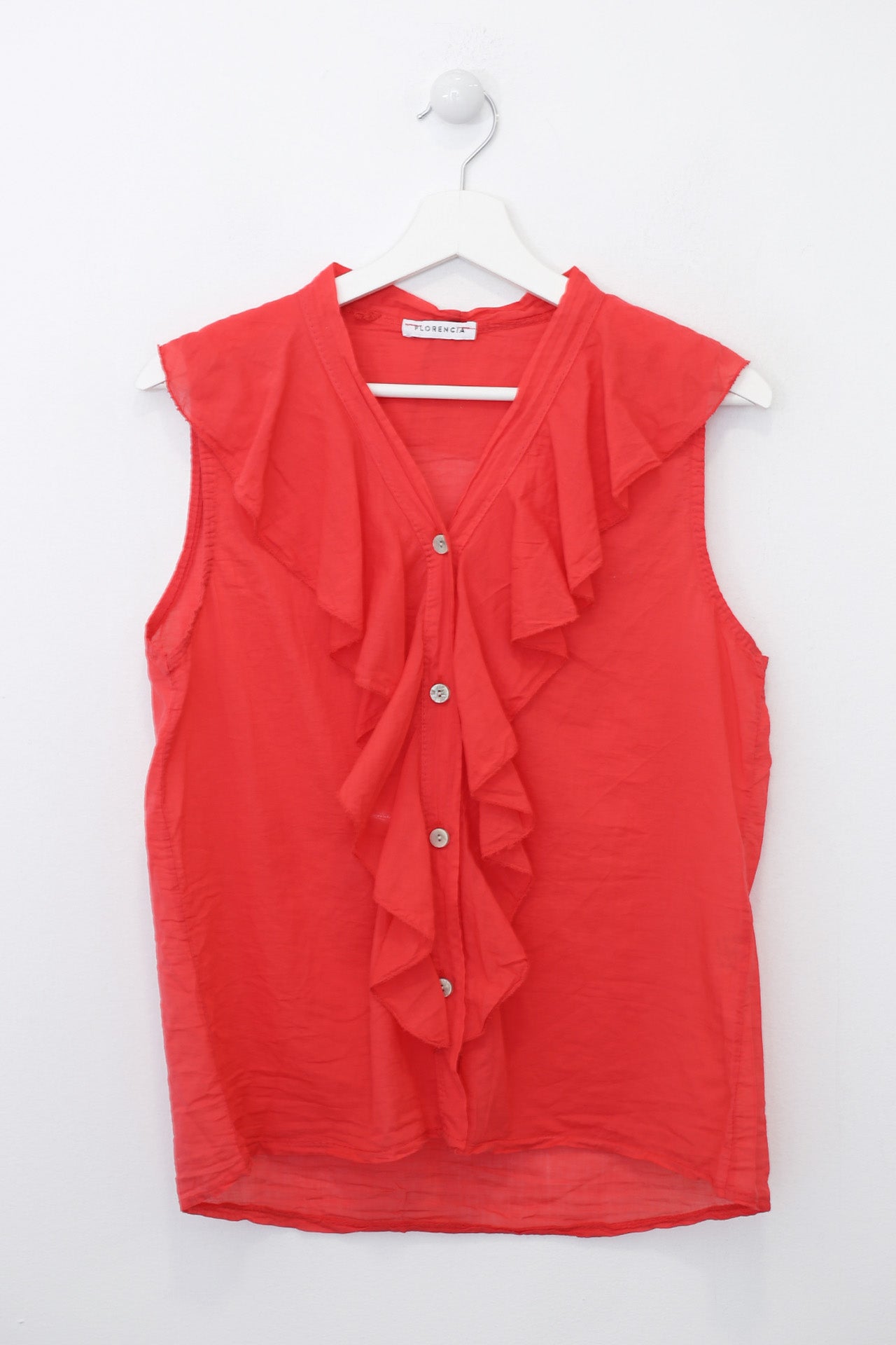 Blusa sin mangas de cuello en punta con detalle de volantes. Cierre frontal abotonado. Corte holgado.