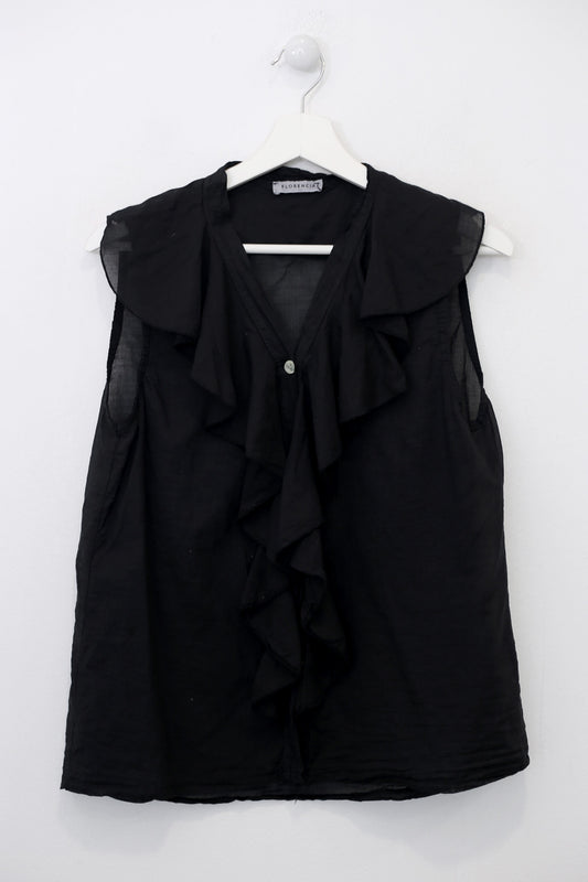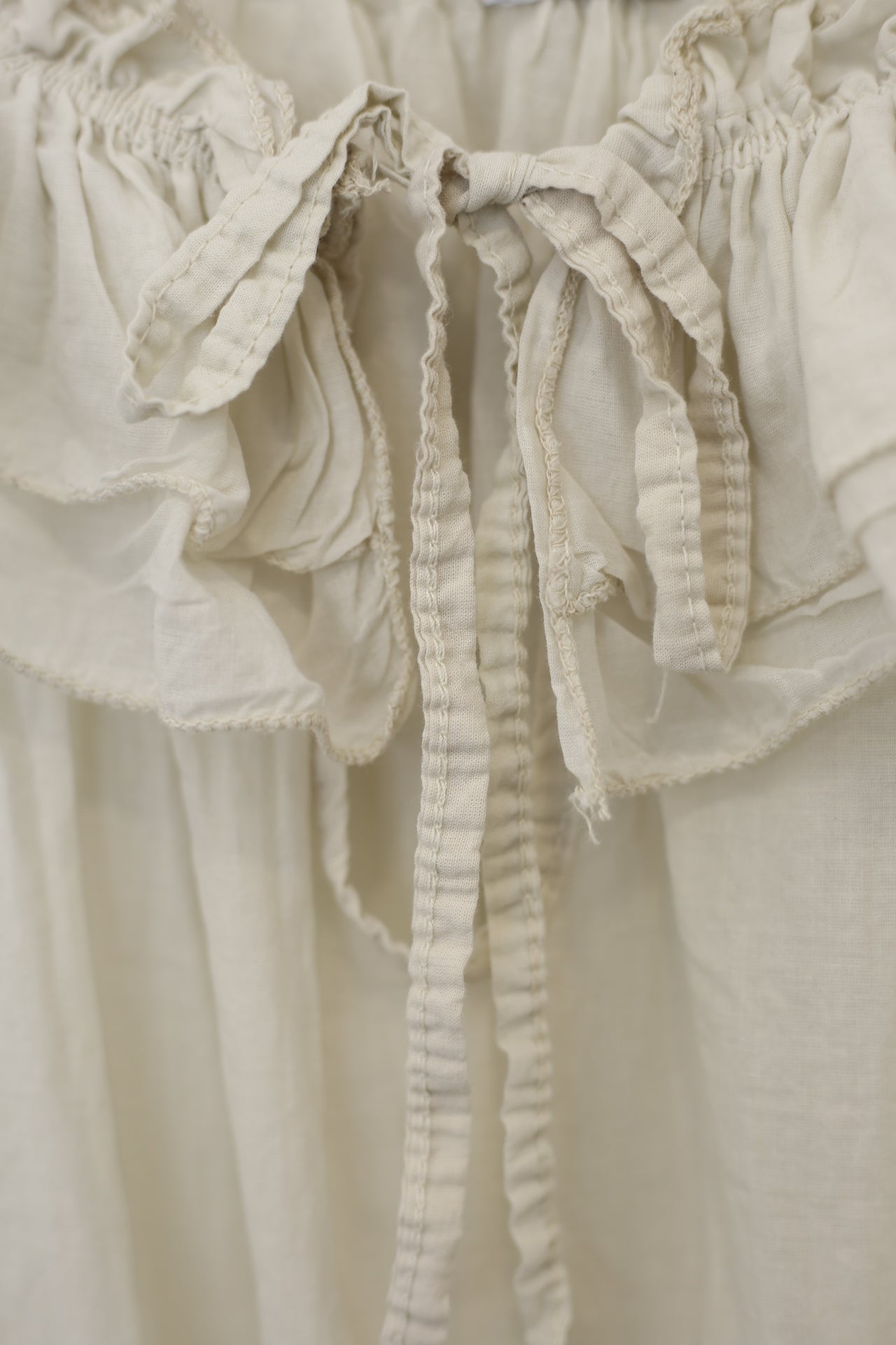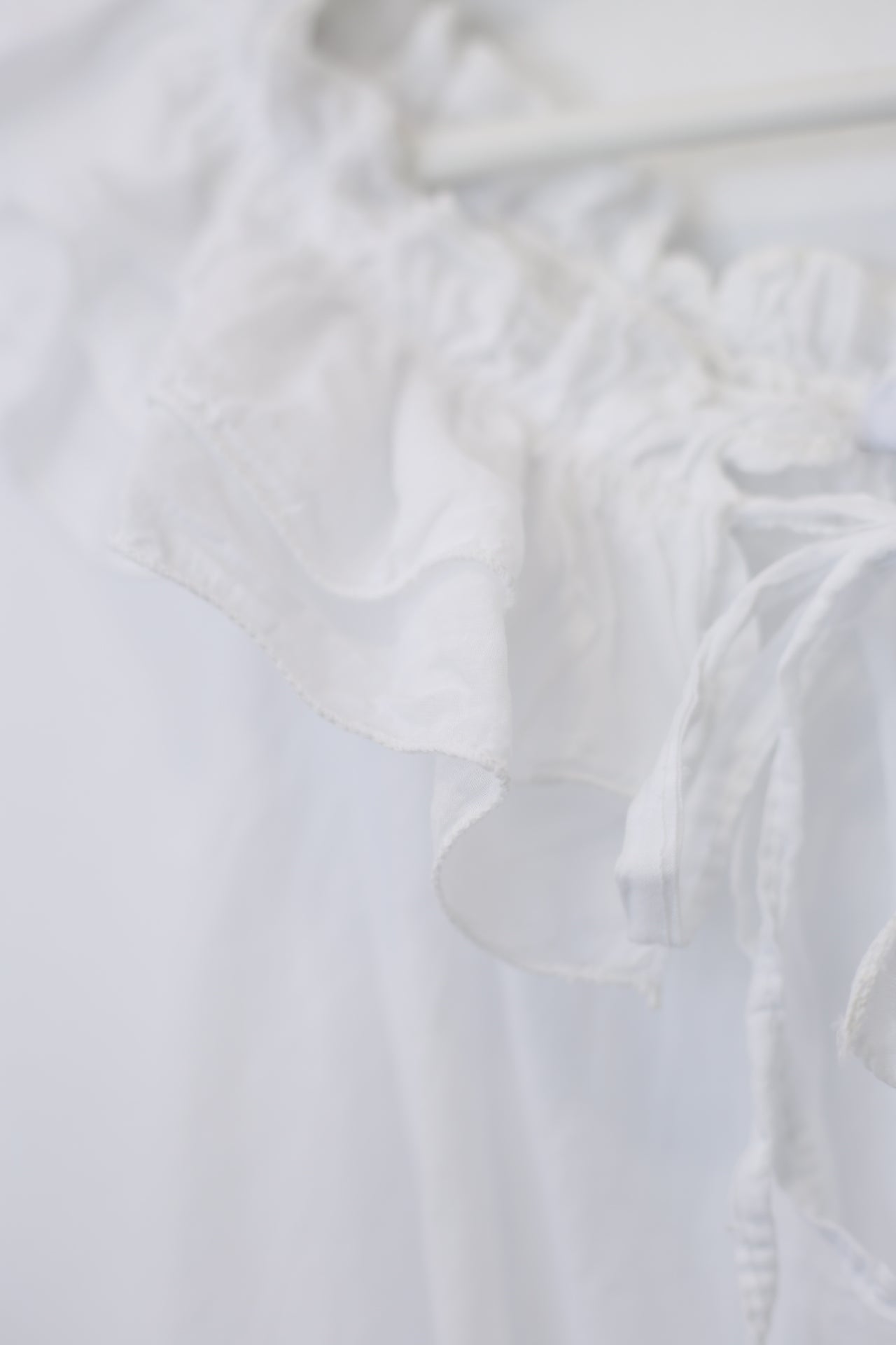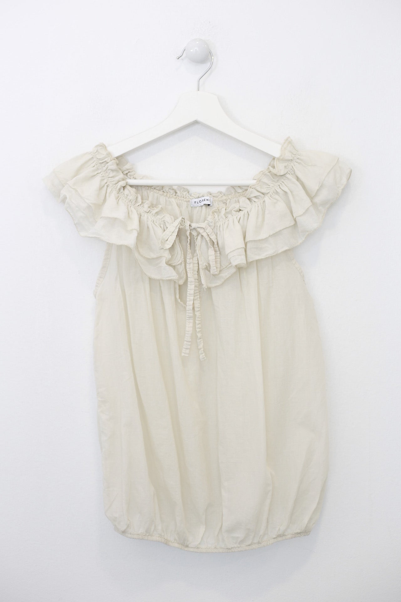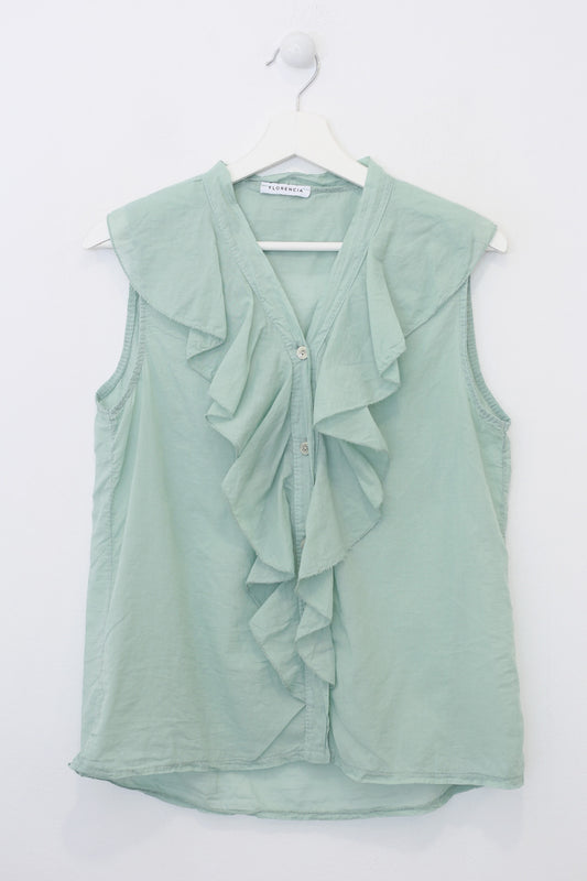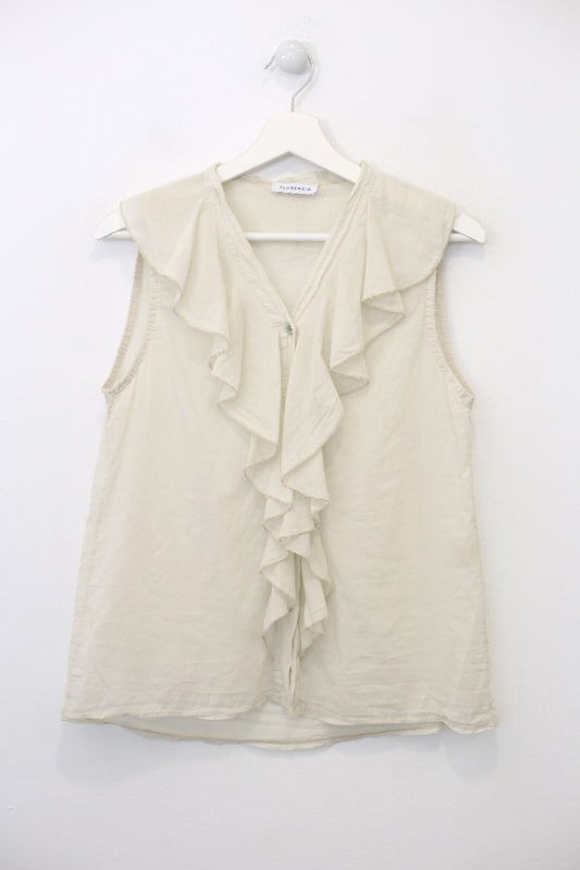 Top sin mangas con cuello redondo elástico y fruncido y con detalle de volantes. Abertura en el pecho con cierre acordonado. Bajo elástico.